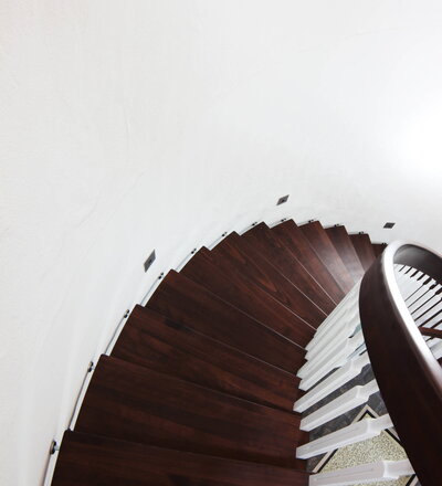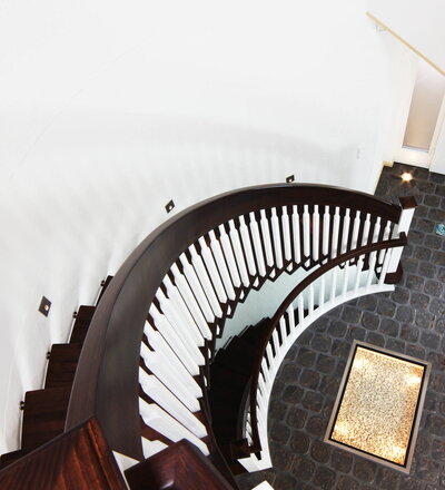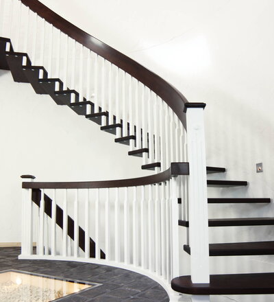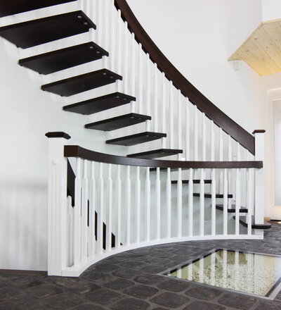 Gebogene freitragende Treppe über 2 Stockwerke, Stufen und Handlauf Holzart Buche gebeizt auf Wenge; Stäbe und Pfosten Holzart Whitewood weiß endlackiert; Handlauf- und Wangenkrümmling.