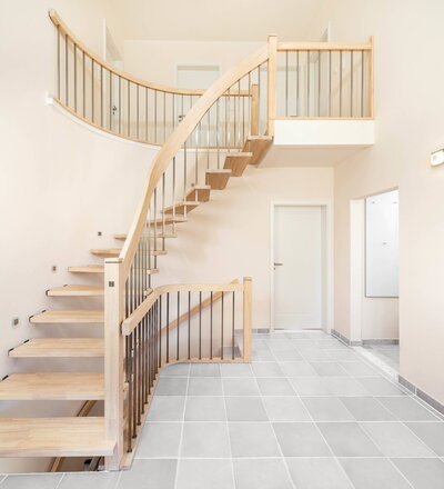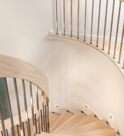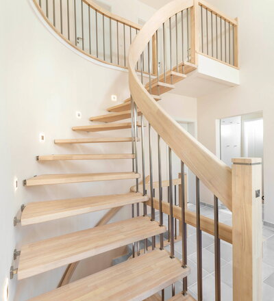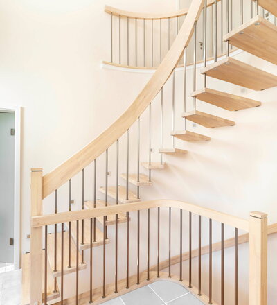 1/4 gewendelte freitragende Treppe mit Handlaufkrümmling in der Holzart Hevea mosaik weiß geölt. Stäbe Q16 aus Edelstahl.