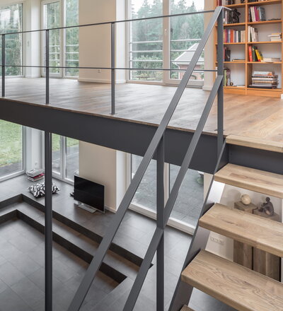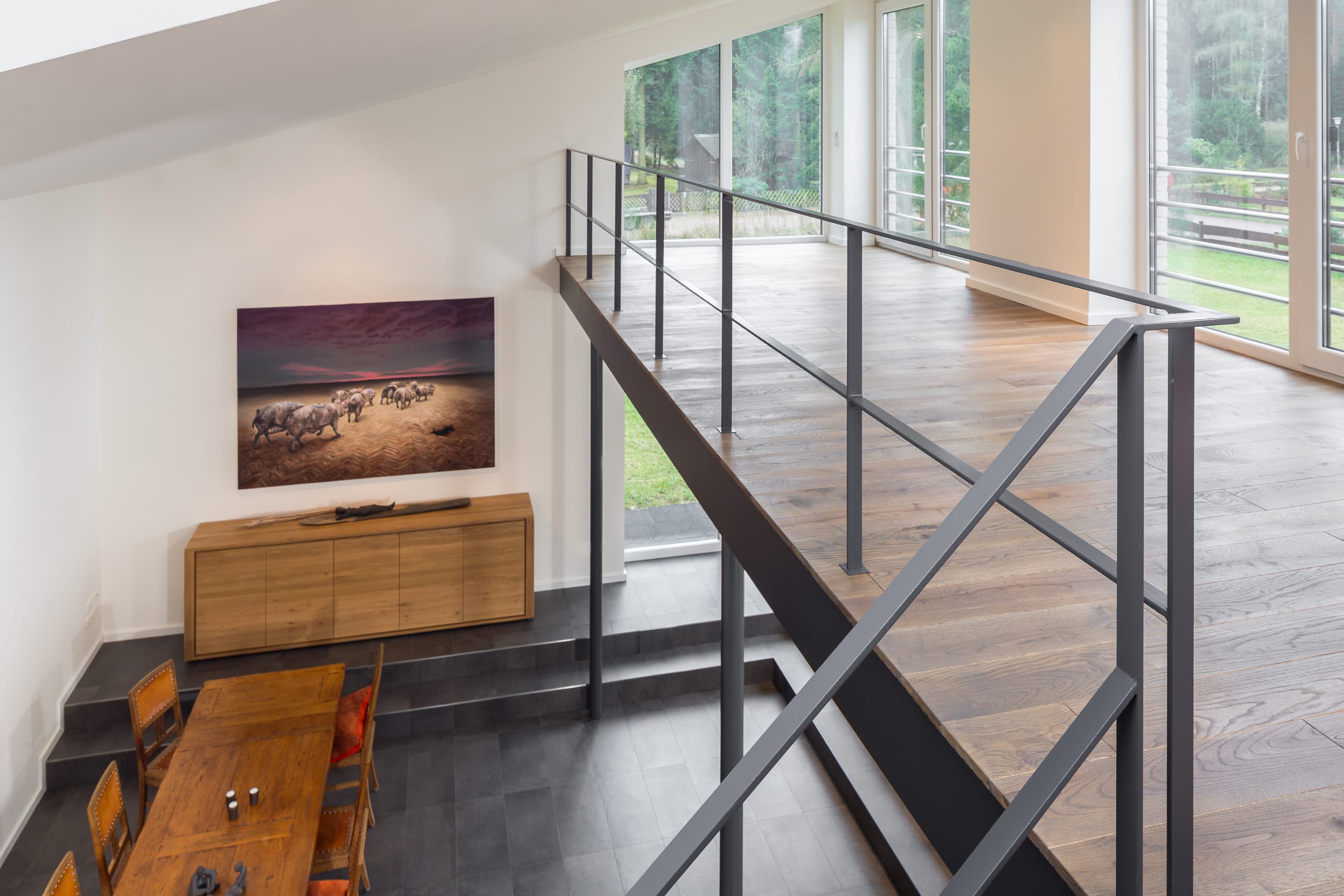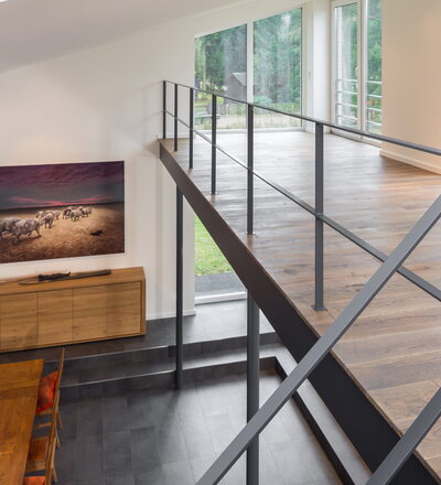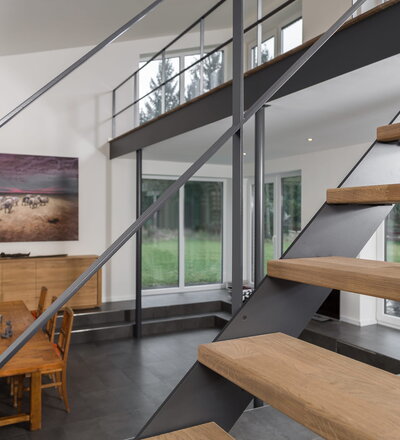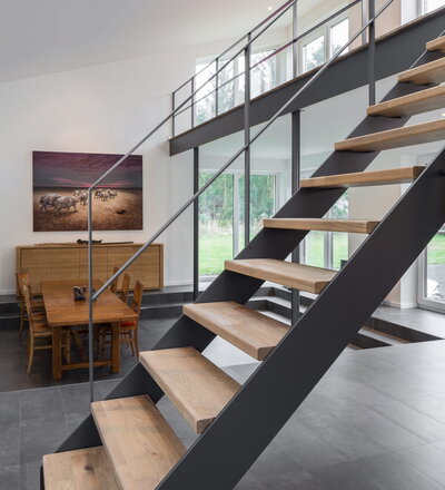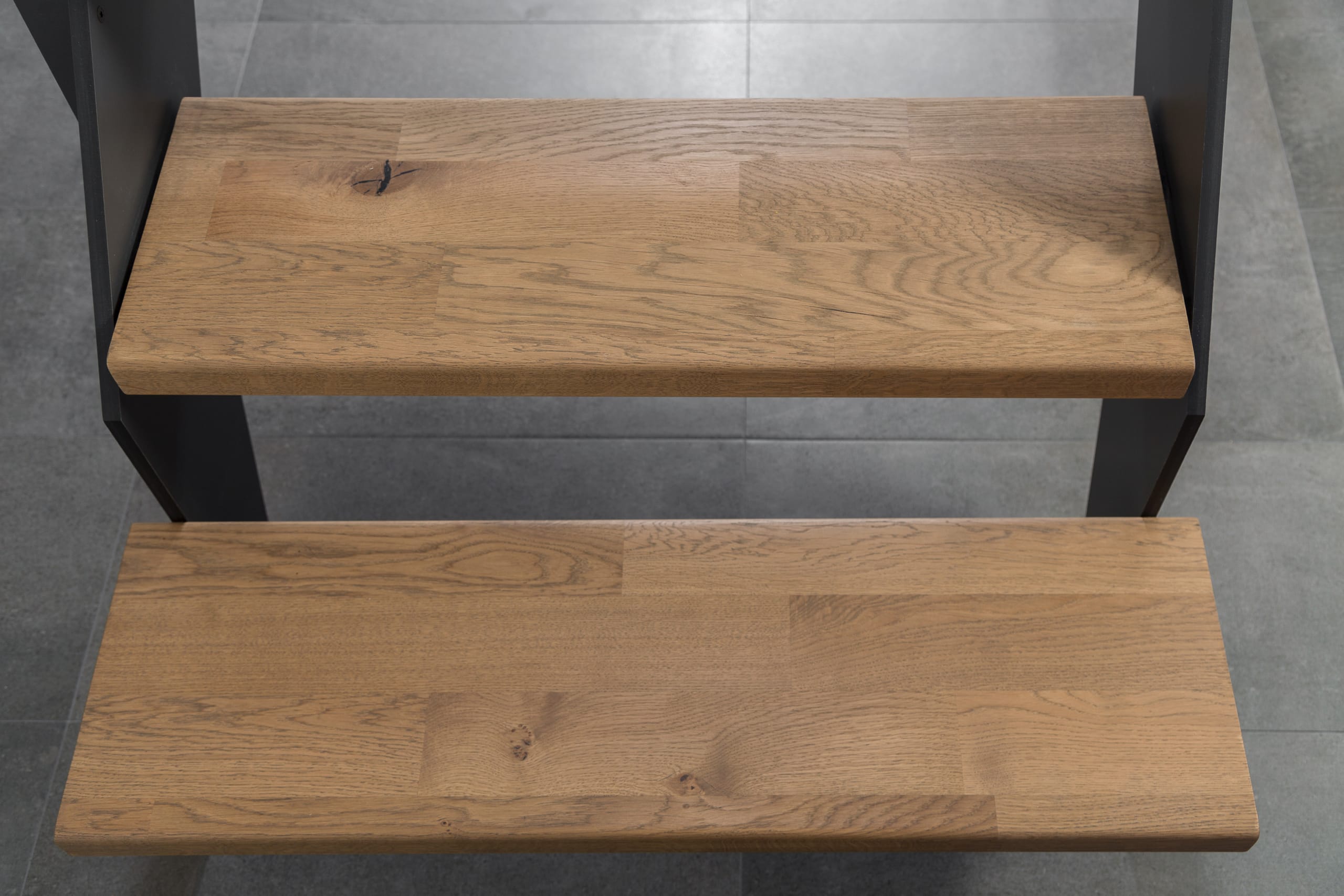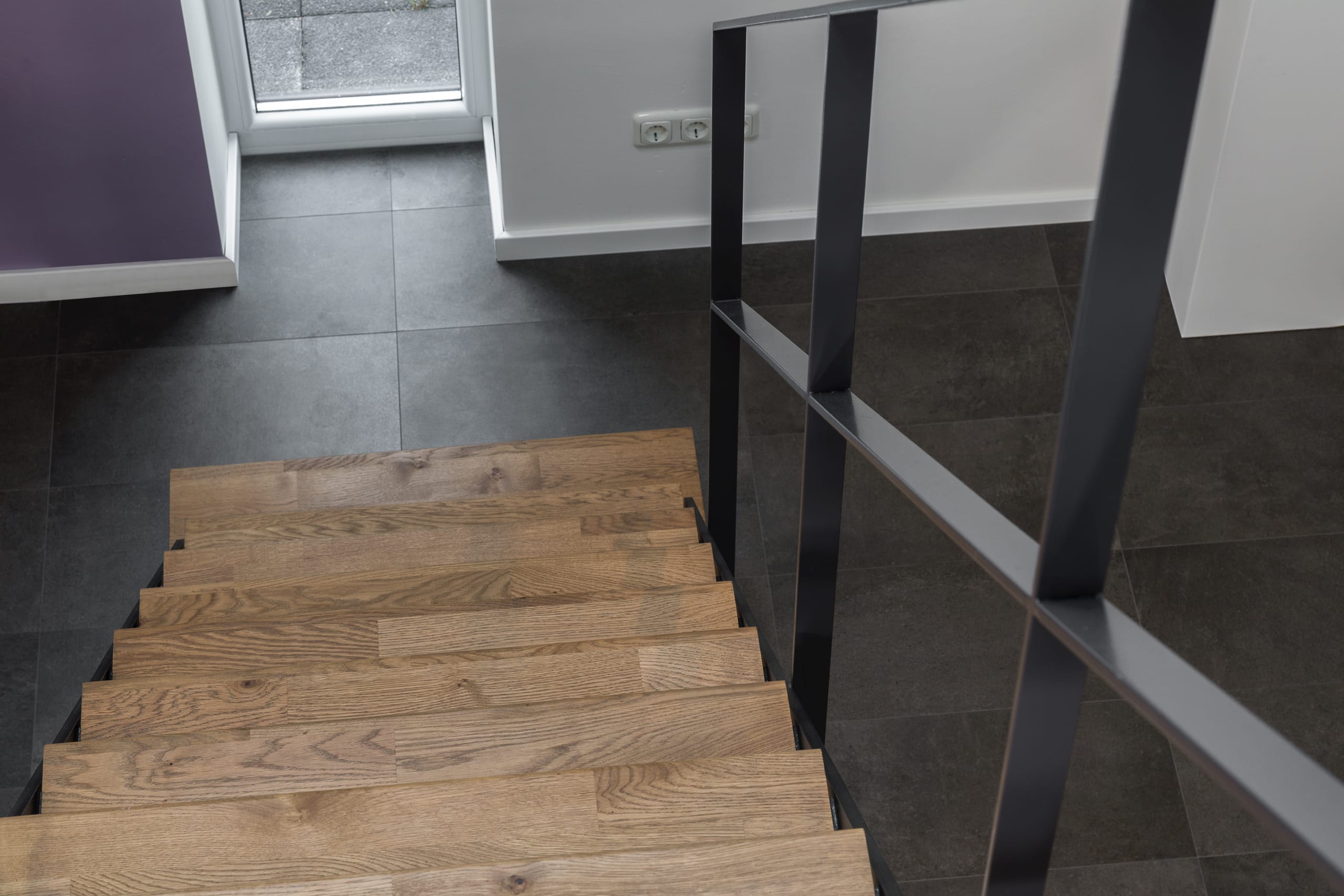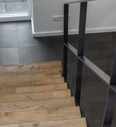 Gerade HPL-Treppe, Stufen in der Holzart Eiche mosaik astig geölt. Geländer und Brüstung aus Stahl im "Goldenen Schnitt"