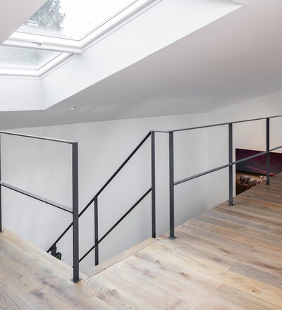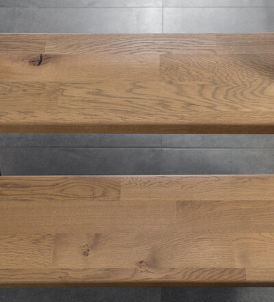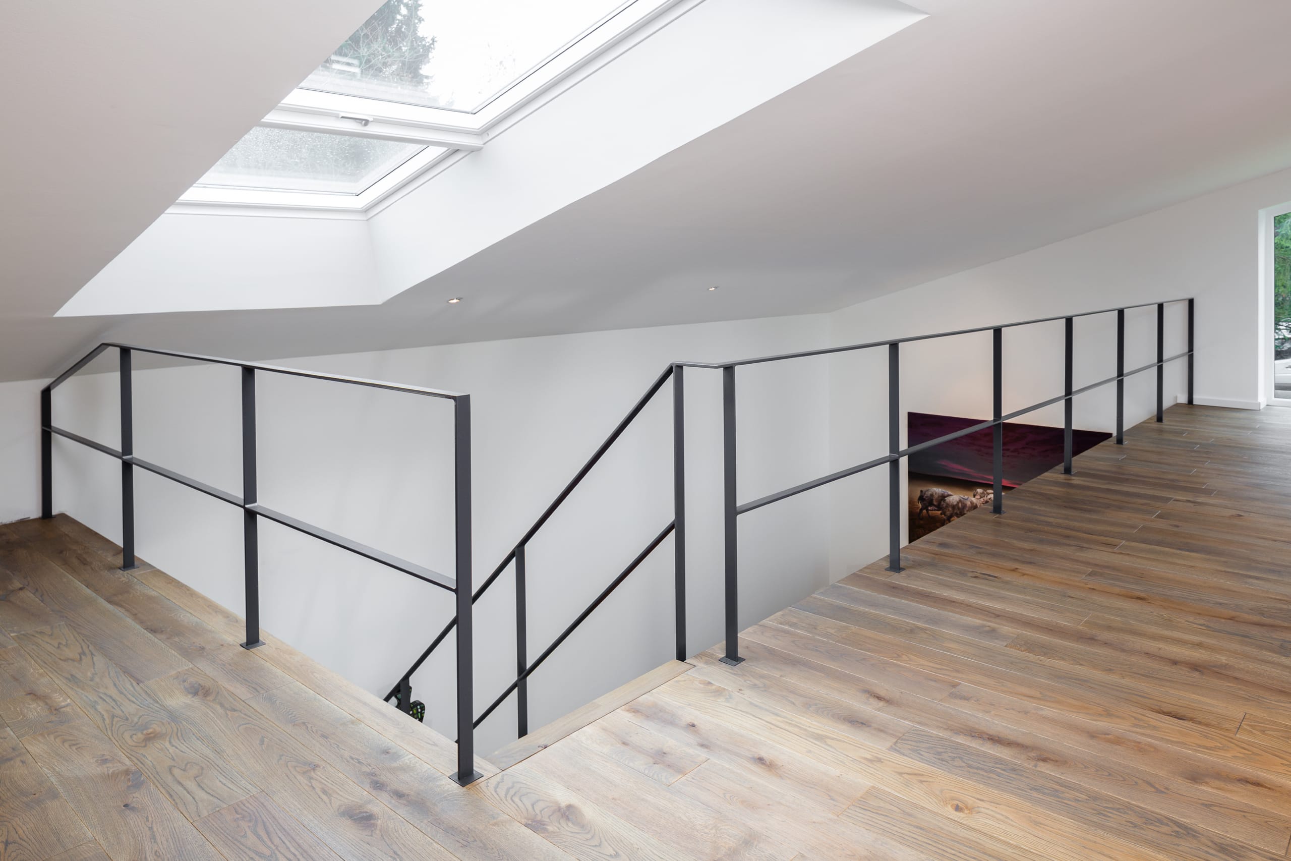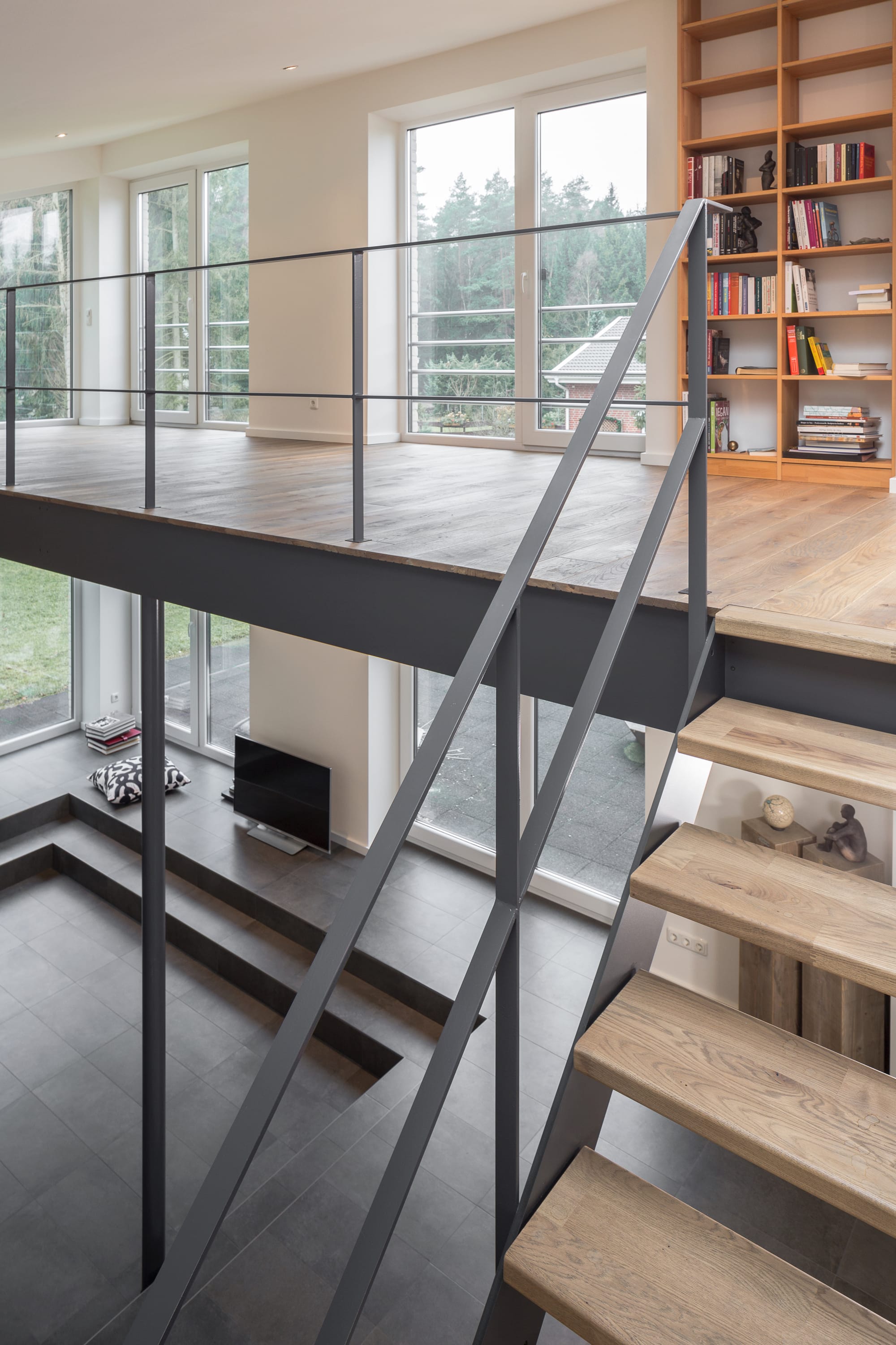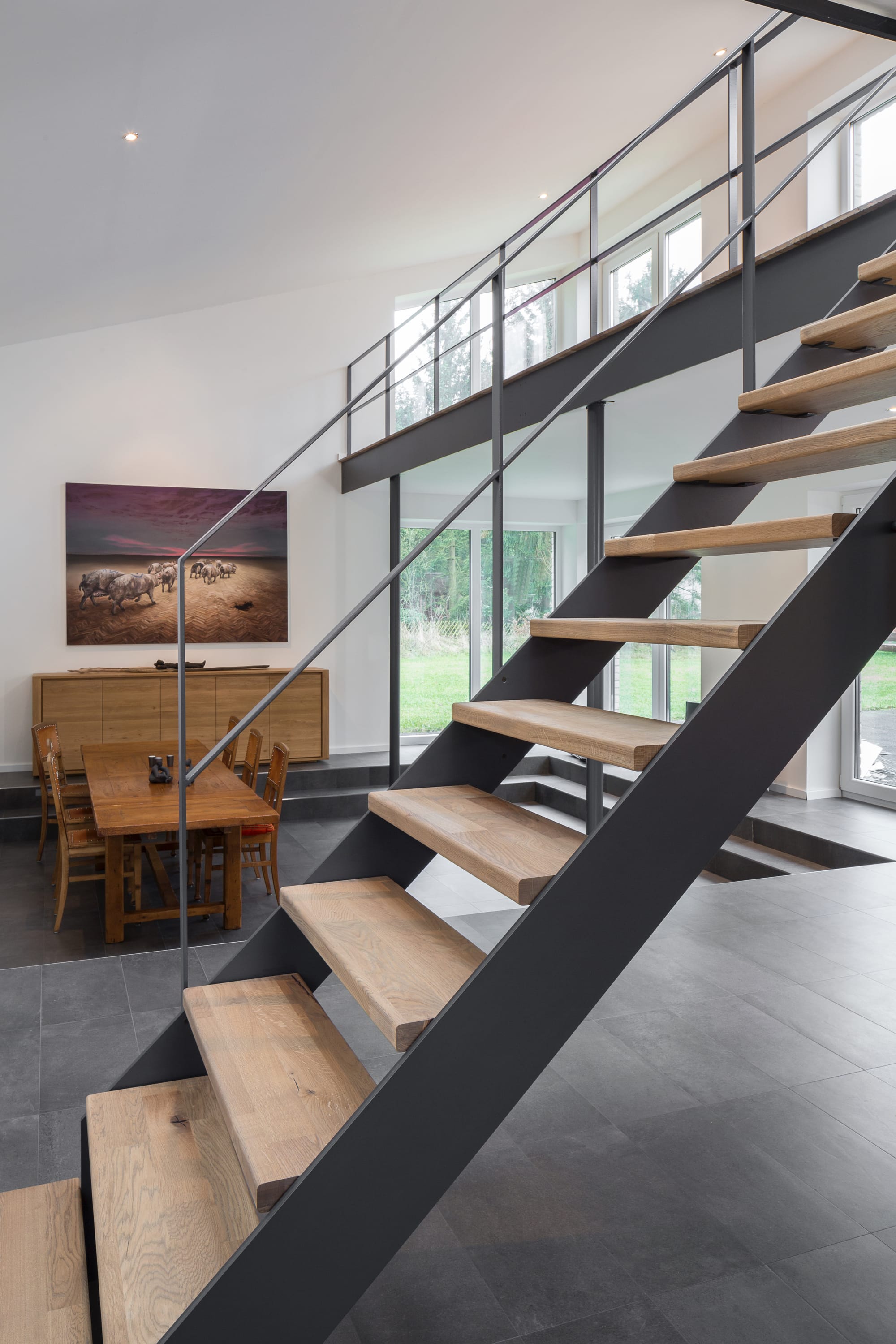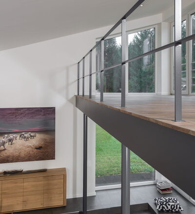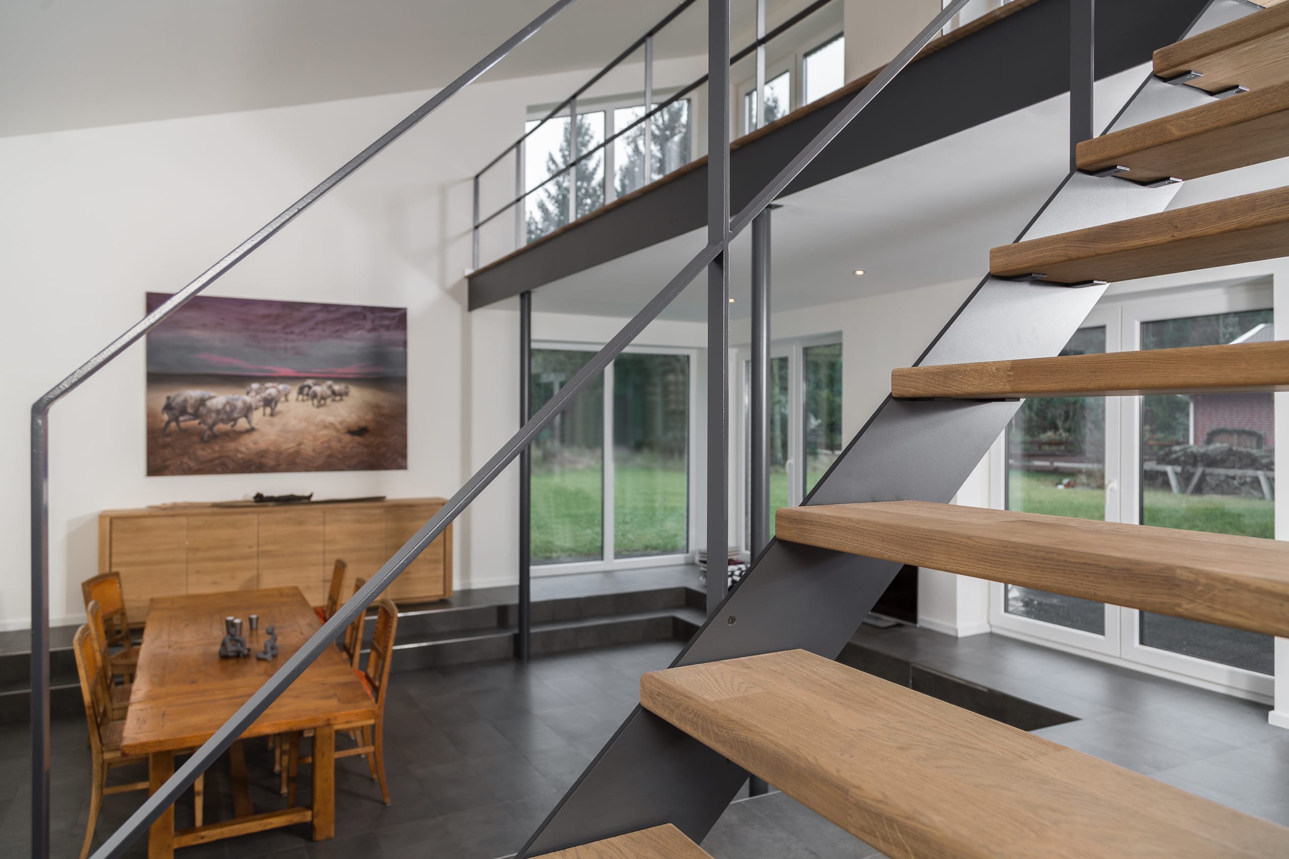 Gerade HPL-Treppe, Stufen in der Holzart Eiche mosaik astig geölt. Geländer und Brüstung aus Stahl im "Goldenen Schnitt"