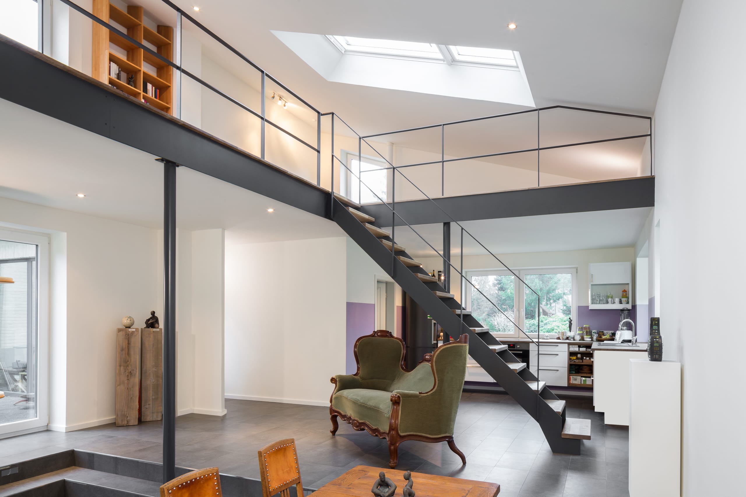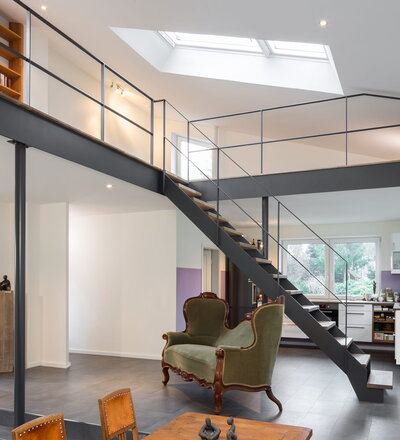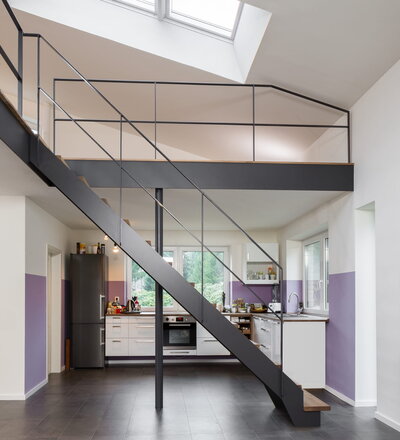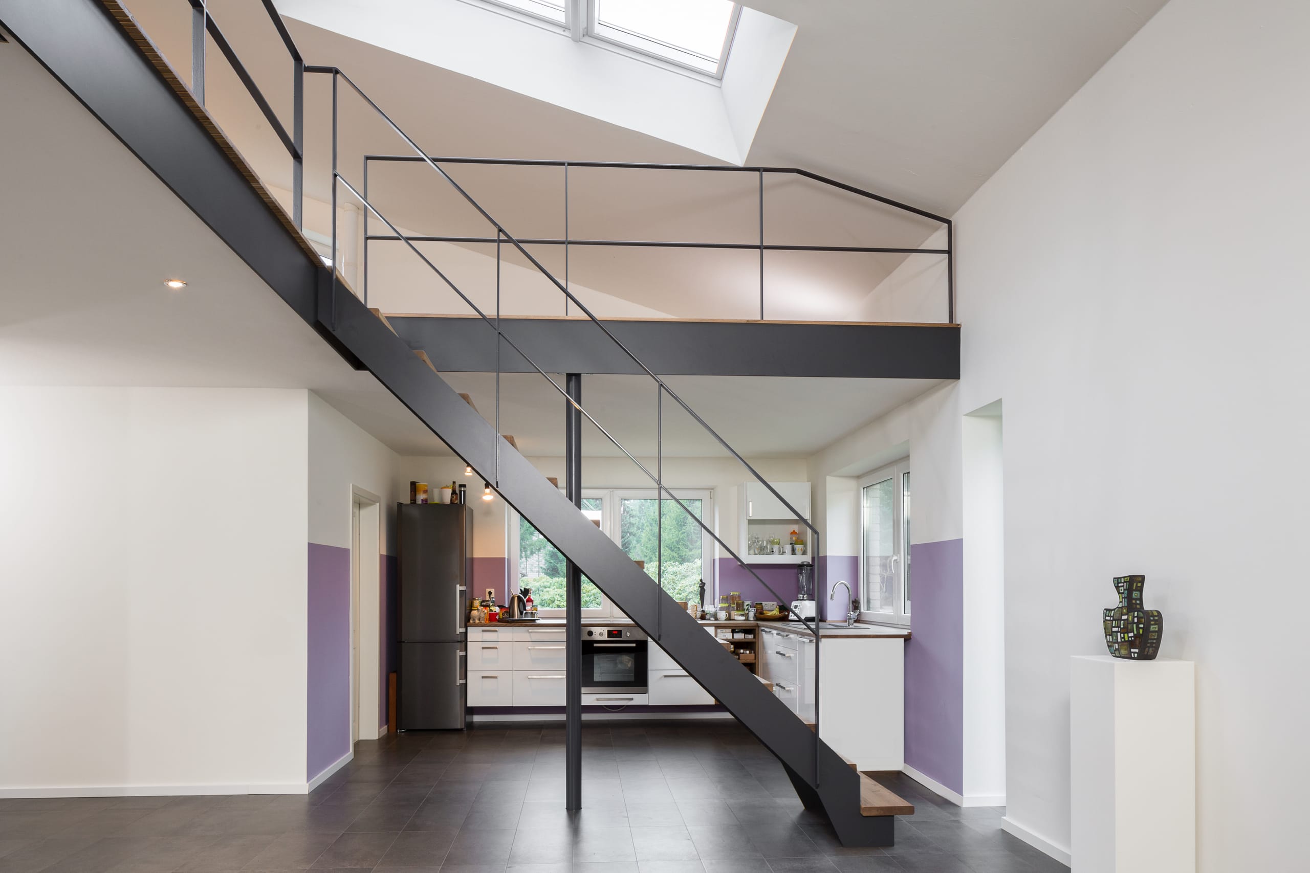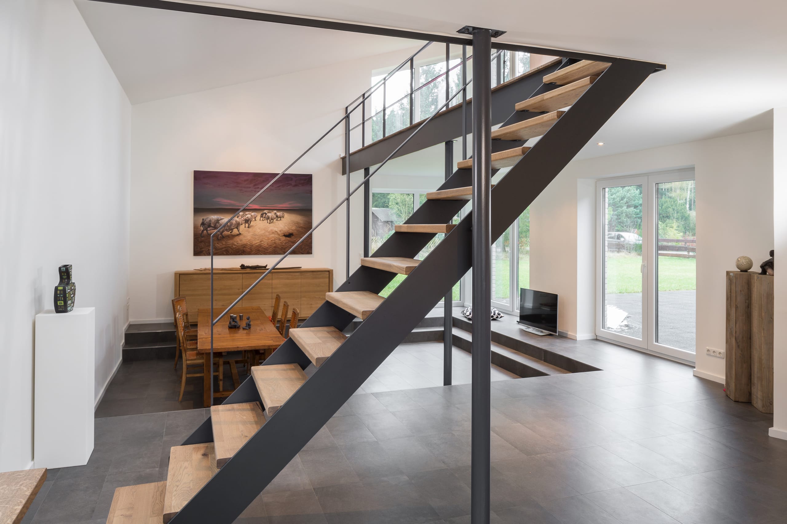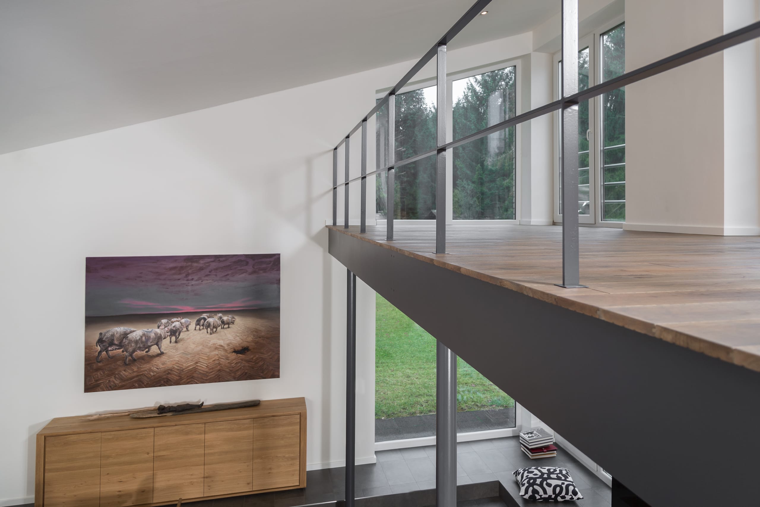 Gerade HPL-Treppe, Stufen in der Holzart Eiche mosaik astig geölt. Geländer und Brüstung aus Stahl im "Goldenen Schnitt"