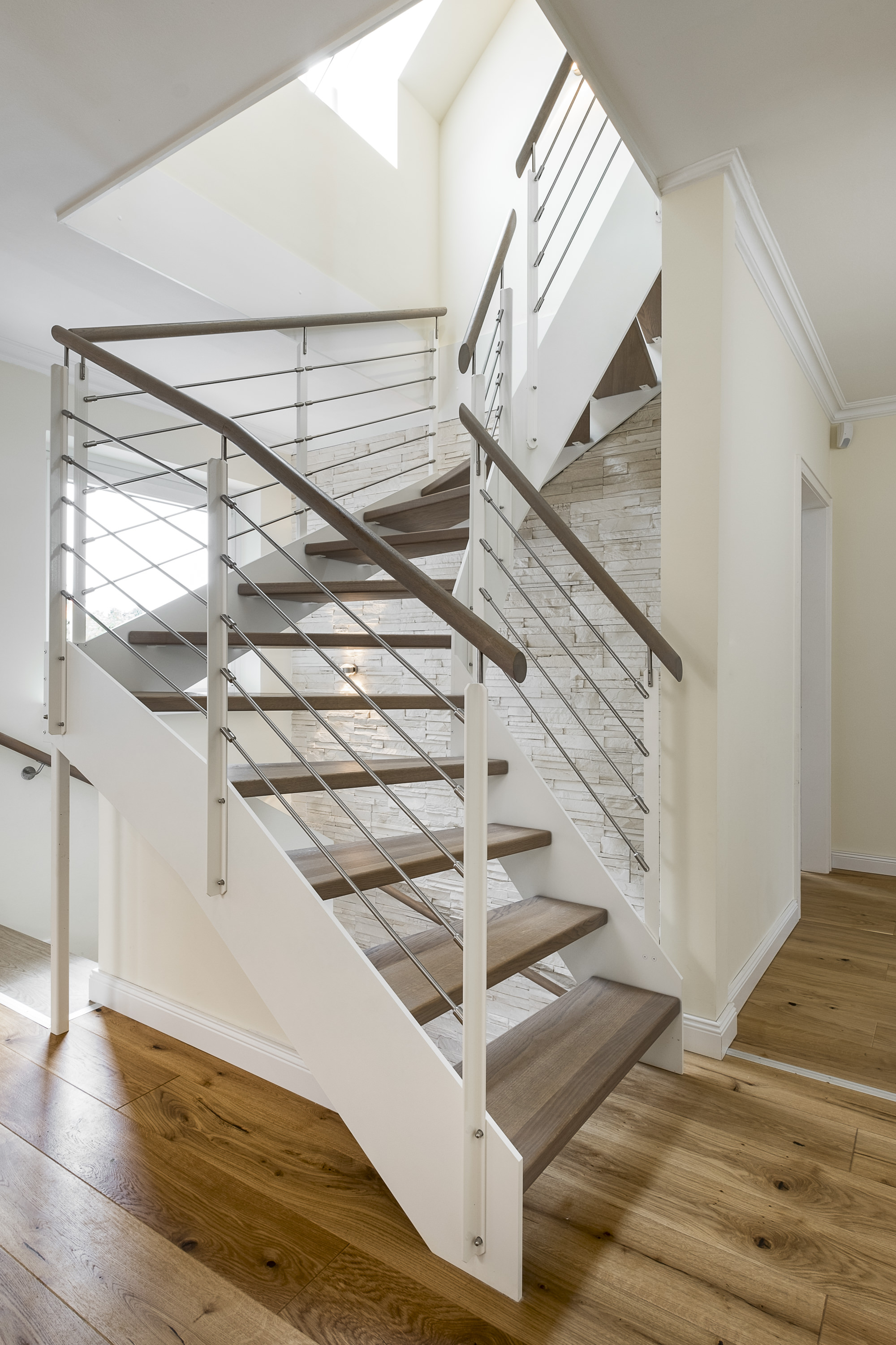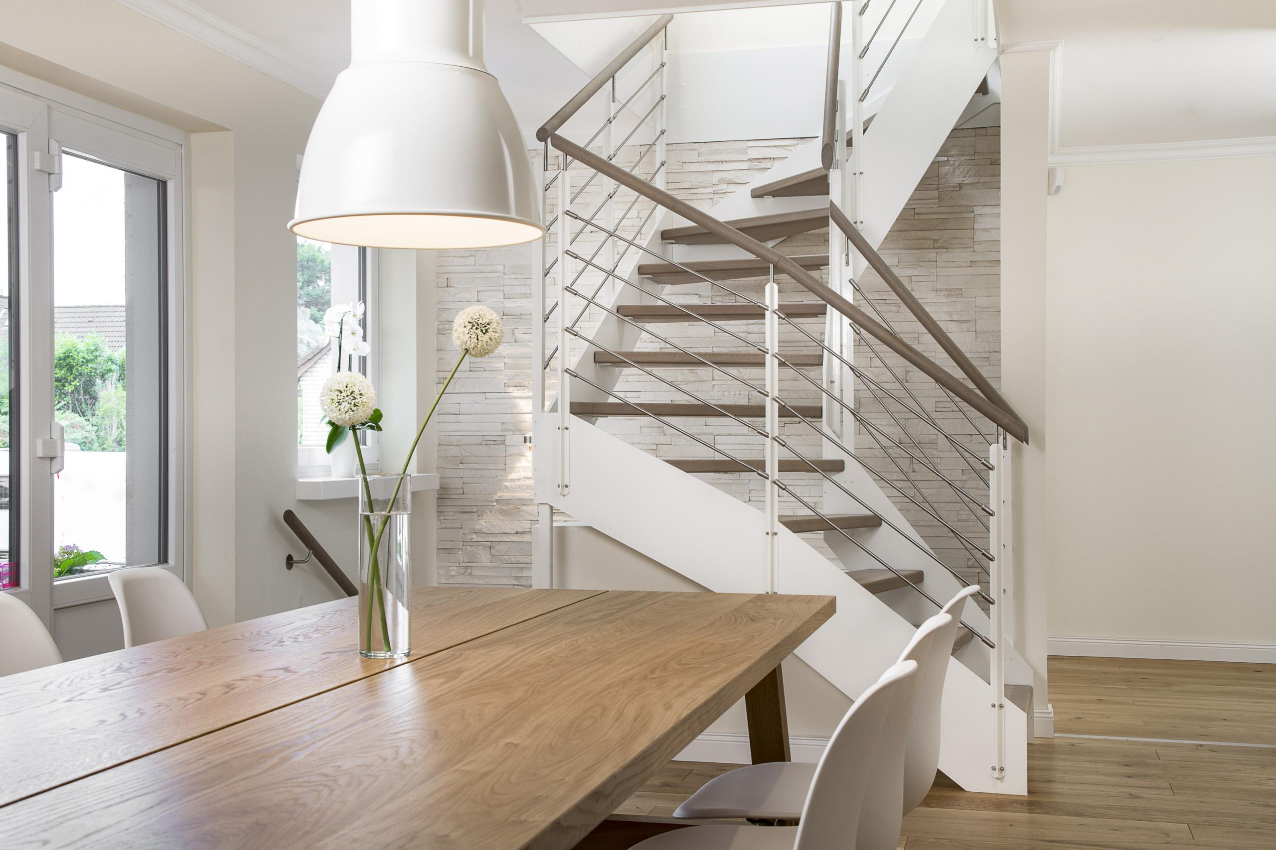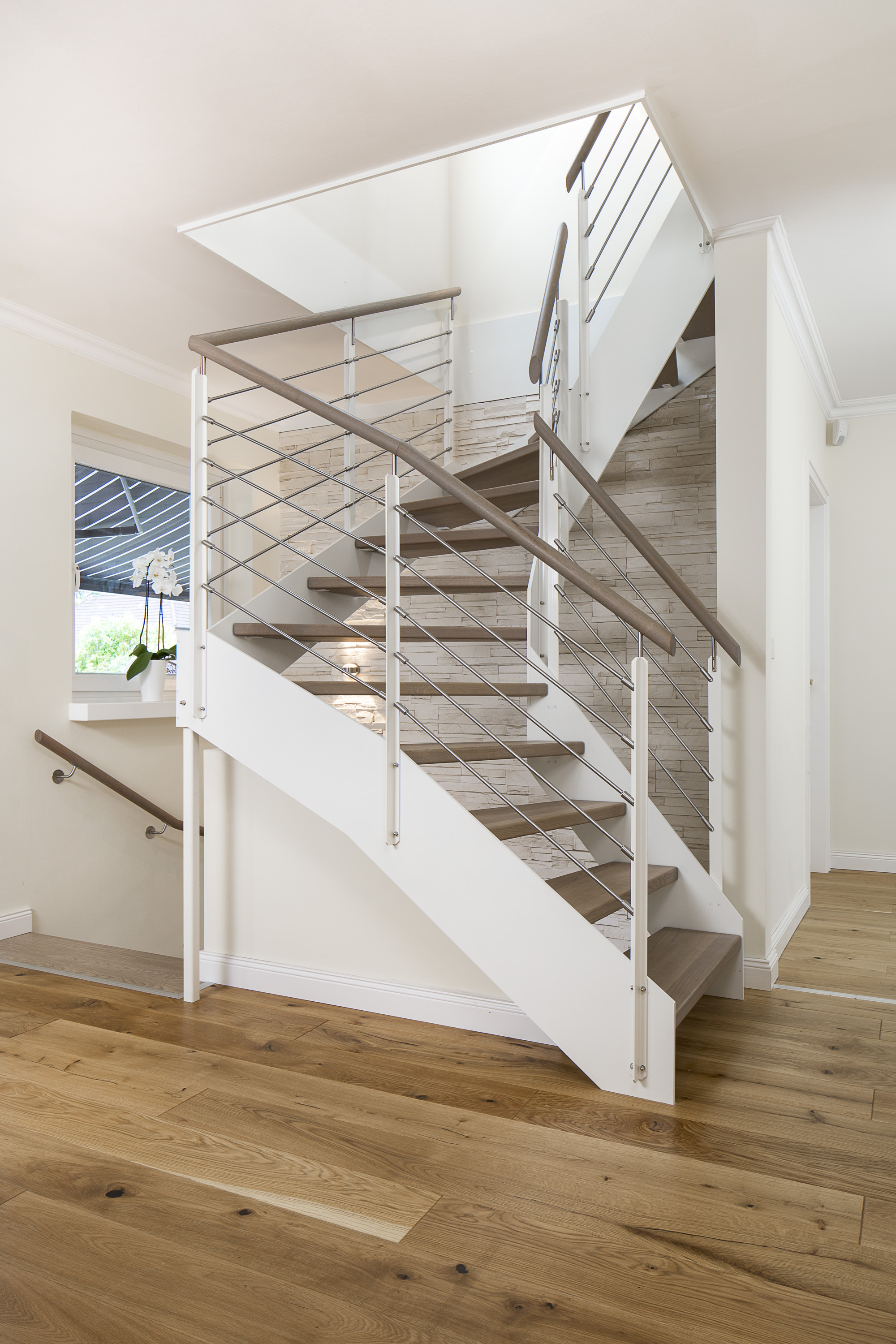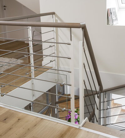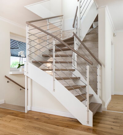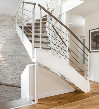 Halb gewendelte HPL-Treppe mit weißen HPL-Wangen, Stufen und Handlauf in der Holzart Eiche geölt mit TBV Echtholz-Öl Farbton Gris Belge