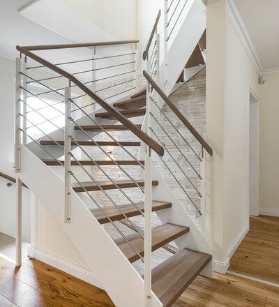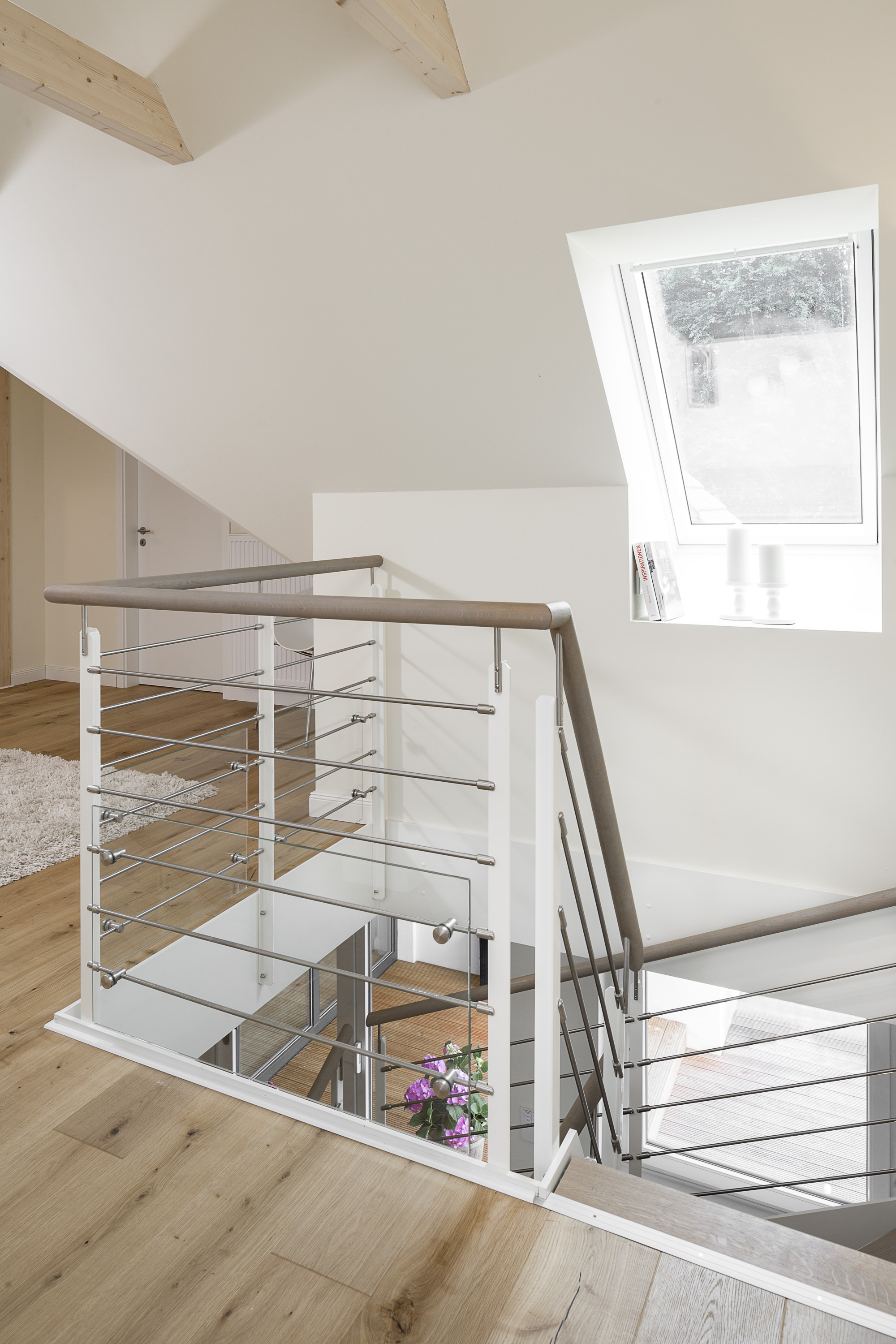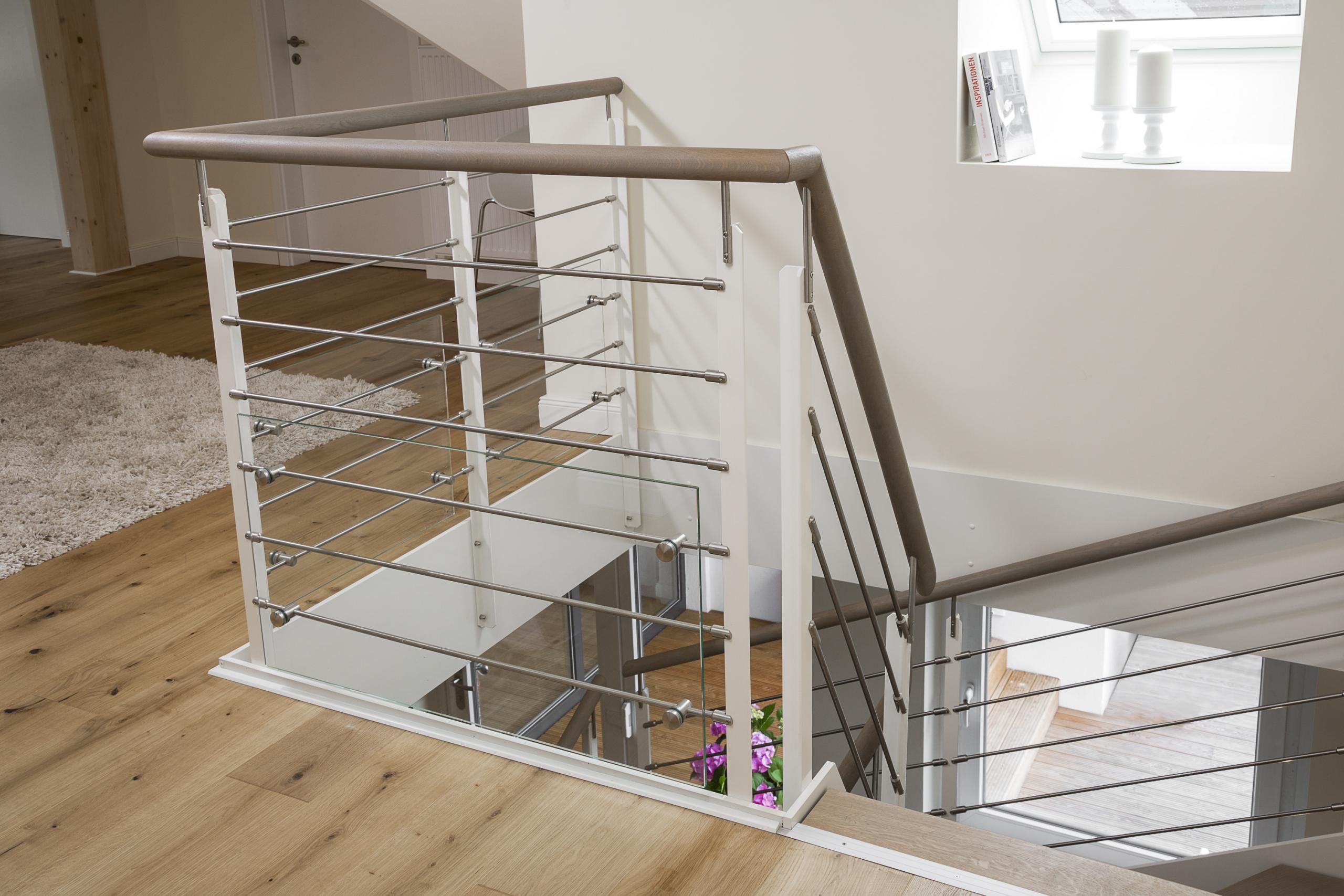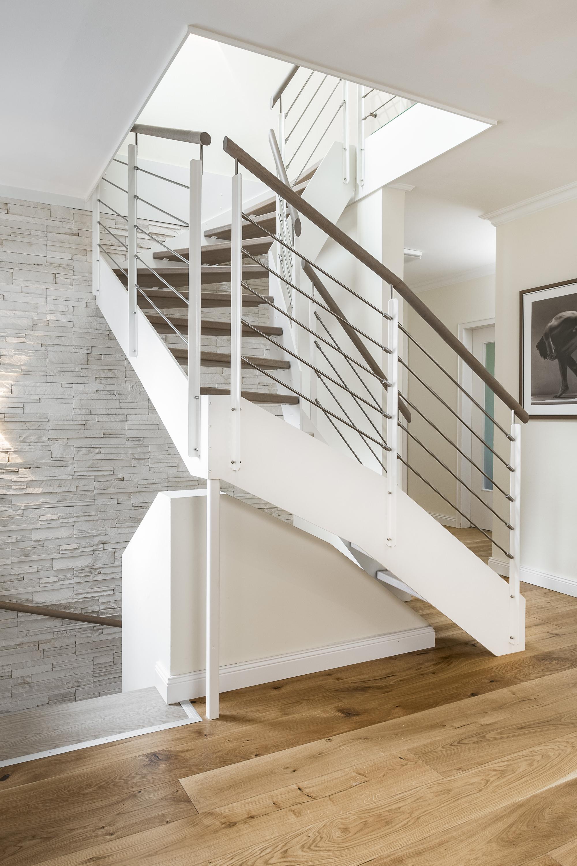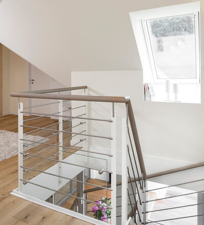 Halb gewendelte HPL-Treppe mit weißen HPL-Wangen, Stufen und Handlauf in der Holzart Eiche geölt mit TBV Echtholz-Öl Farbton Gris Belge