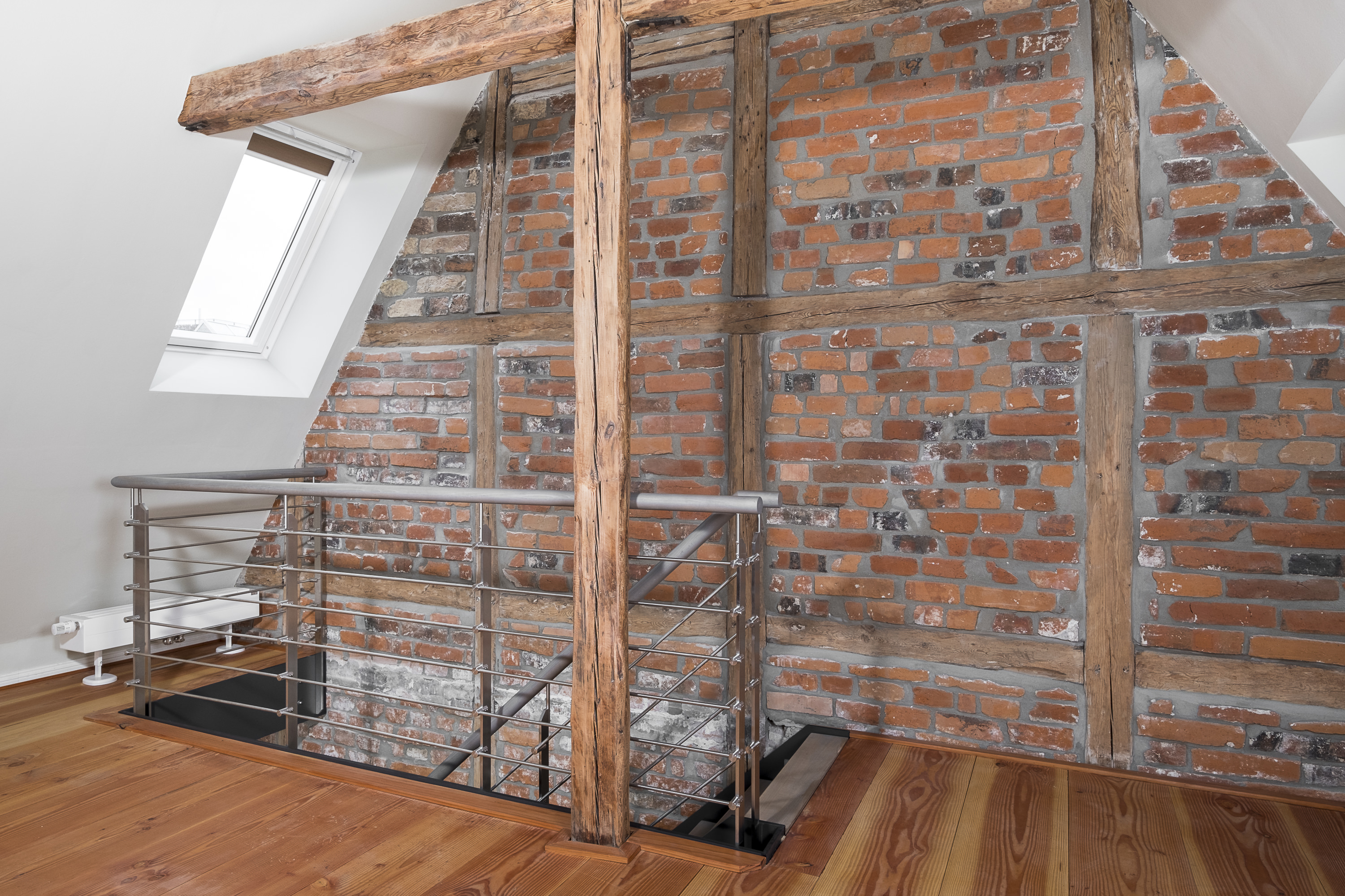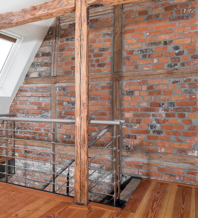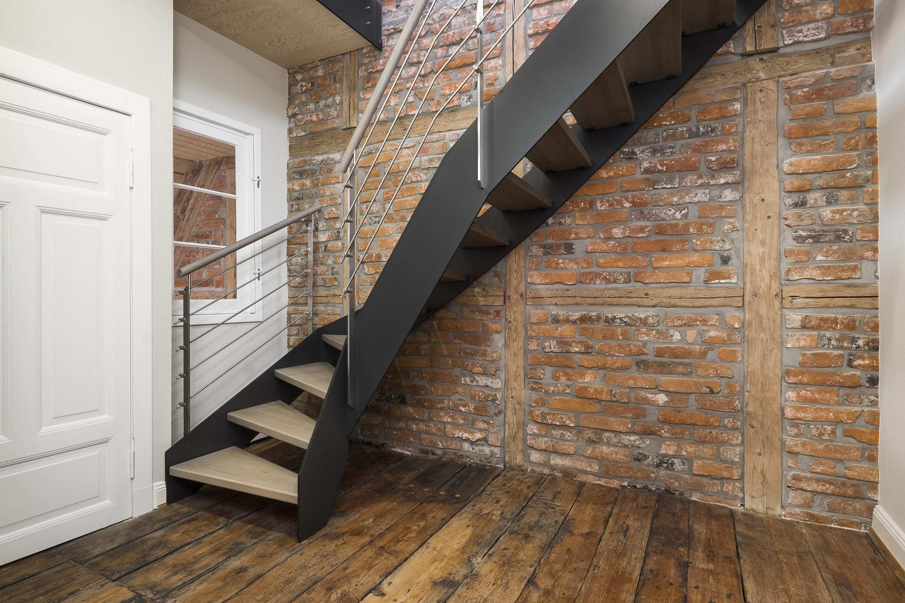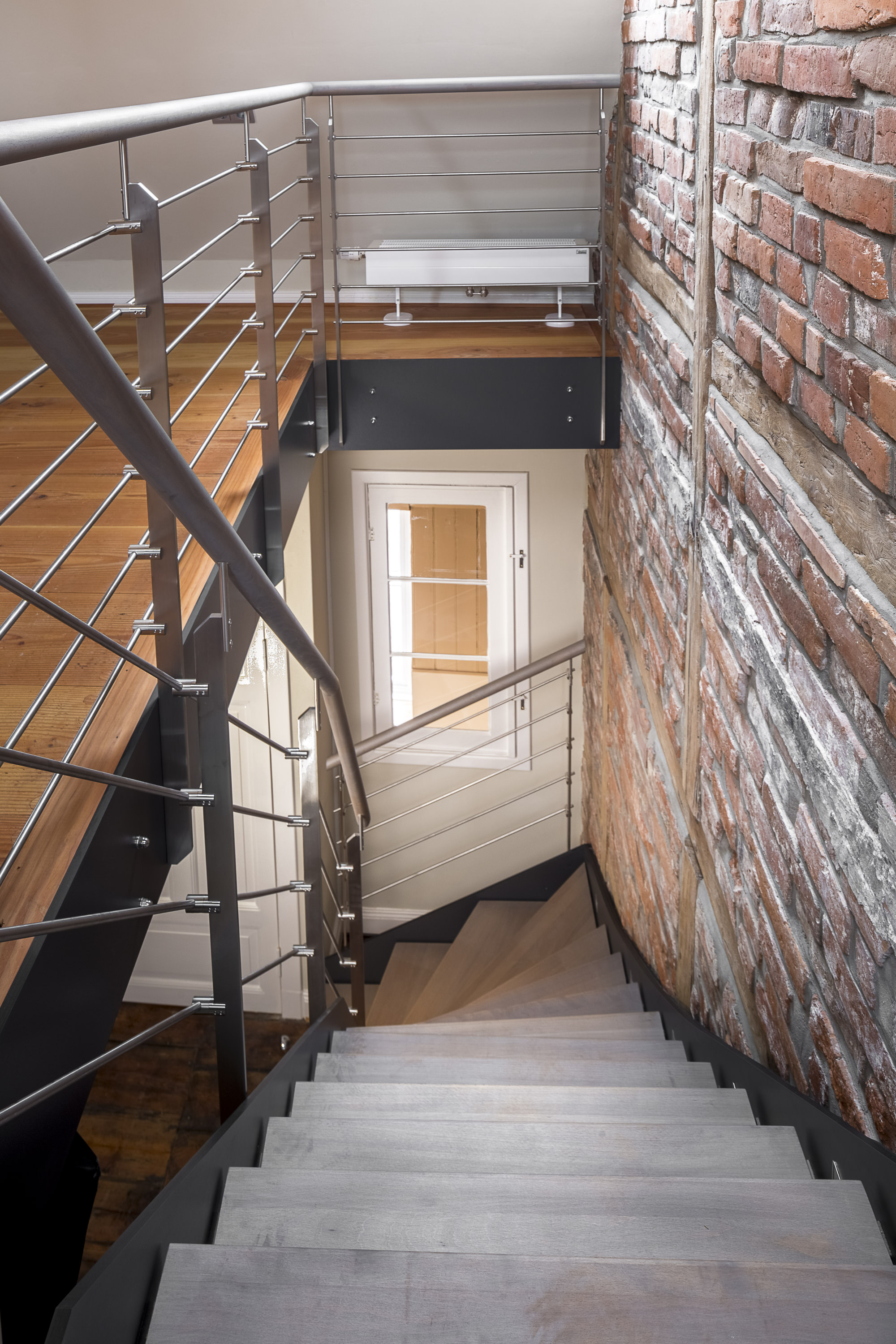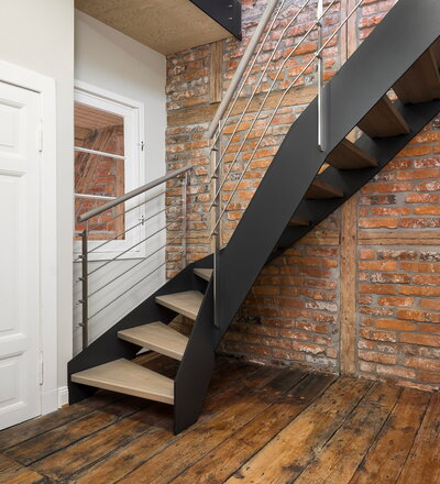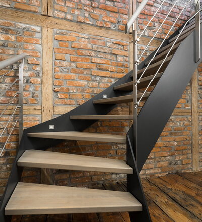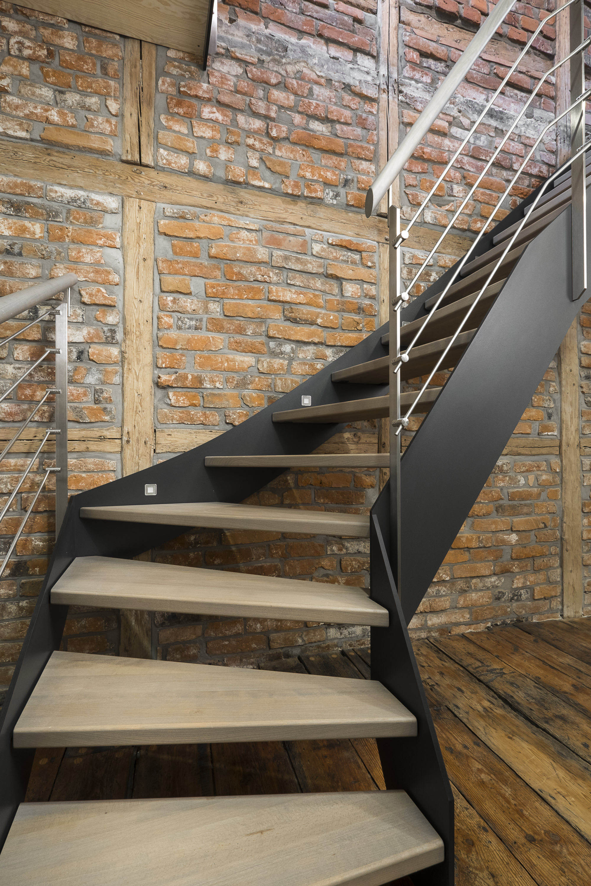 HPL-Treppe 1/4 gewendelt mit Stufen und Handlauf in der Holzart Buche Klassik farbig geölt in Silver Grey, Milano-Geländer und mit Stufenbeleuchtung