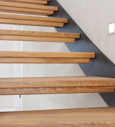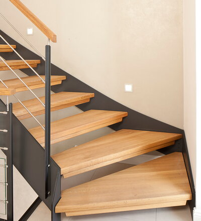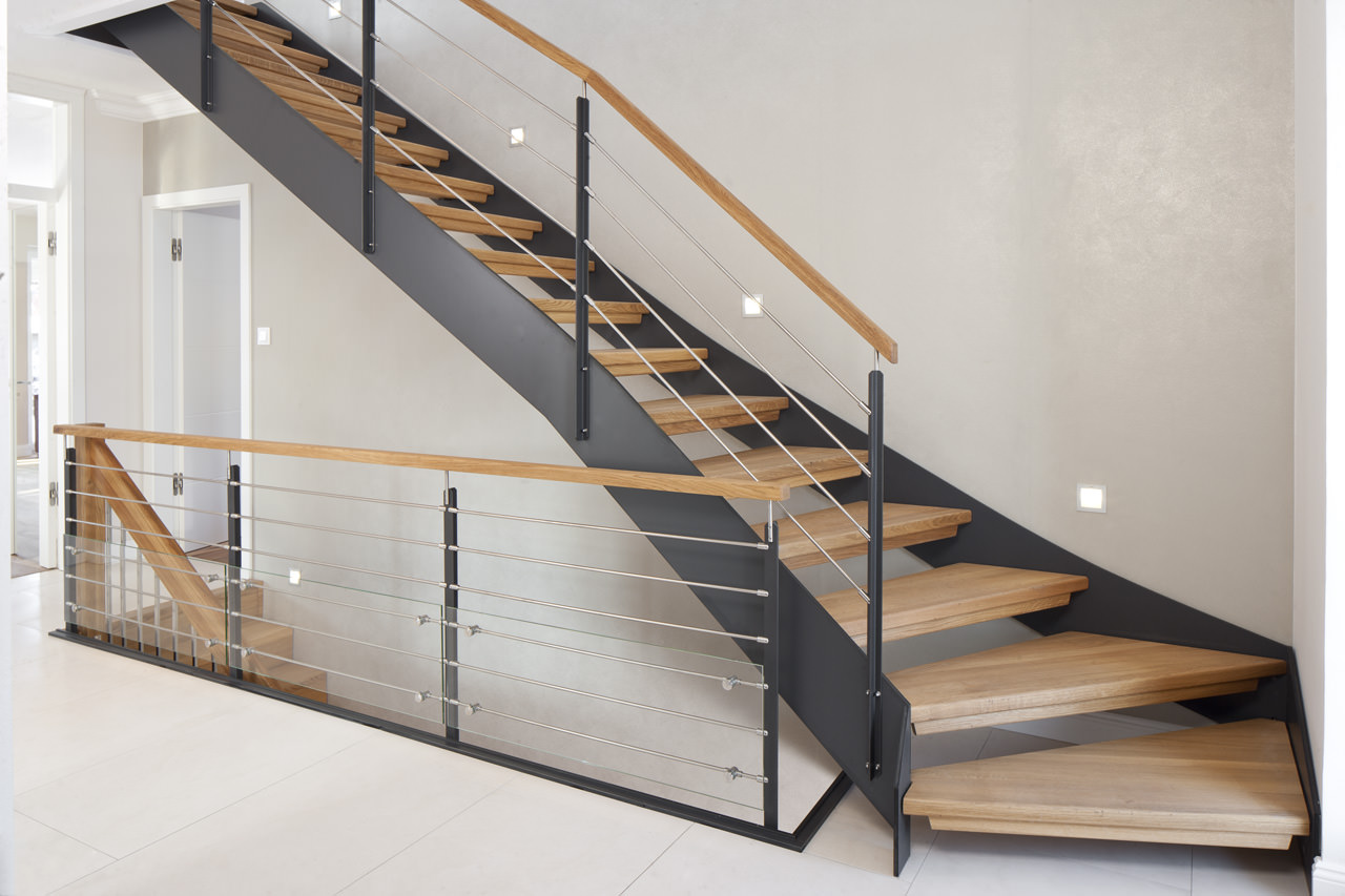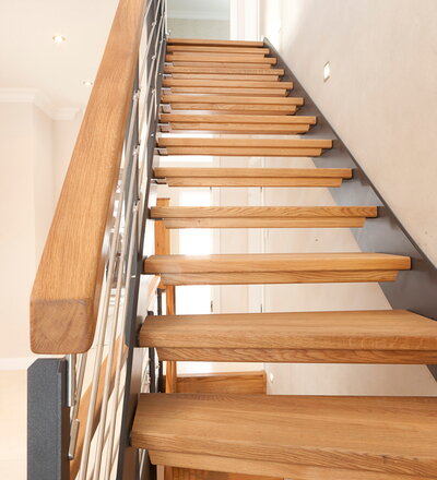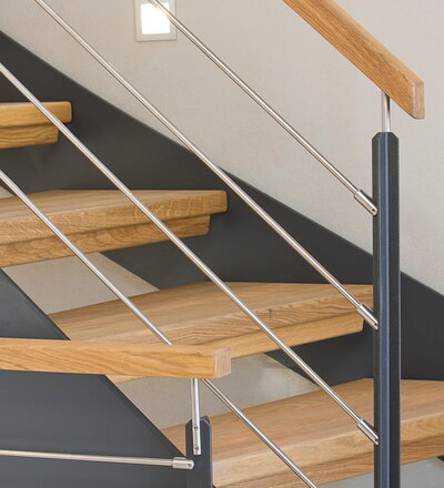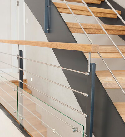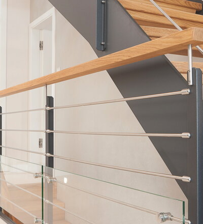 1/4 gewendelte HPL-Treppe mit Stufen und Handlauf in der Holzart Eiche geölt. Milano-Geländer mit zusätzlichem VSG-Glas.