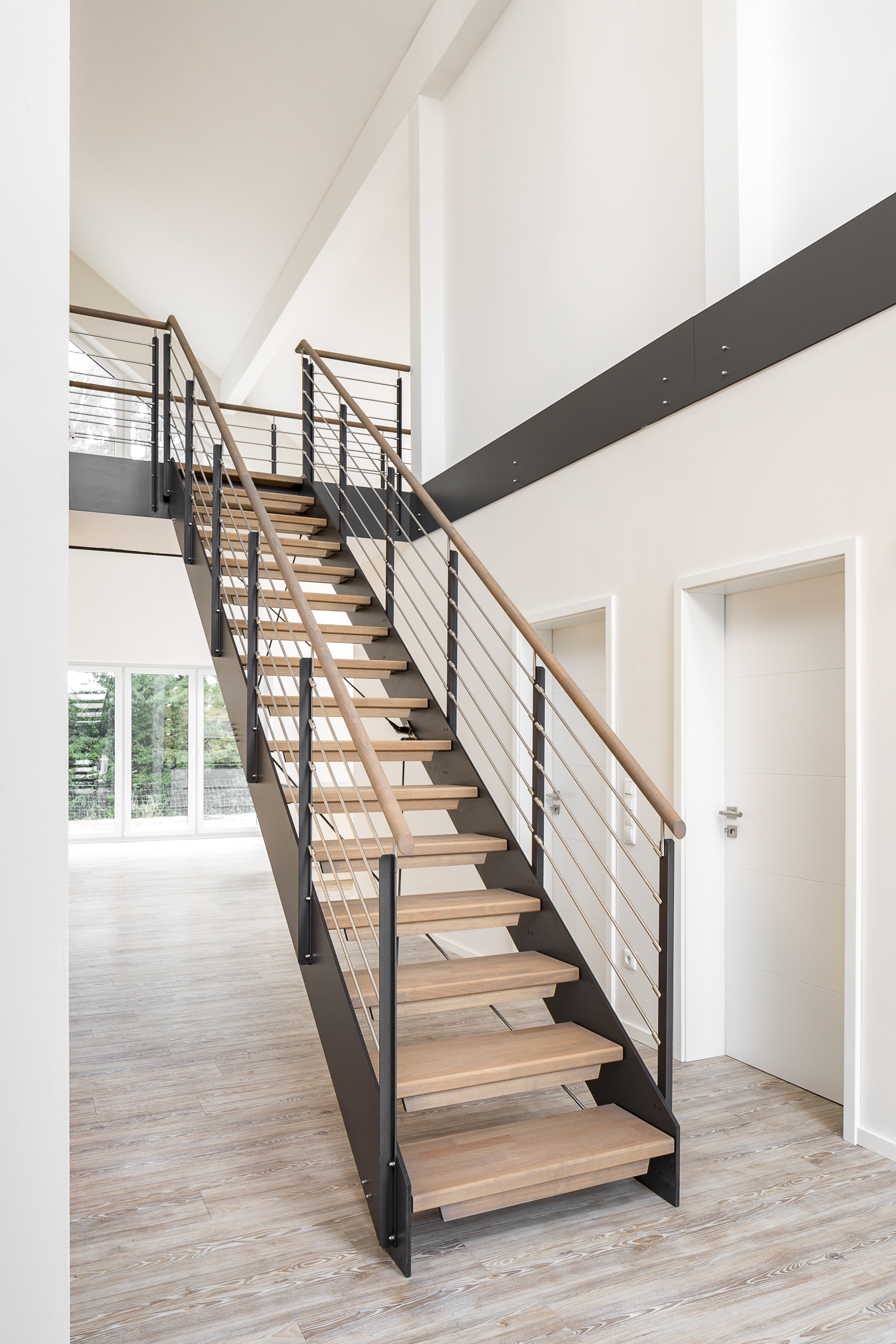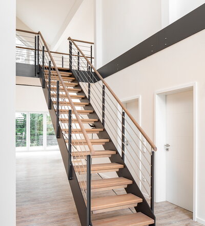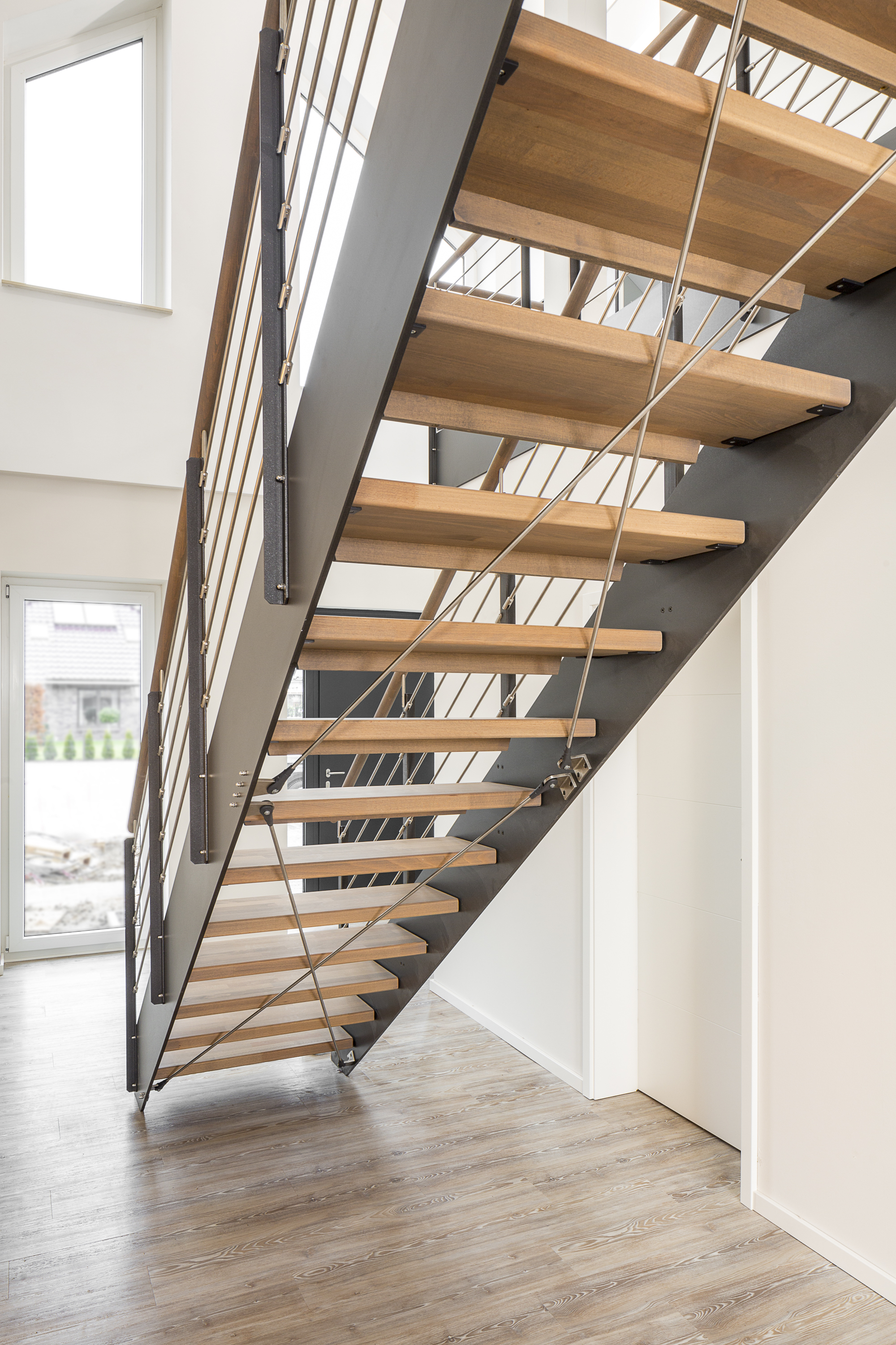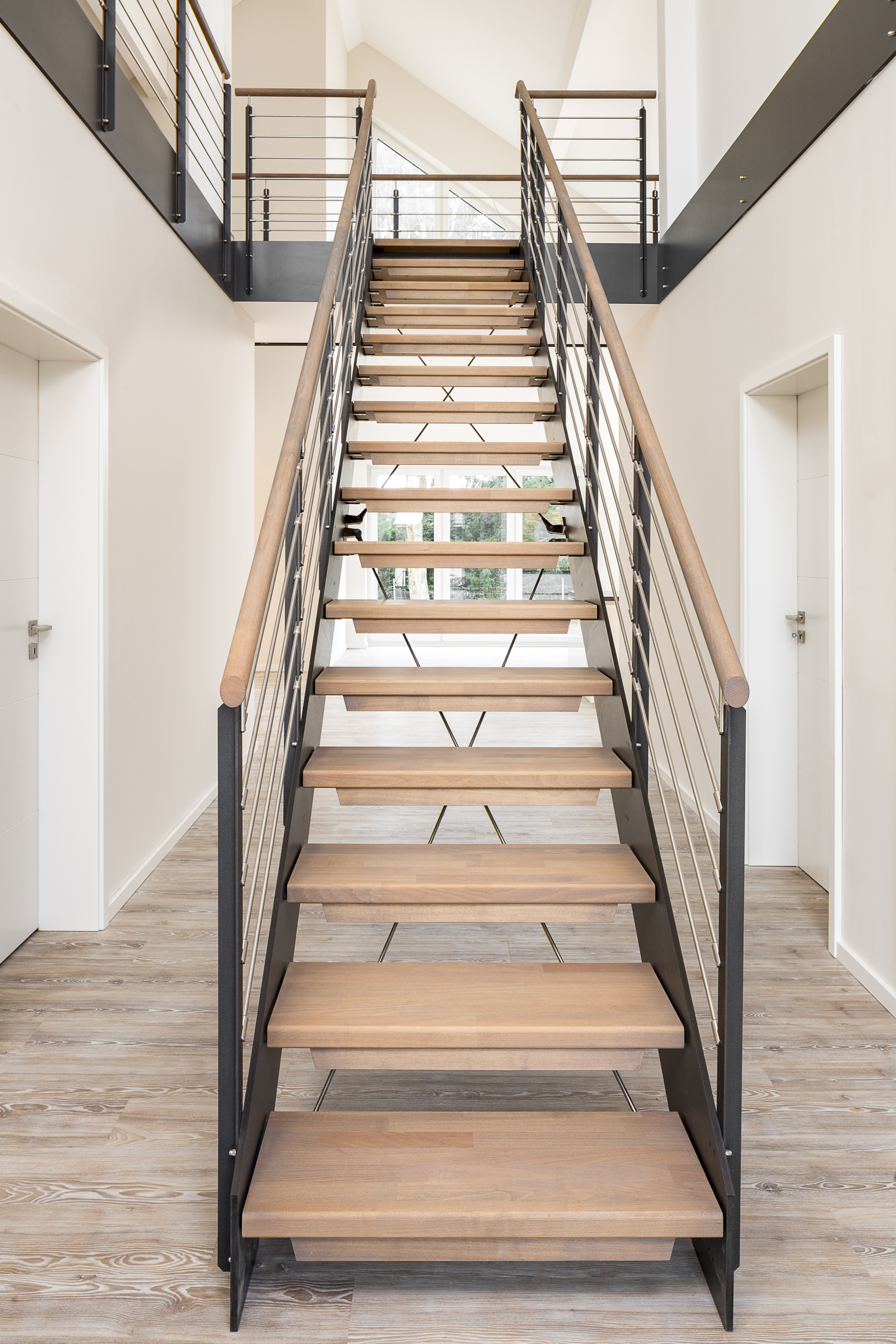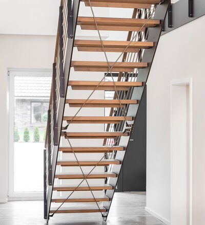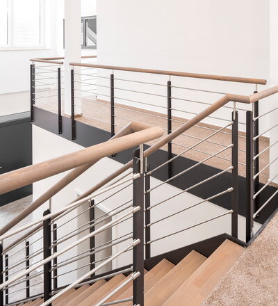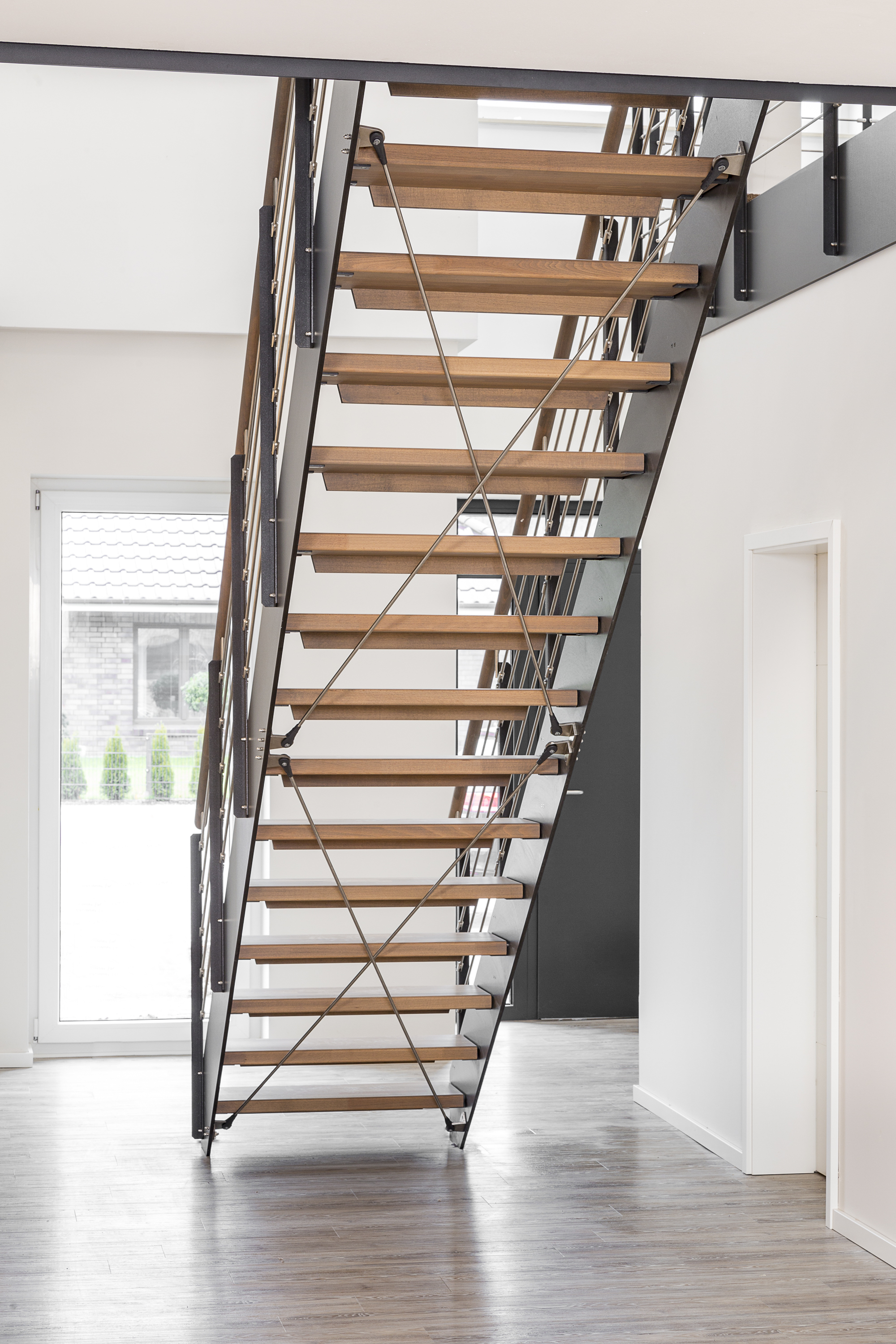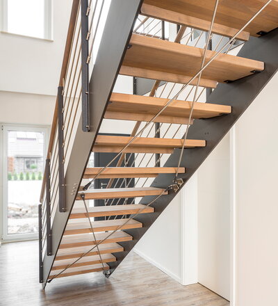 HPL-Treppe mit Relinggeländer und doppeltem Kreuzverband aus Edelstahlstäben, Stufen und Handlauf Holzart Buche geölt mit TBV Echtholz-Öl Farbton Havanna.