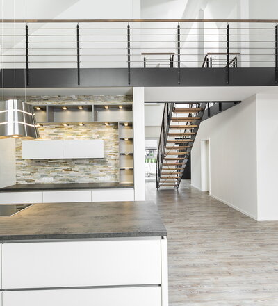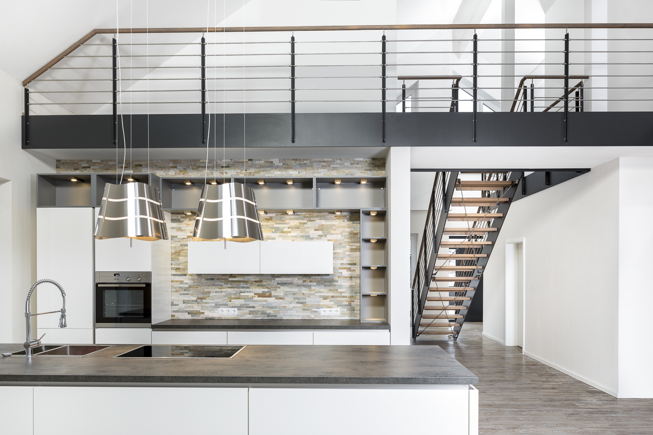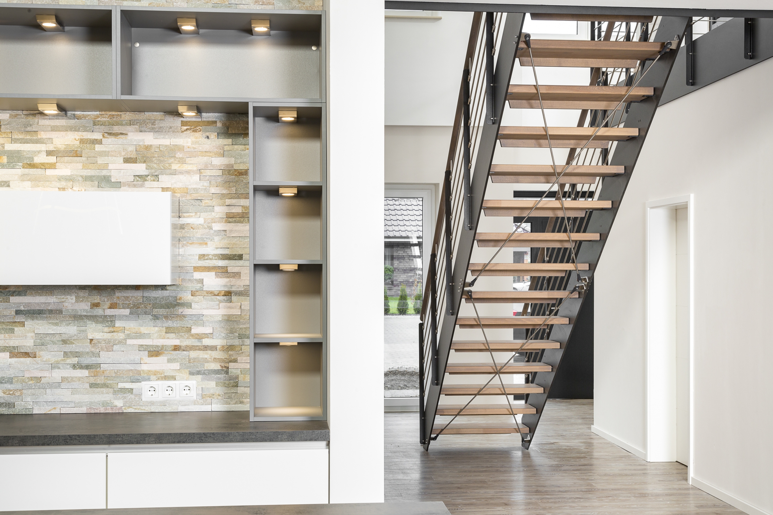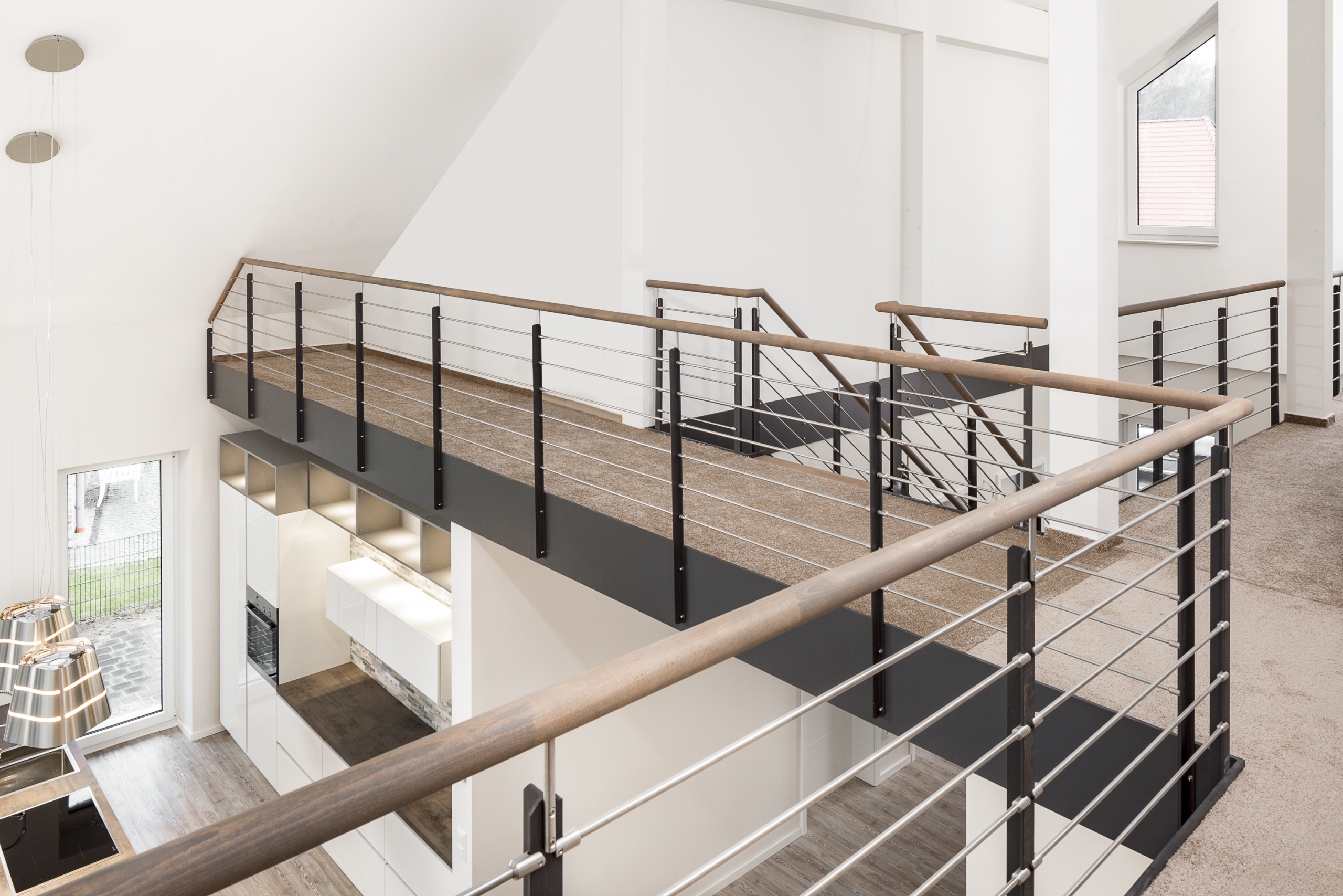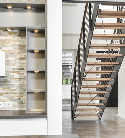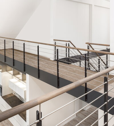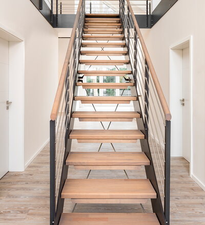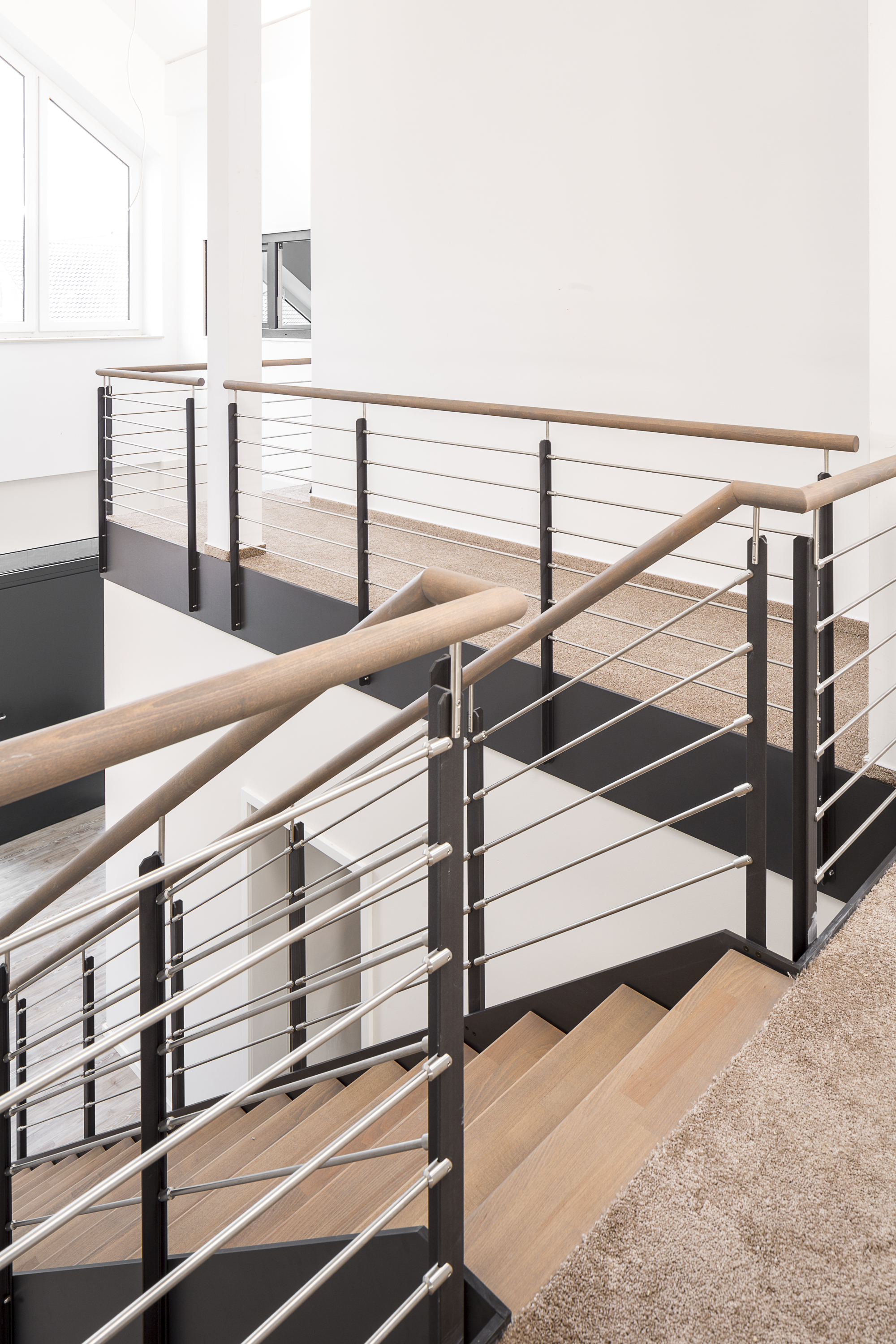 HPL-Treppe mit Relinggeländer und doppeltem Kreuzverband aus Edelstahlstäben, Stufen und Handlauf Holzart Buche geölt mit TBV Echtholz-Öl Farbton Havanna.