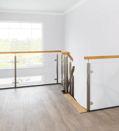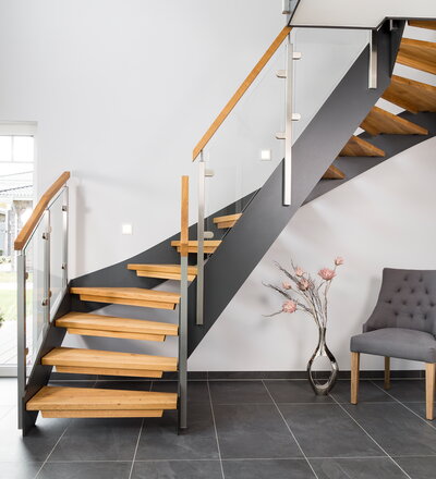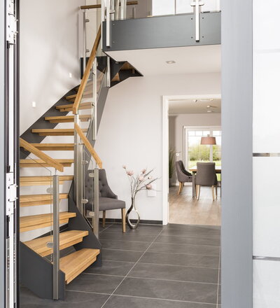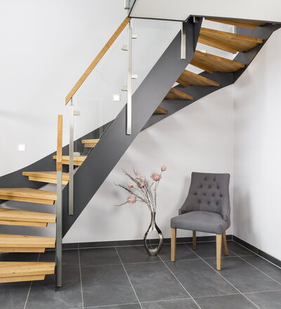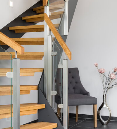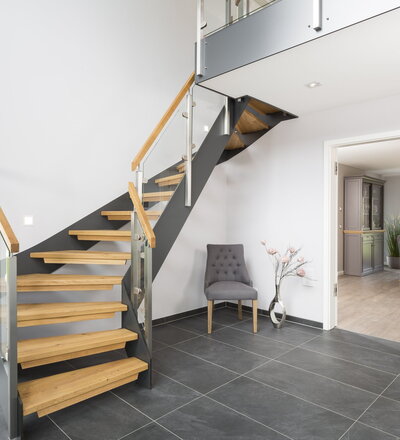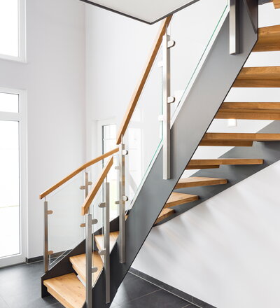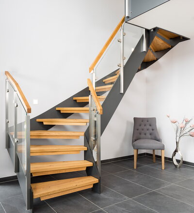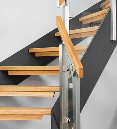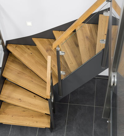 Halb gewendelte HPL-Treppe mit Glasgeländer, Handlauf und Stufen in der Holzart Eiche Pure (farblos) geölt mit TBV Echtholz-Öl