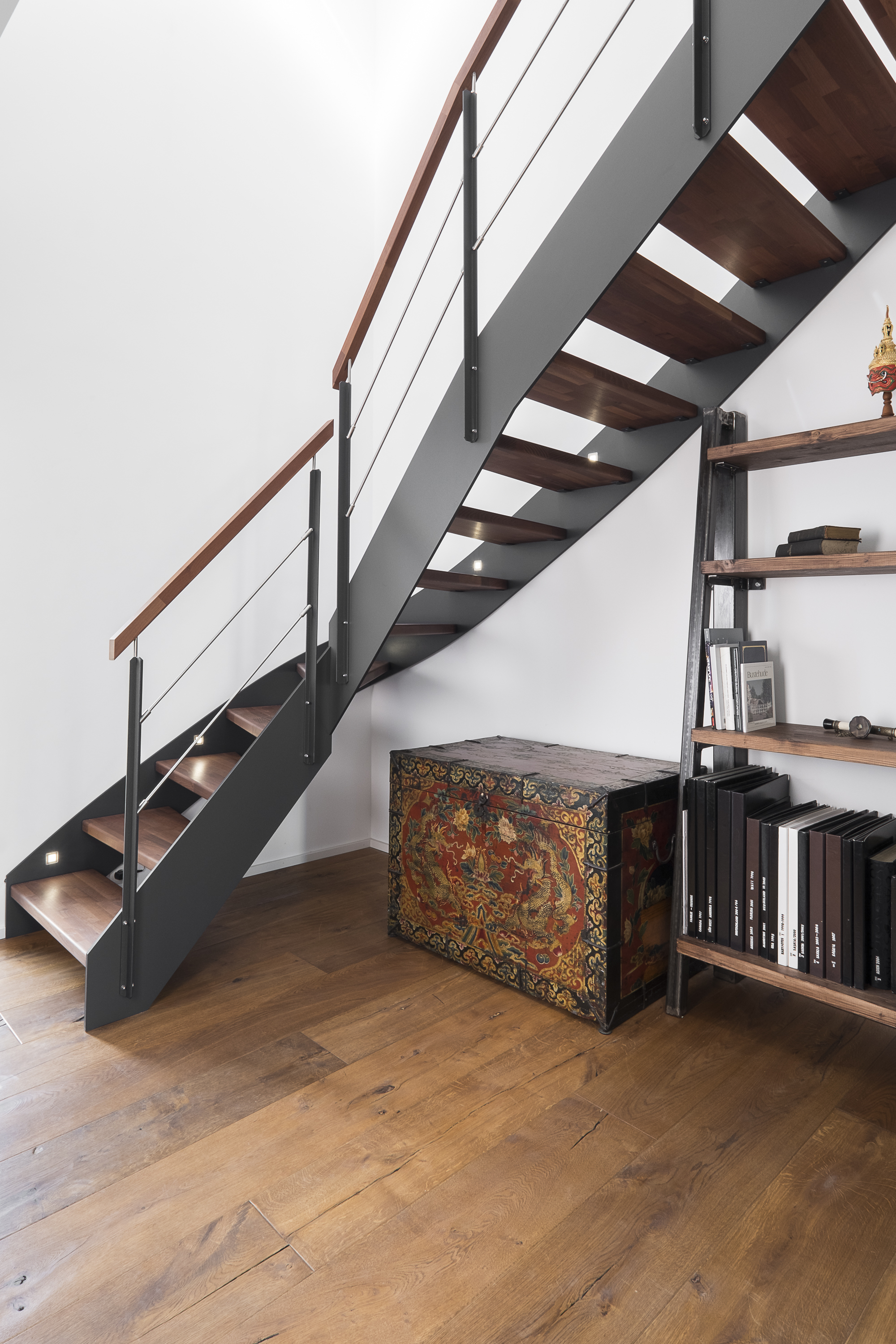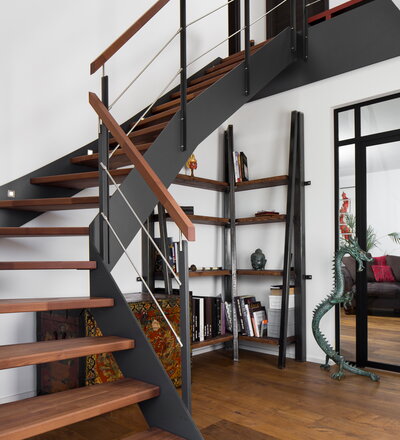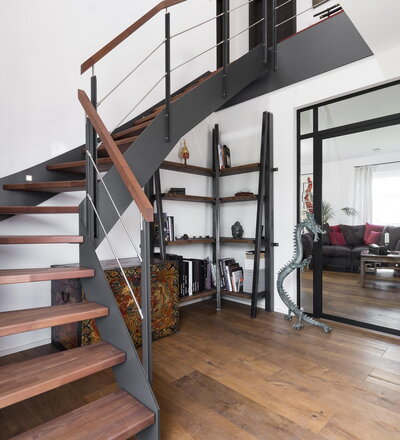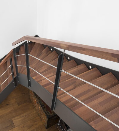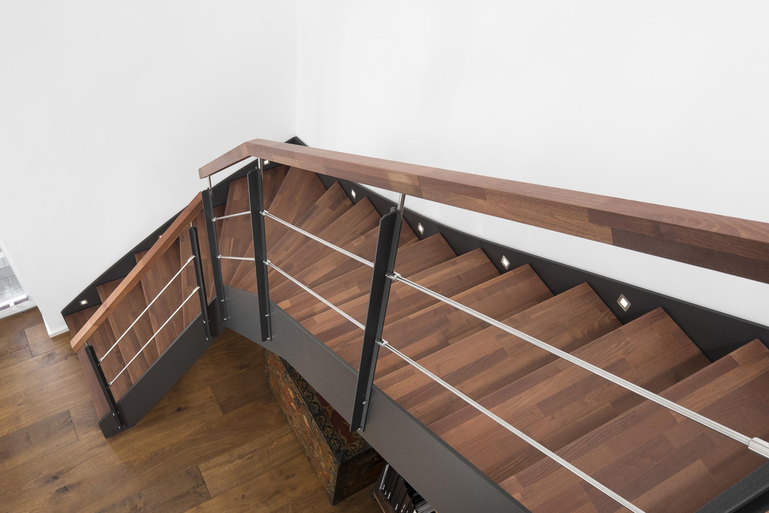1/4 gewendelte HPL-Treppe mit Milano 1 Geländer und LED-Beleuchtung, Handlauf und Stufen in der Holzart Akazie mosaik Pure (farblos) geölt mit TBV Echtholz-Öl