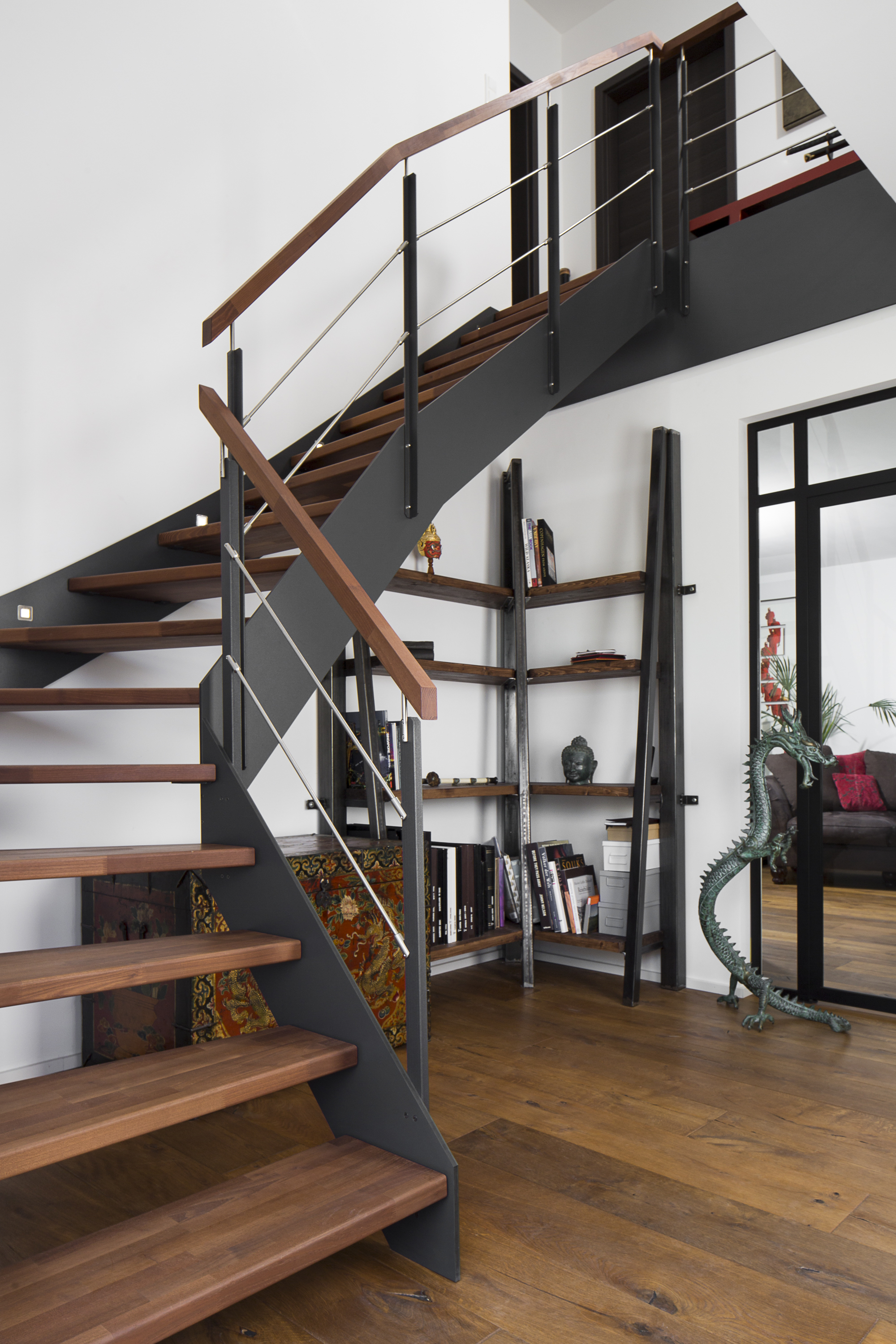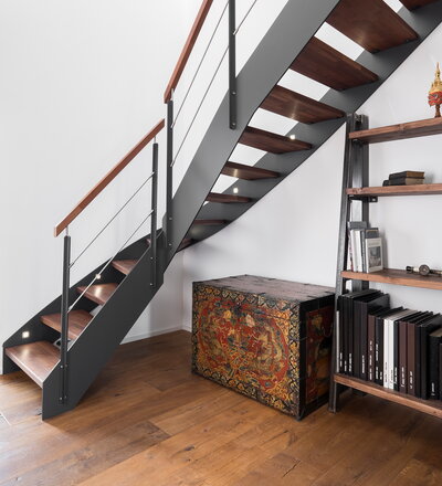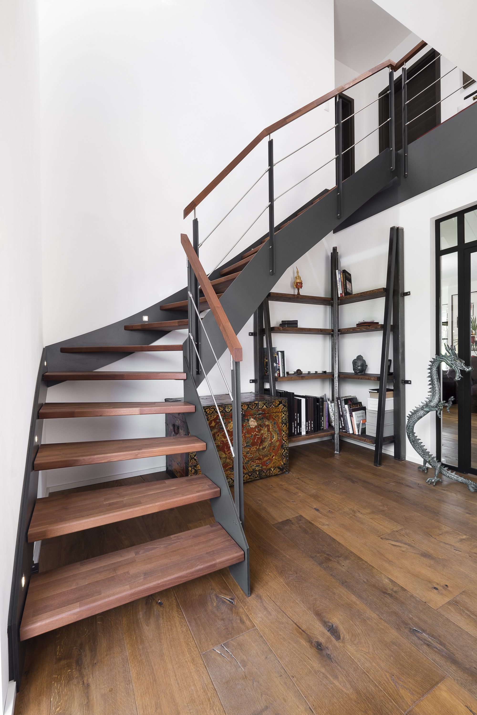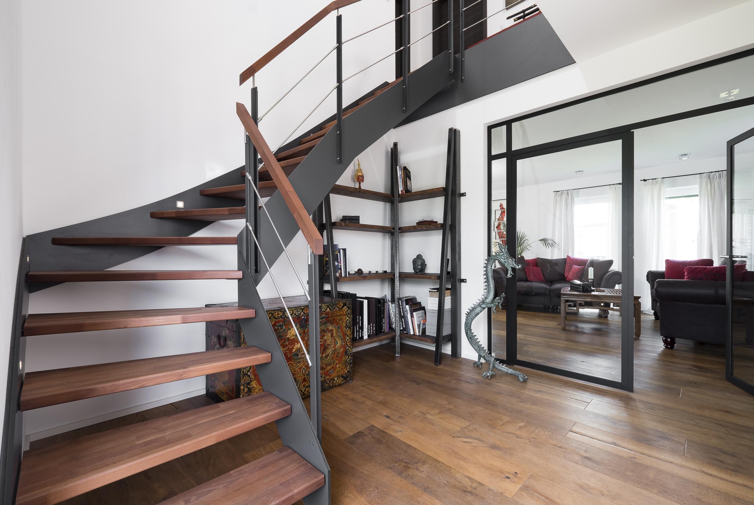 1/4 gewendelte HPL-Treppe mit Milano 1 Geländer und LED-Beleuchtung, Handlauf und Stufen in der Holzart Akazie mosaik Pure (farblos) geölt mit TBV Echtholz-Öl