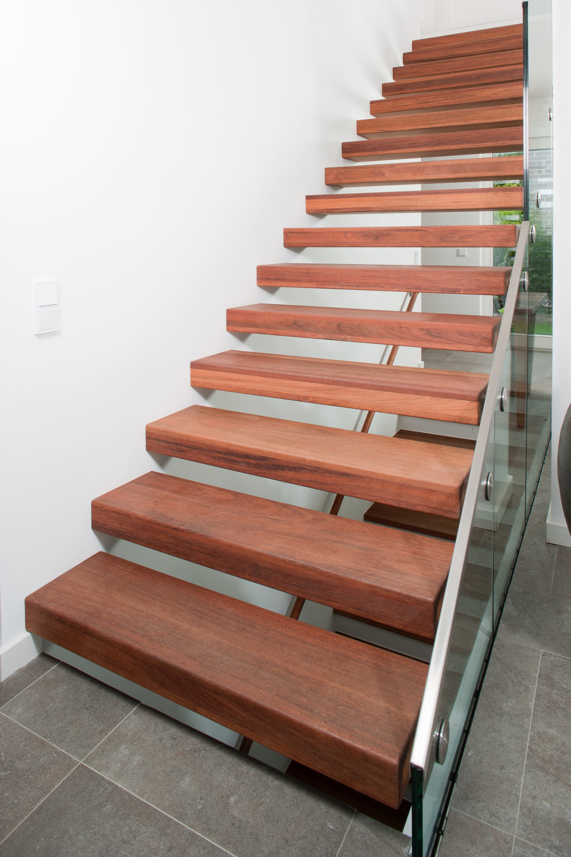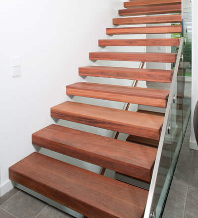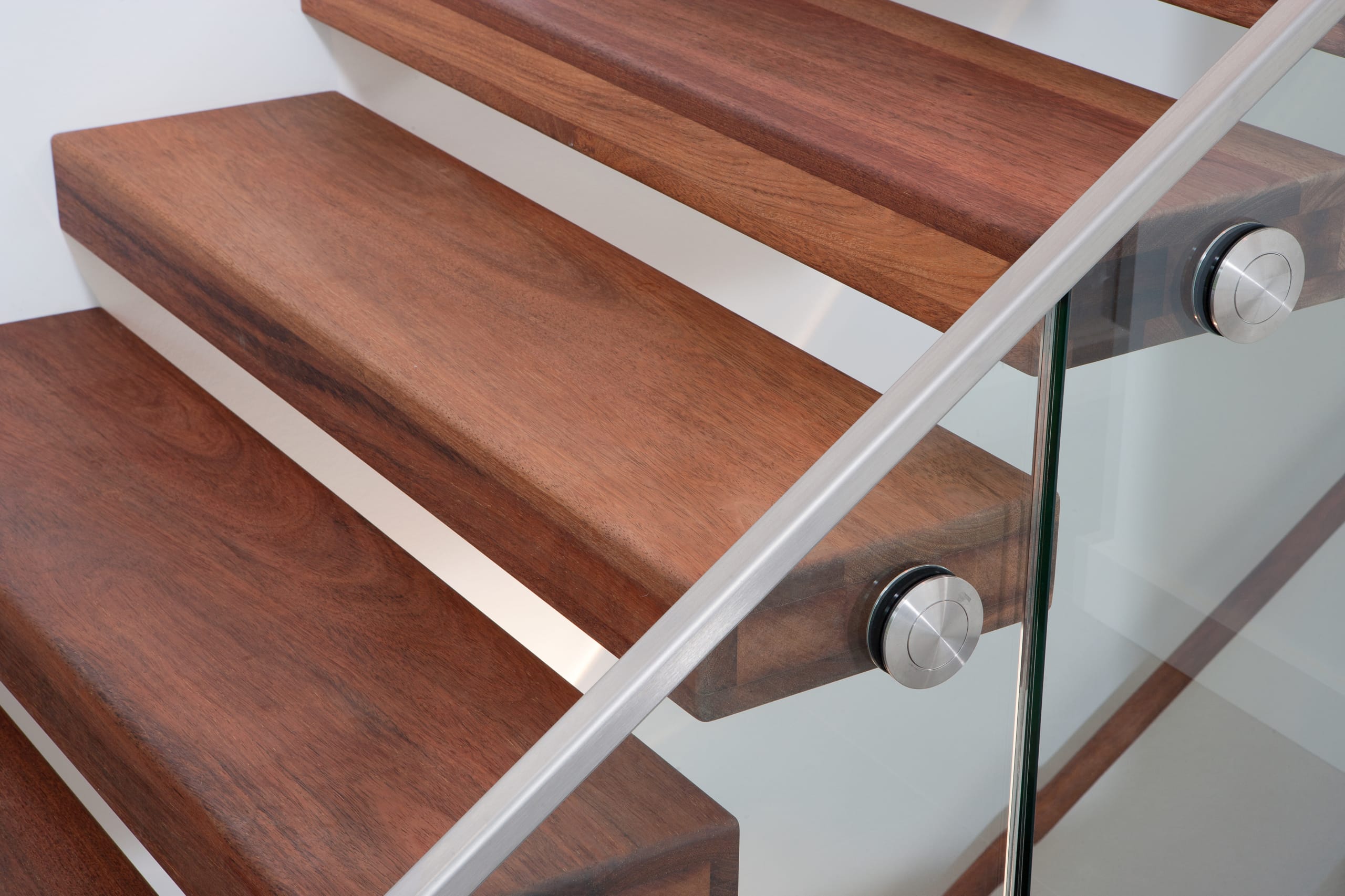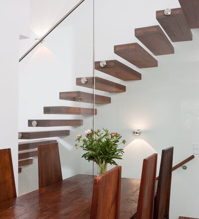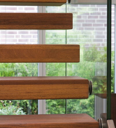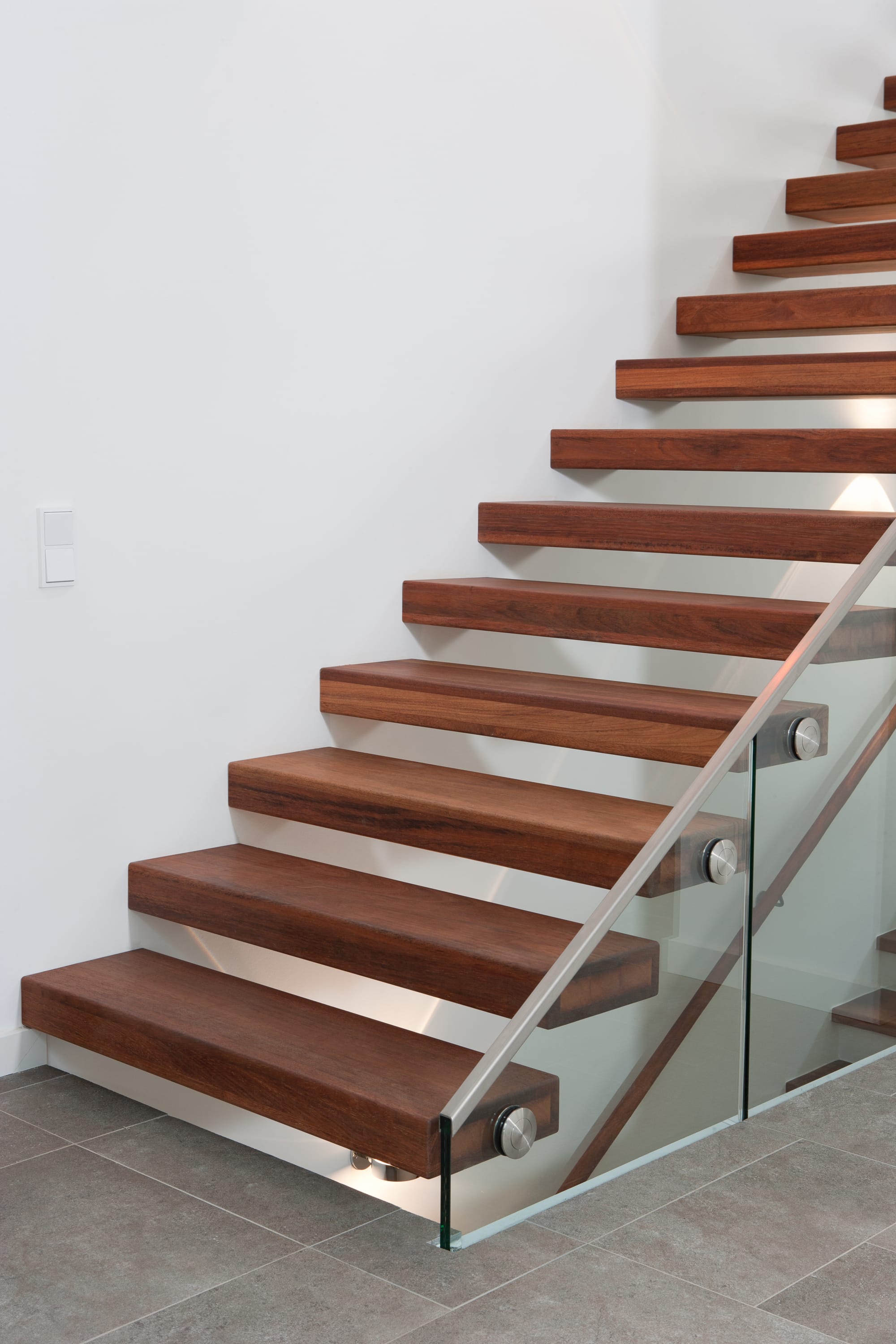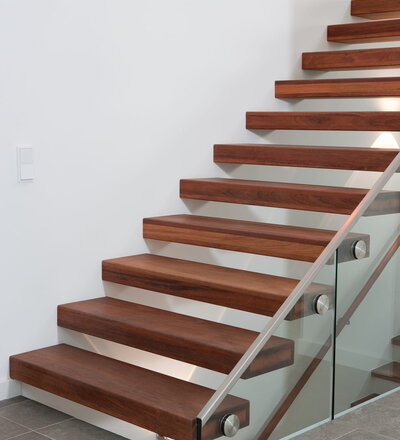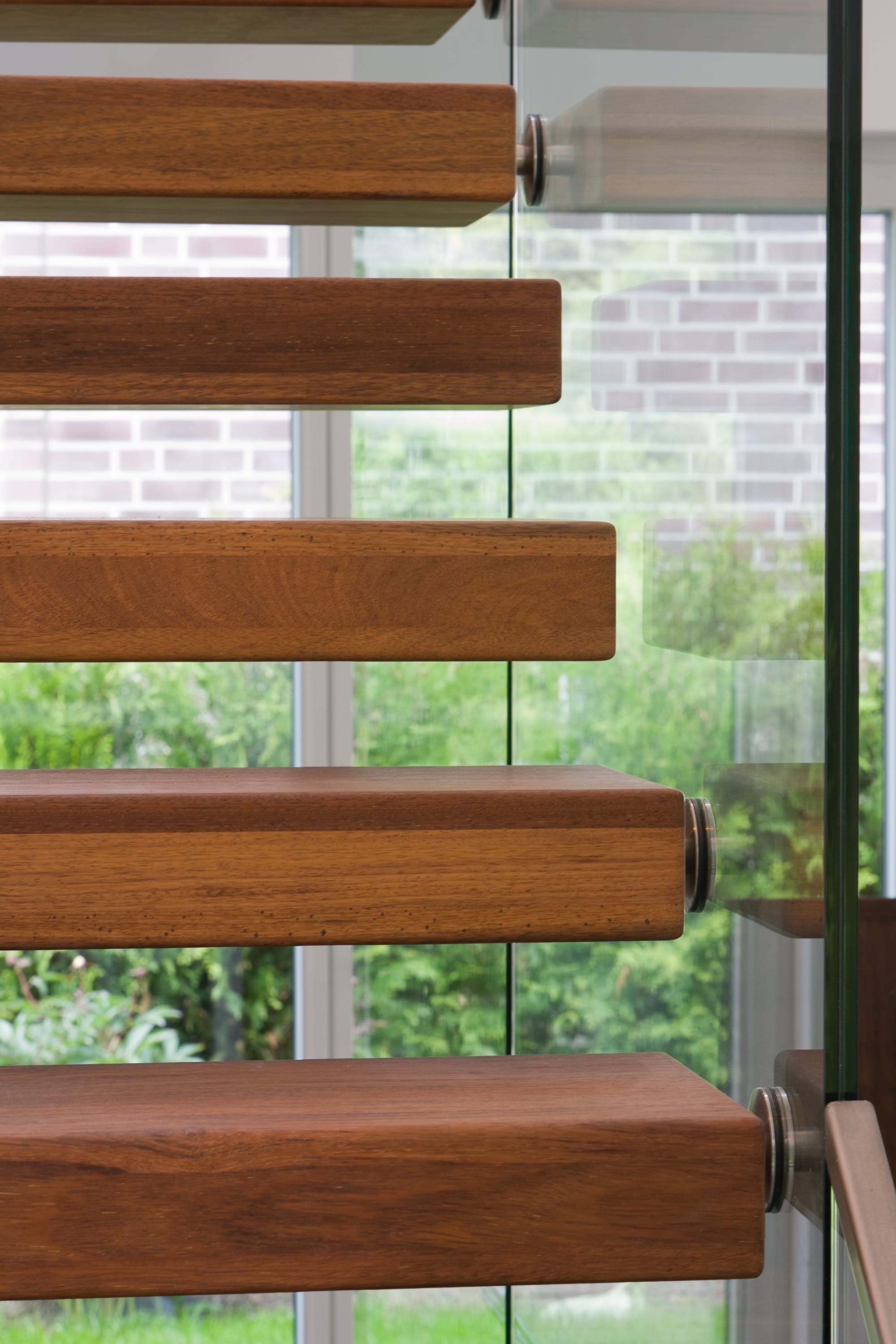 Kragarmtreppe mit schwebender Stufenoptik und Glasgeländer; Holzart Merbau