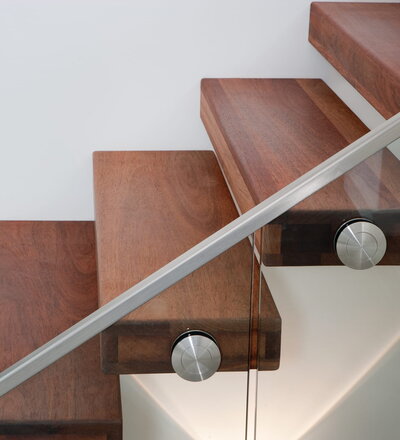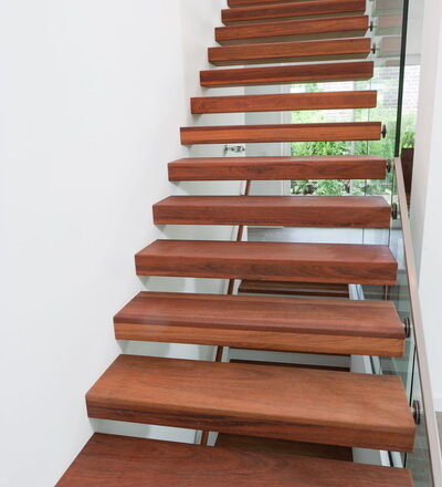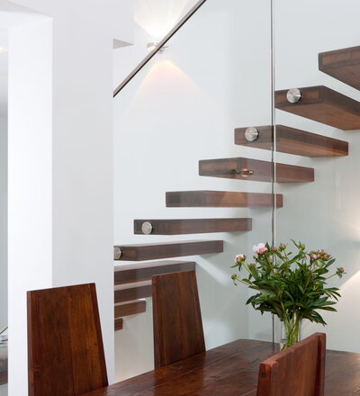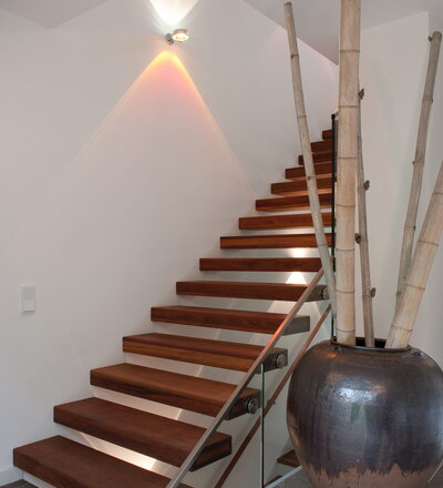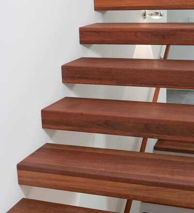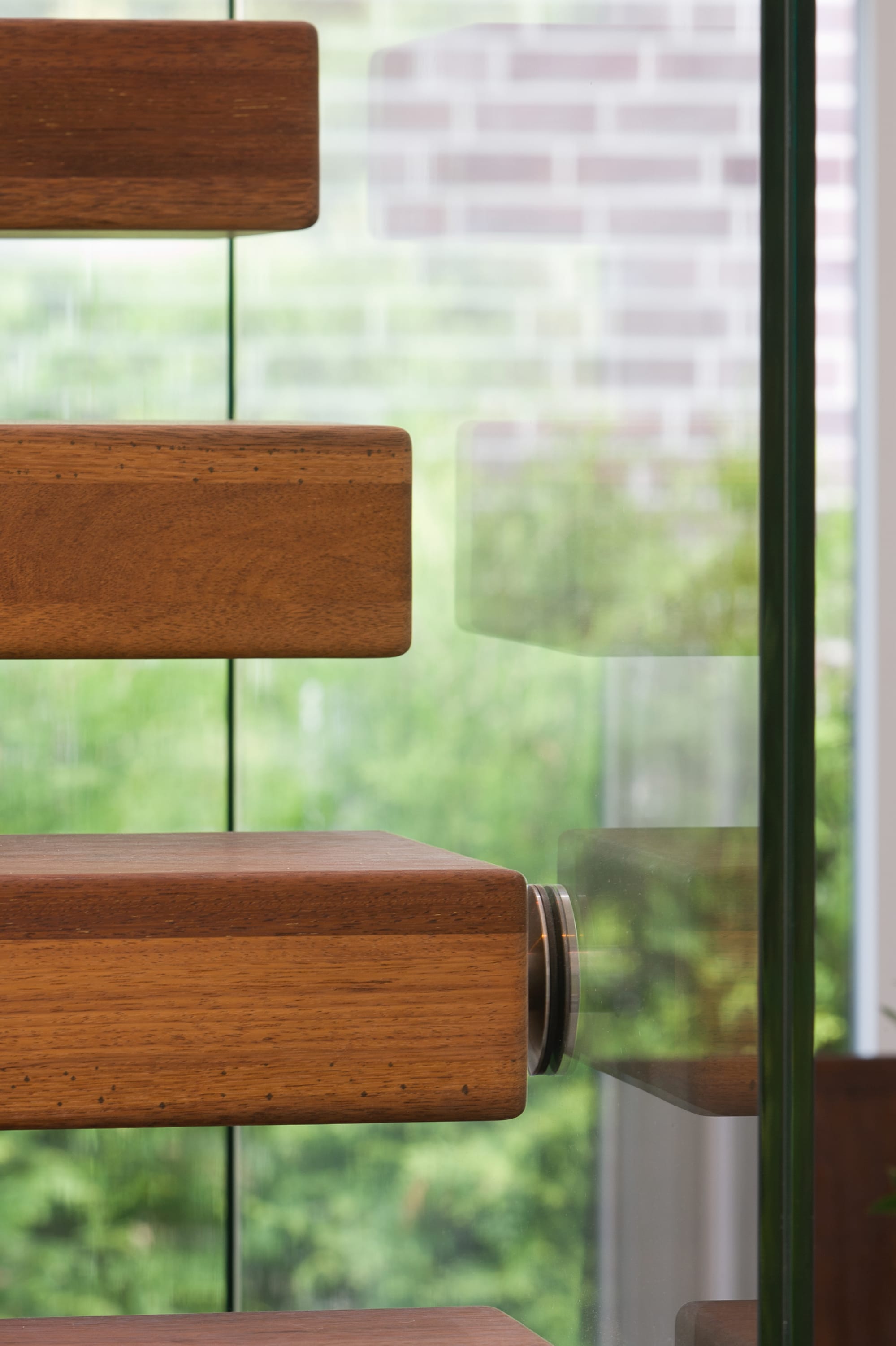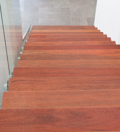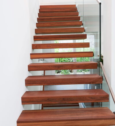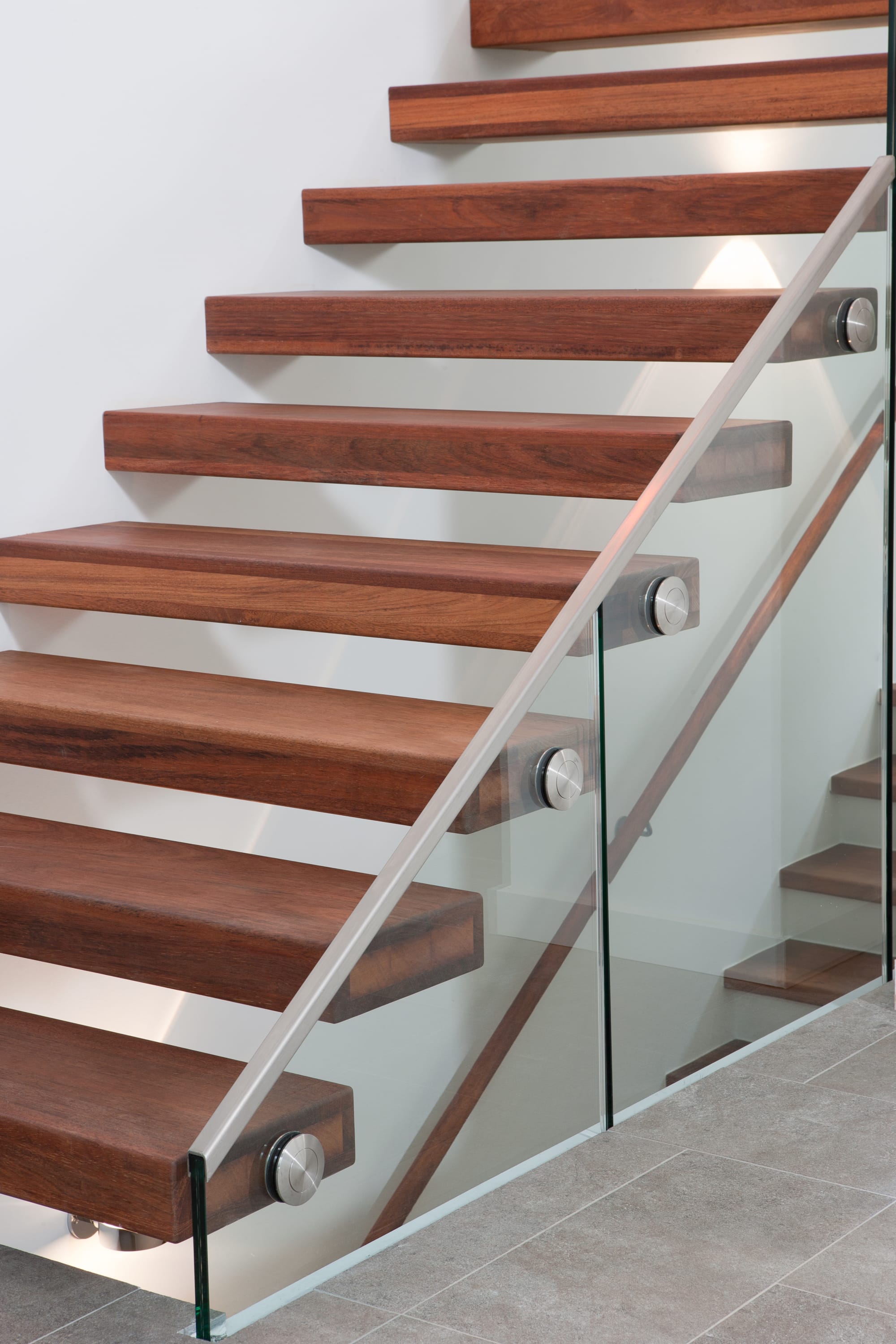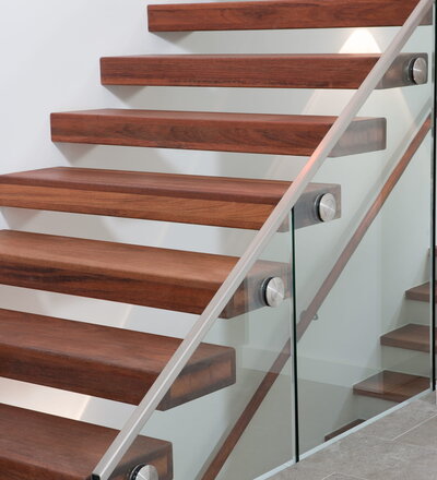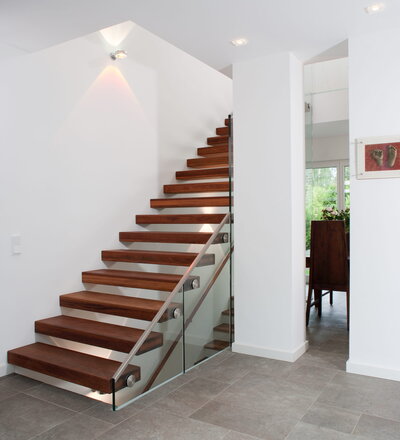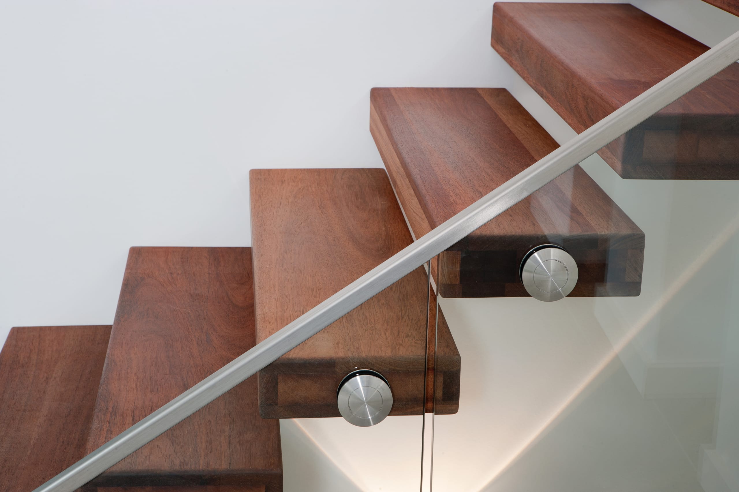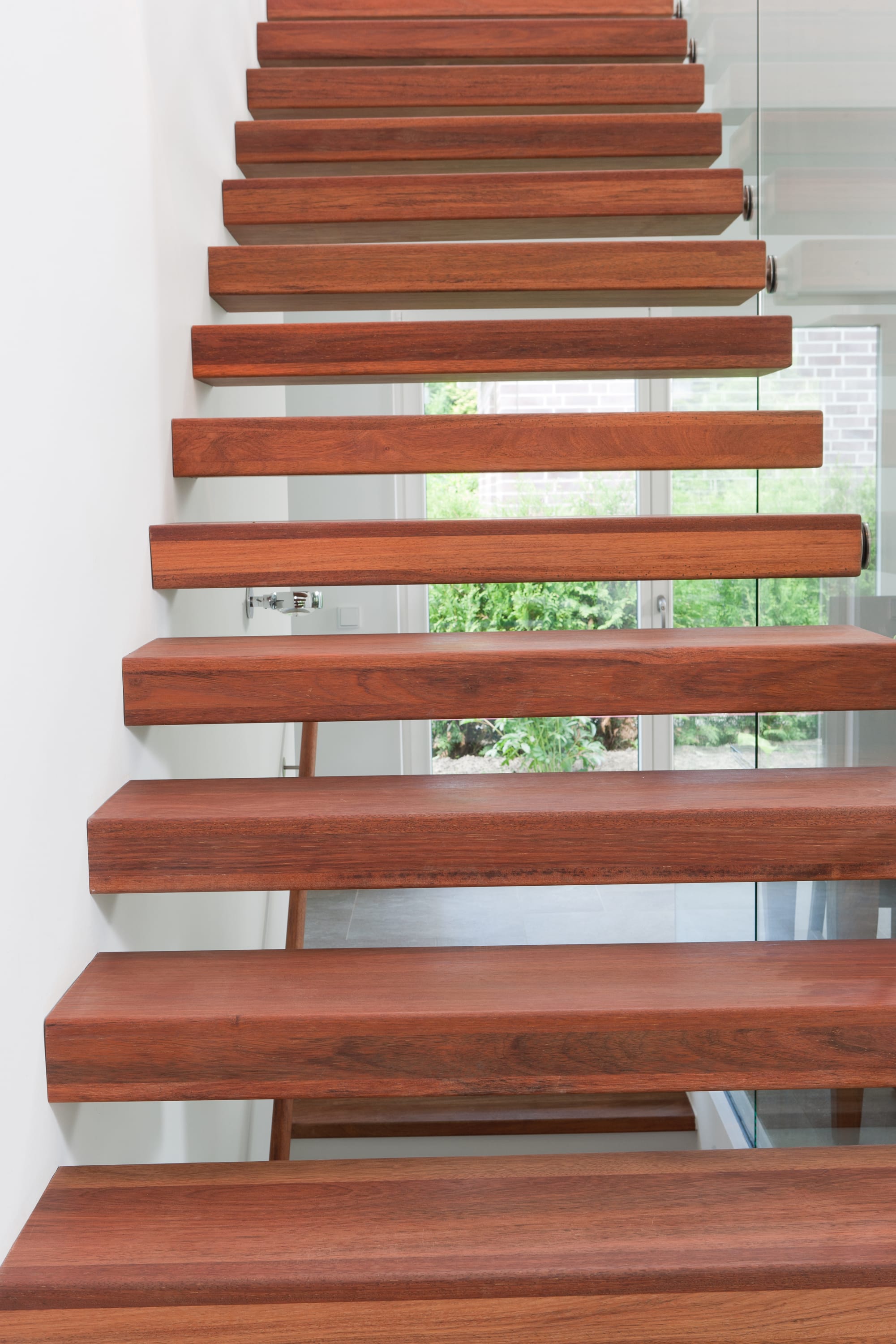 Kragarmtreppe mit schwebender Stufenoptik und Glasgeländer; Holzart Merbau