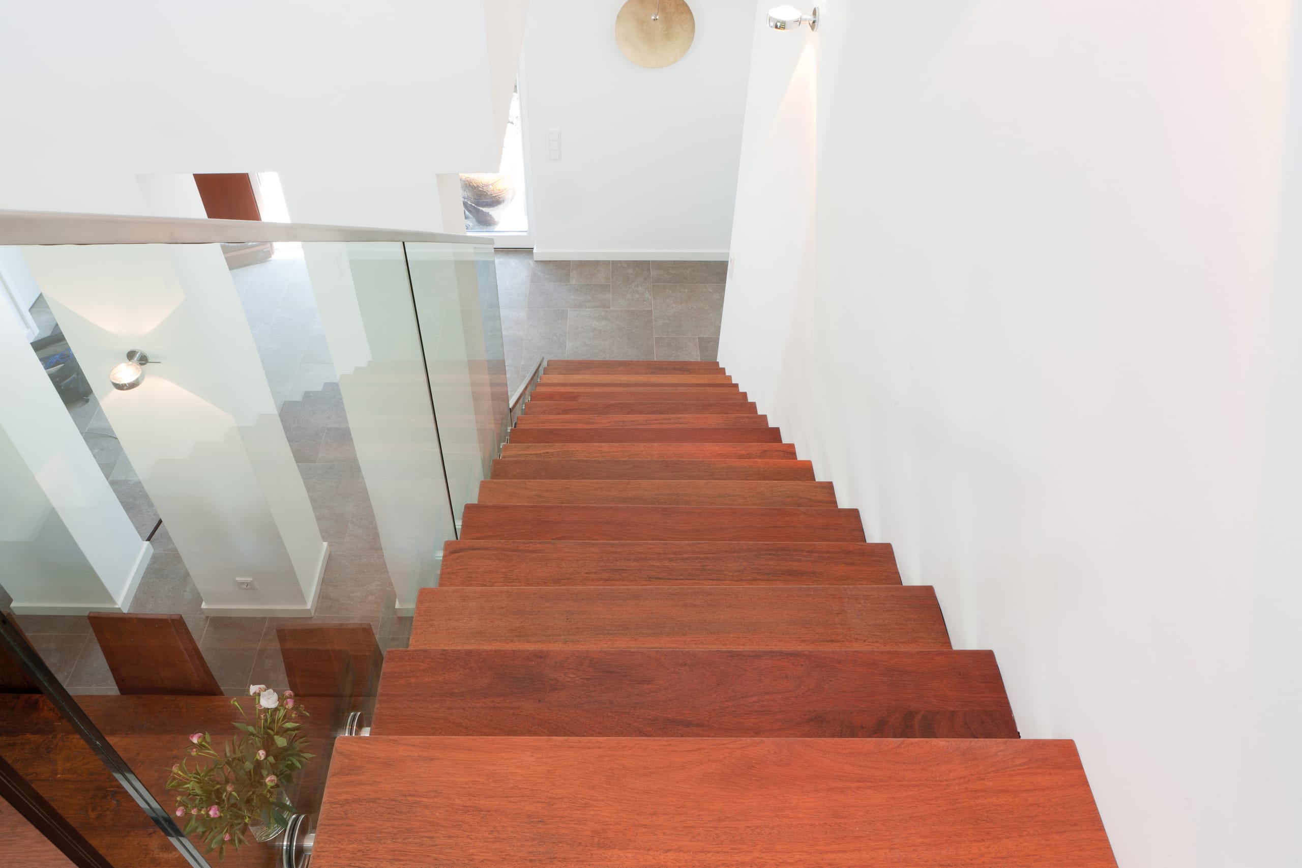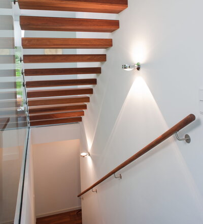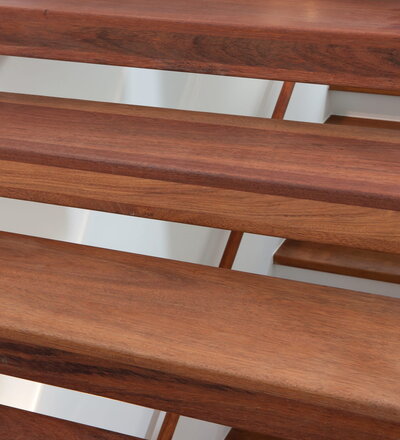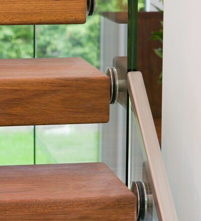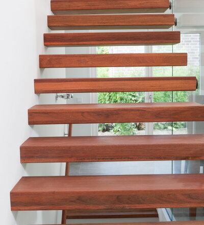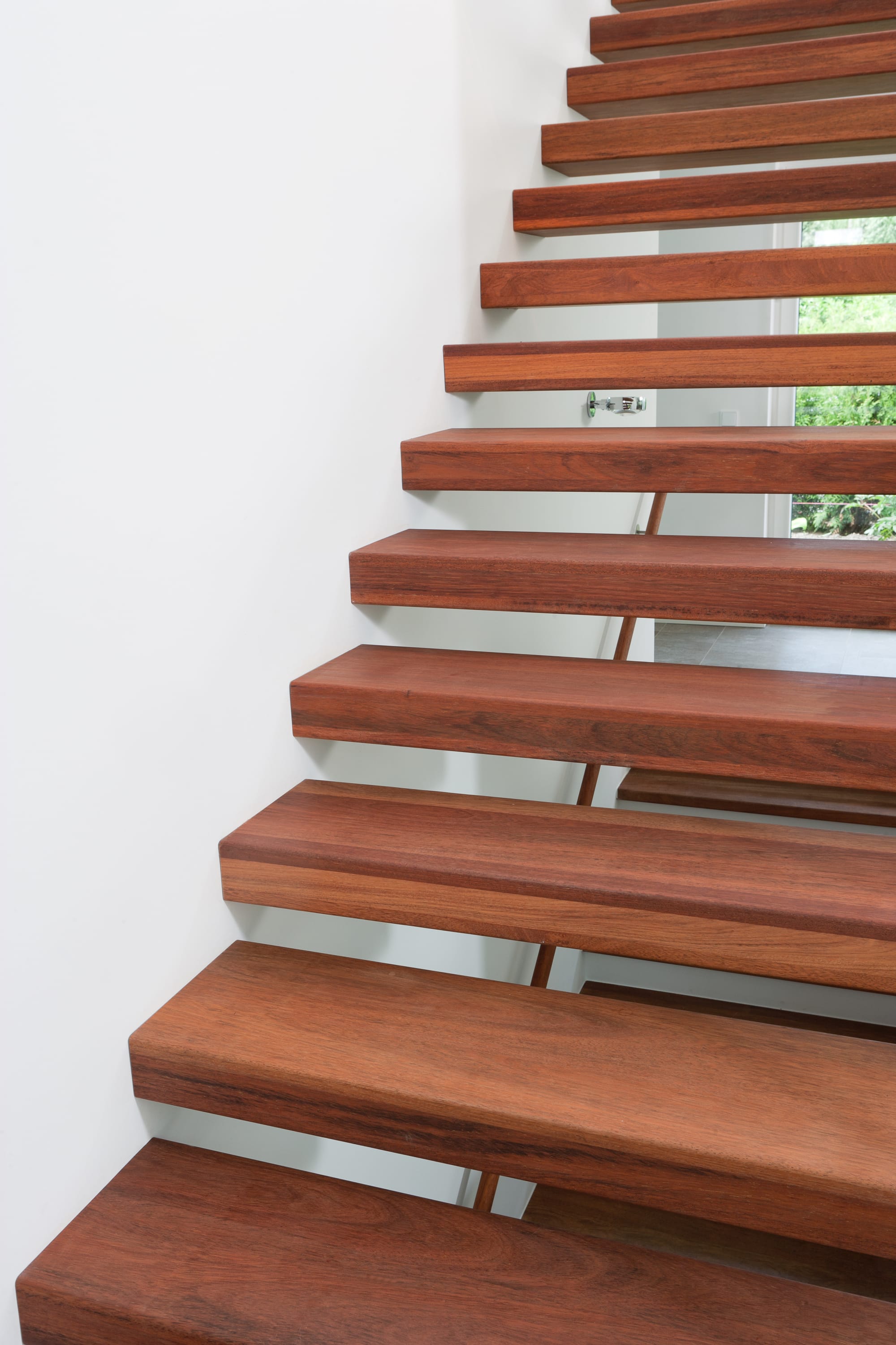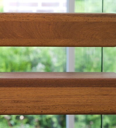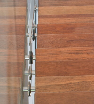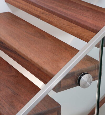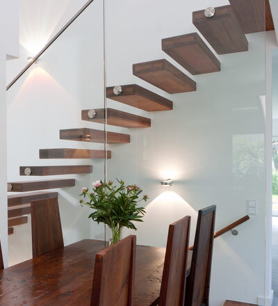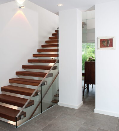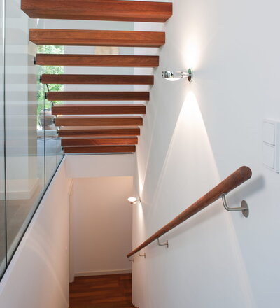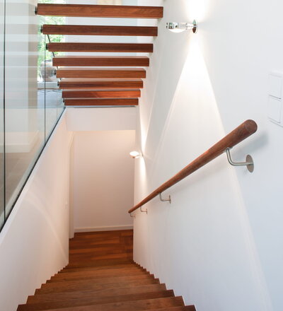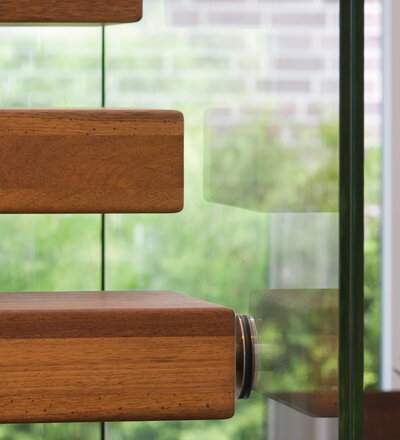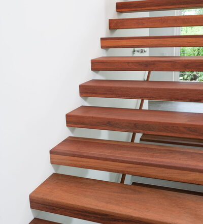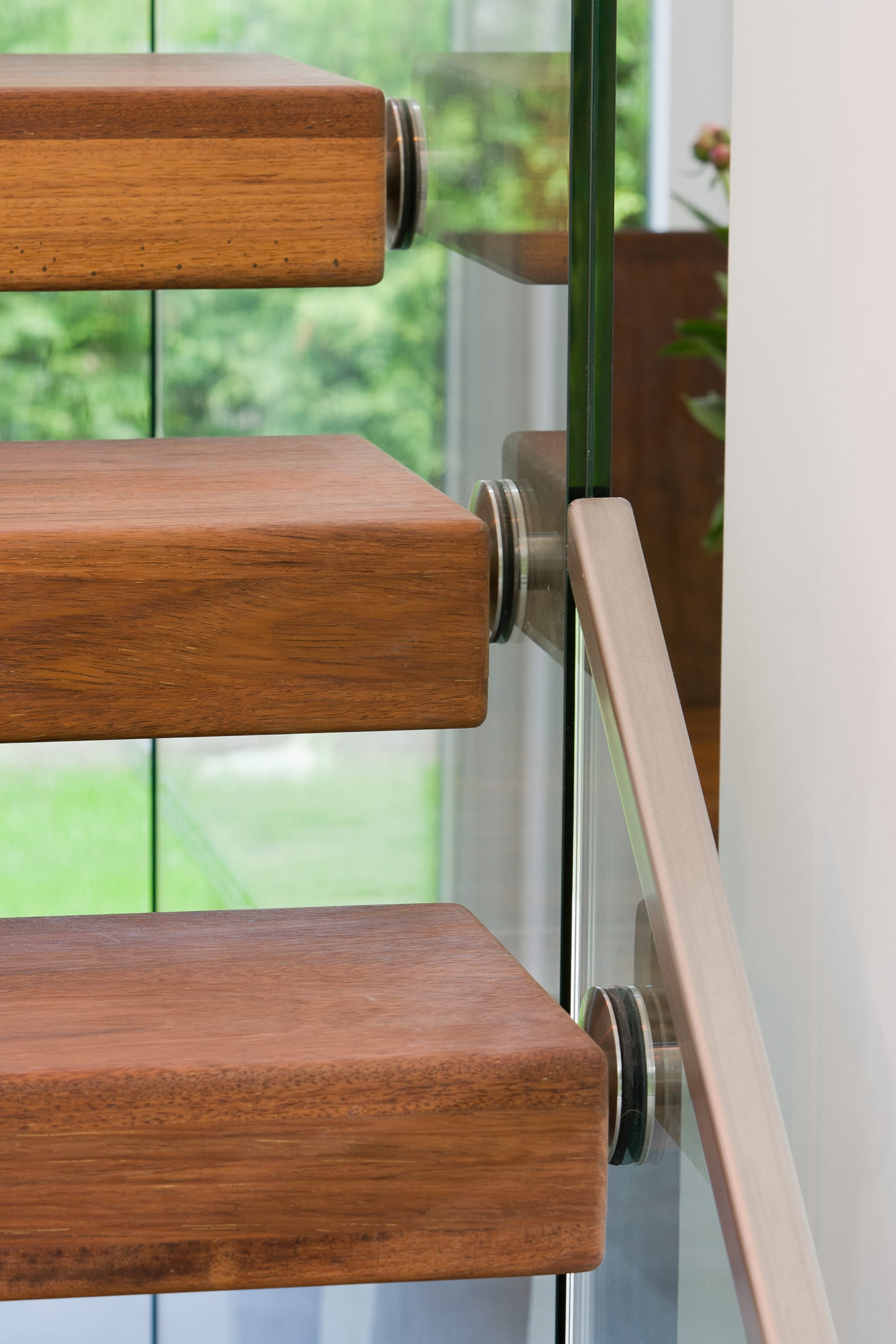Kragarmtreppe mit schwebender Stufenoptik und Glasgeländer; Holzart Merbau
