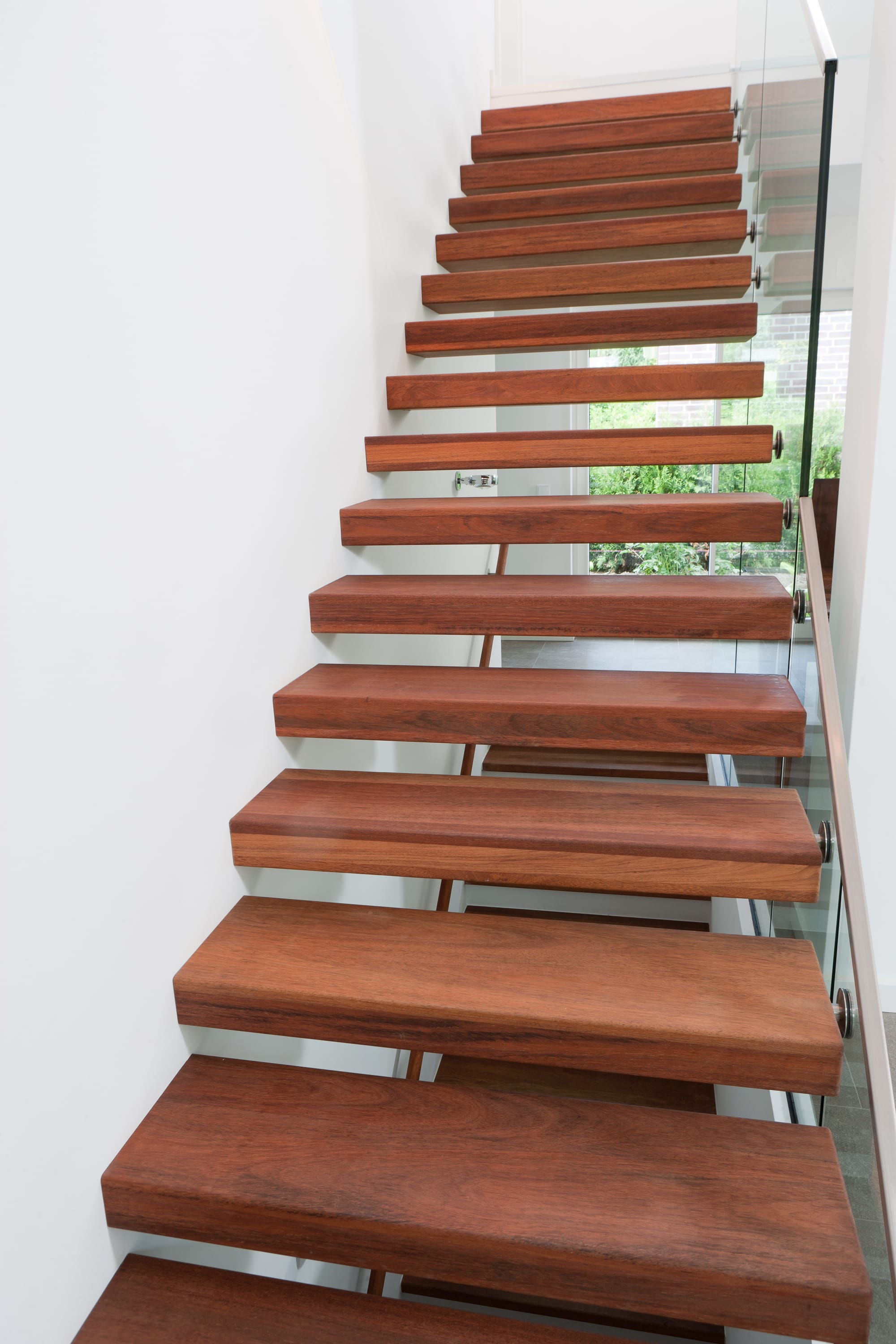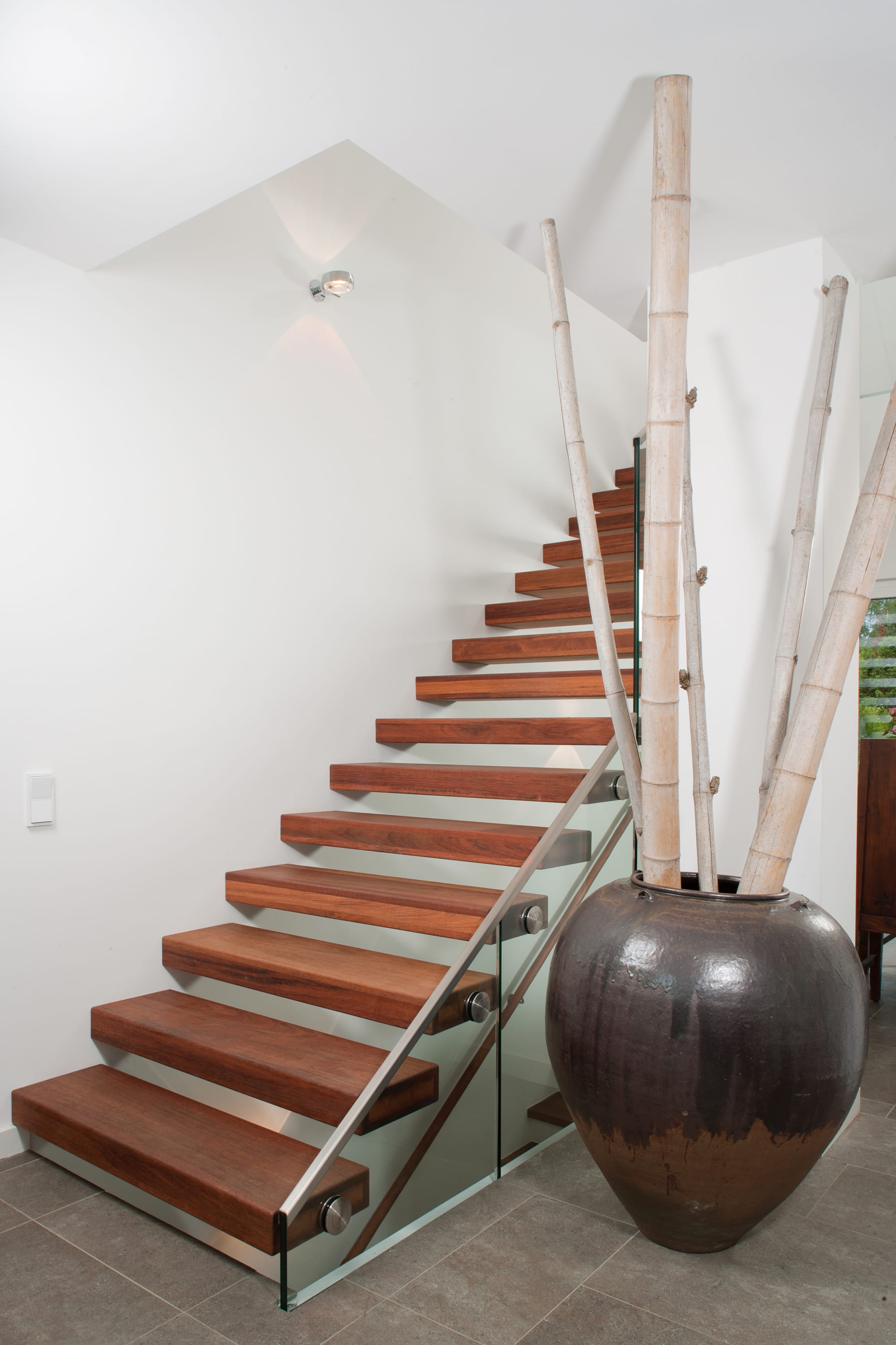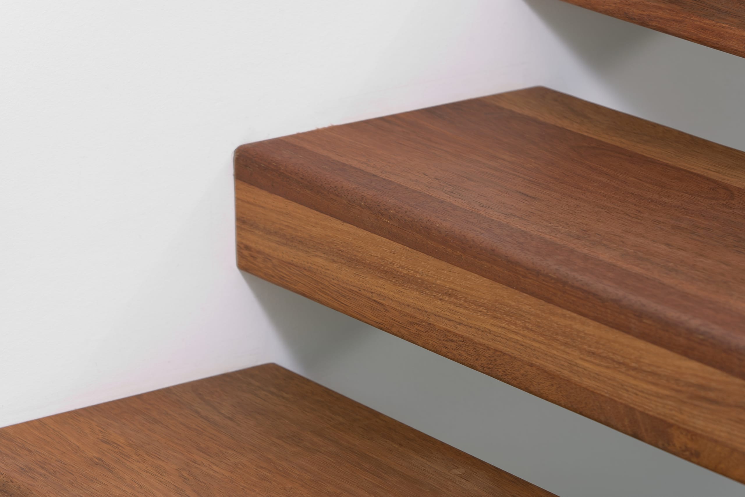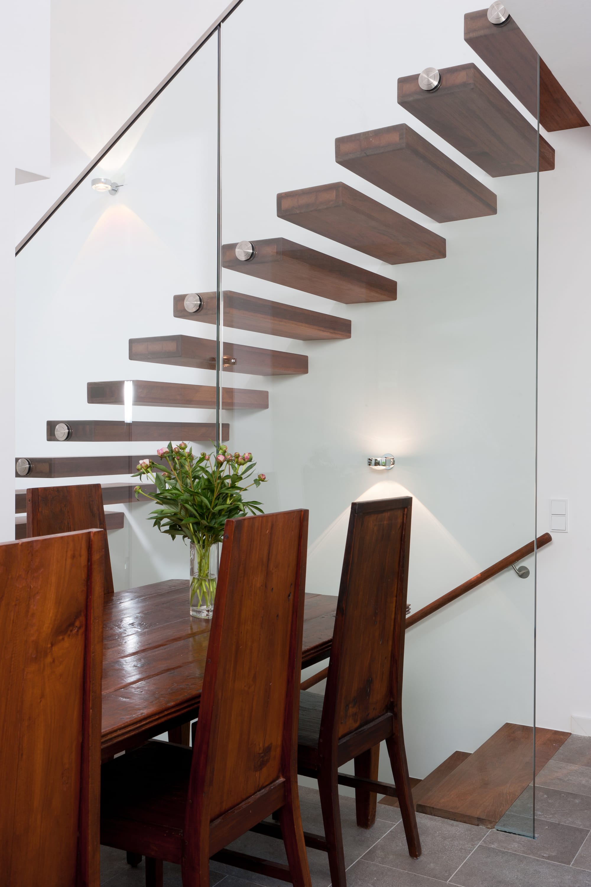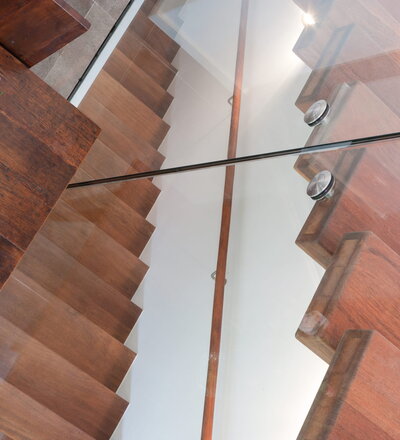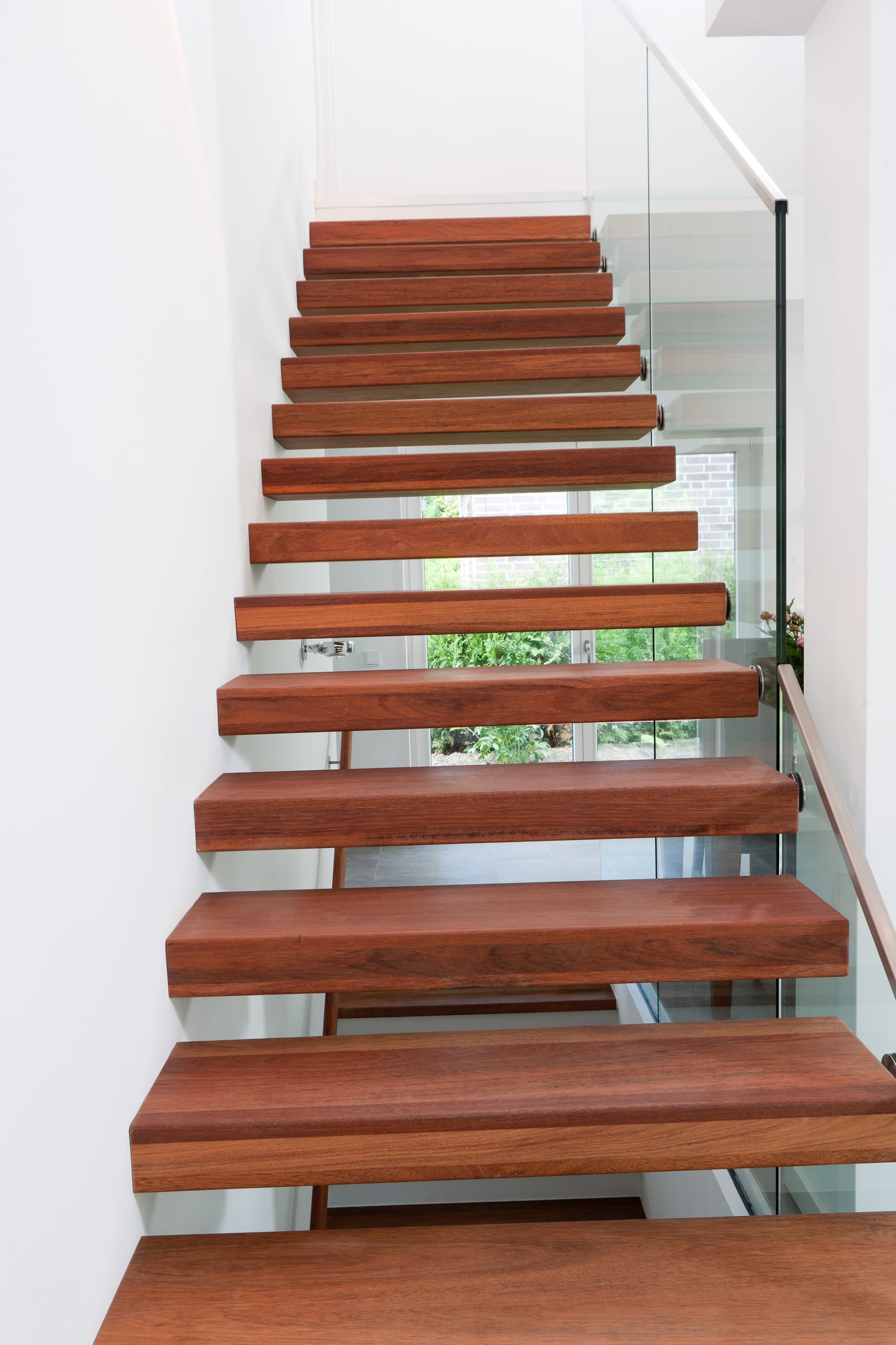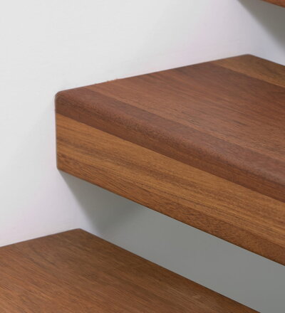 Kragarmtreppe mit schwebender Stufenoptik und Glasgeländer; Holzart Merbau