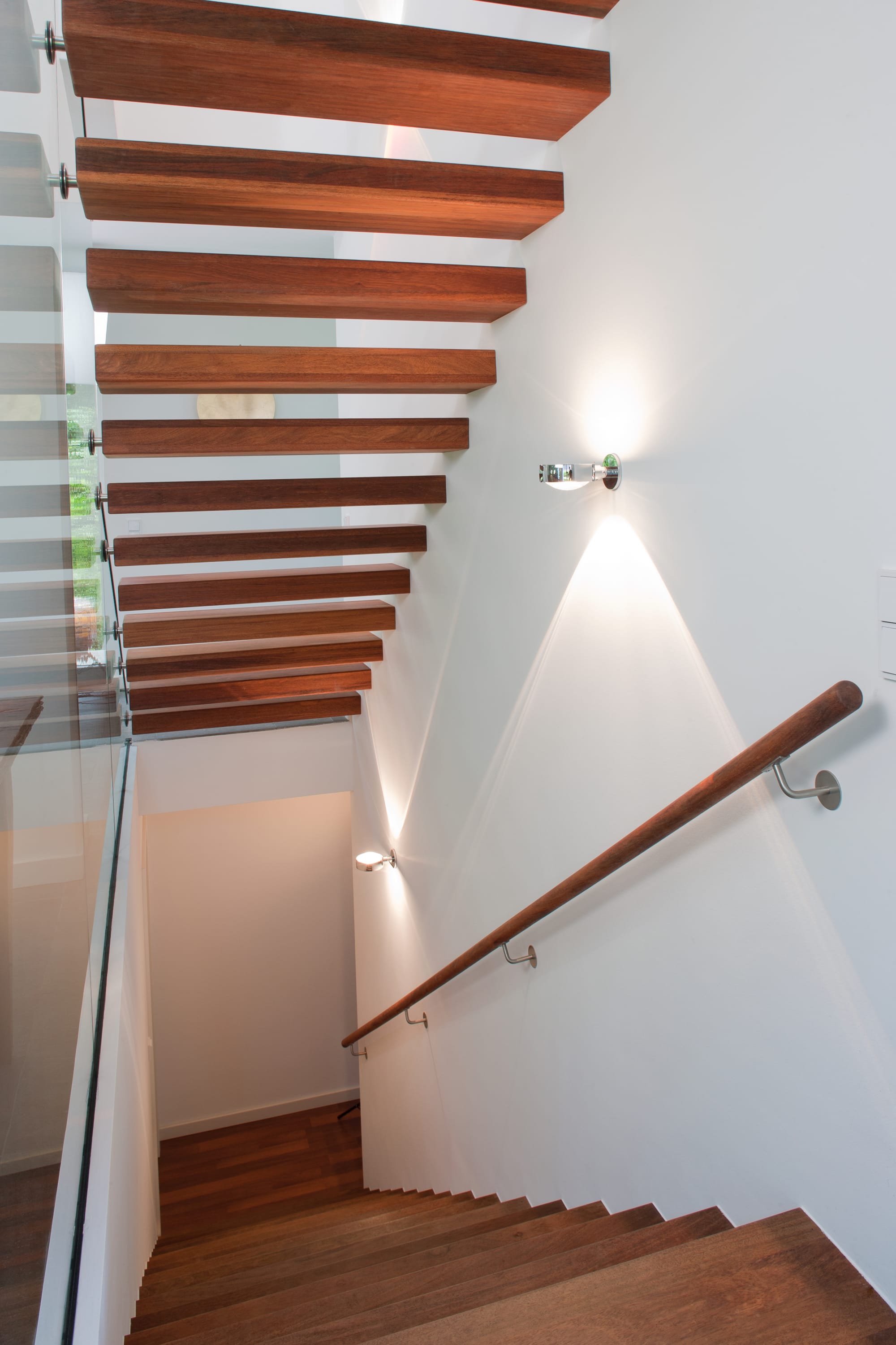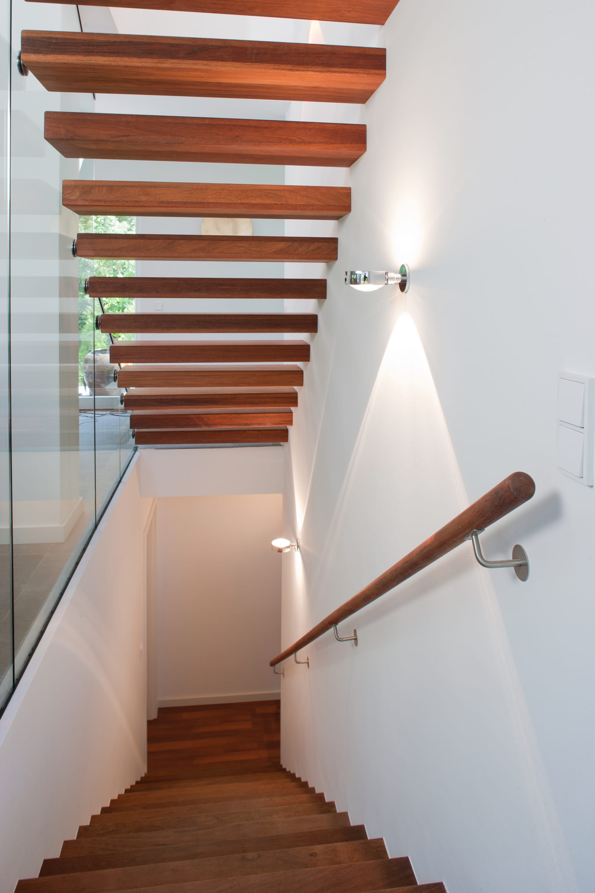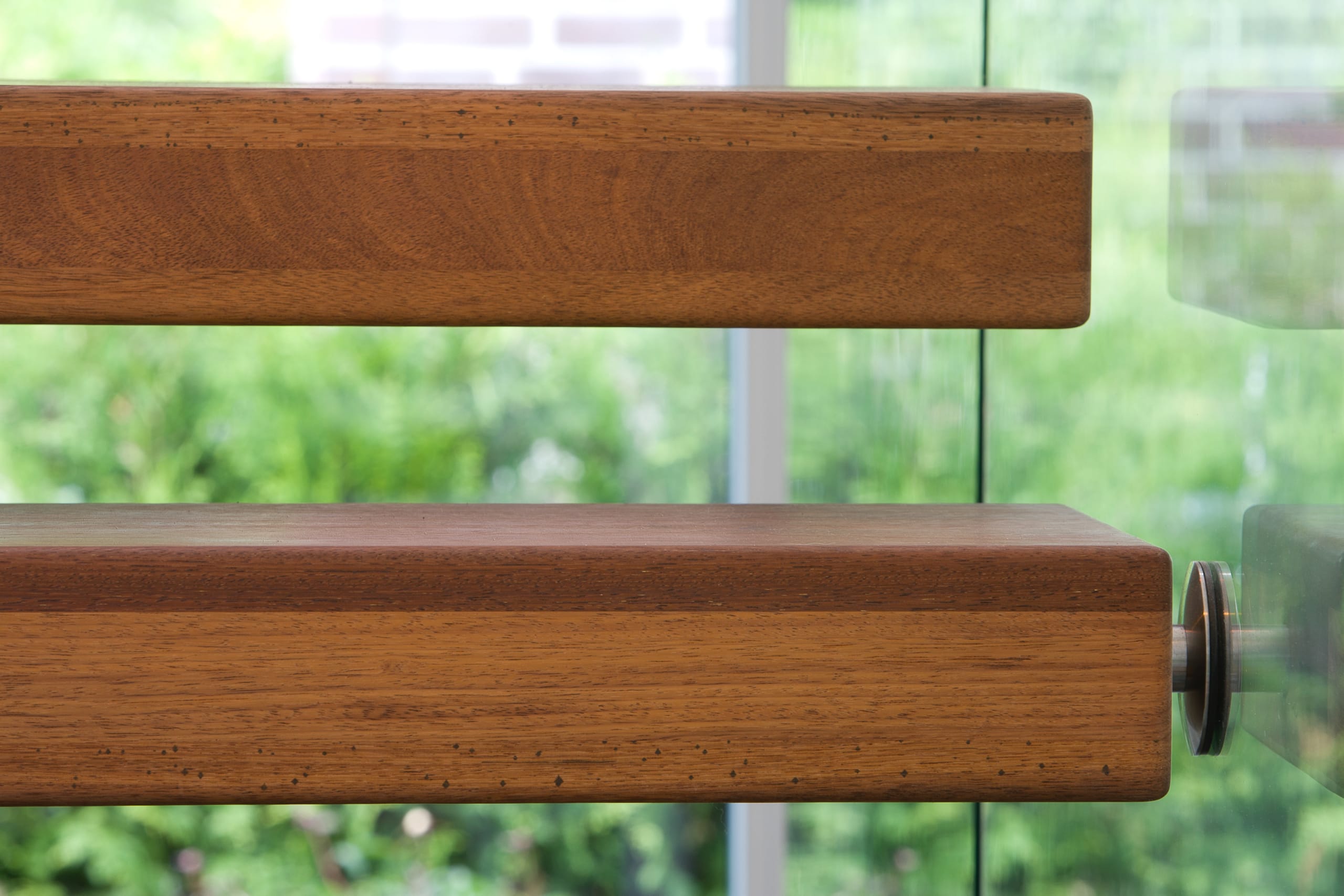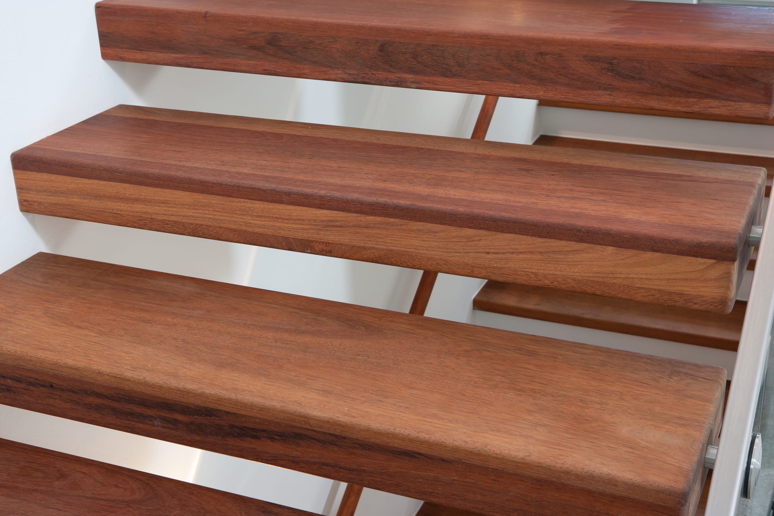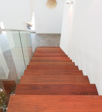Kragarmtreppe mit schwebender Stufenoptik und Glasgeländer; Holzart Merbau