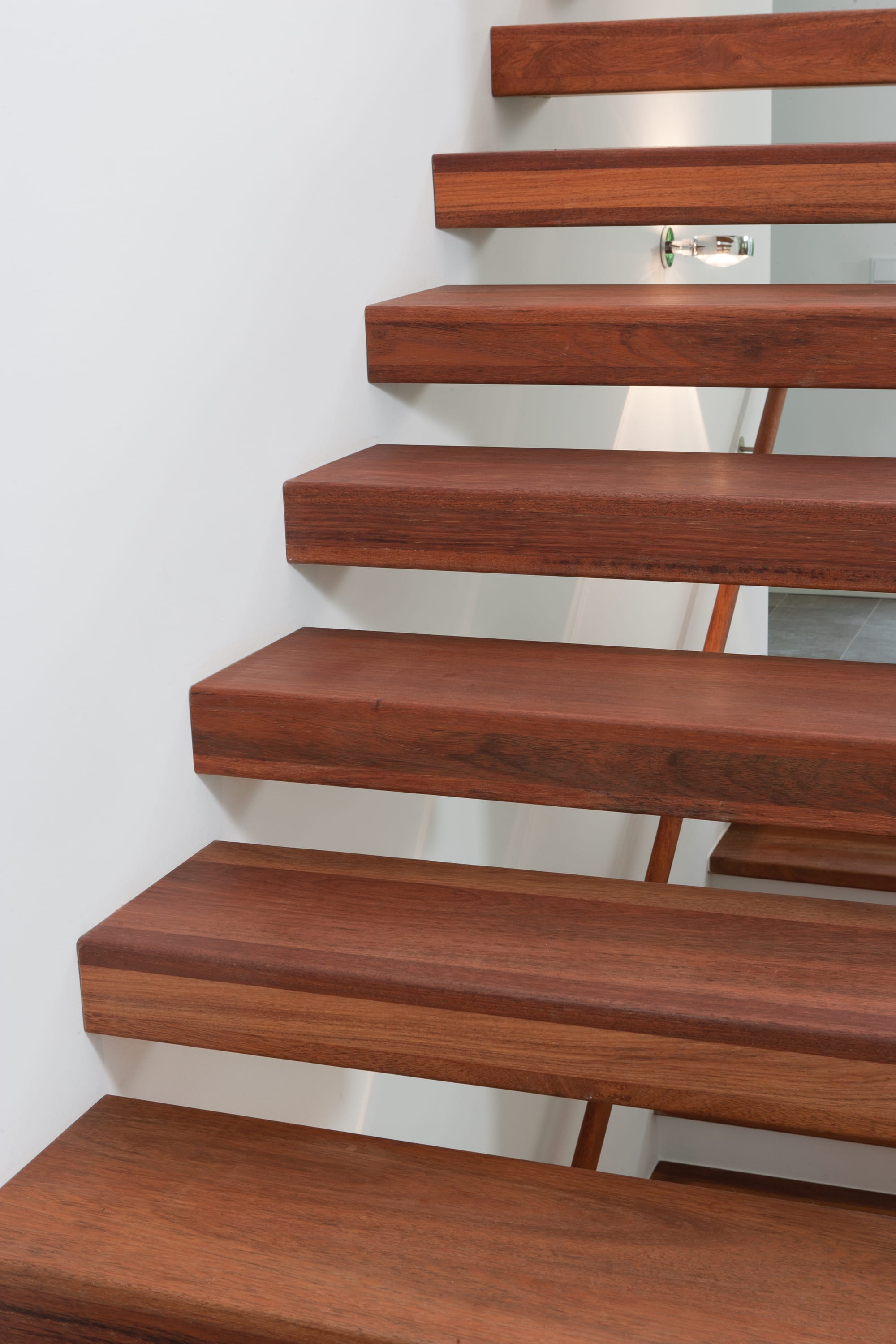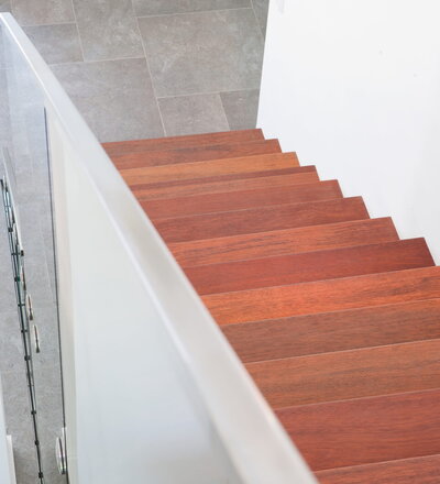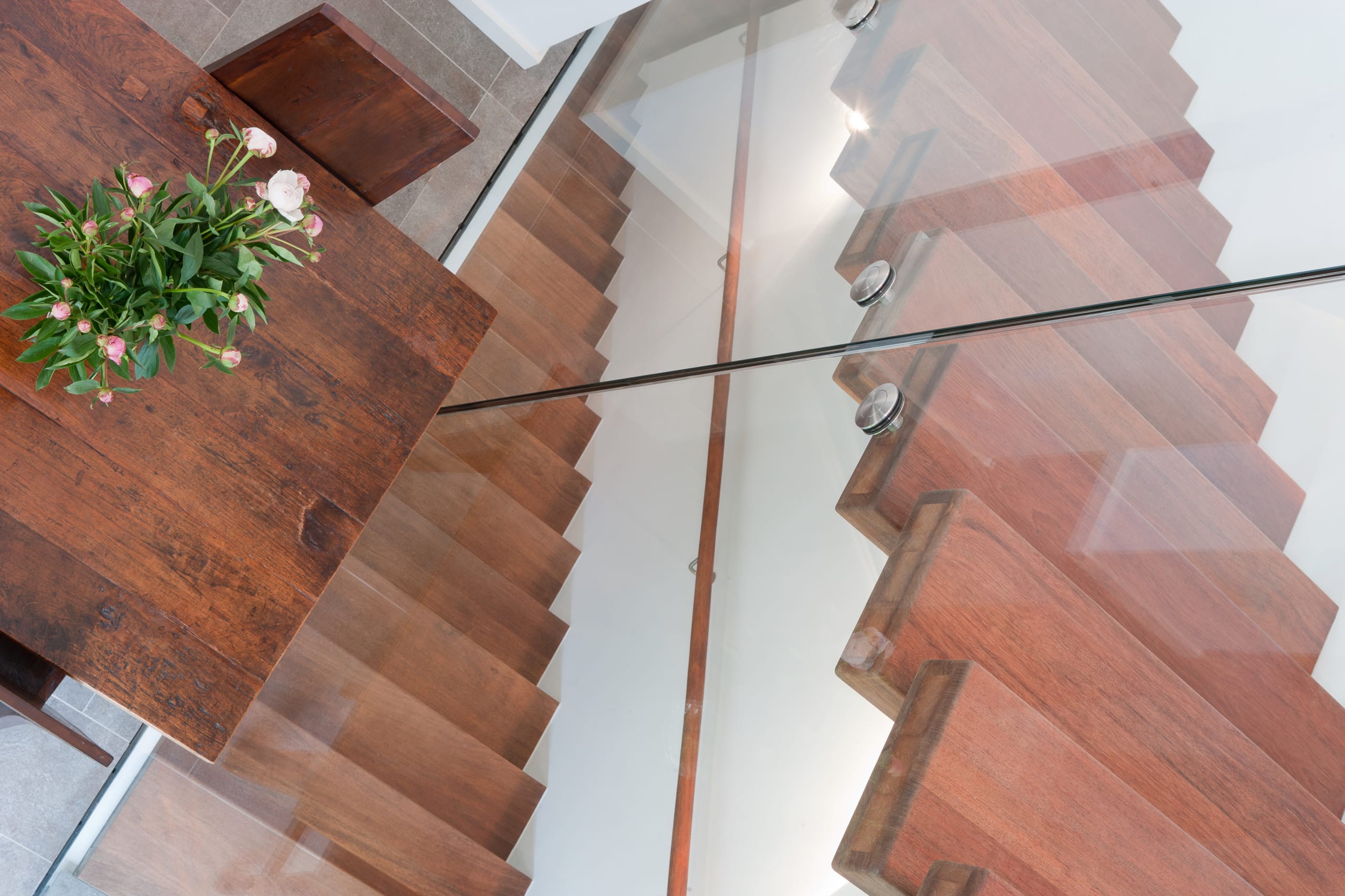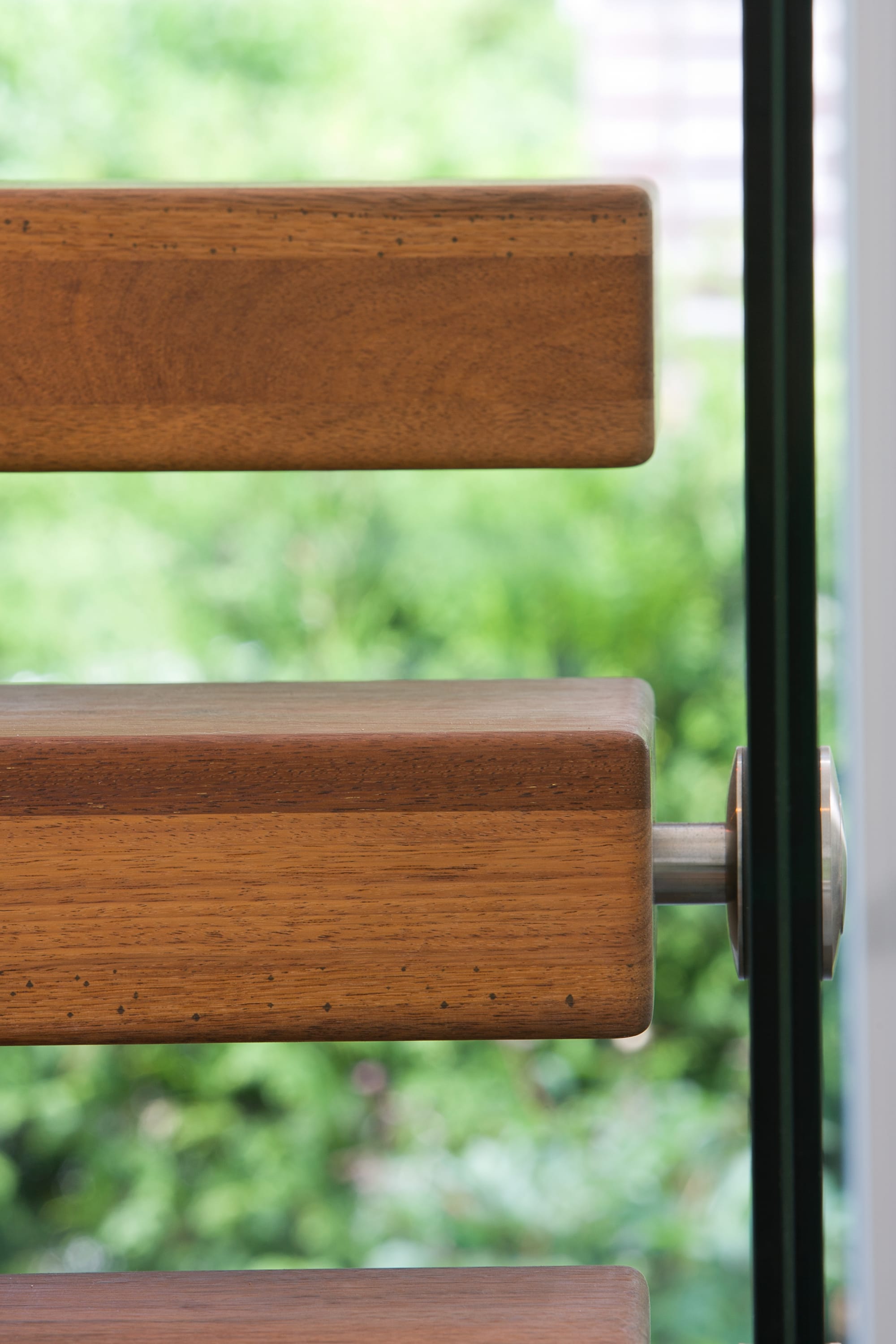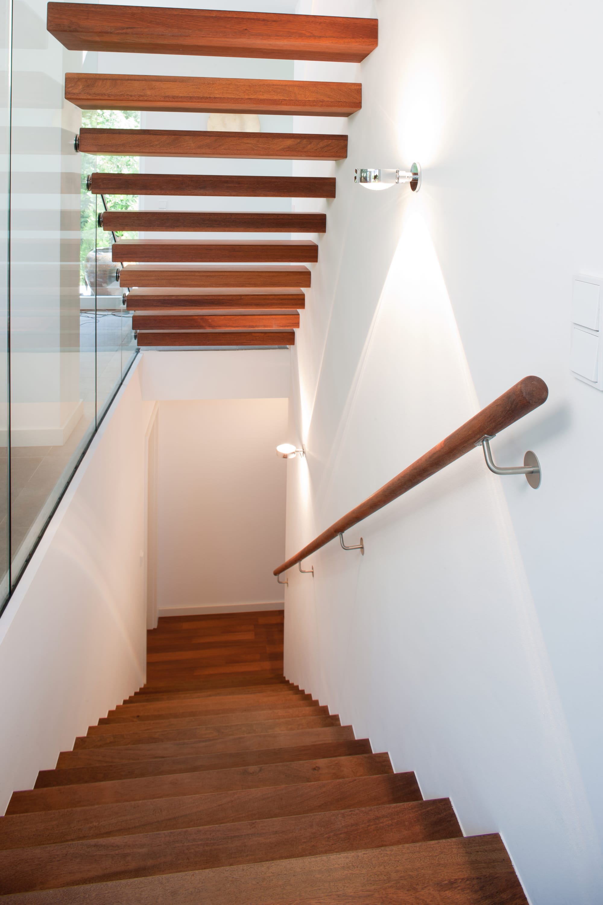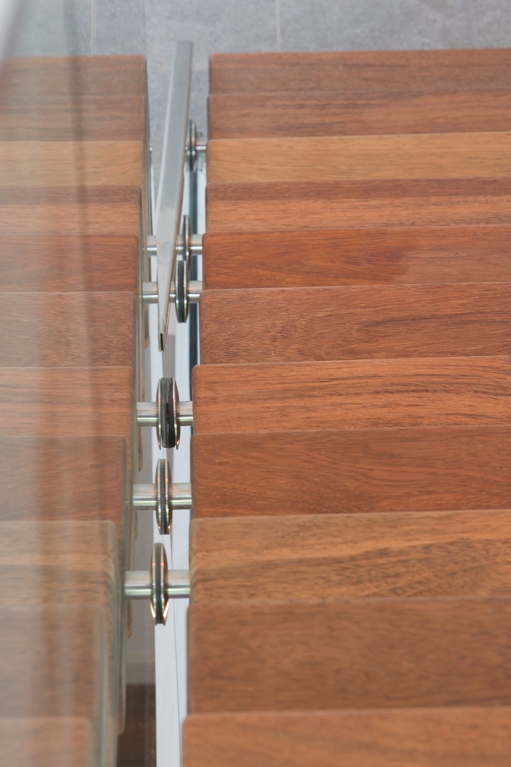 Kragarmtreppe mit schwebender Stufenoptik und Glasgeländer; Holzart Merbau
