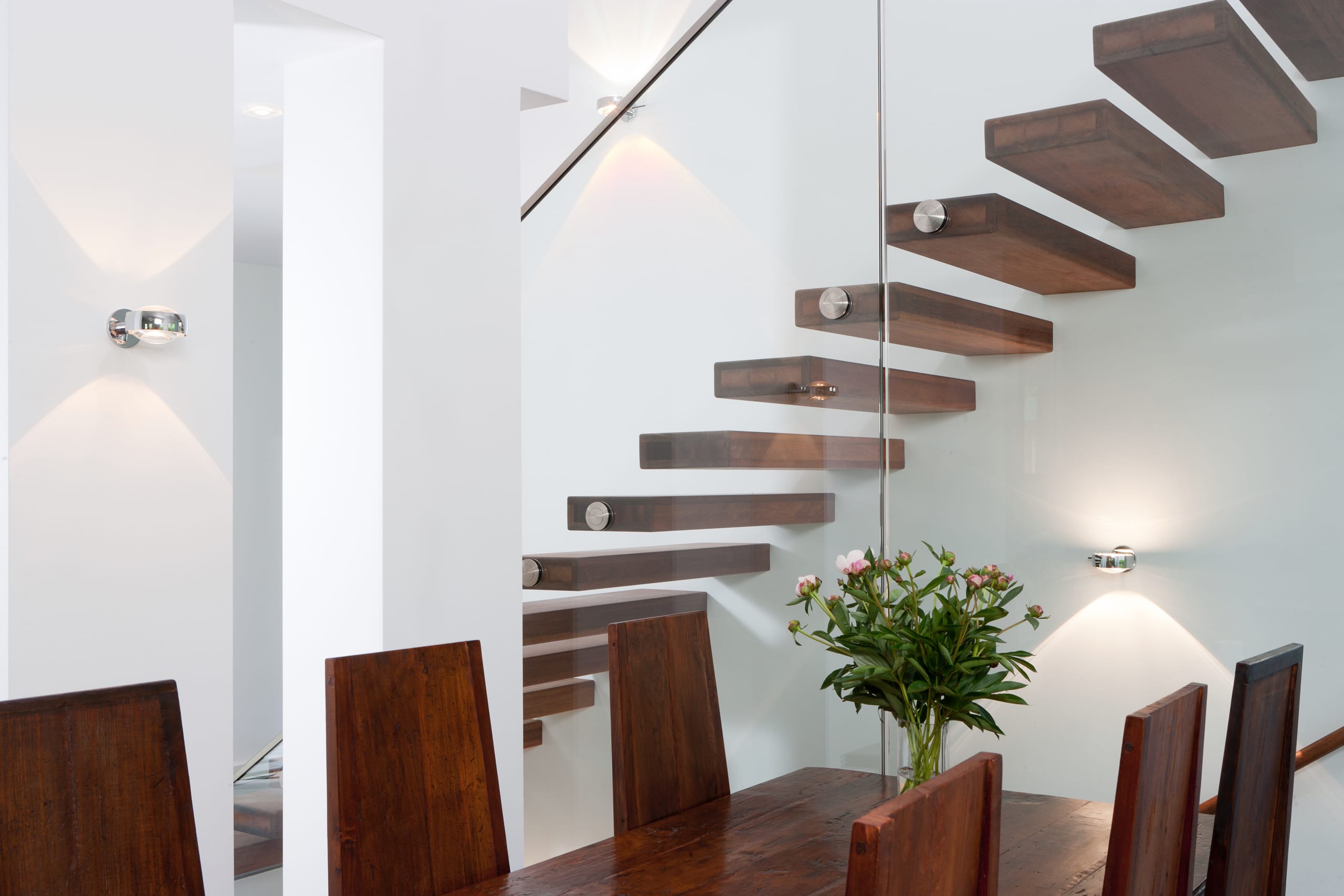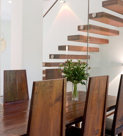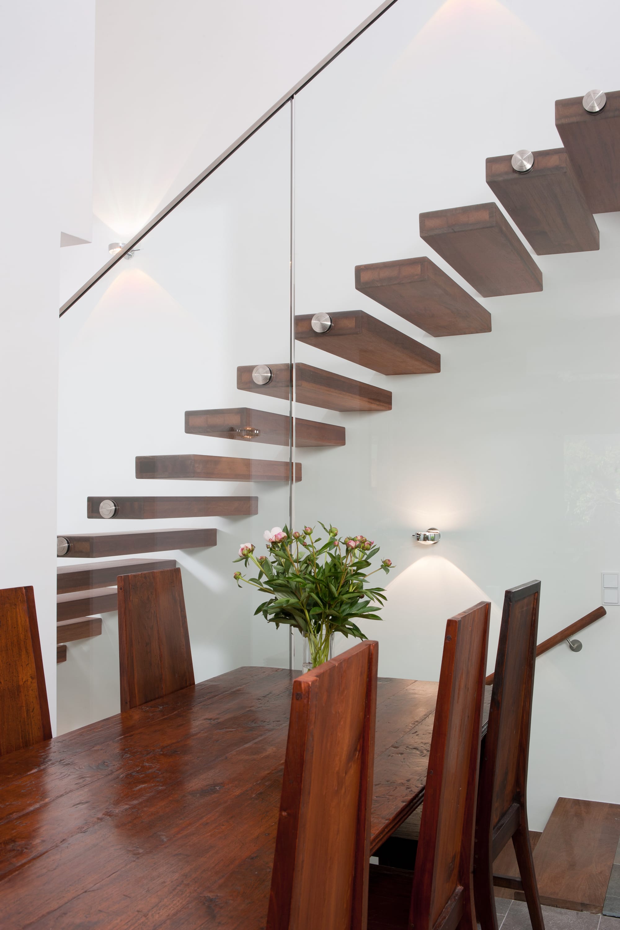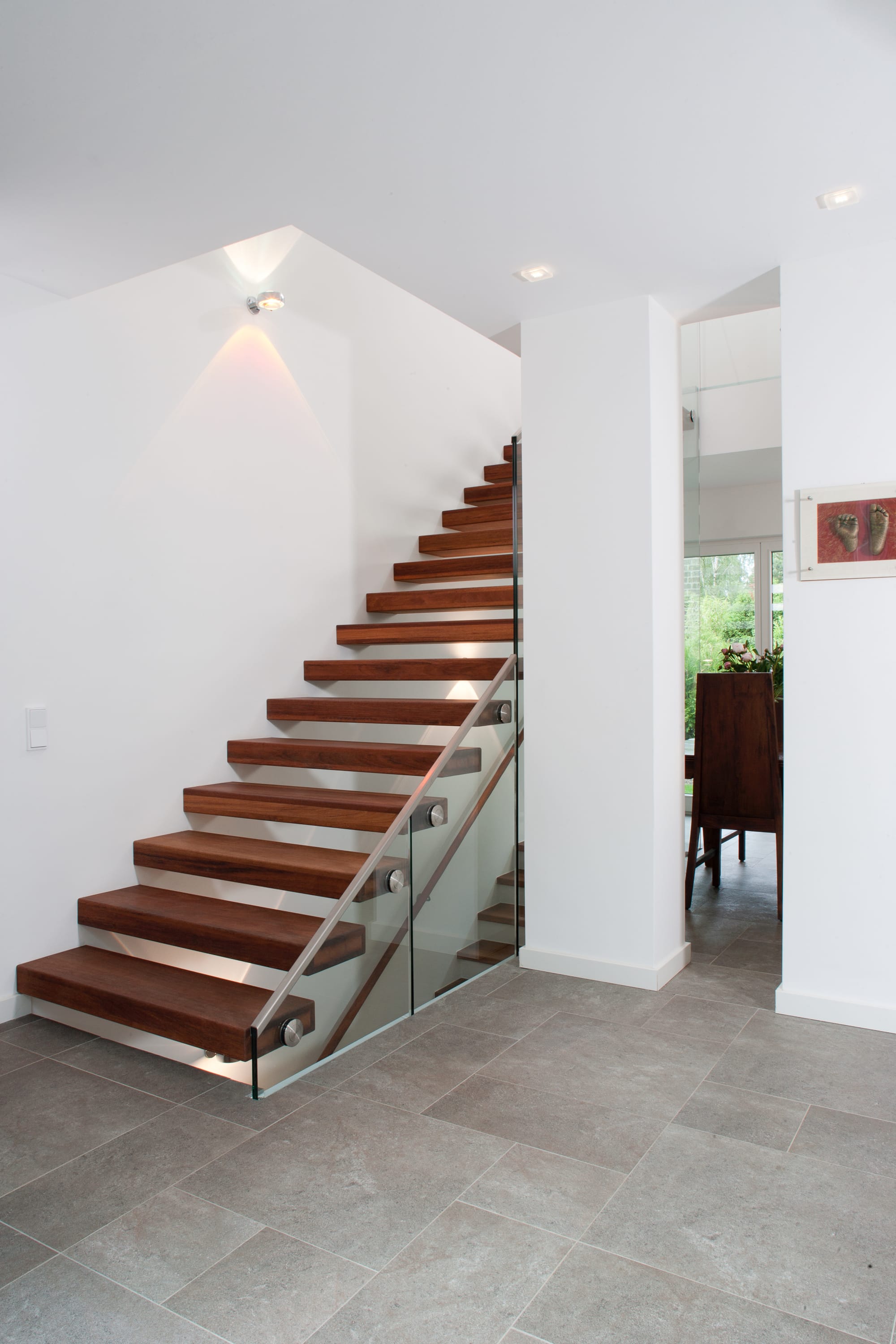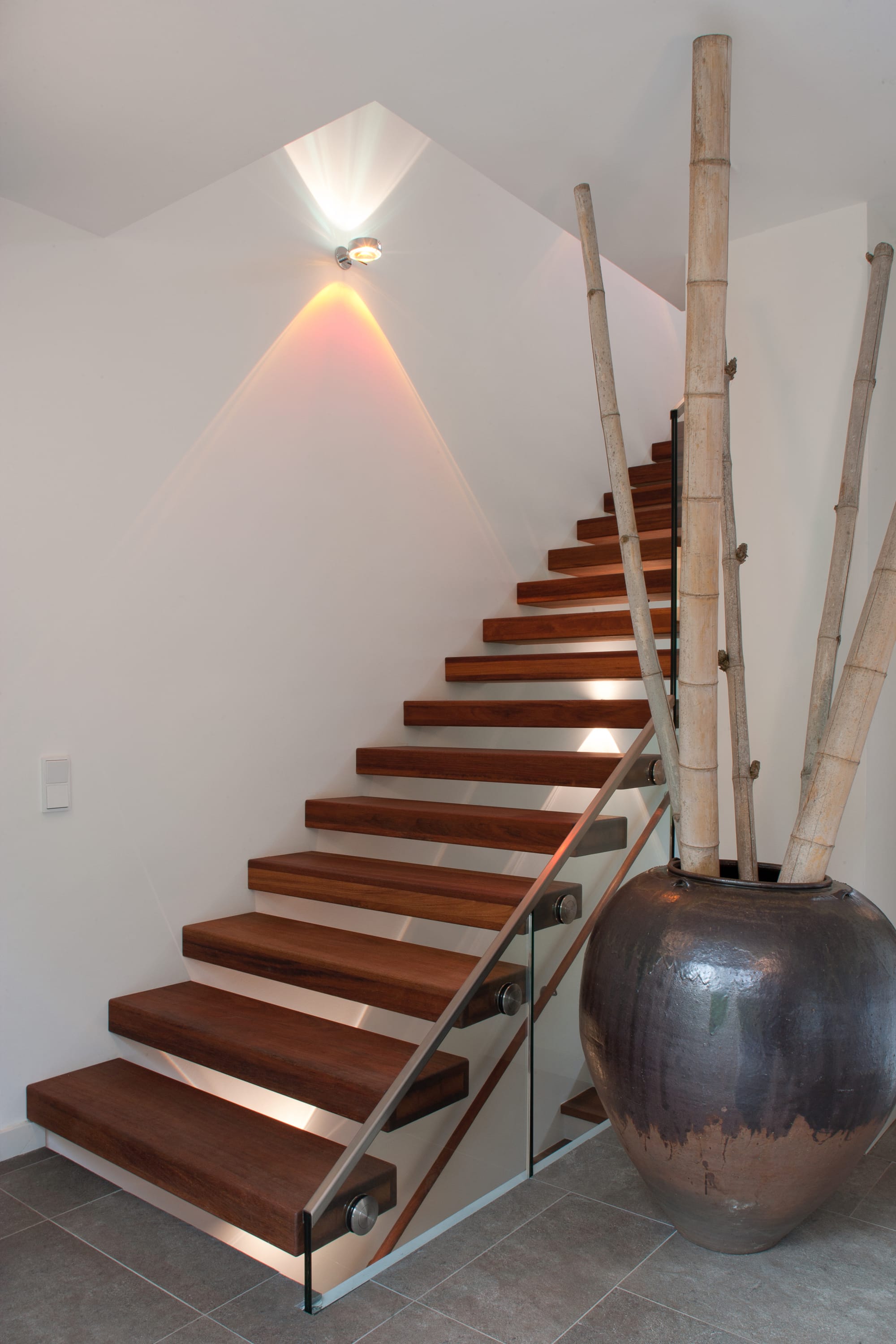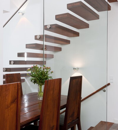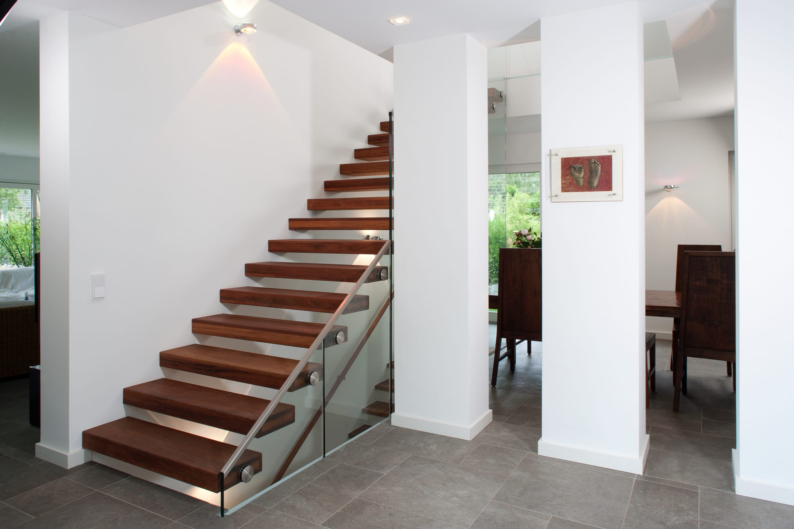 Kragarmtreppe mit schwebender Stufenoptik und Glasgeländer; Holzart Merbau