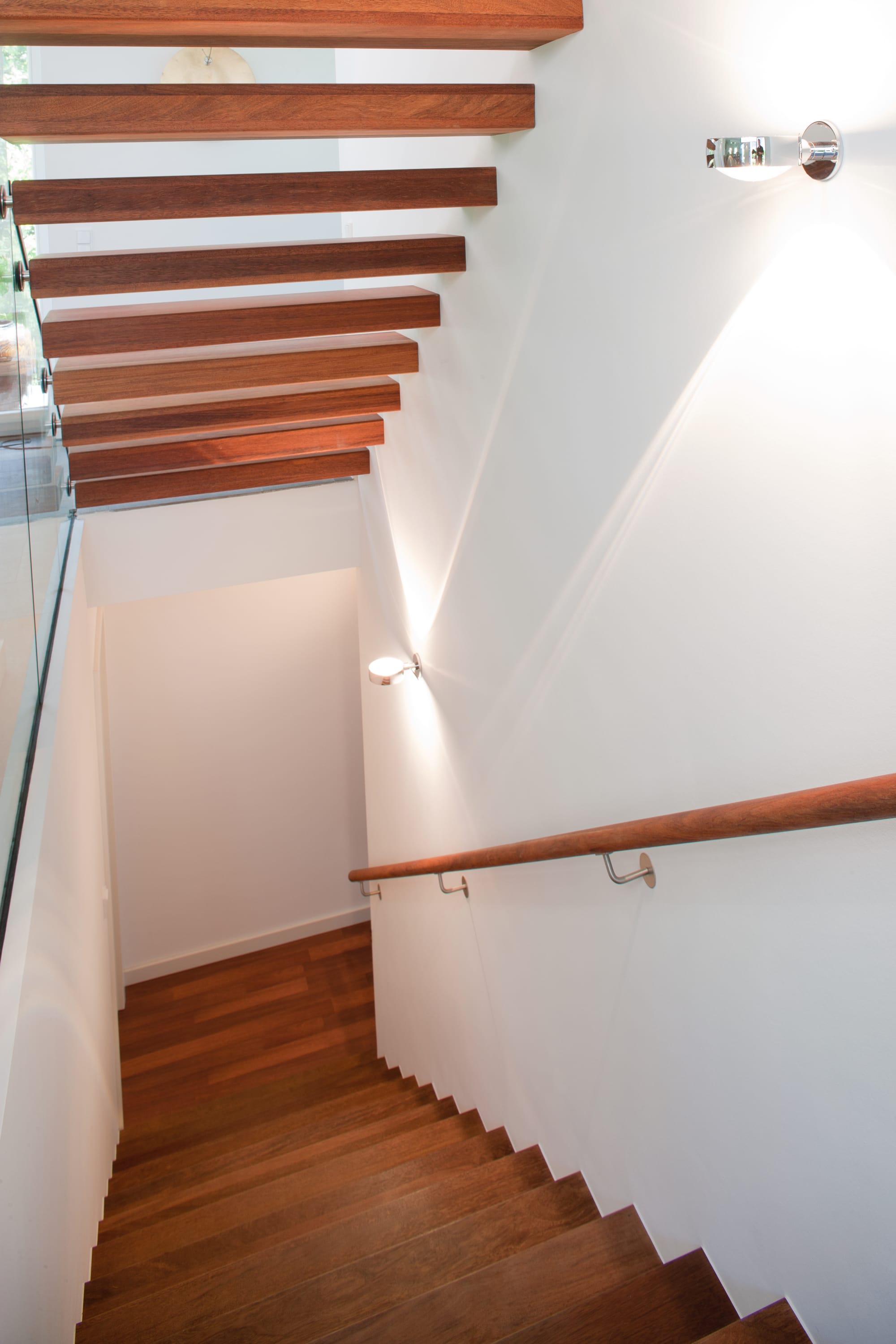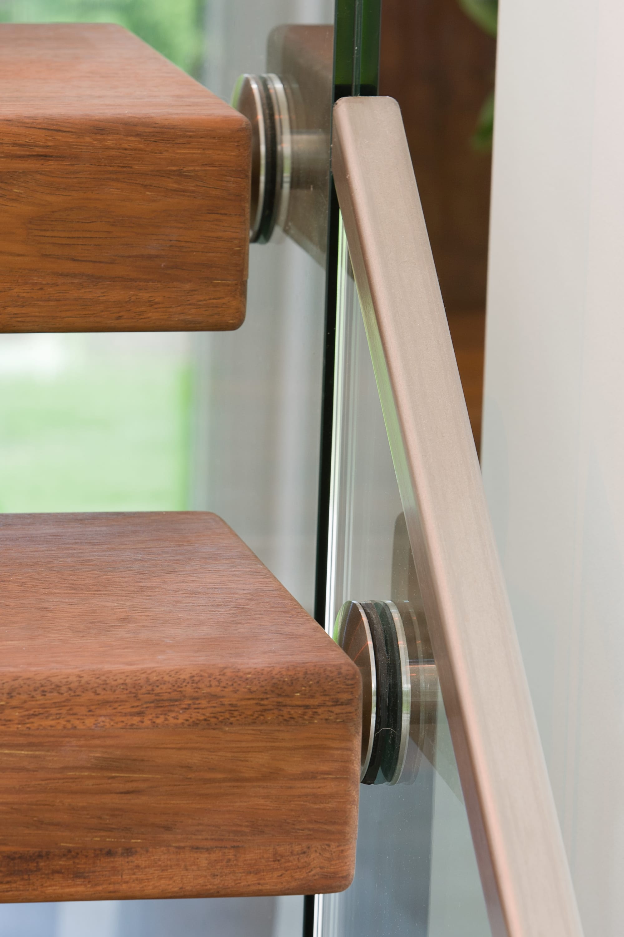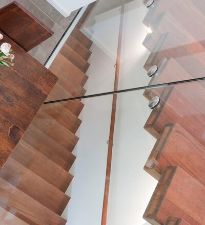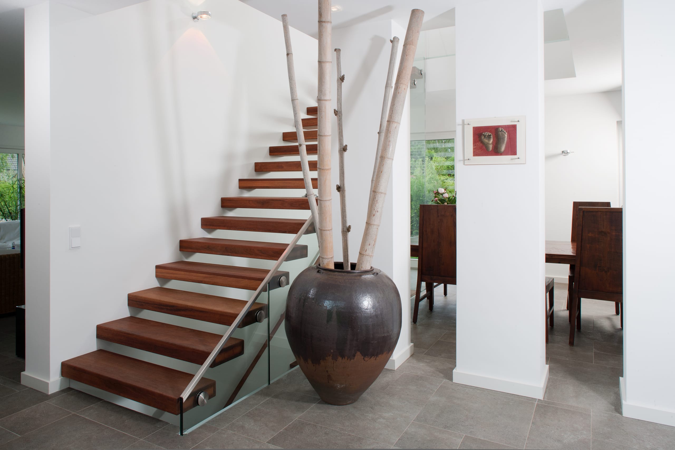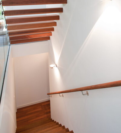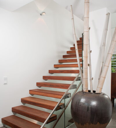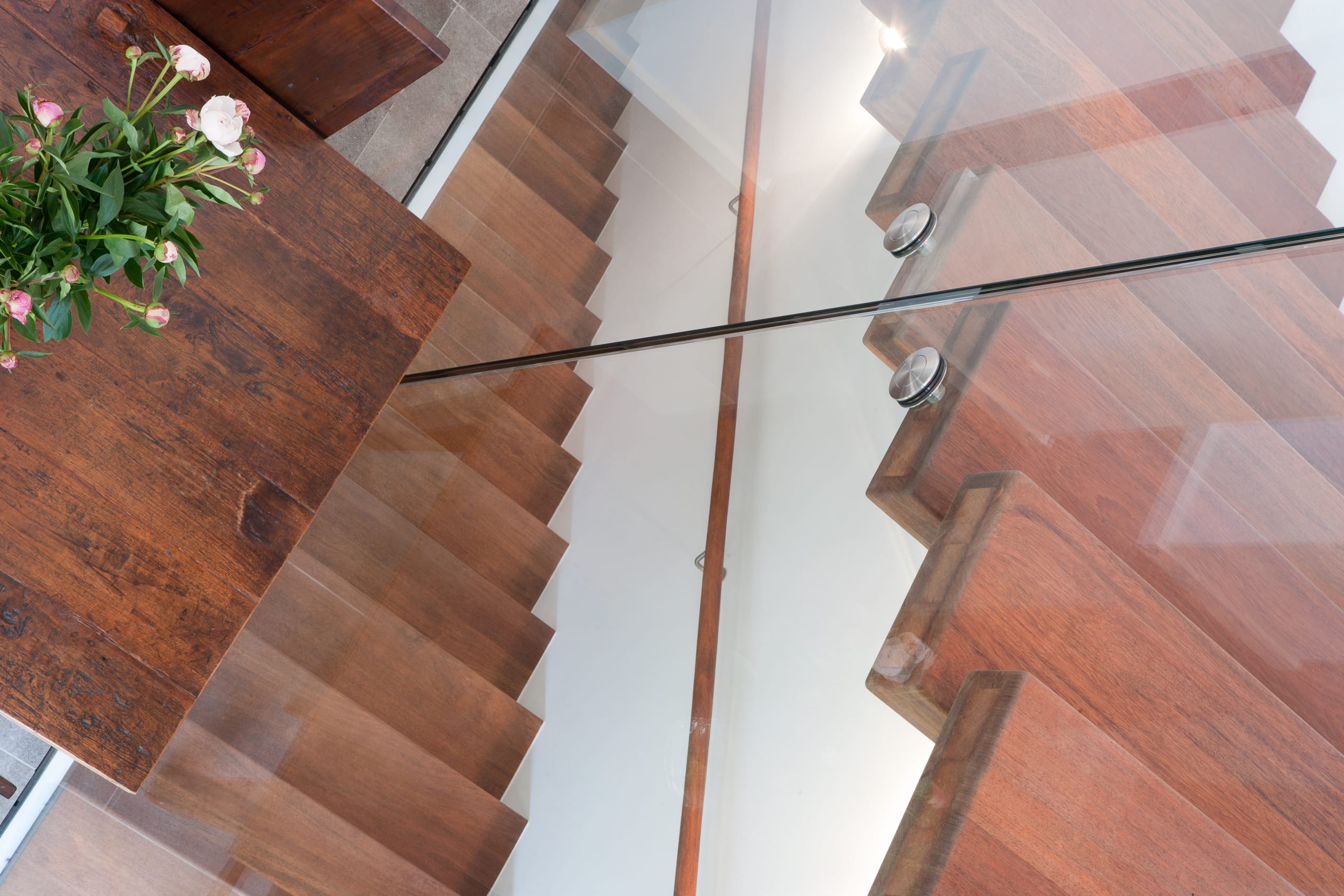 Kragarmtreppe mit schwebender Stufenoptik und Glasgeländer; Holzart Merbau