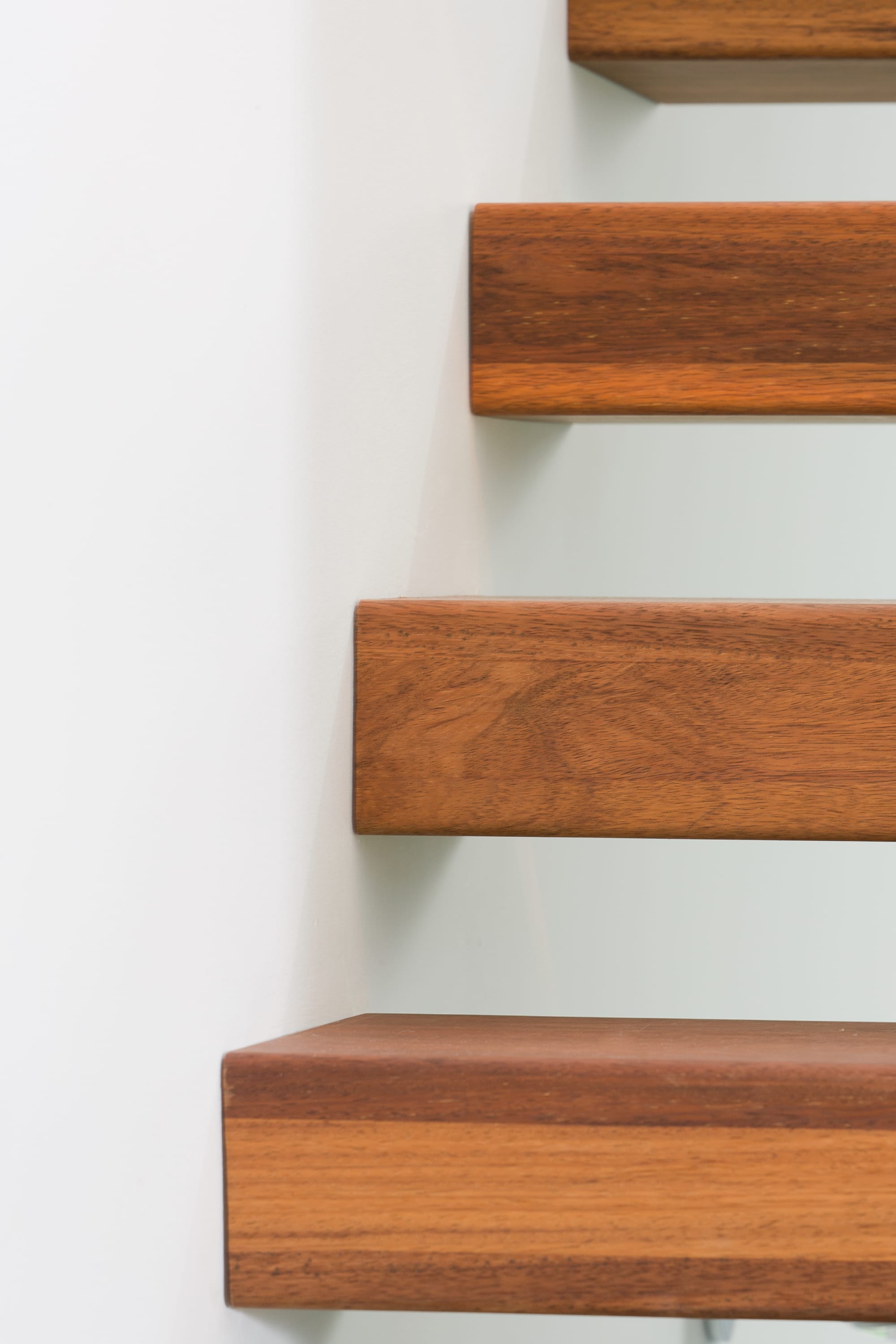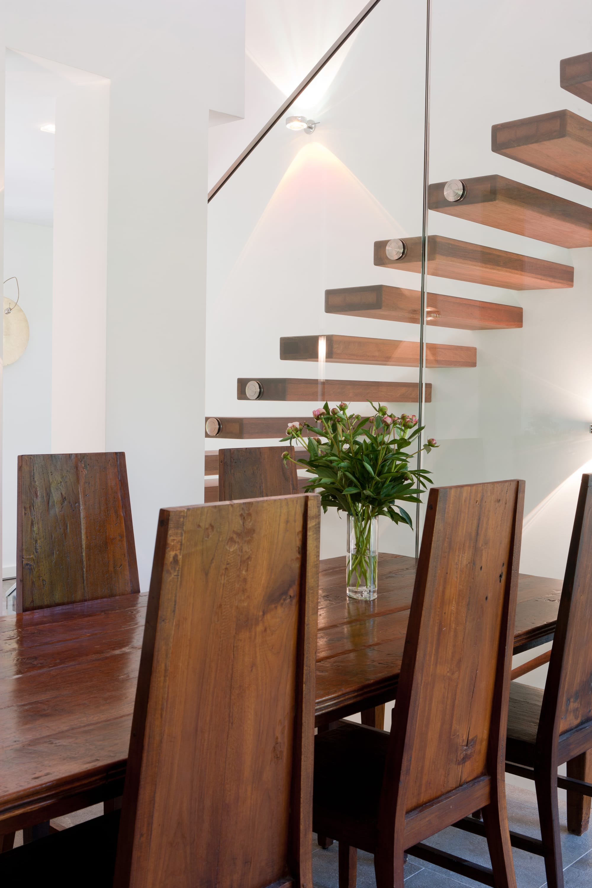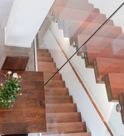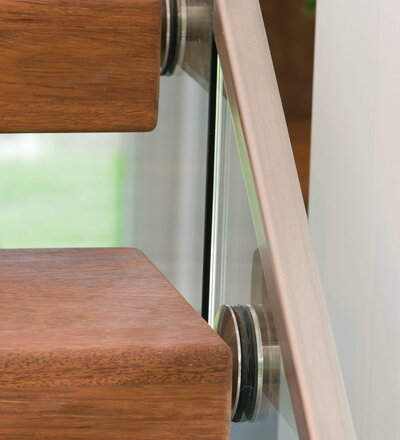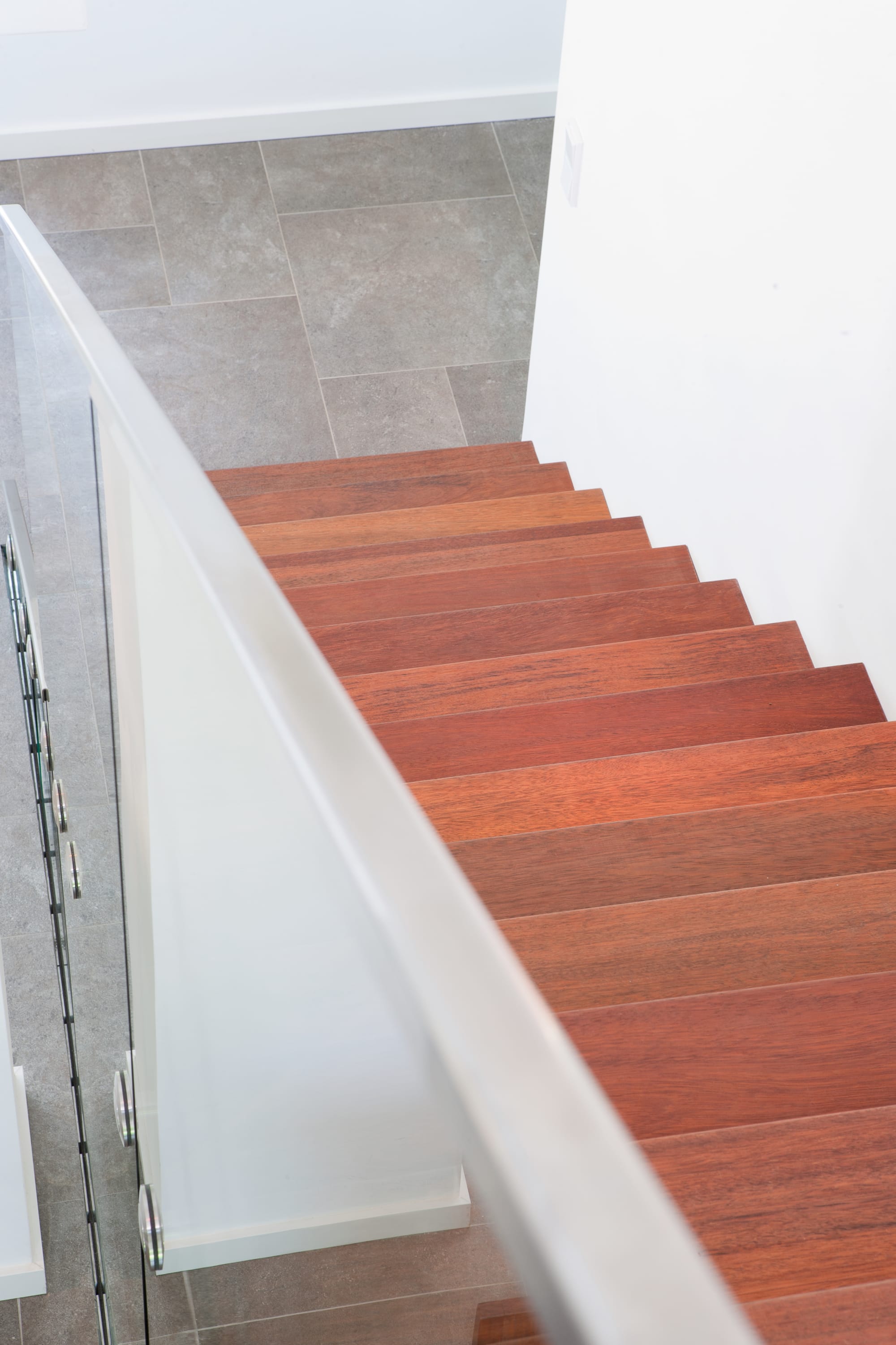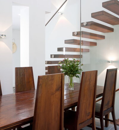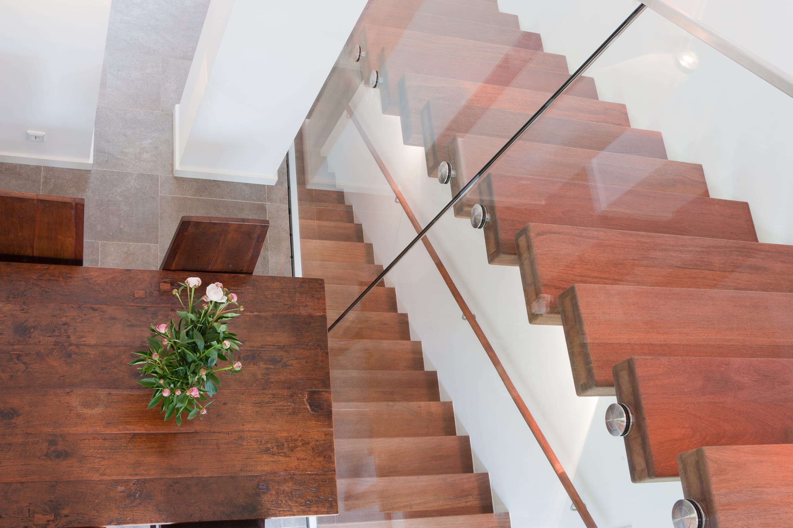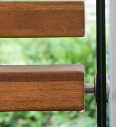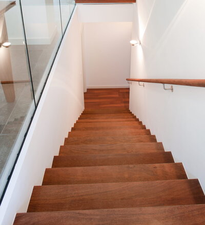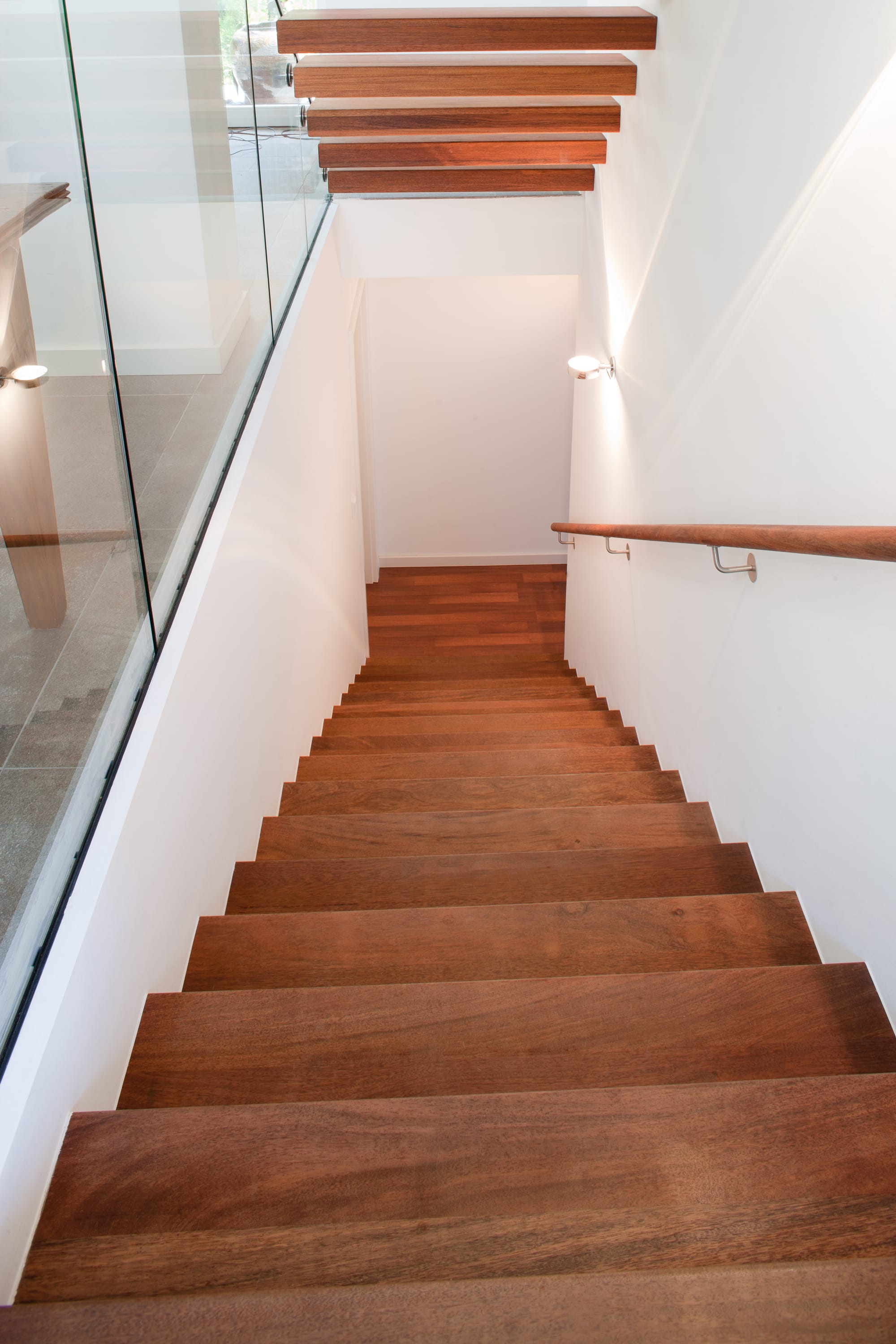 Kragarmtreppe mit schwebender Stufenoptik und Glasgeländer; Holzart Merbau