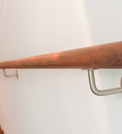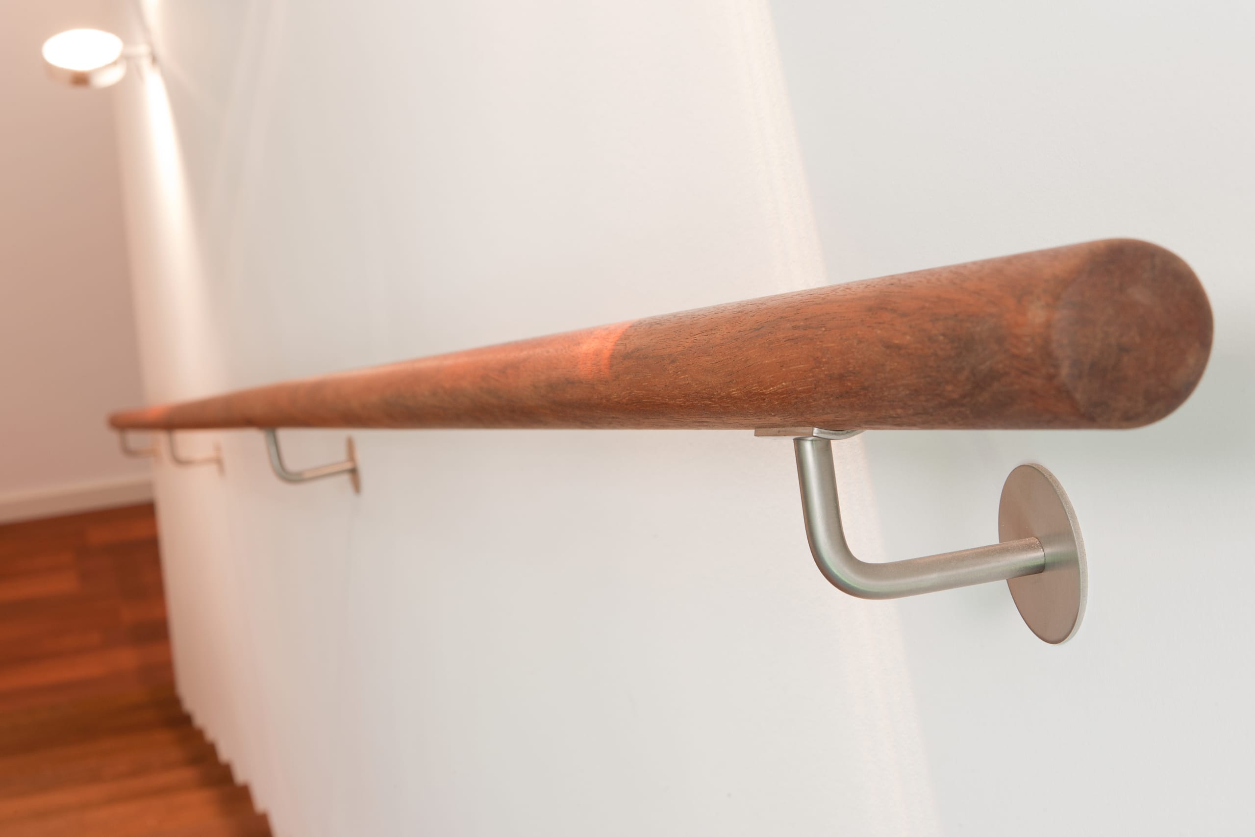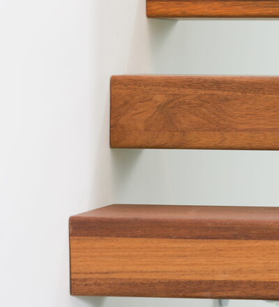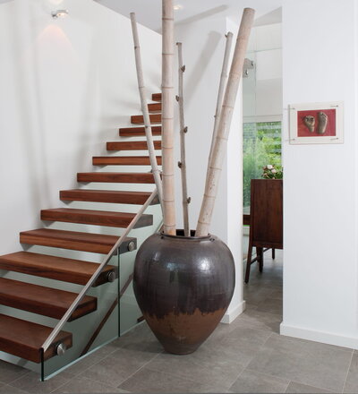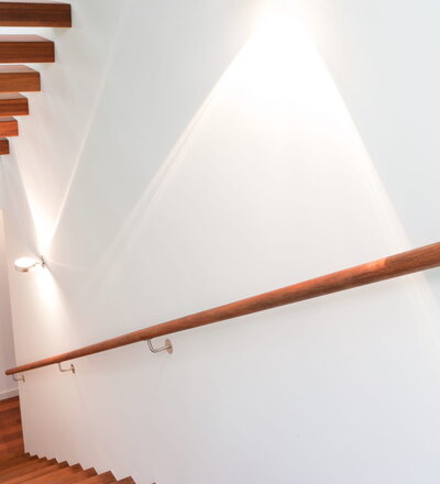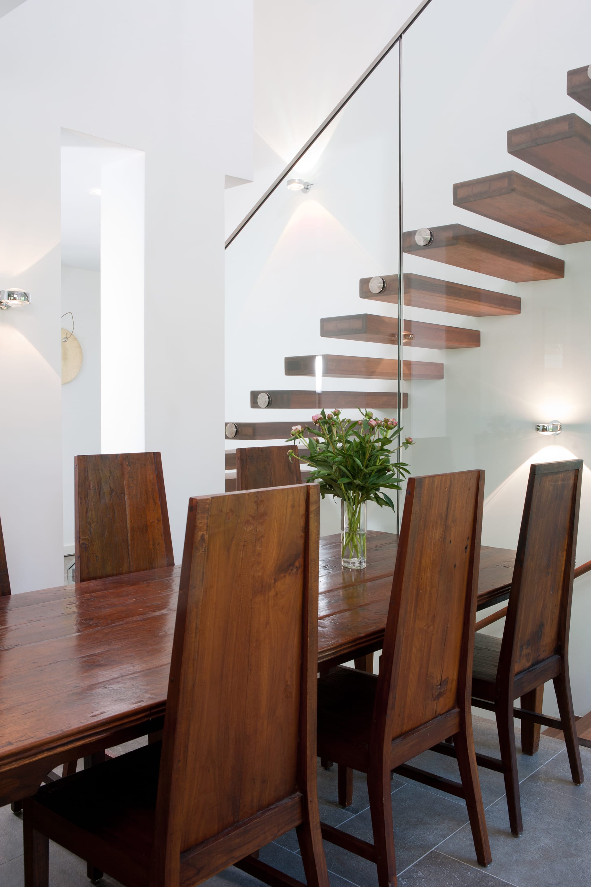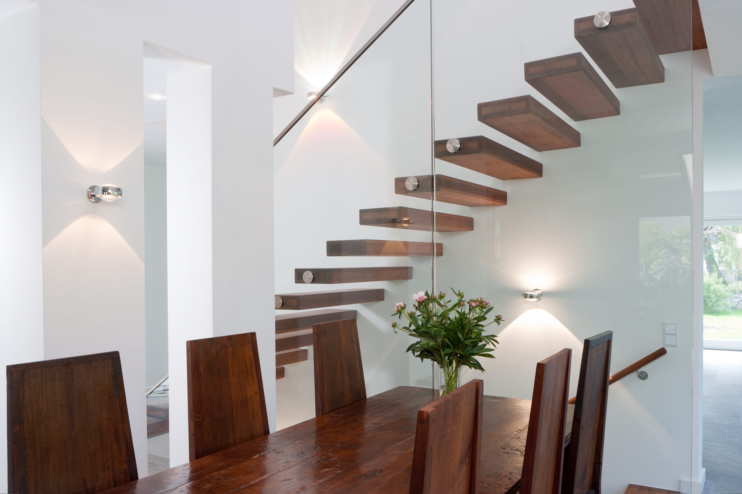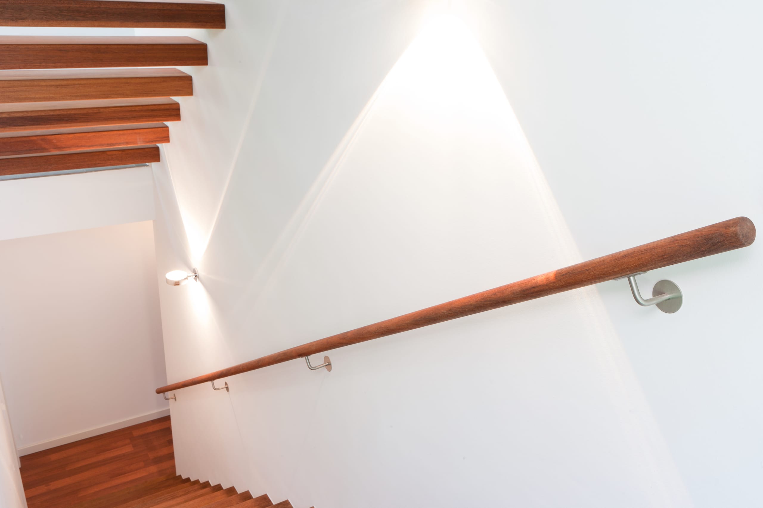 Kragarmtreppe mit schwebender Stufenoptik und Glasgeländer; Holzart Merbau