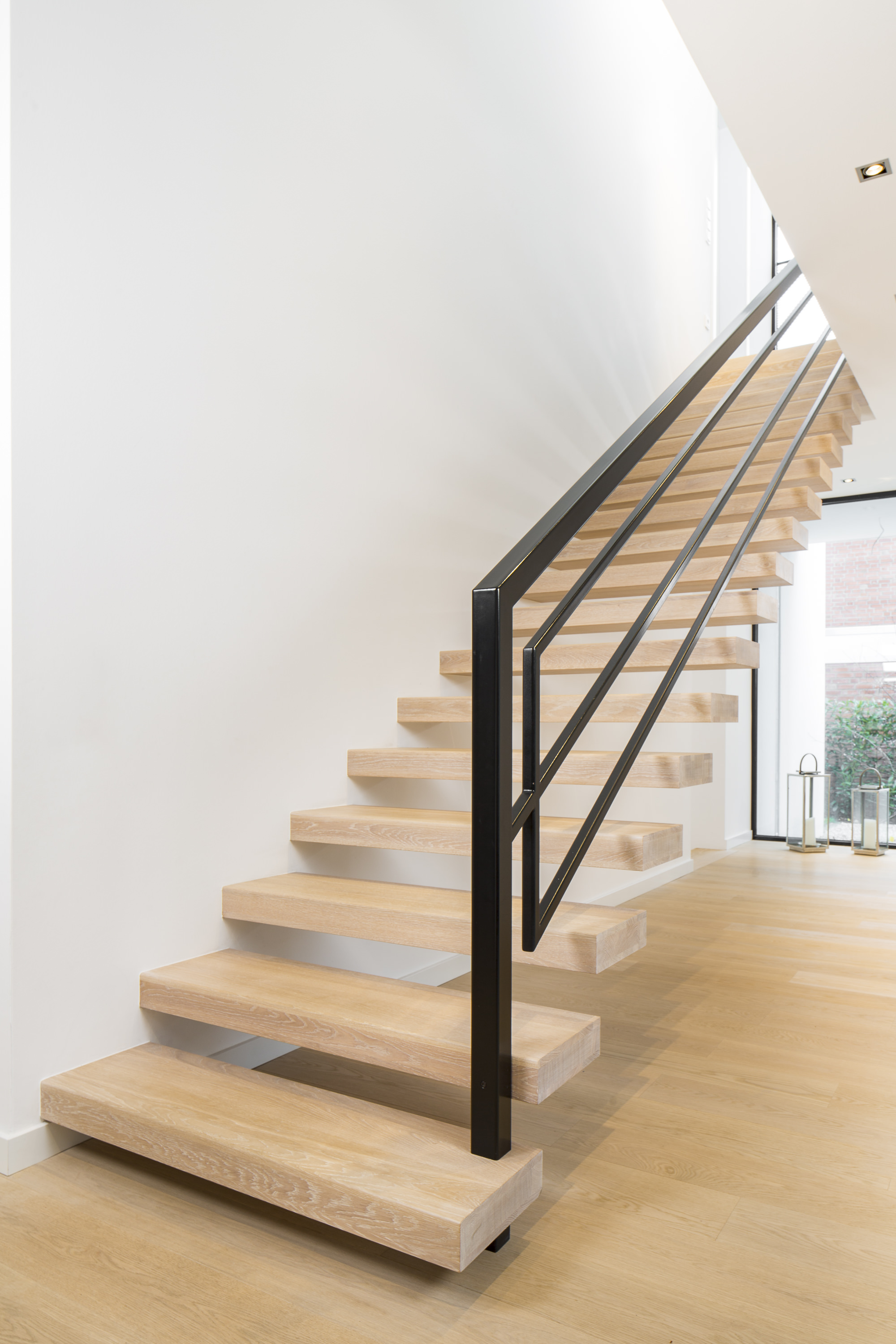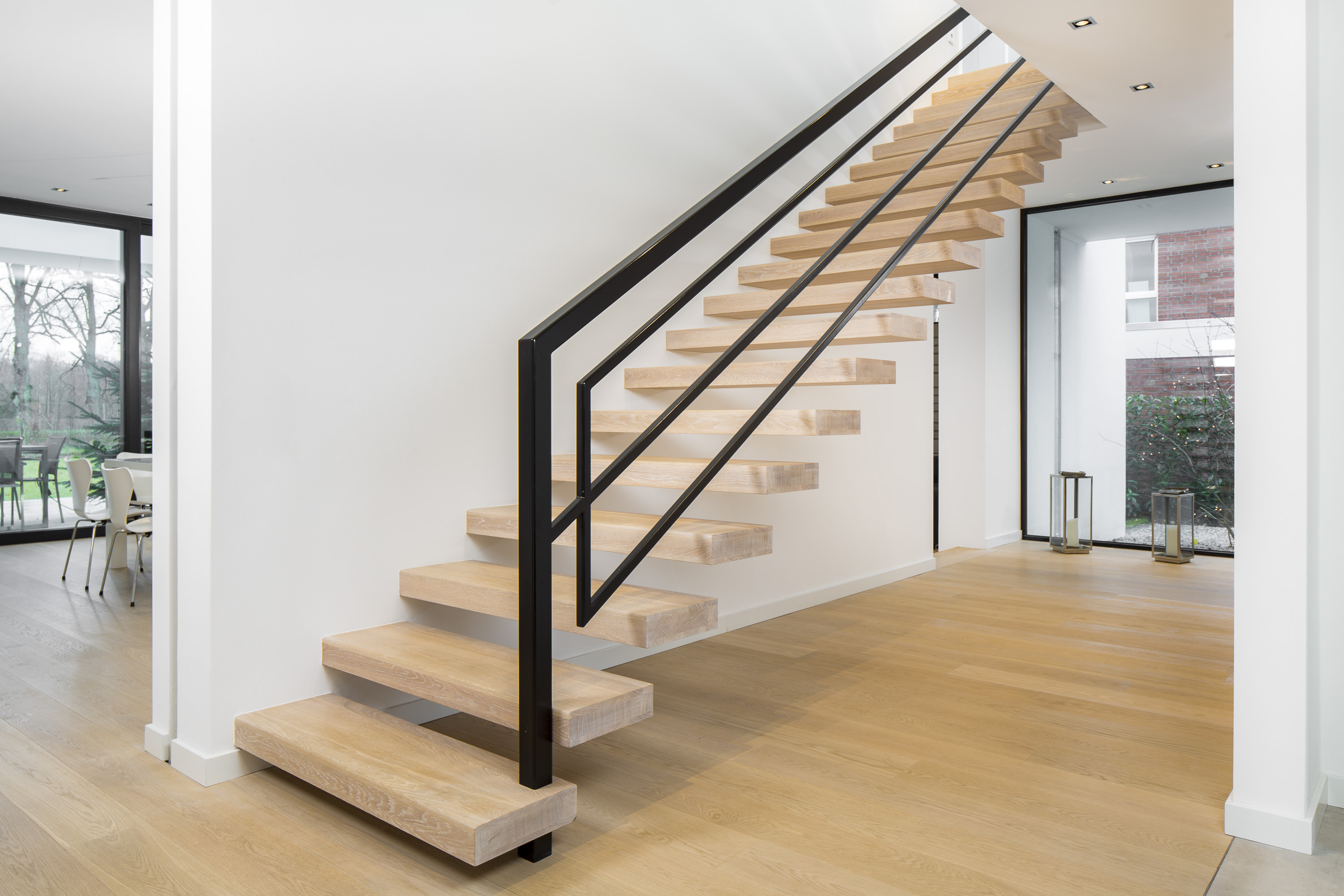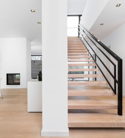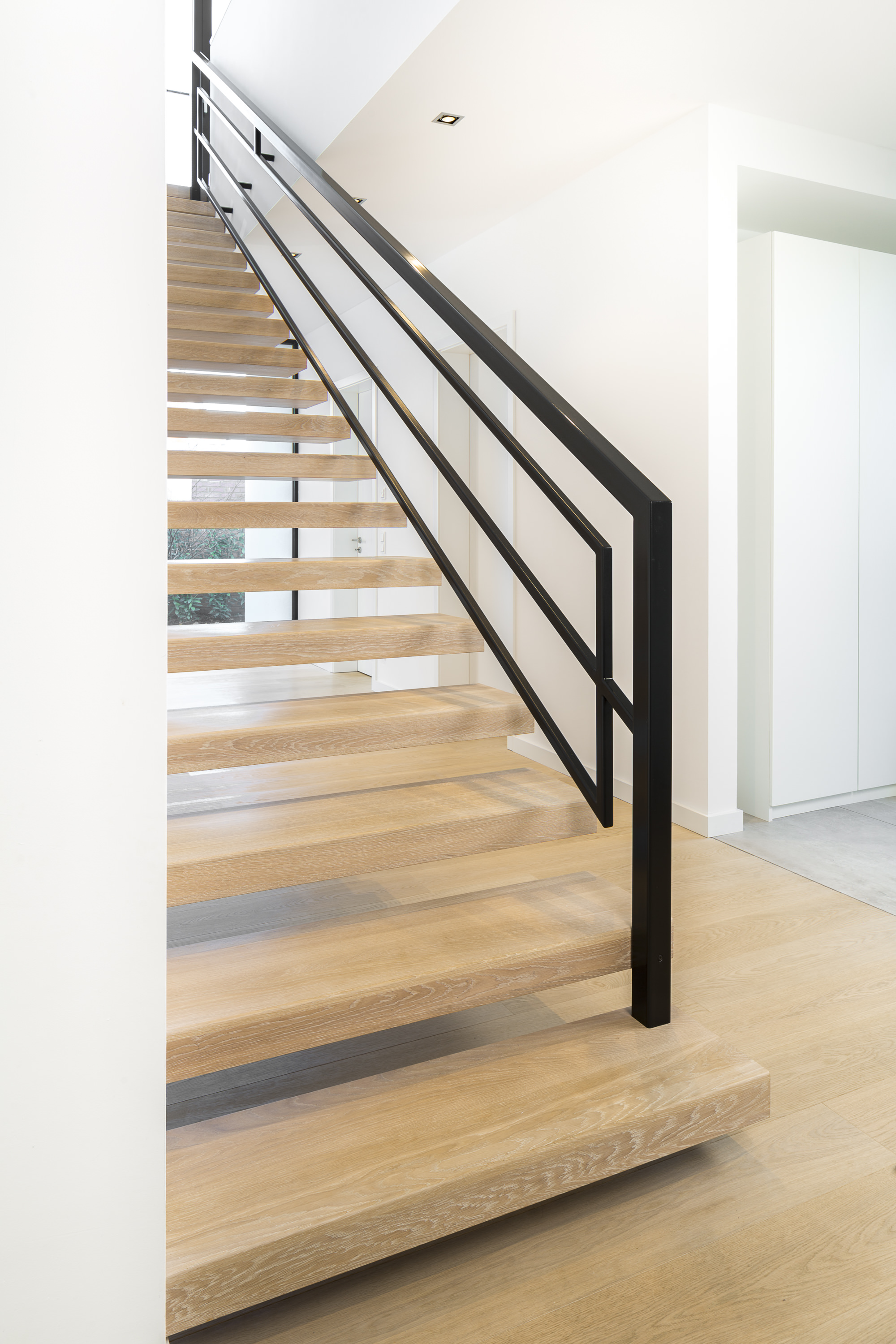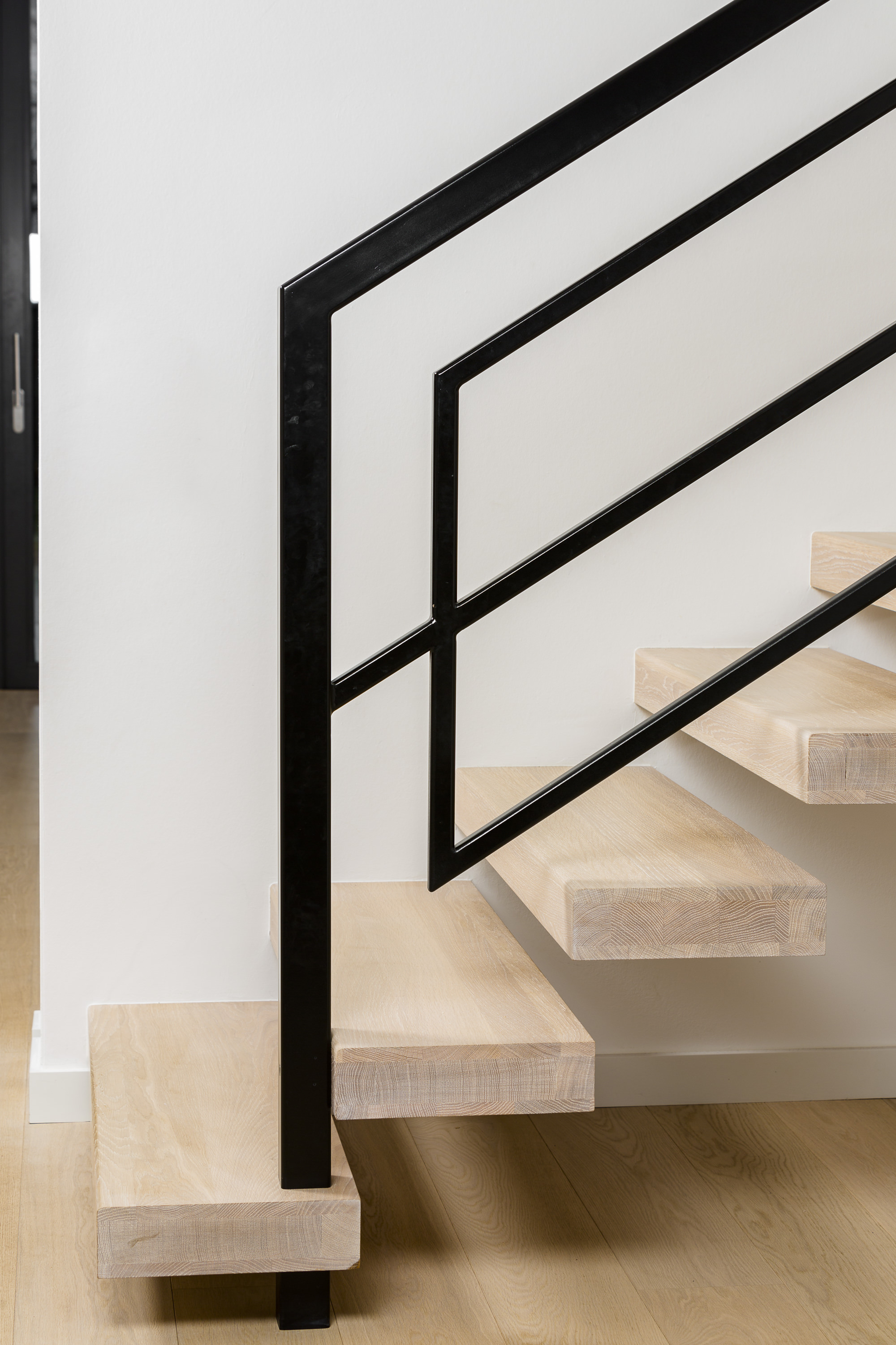 Kragarmtreppe in der Holzart Eiche weiß geölt mit TBV Echtholz-Öl, Stahlgeländer aus Quadratrohr farbig endlackiert