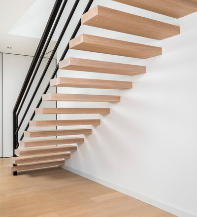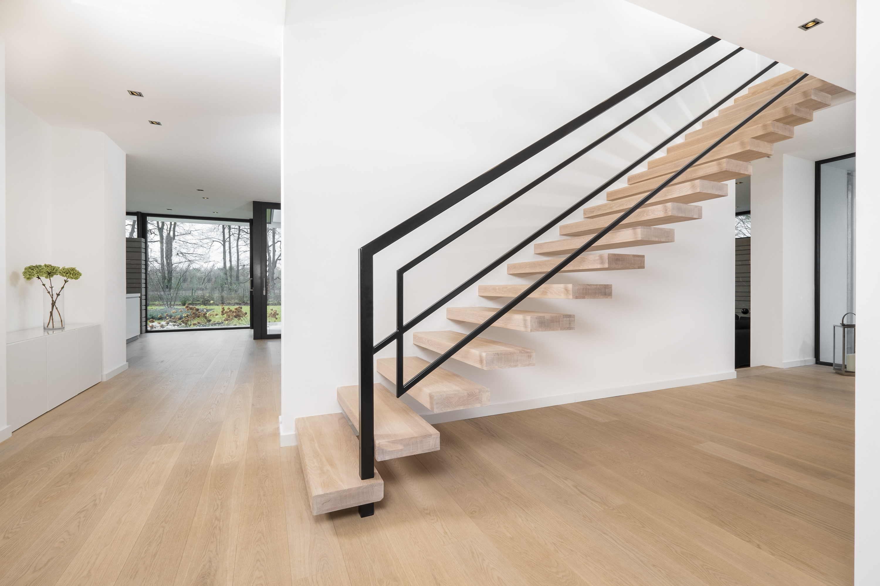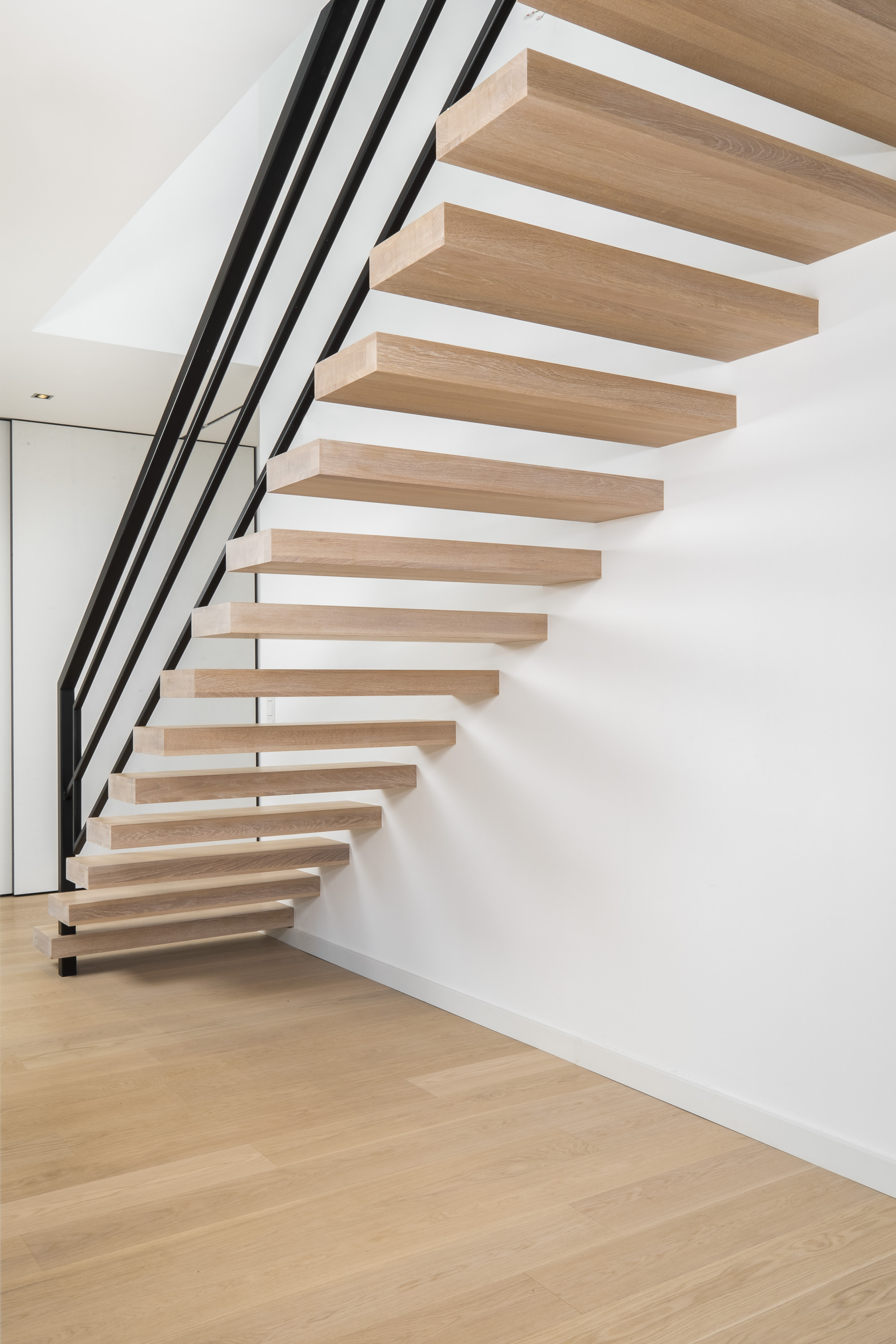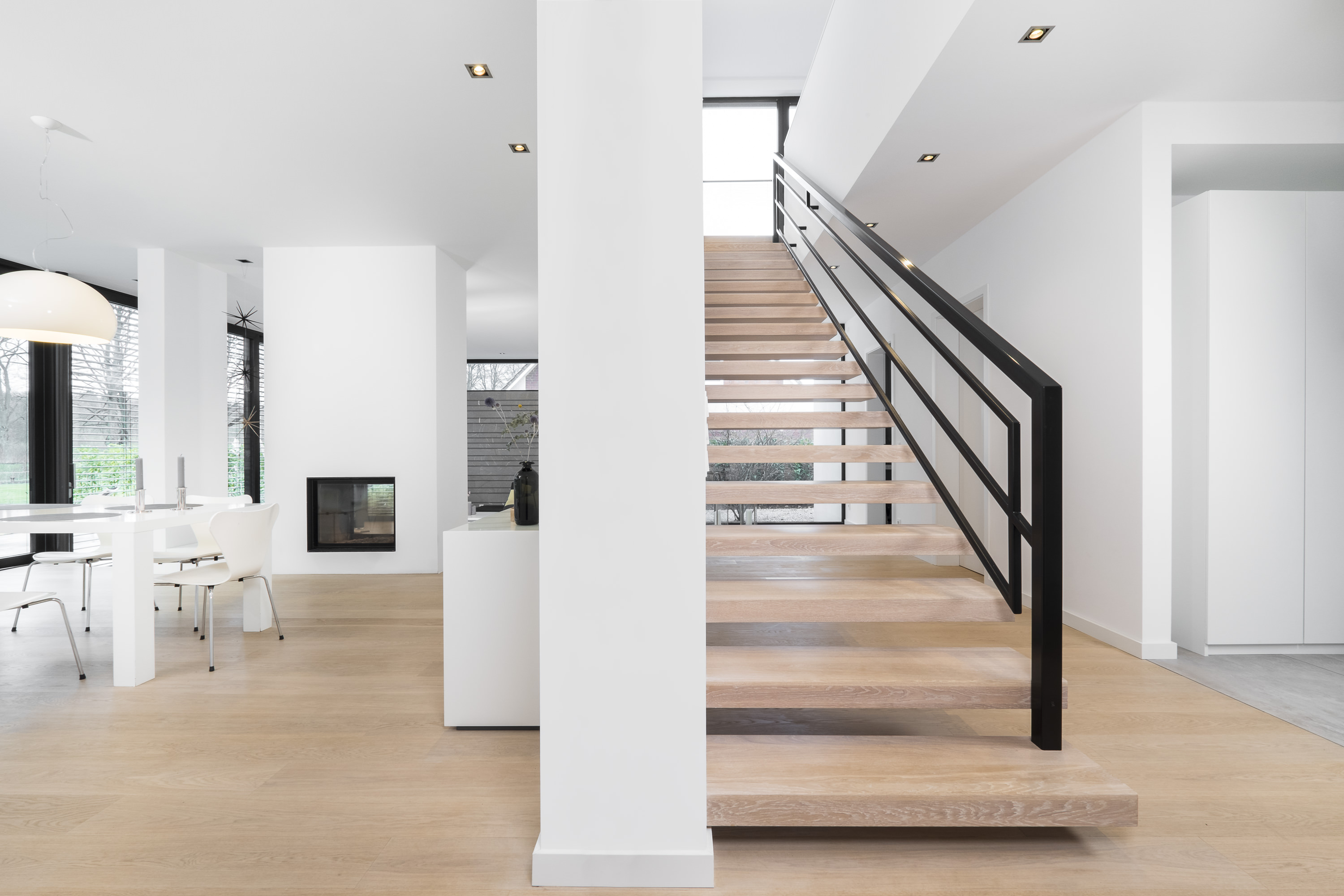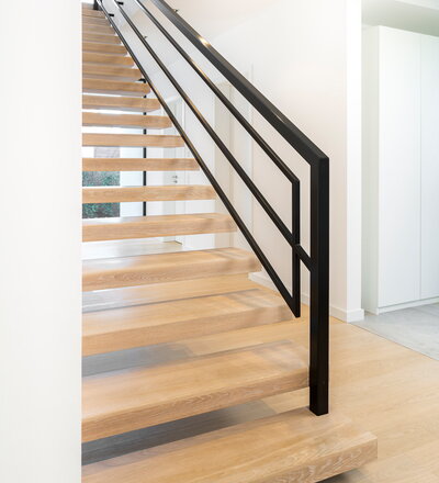 Kragarmtreppe in der Holzart Eiche weiß geölt mit TBV Echtholz-Öl, Stahlgeländer aus Quadratrohr farbig endlackiert