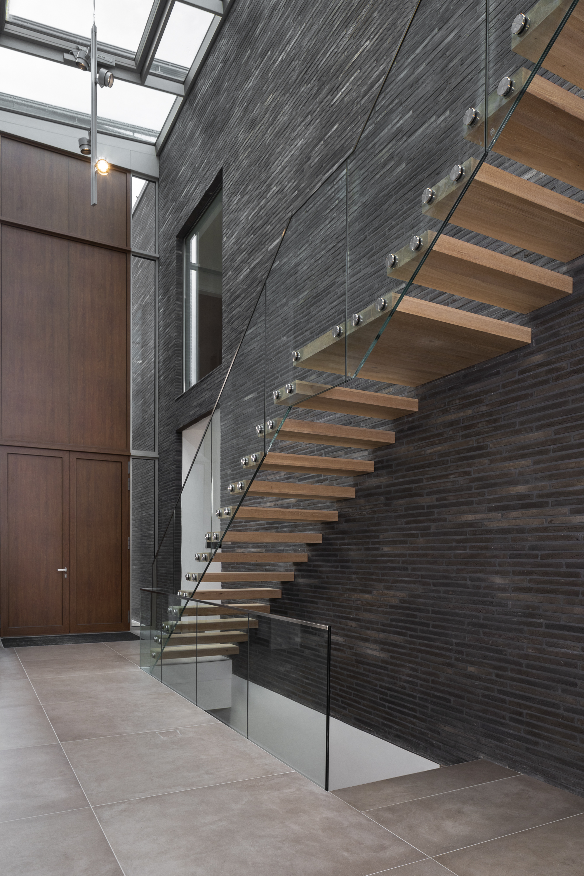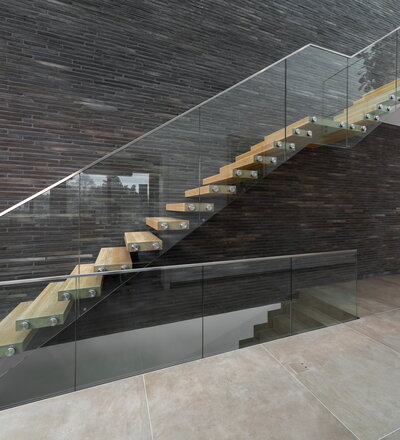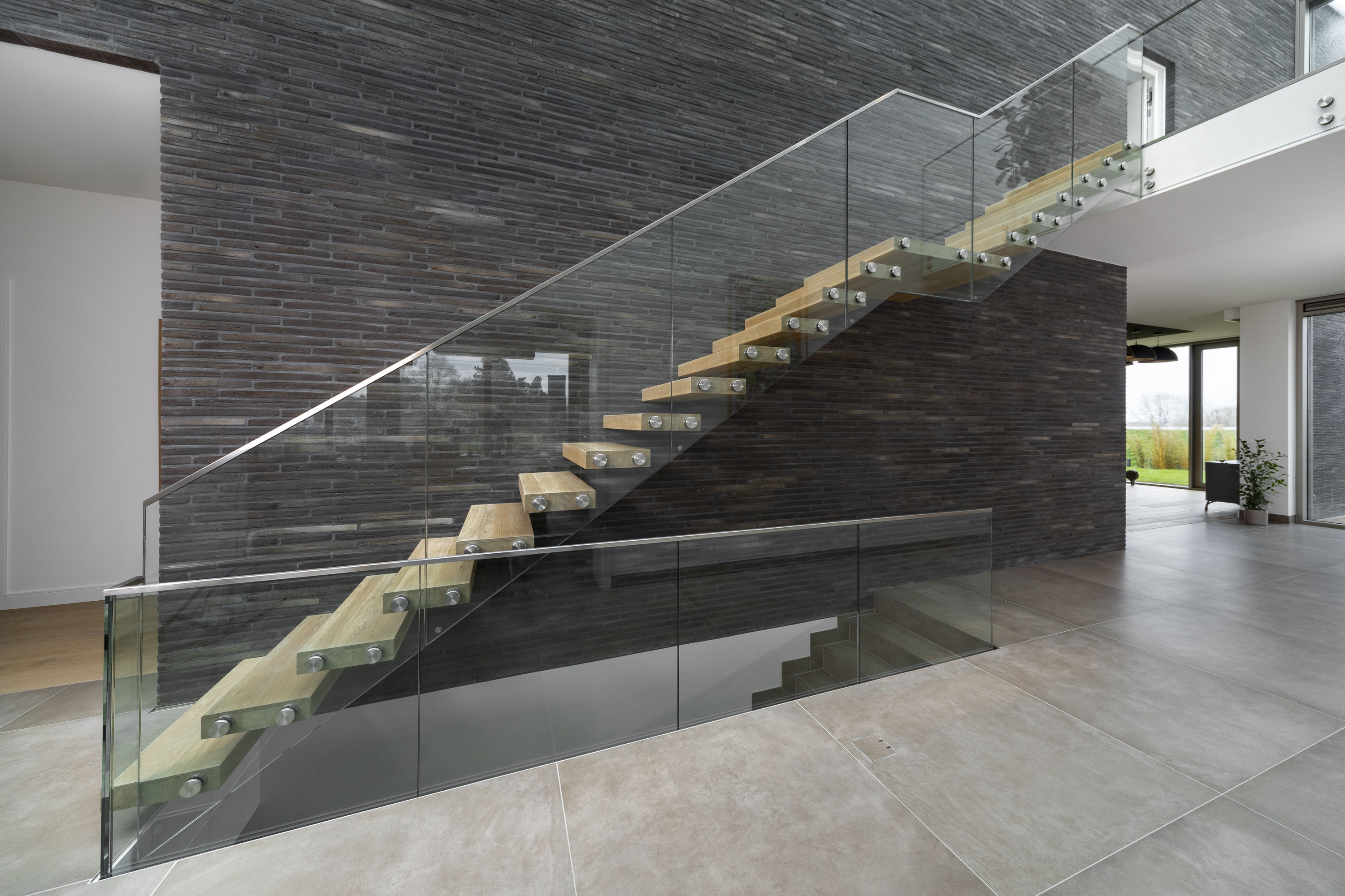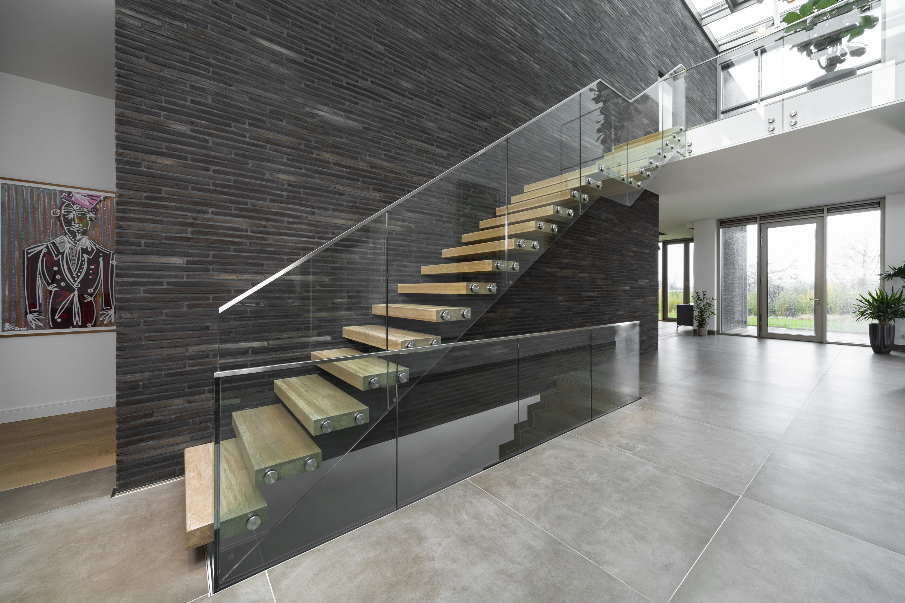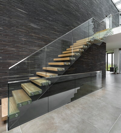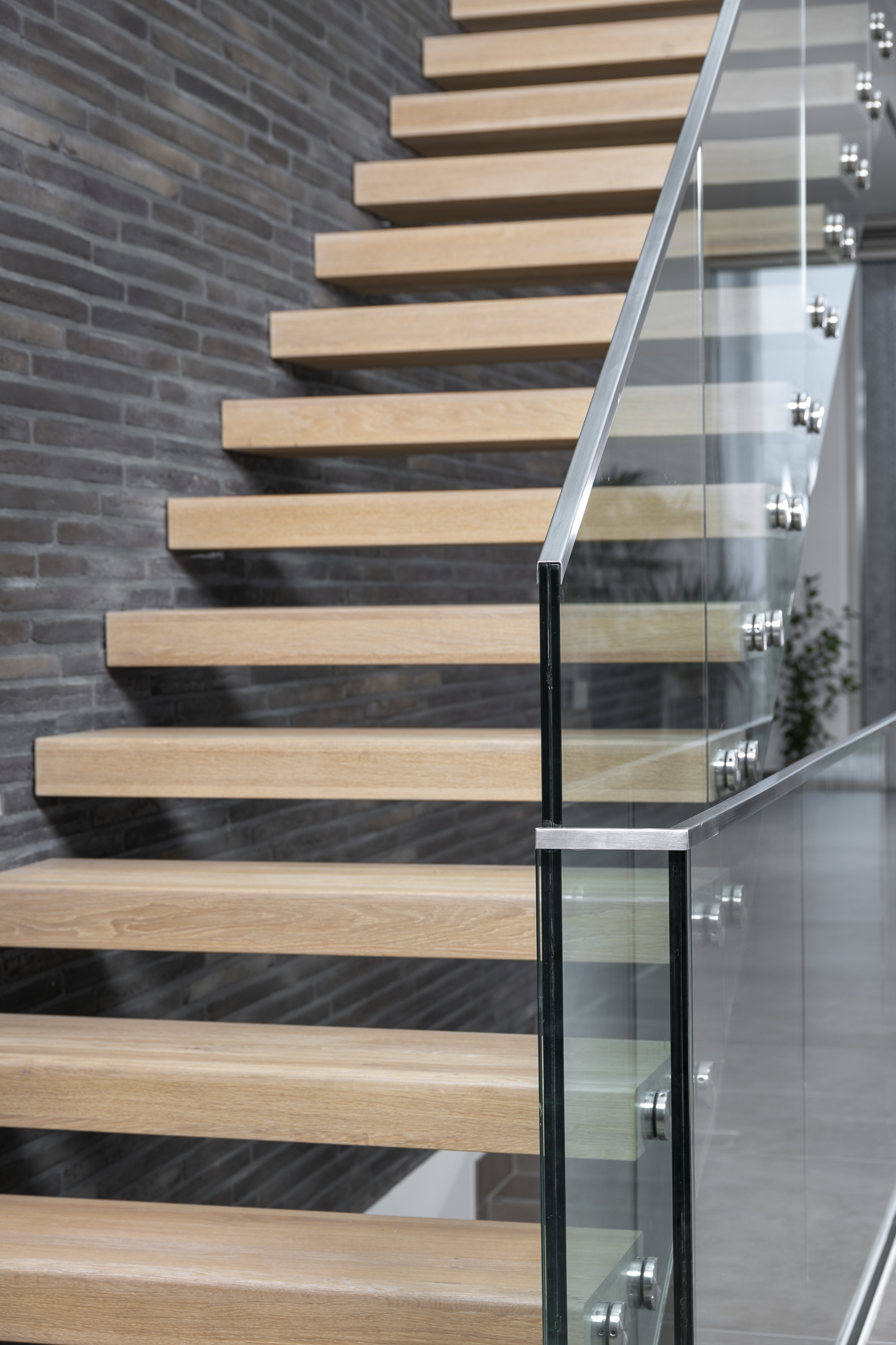 Kragarmtreppe in der Holzart Eiche weiß geölt mit TBV Echtholz-Öl, Glasgeländer