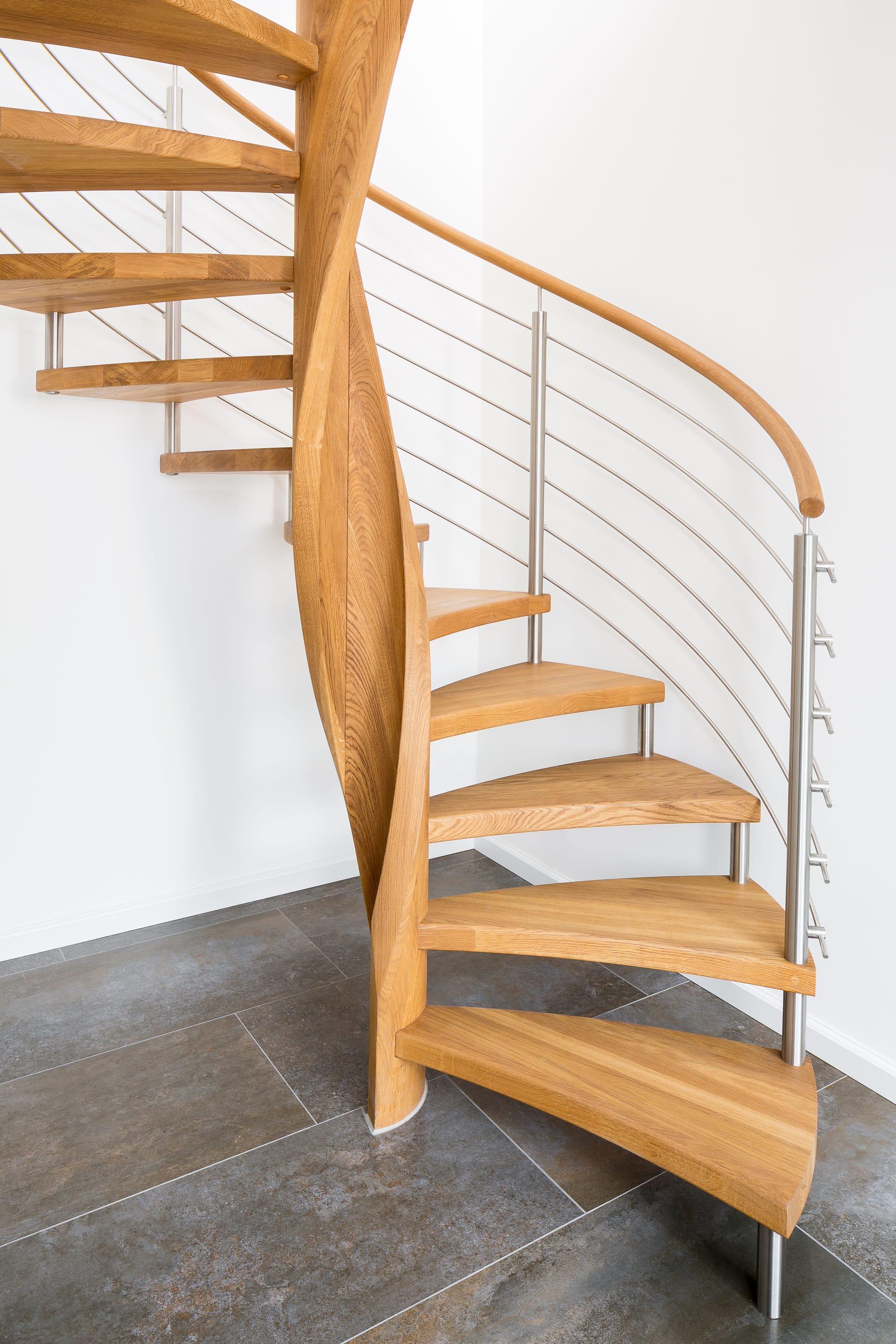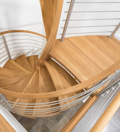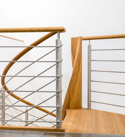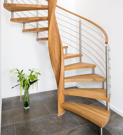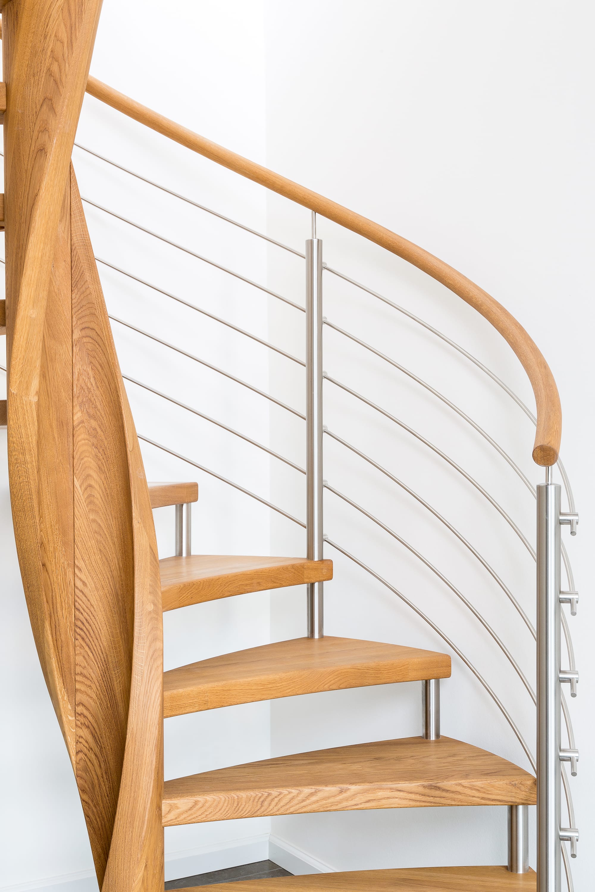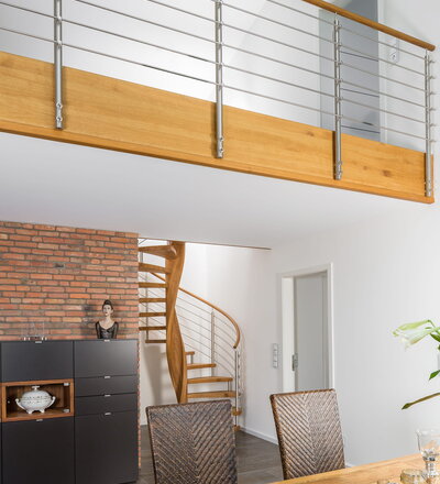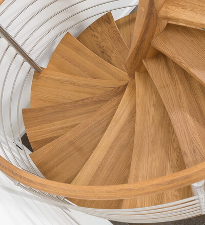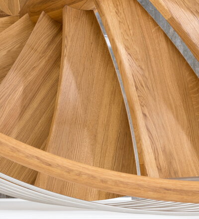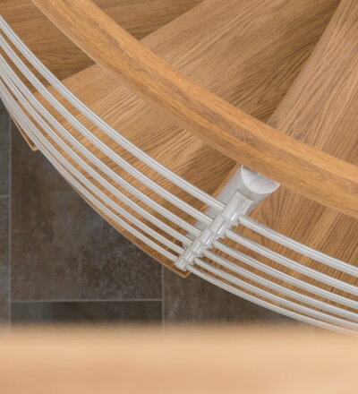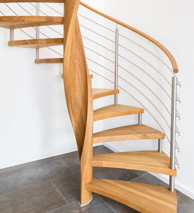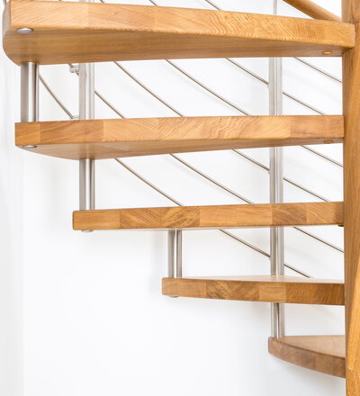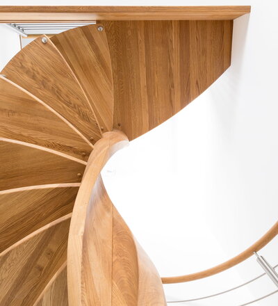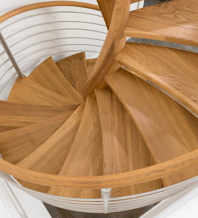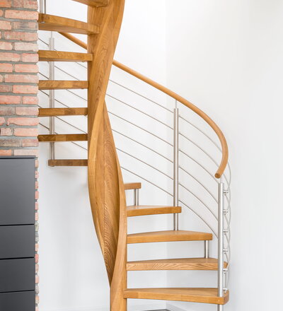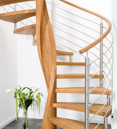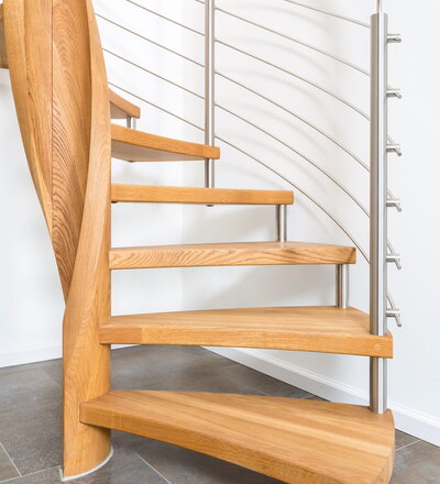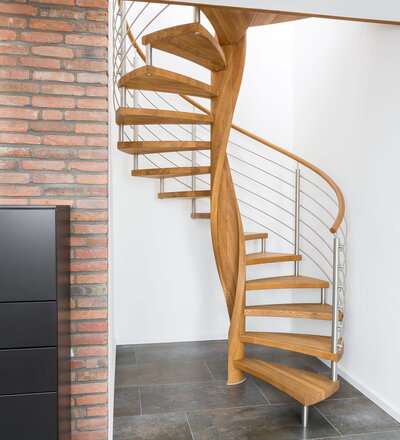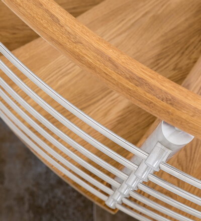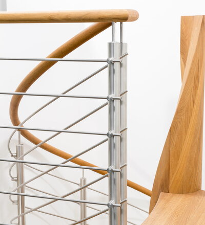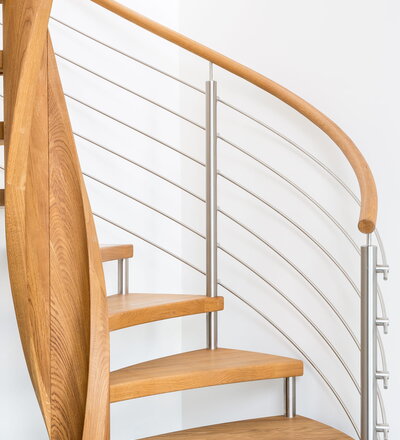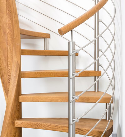 Spindeltreppe in der Holzart Eiche geölt mit durchgehendem Krümmling. Innenliegend eingestemmte und freiseitig freitragend. Geschweifte Stufenvorderkanten und ein Relinggeländer Milano 5.