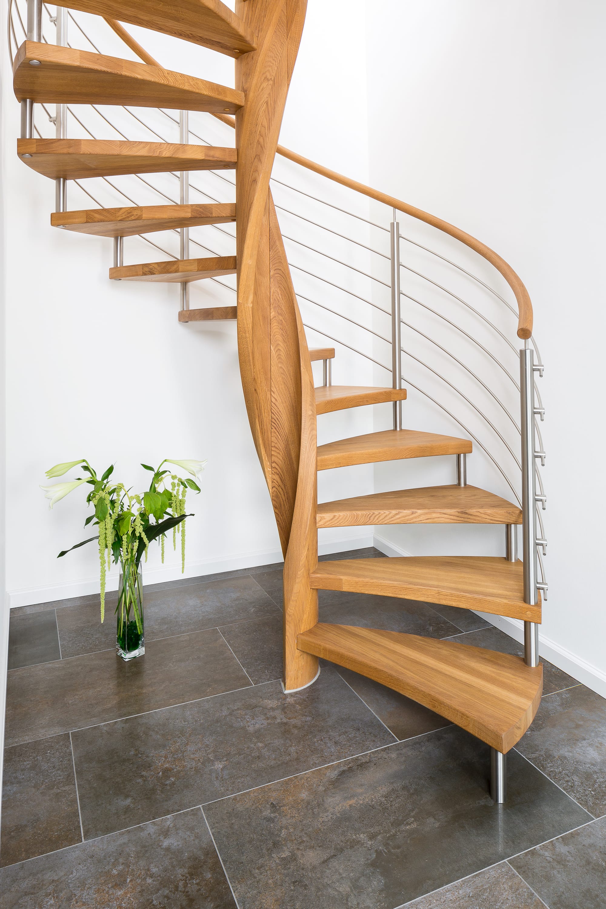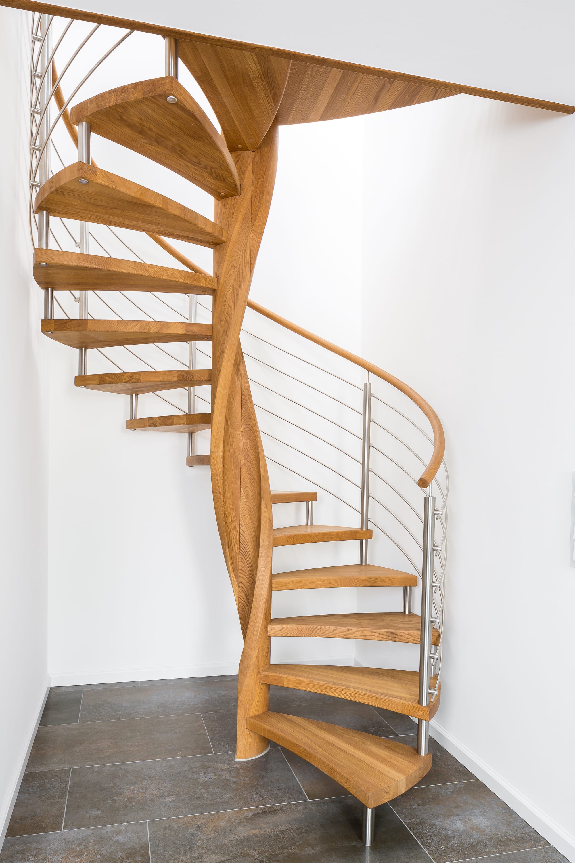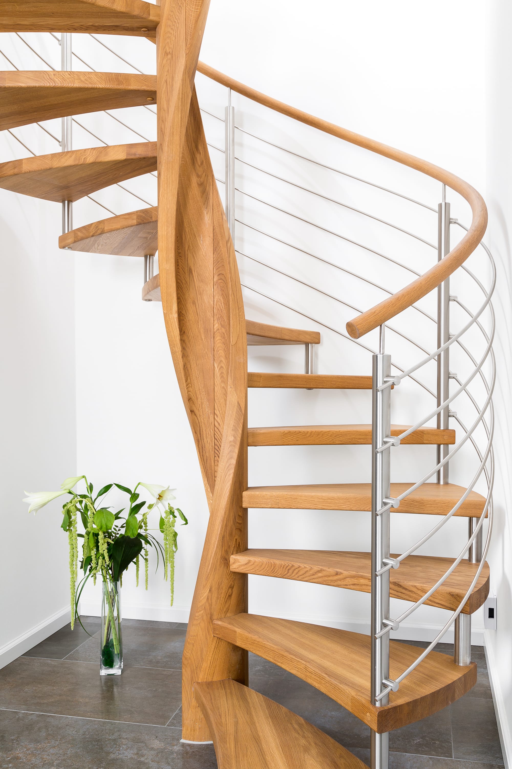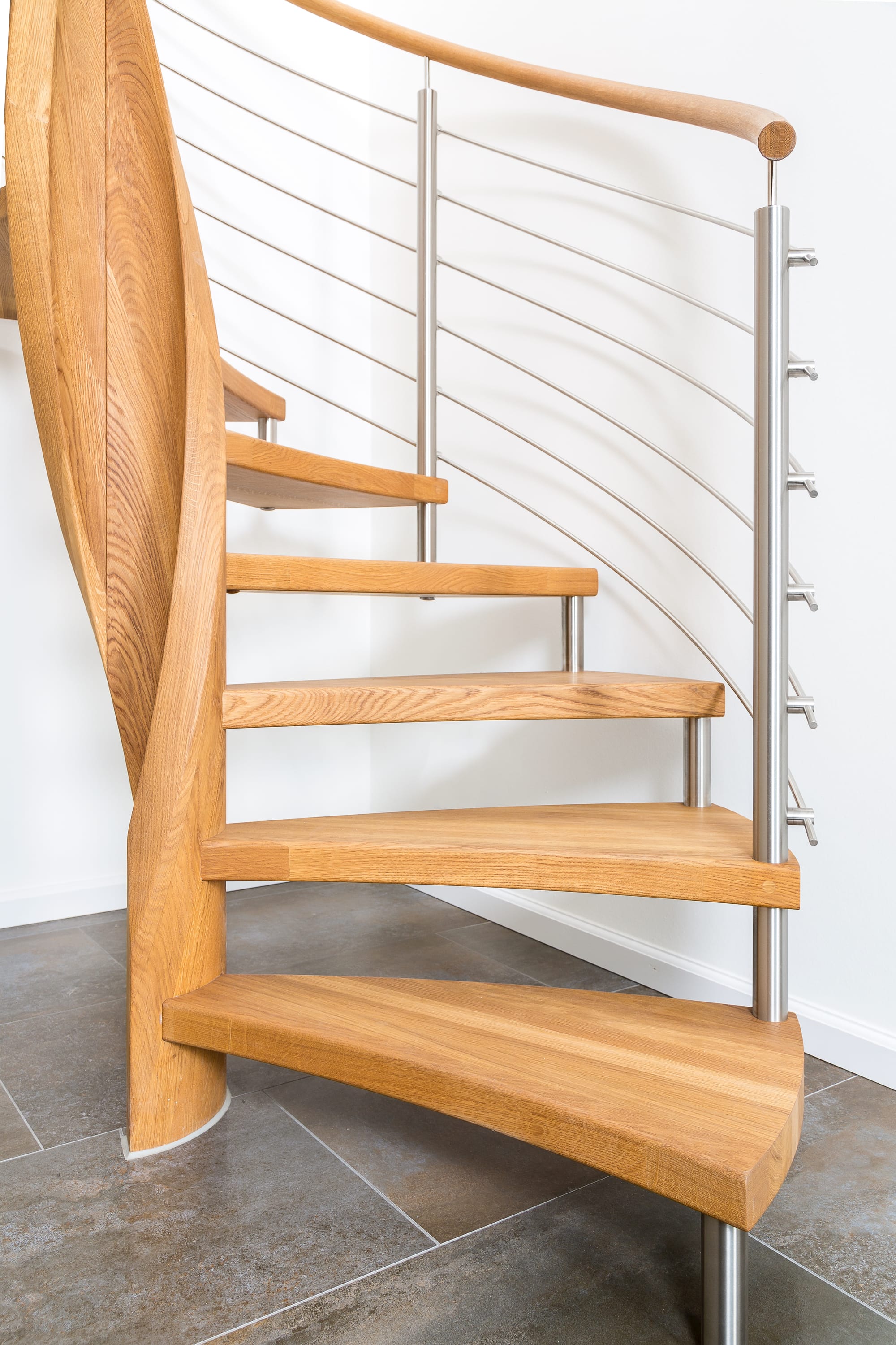 Spindeltreppe in der Holzart Eiche geölt mit durchgehendem Krümmling. Innenliegend eingestemmte und freiseitig freitragend. Geschweifte Stufenvorderkanten und ein Relinggeländer Milano 5.