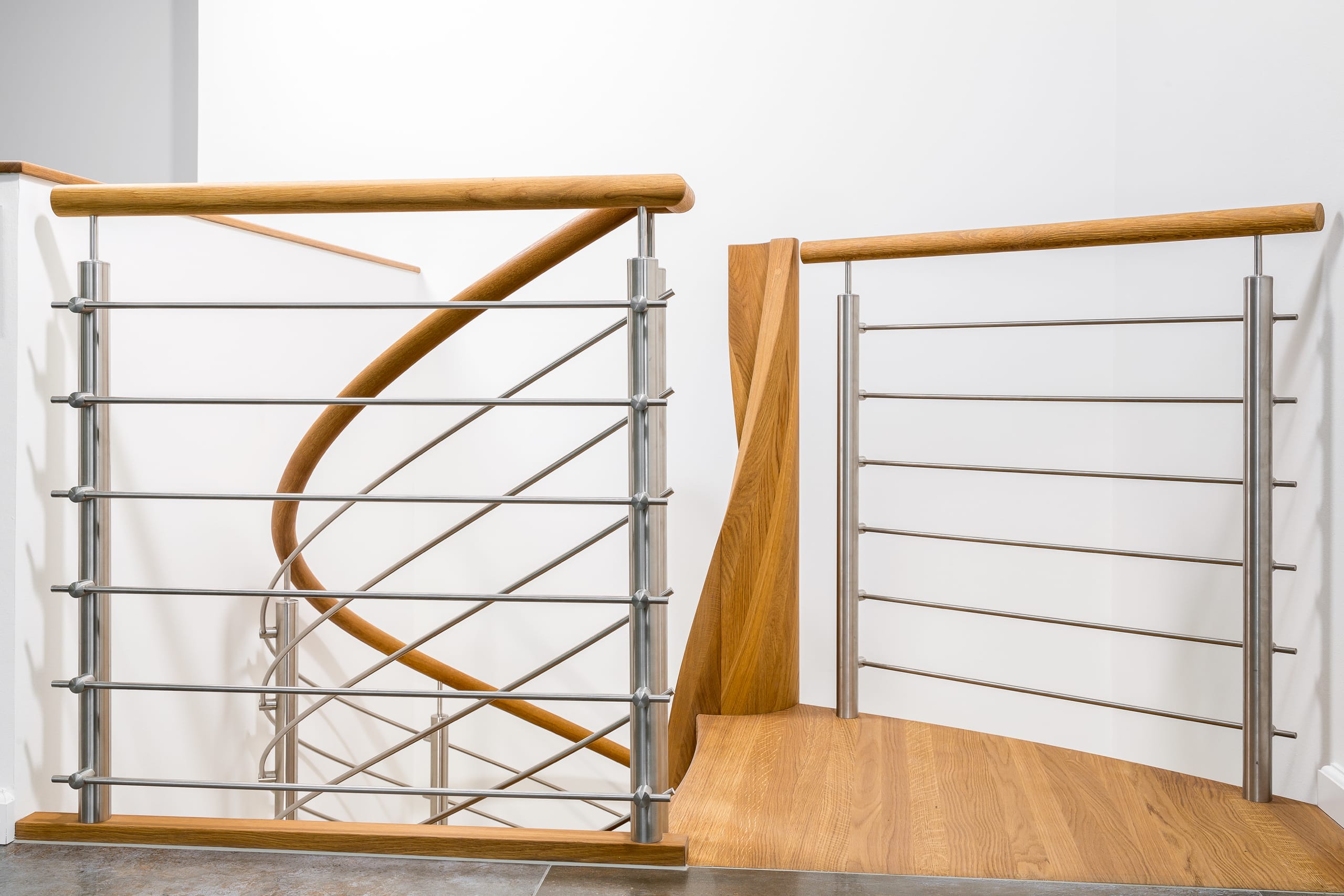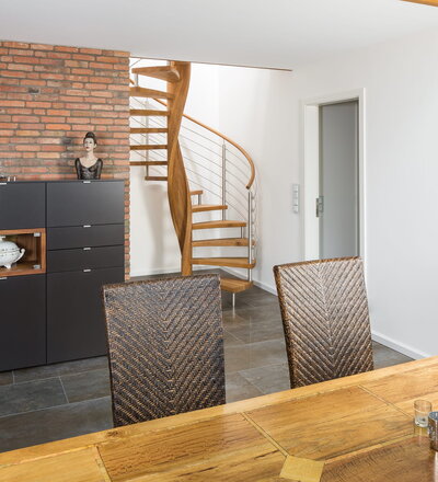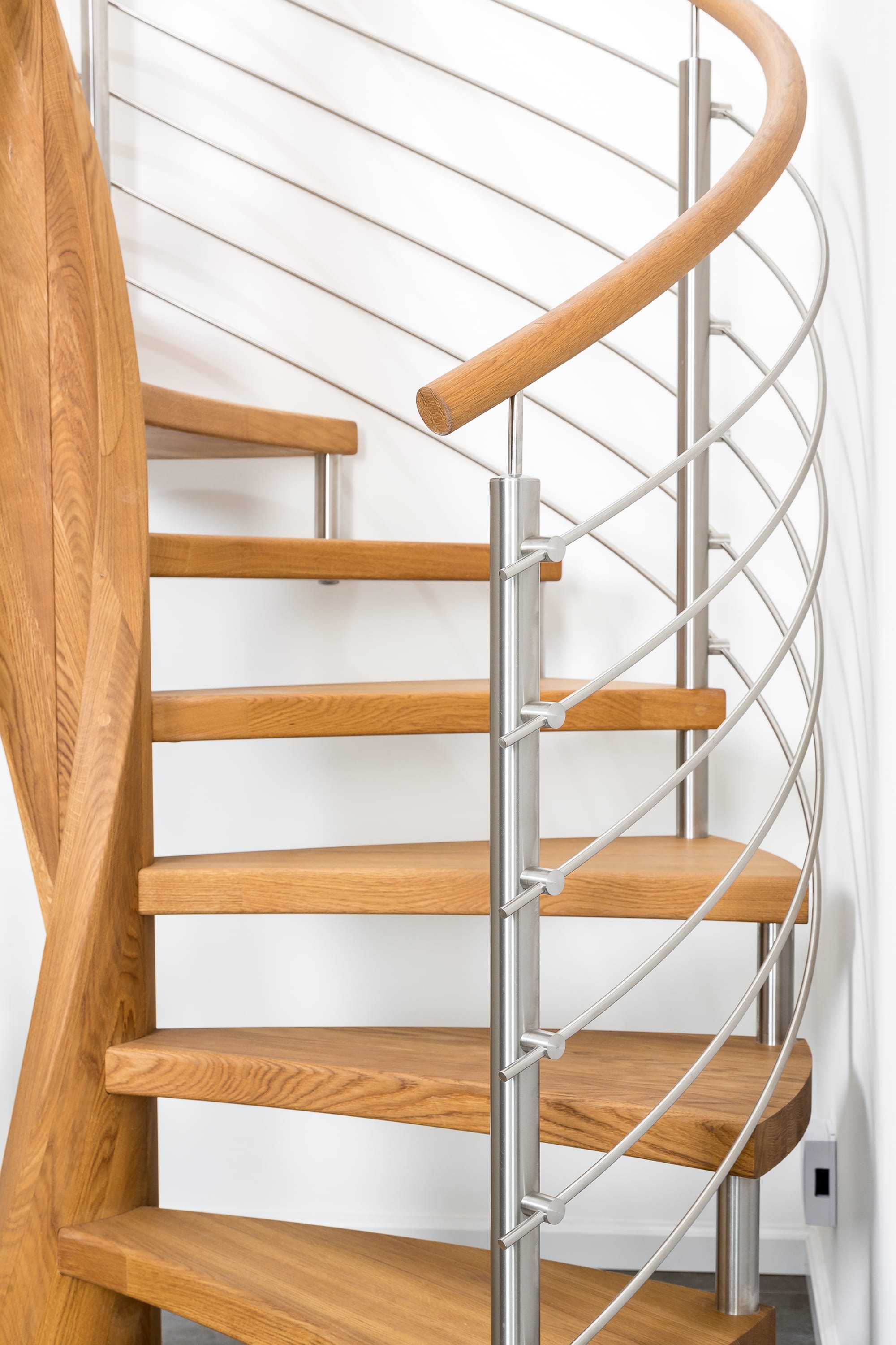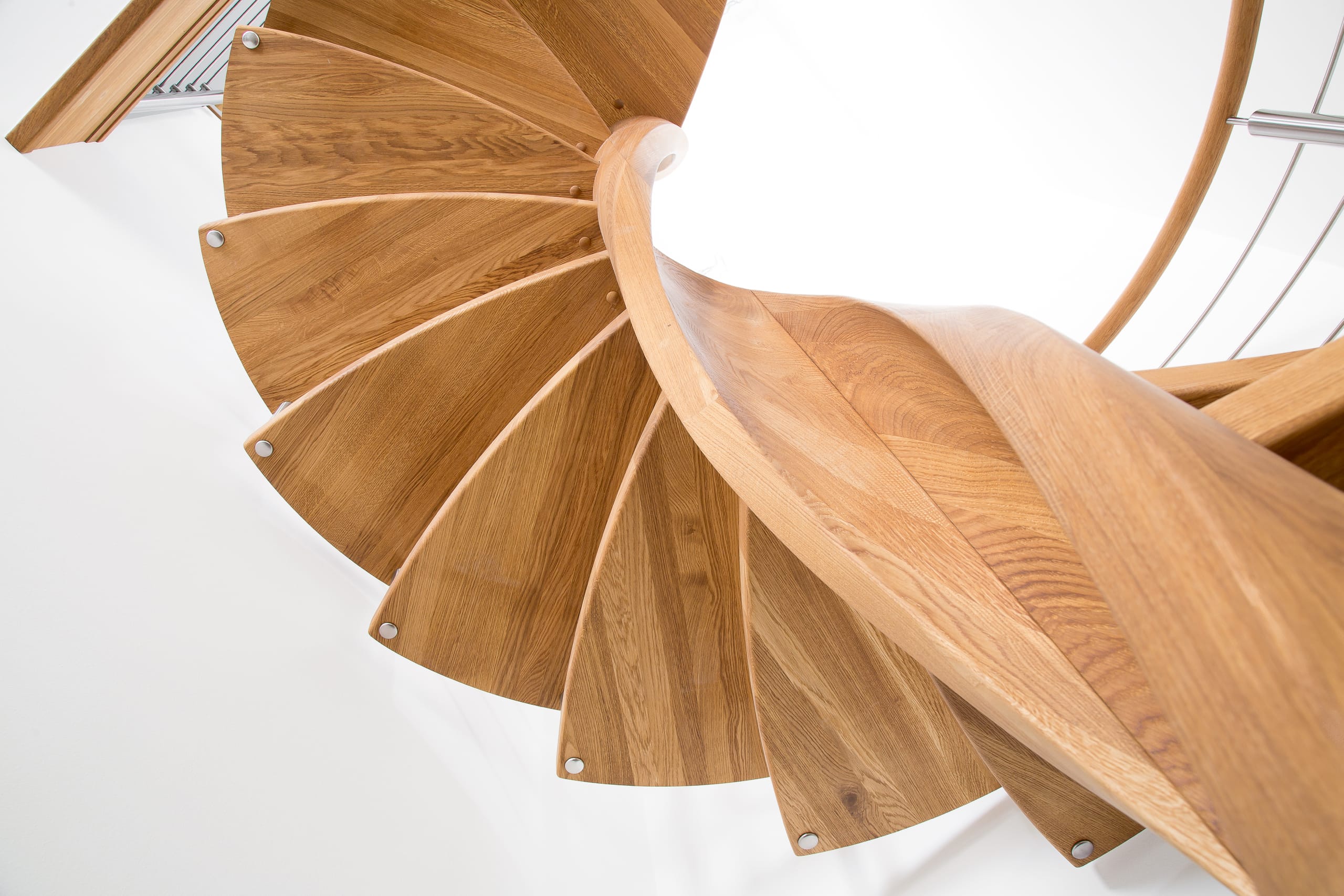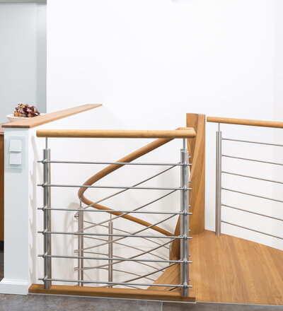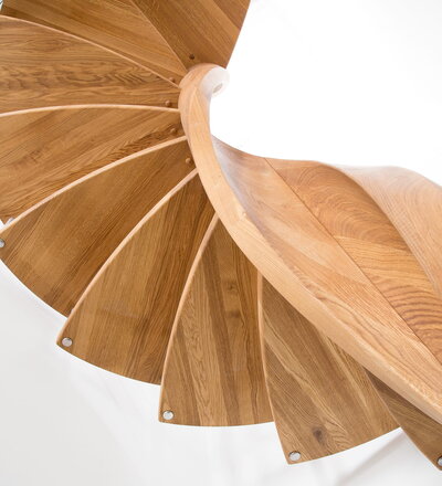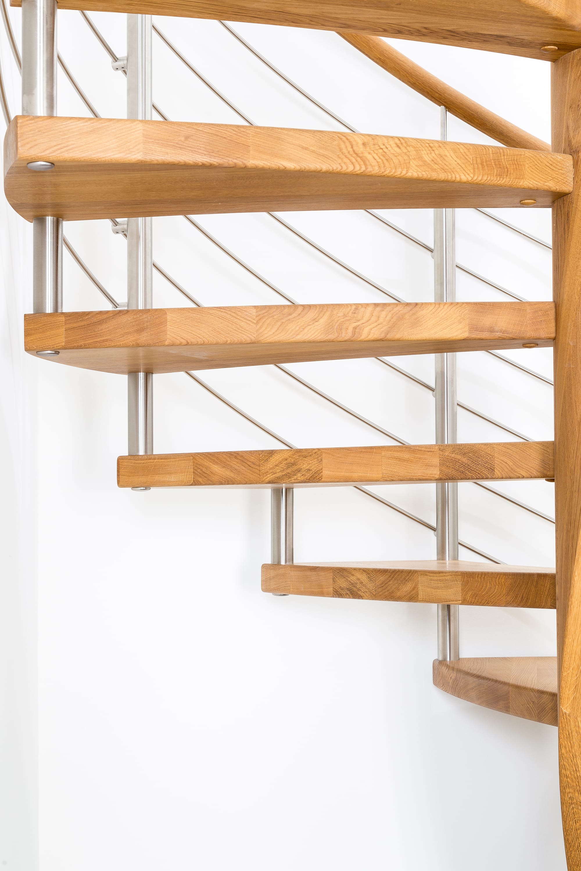 Spindeltreppe in der Holzart Eiche geölt mit durchgehendem Krümmling. Innenliegend eingestemmte und freiseitig freitragend. Geschweifte Stufenvorderkanten und ein Relinggeländer Milano 5.