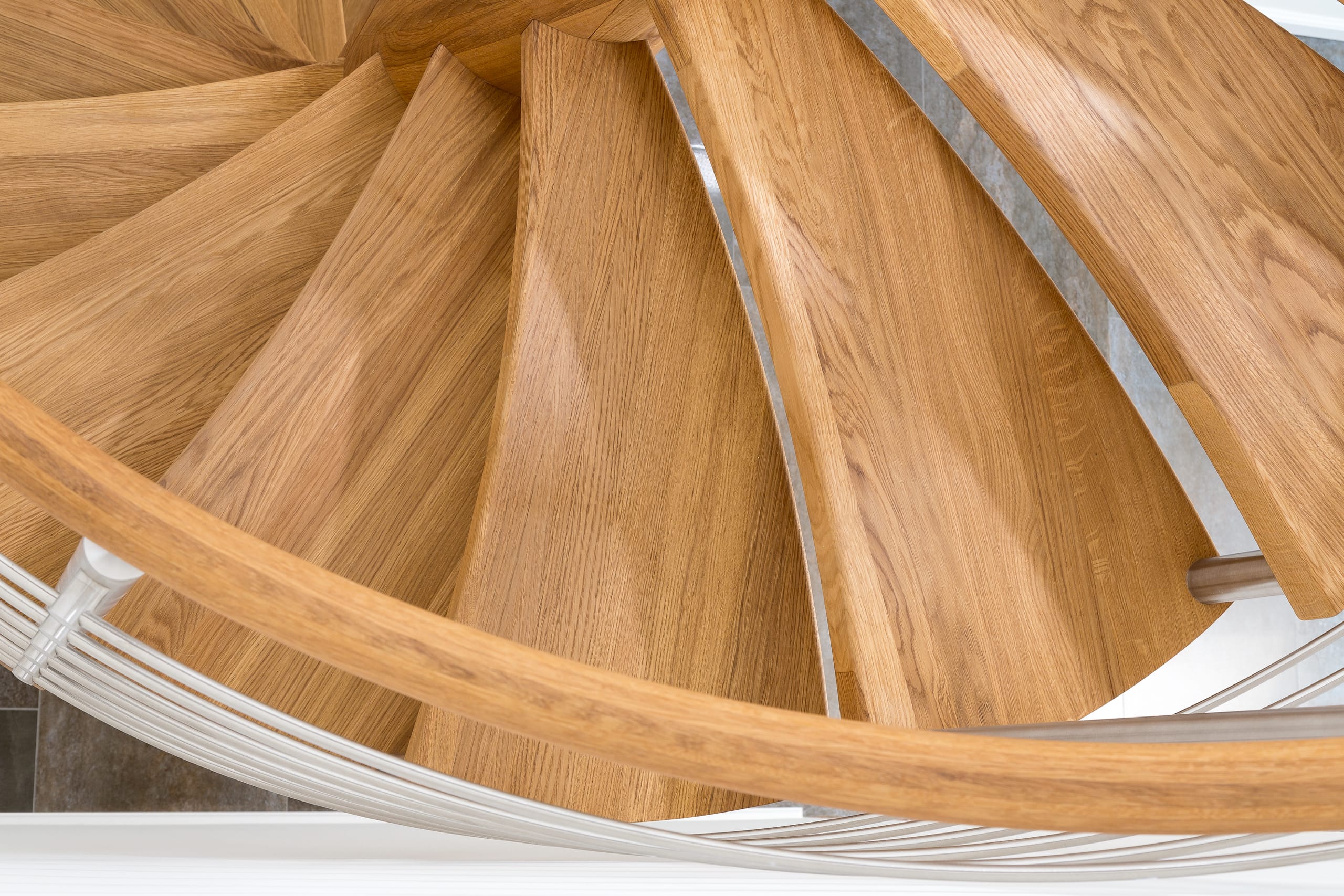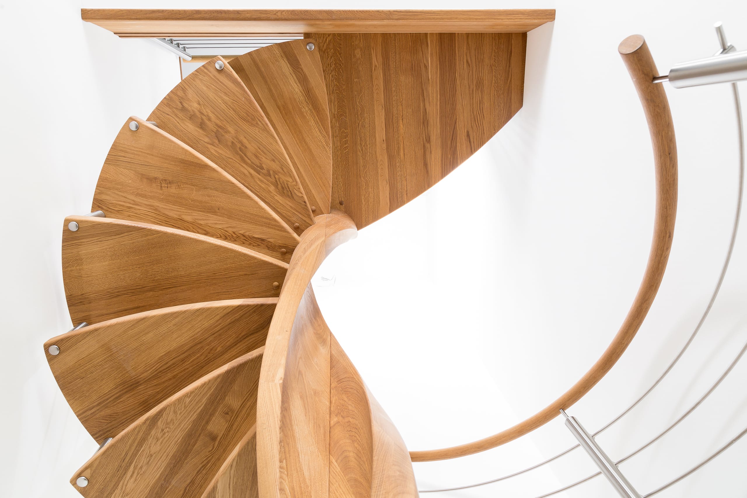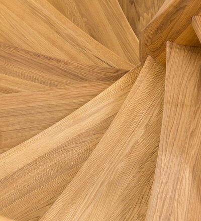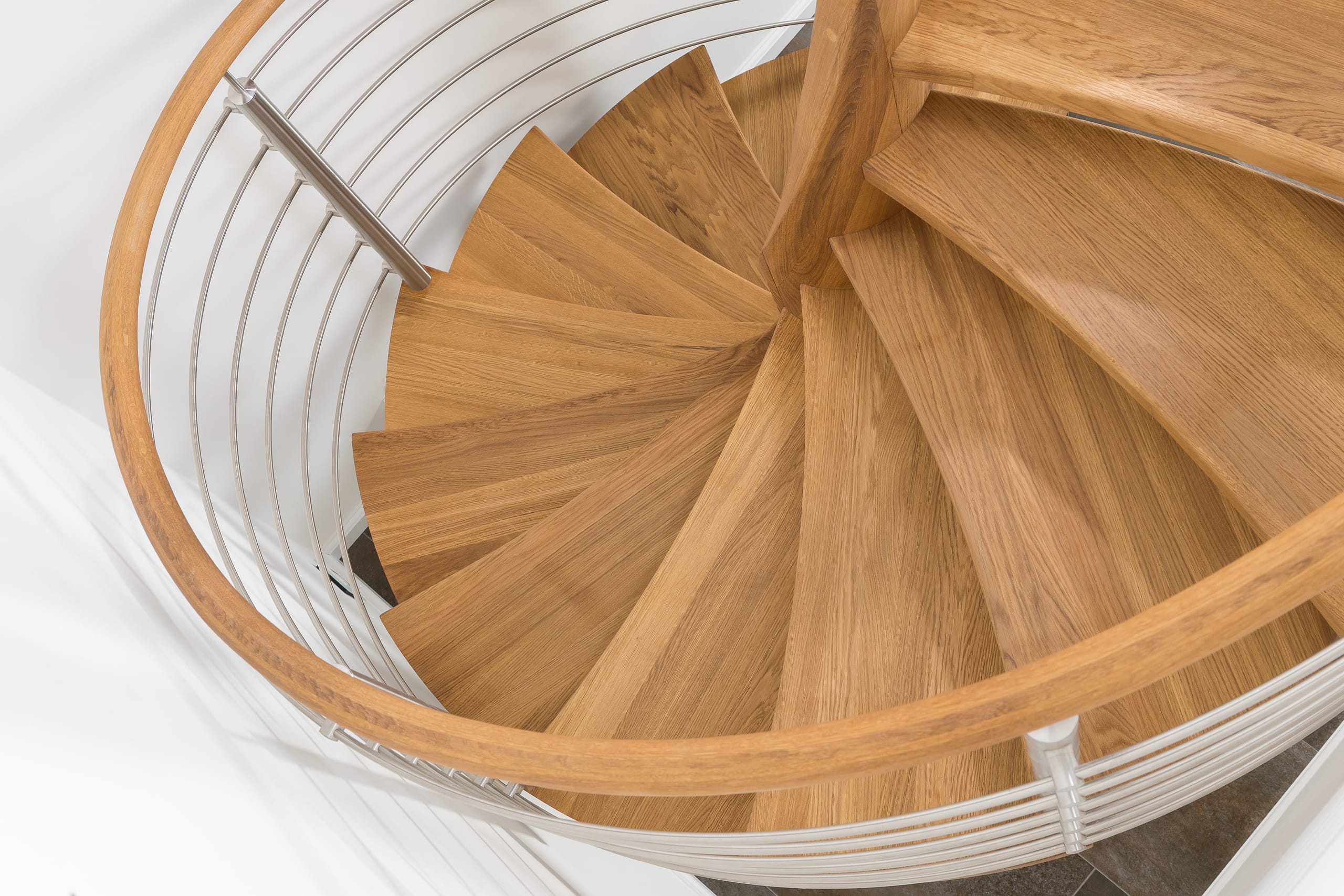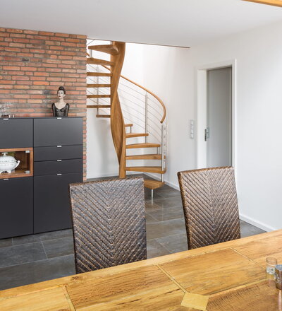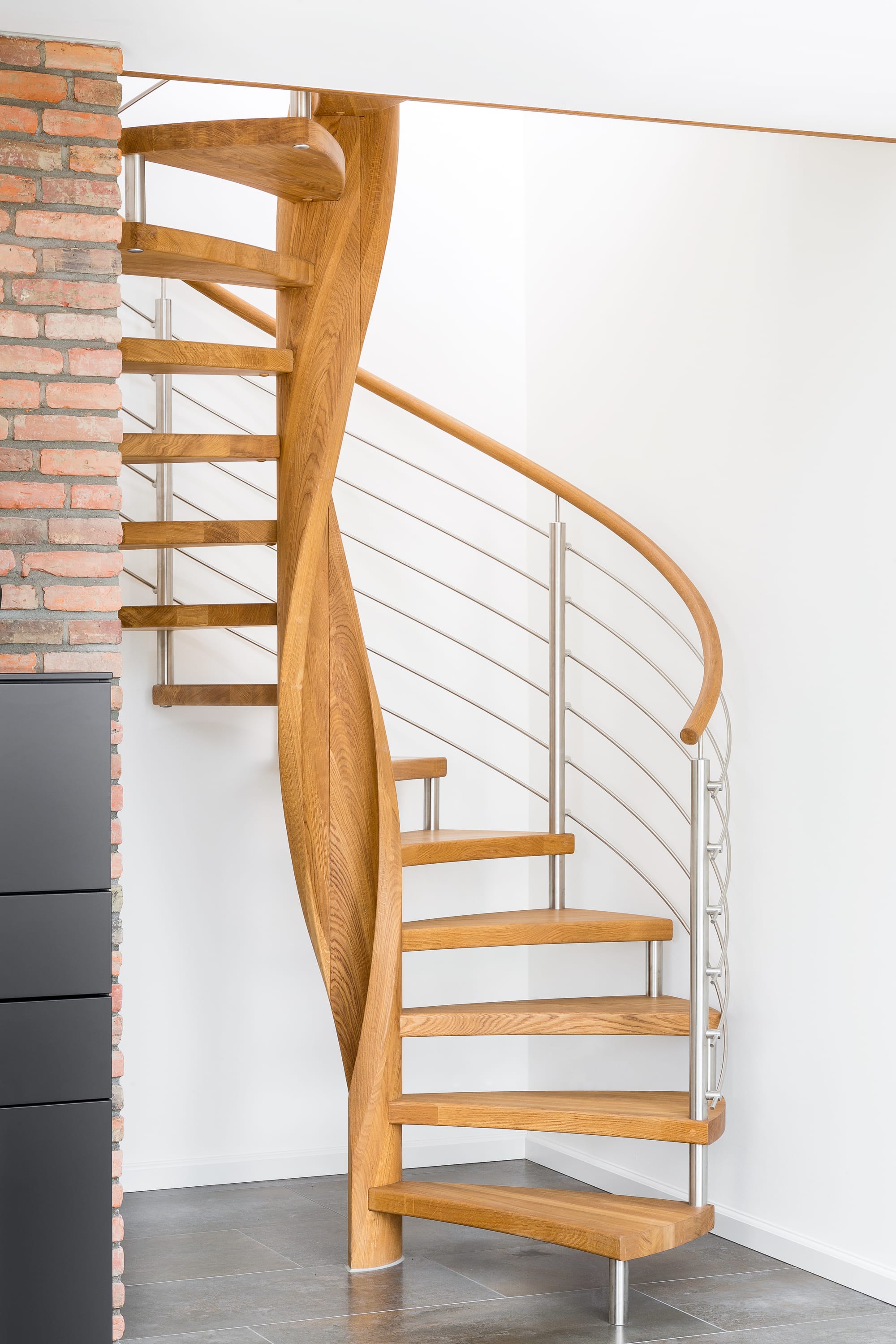 Spindeltreppe in der Holzart Eiche geölt mit durchgehendem Krümmling. Innenliegend eingestemmte und freiseitig freitragend. Geschweifte Stufenvorderkanten und ein Relinggeländer Milano 5.