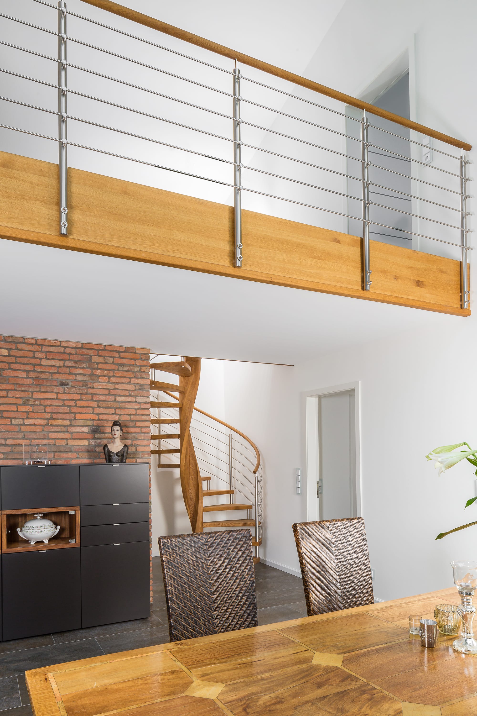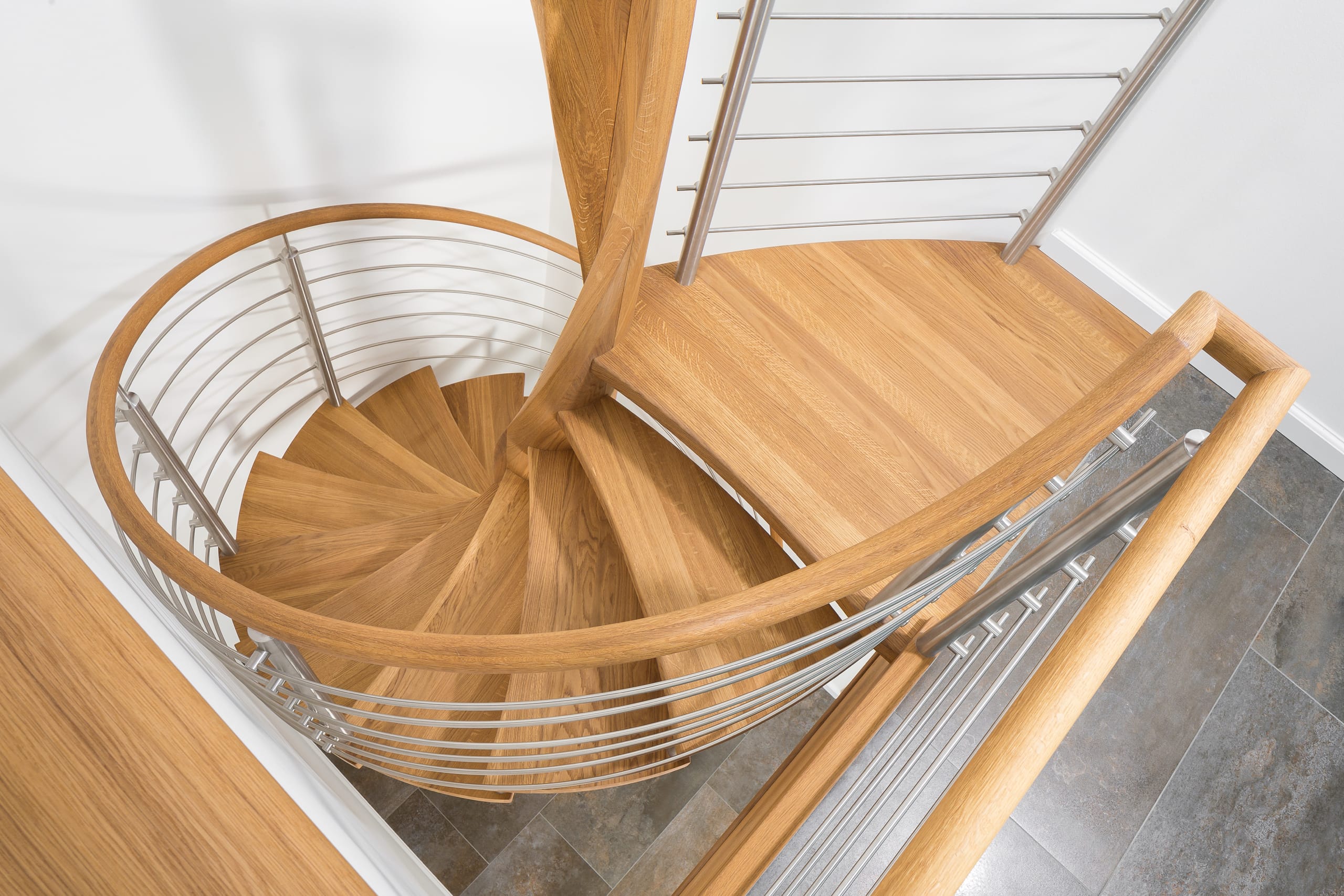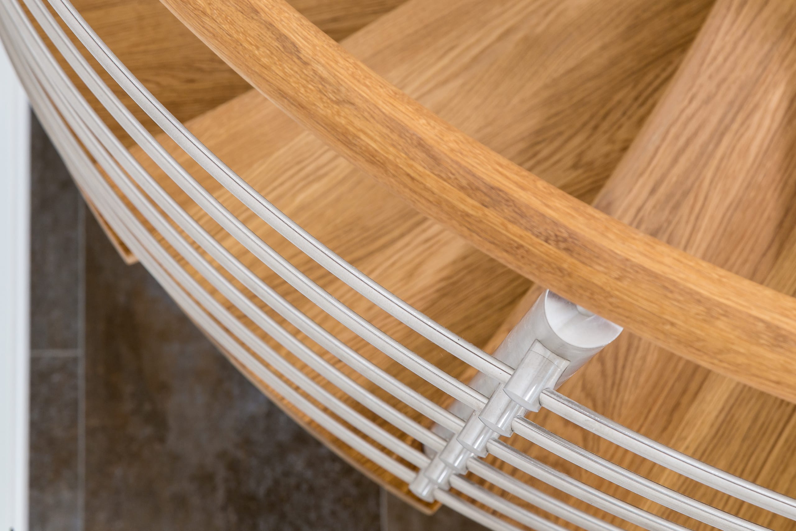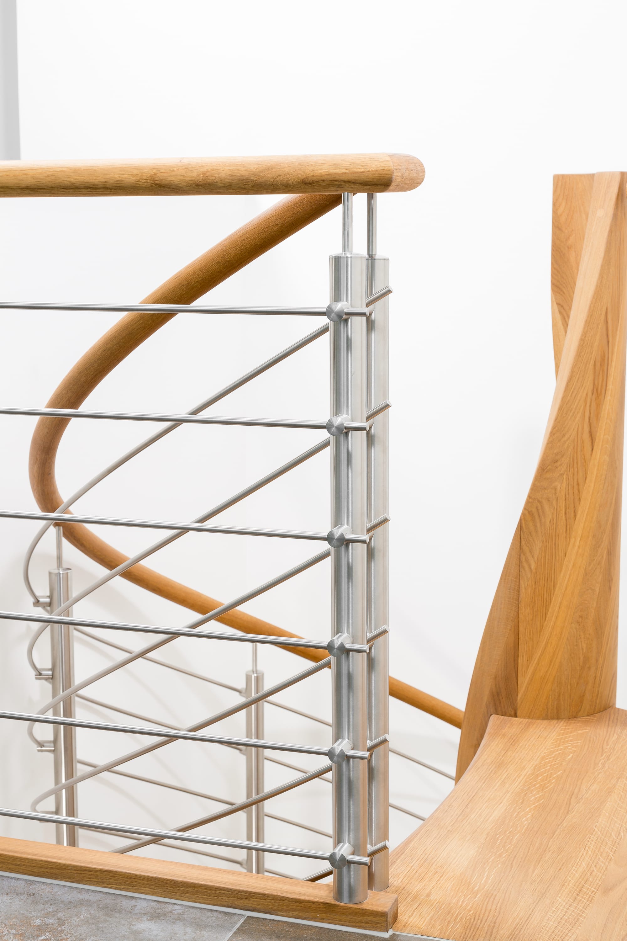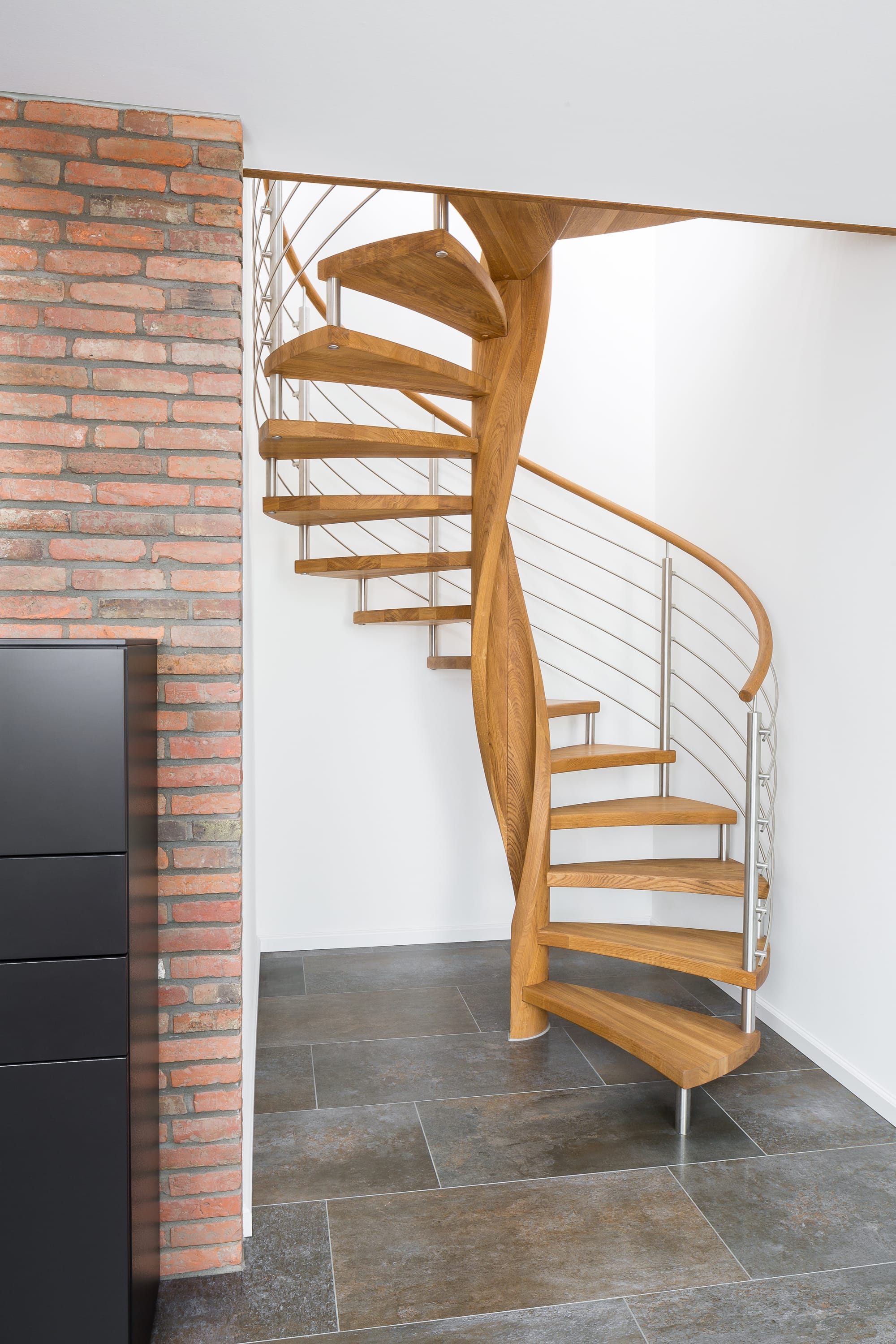 Spindeltreppe in der Holzart Eiche geölt mit durchgehendem Krümmling. Innenliegend eingestemmte und freiseitig freitragend. Geschweifte Stufenvorderkanten und ein Relinggeländer Milano 5.