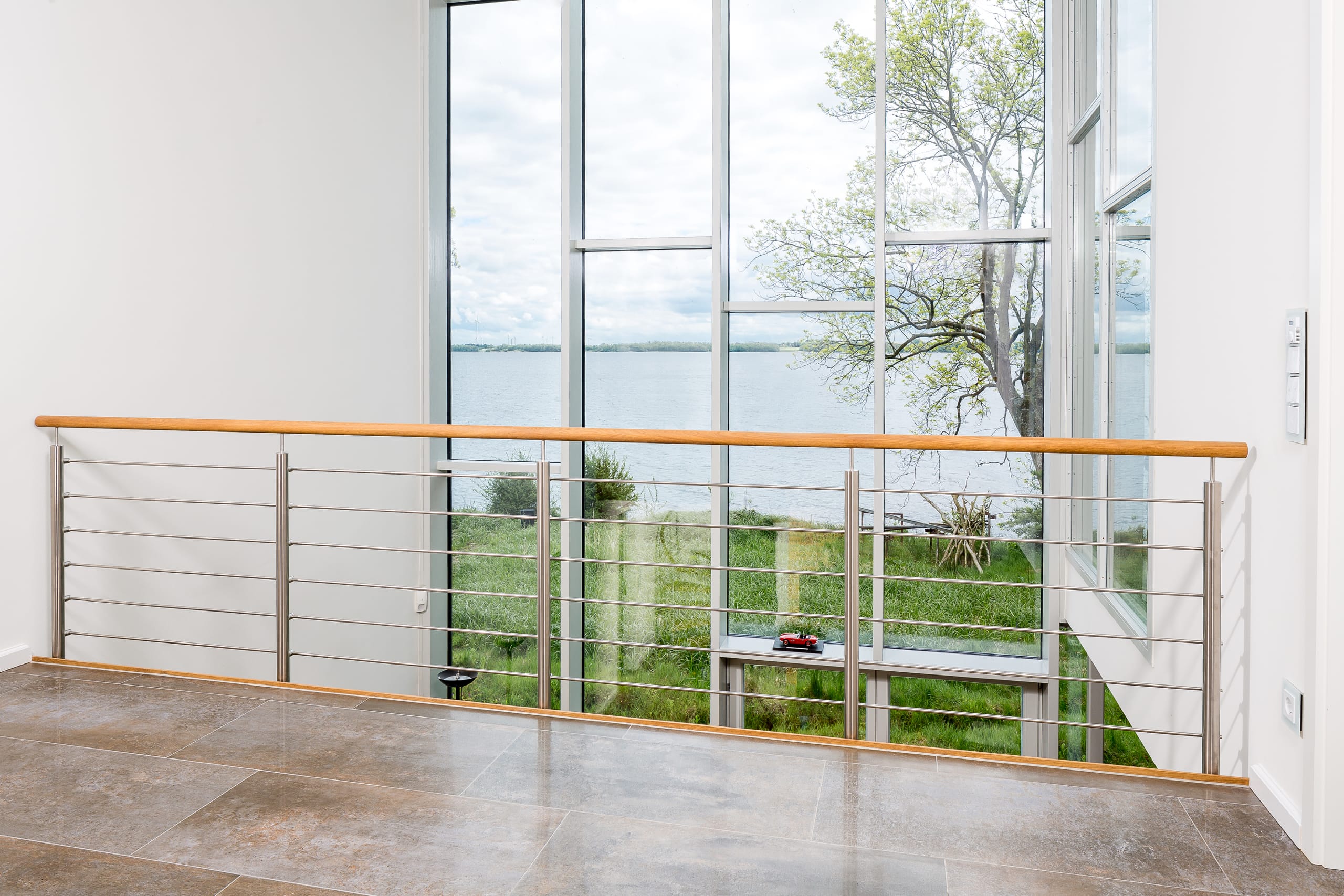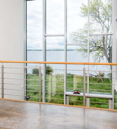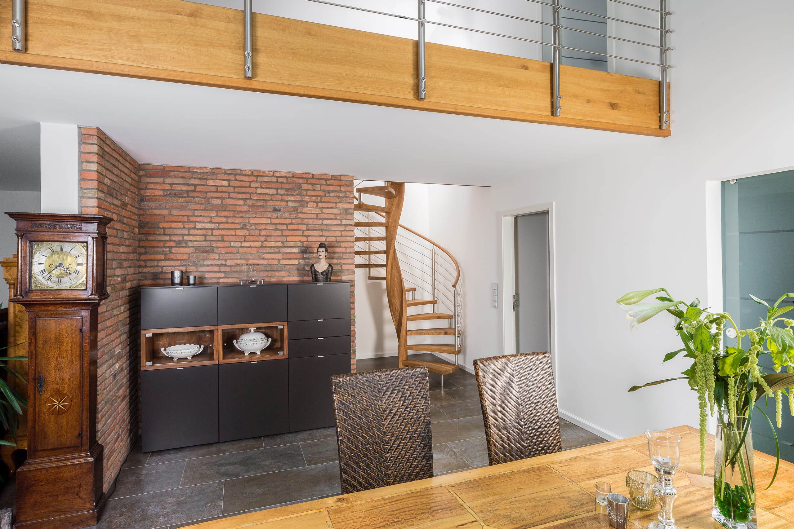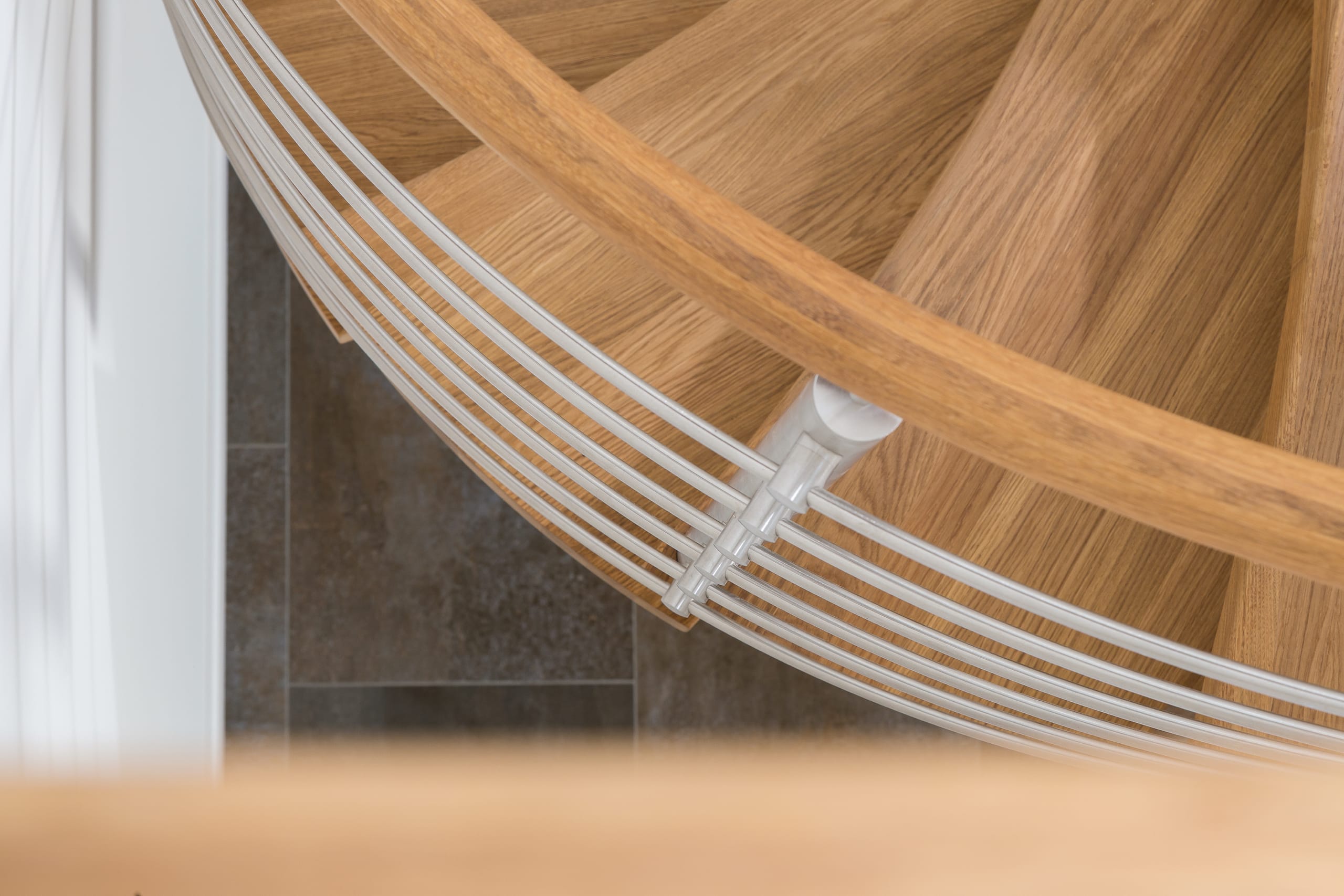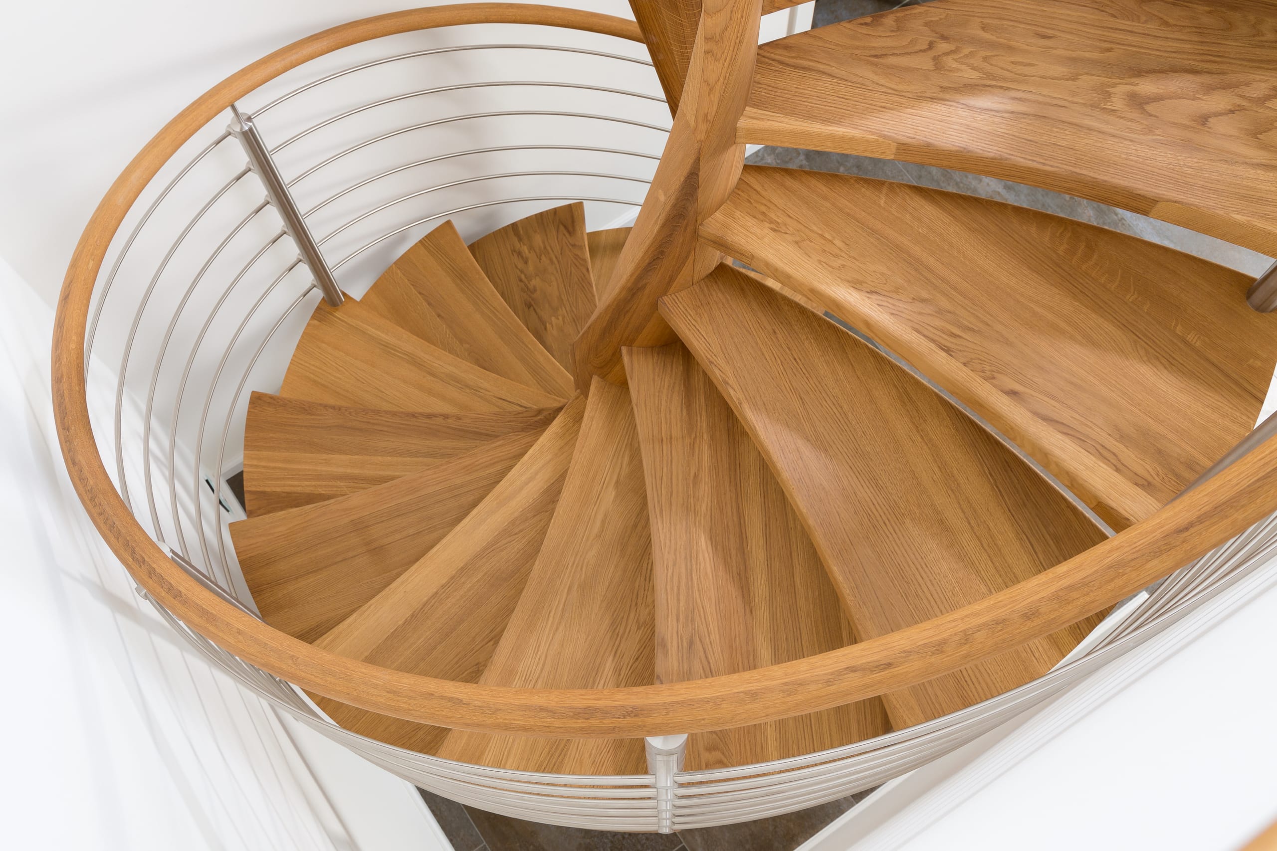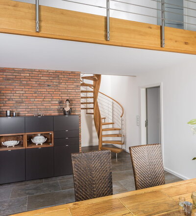Spindeltreppe in der Holzart Eiche geölt mit durchgehendem Krümmling. Innenliegend eingestemmte und freiseitig freitragend. Geschweifte Stufenvorderkanten und ein Relinggeländer Milano 5.