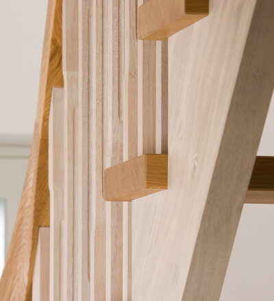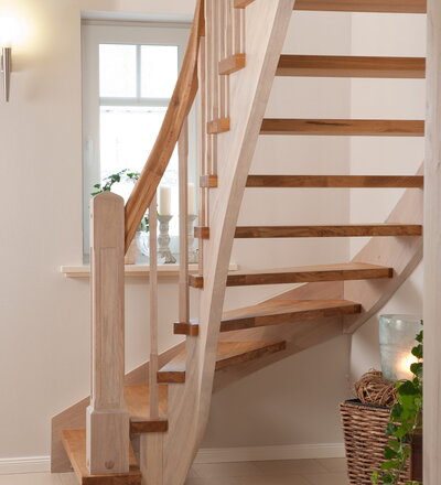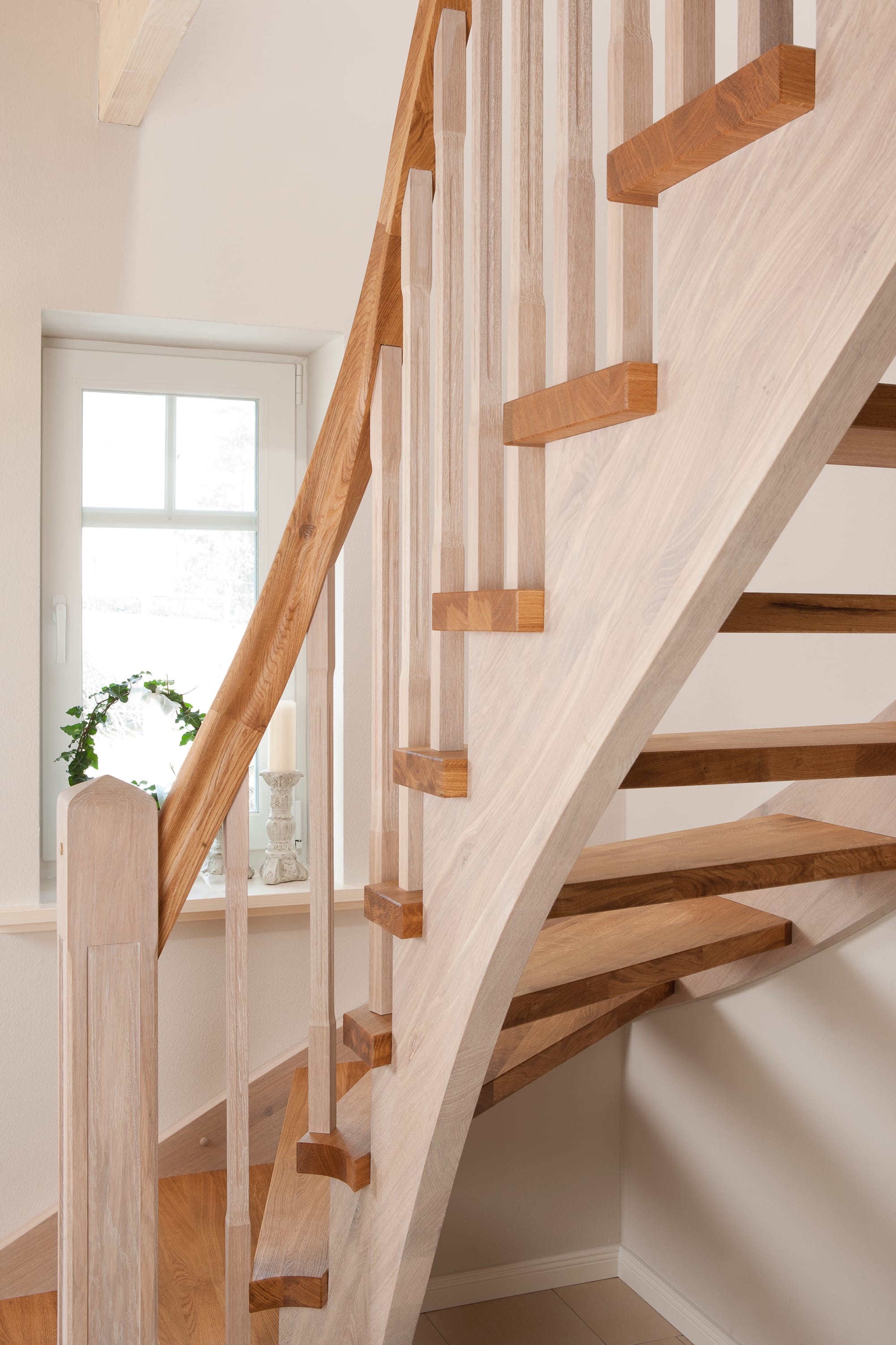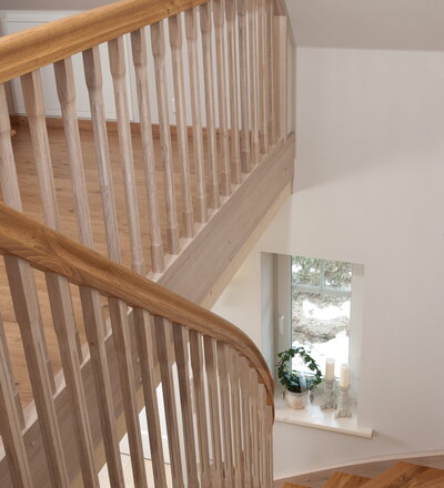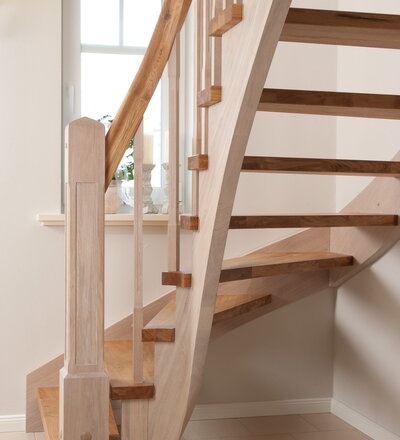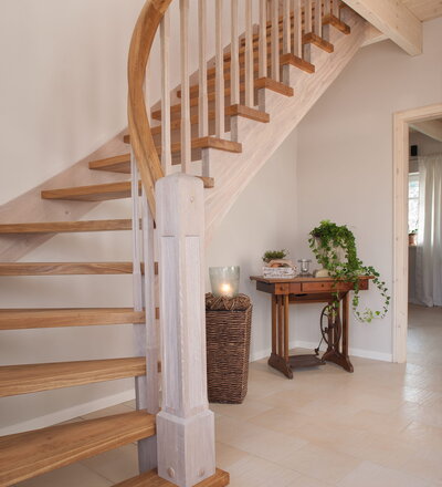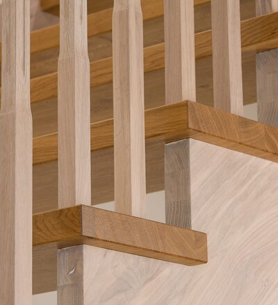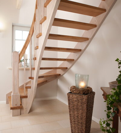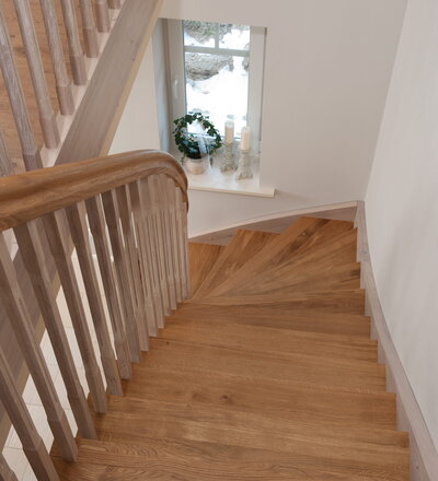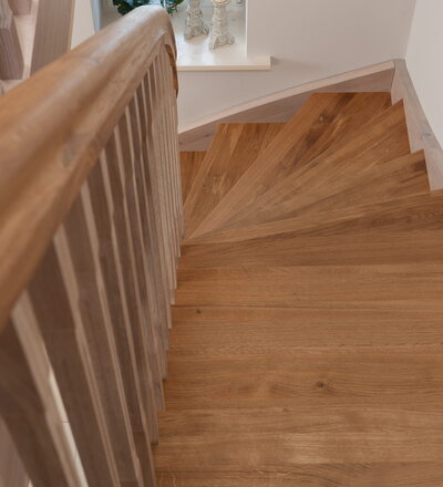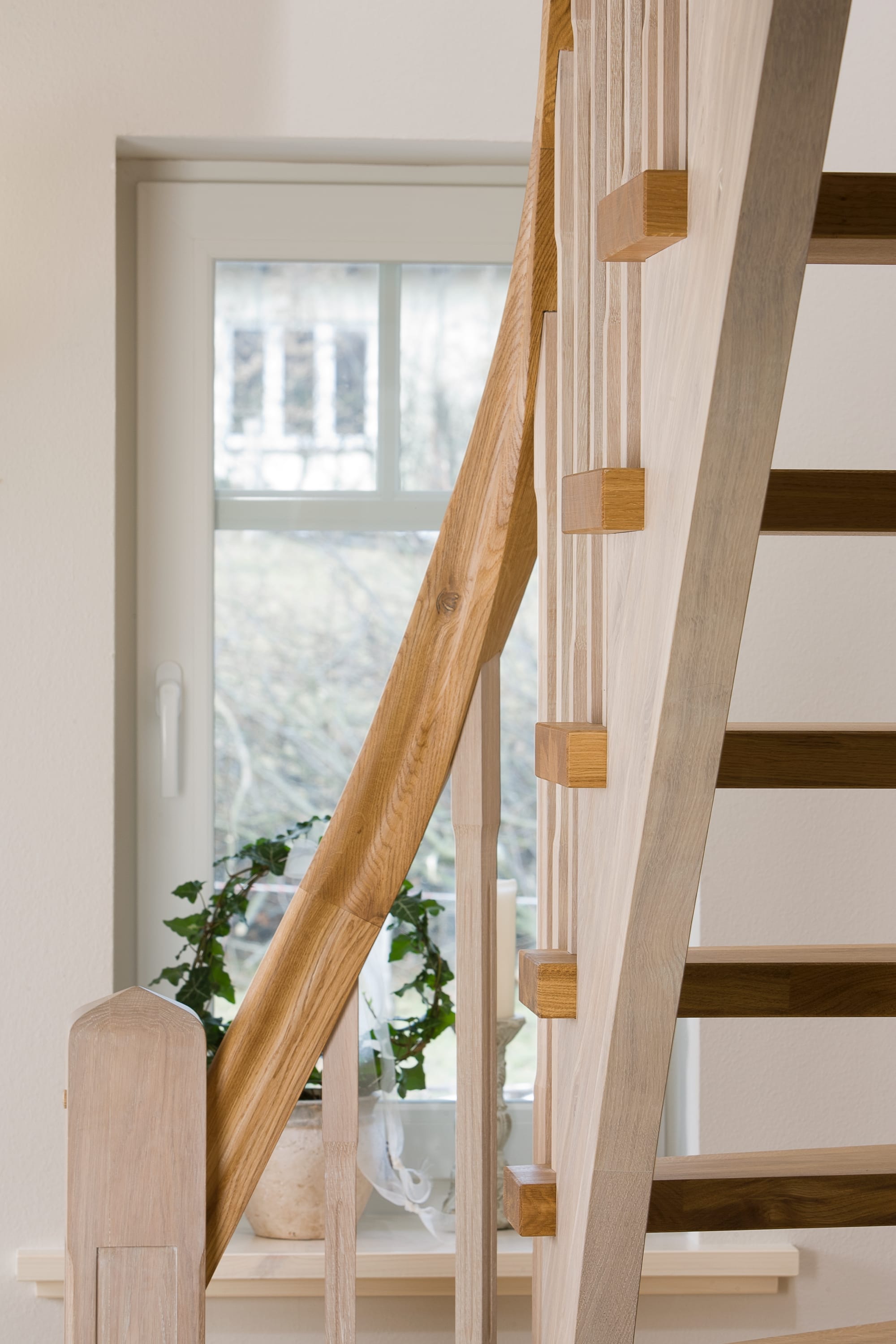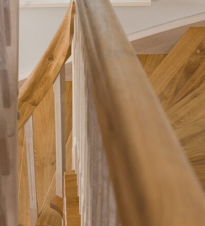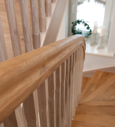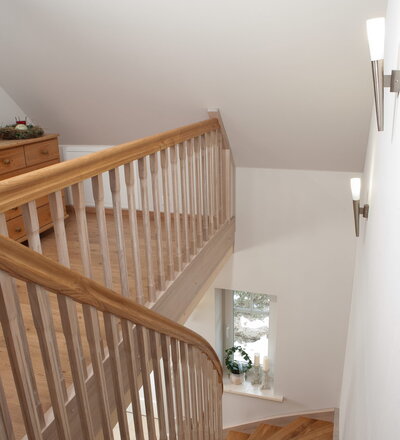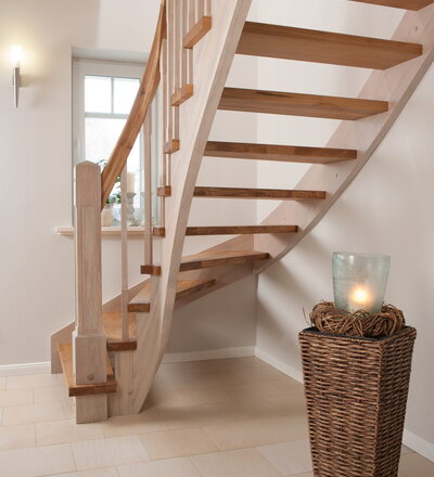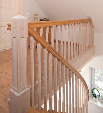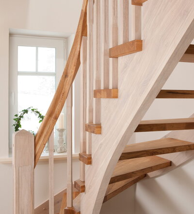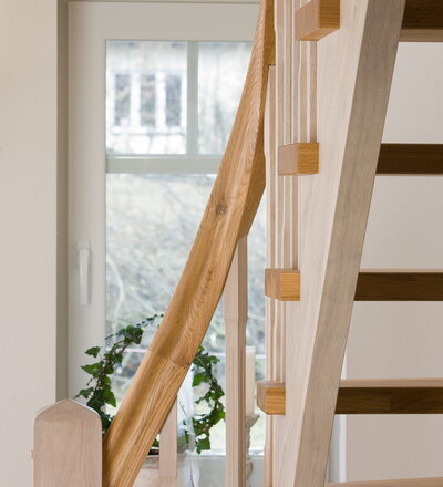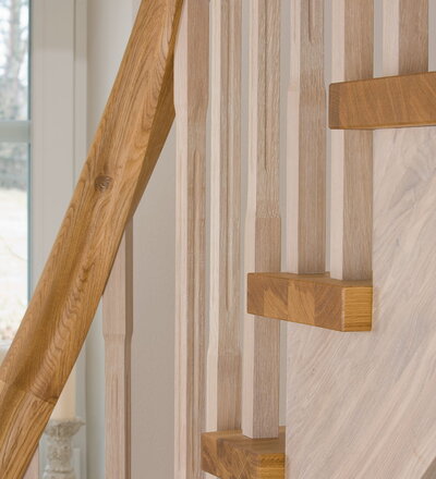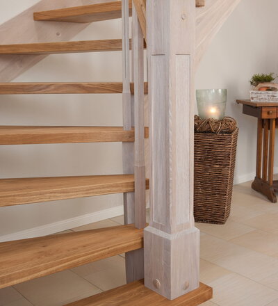Wangentreppe einseitig aufgesattelt; Holzart Eiche astig; Stufen und Handlauf geölt; Wangen, Stäbe und Pfosten weiß transparent gewachst.