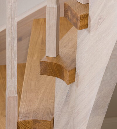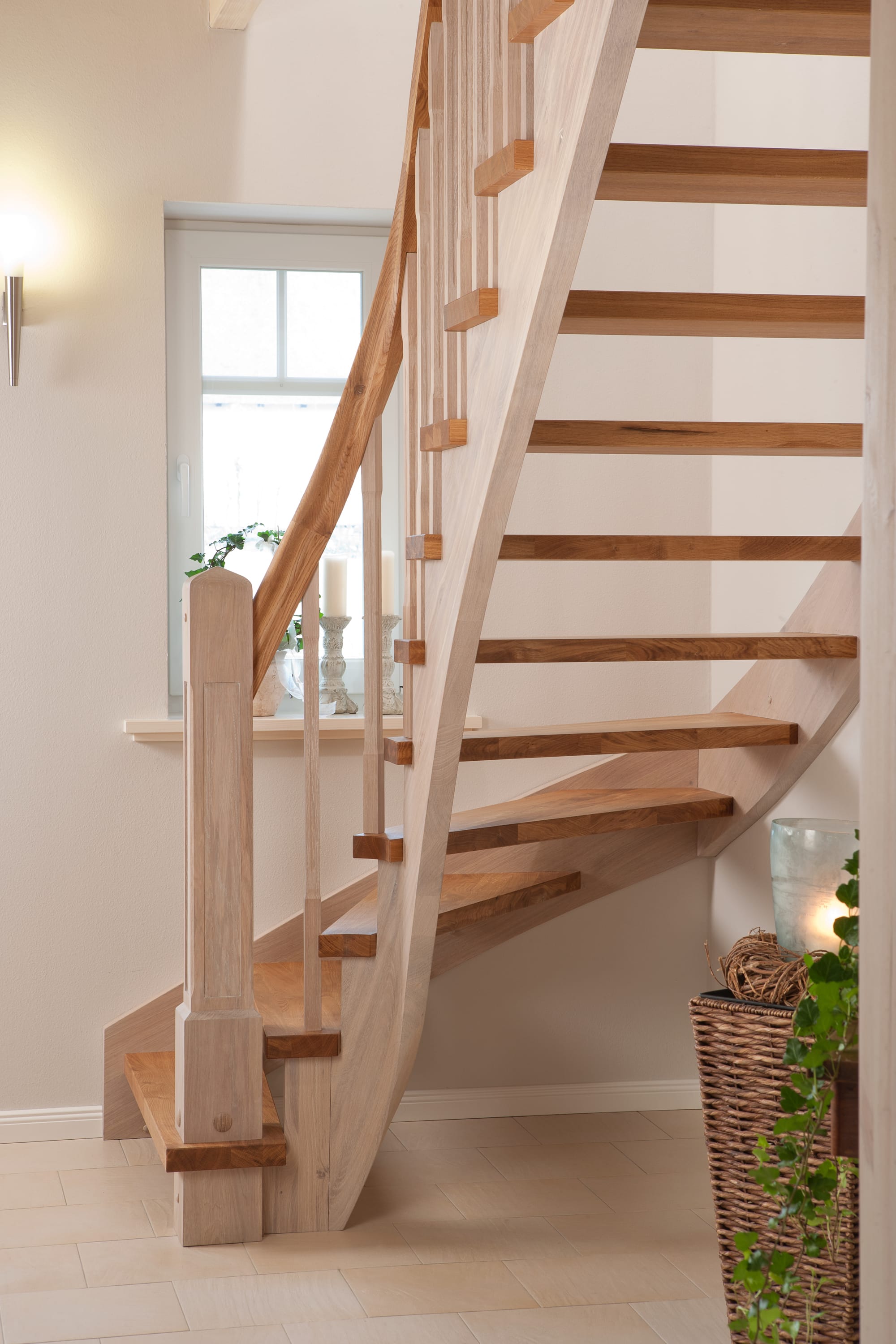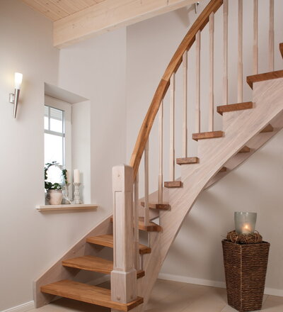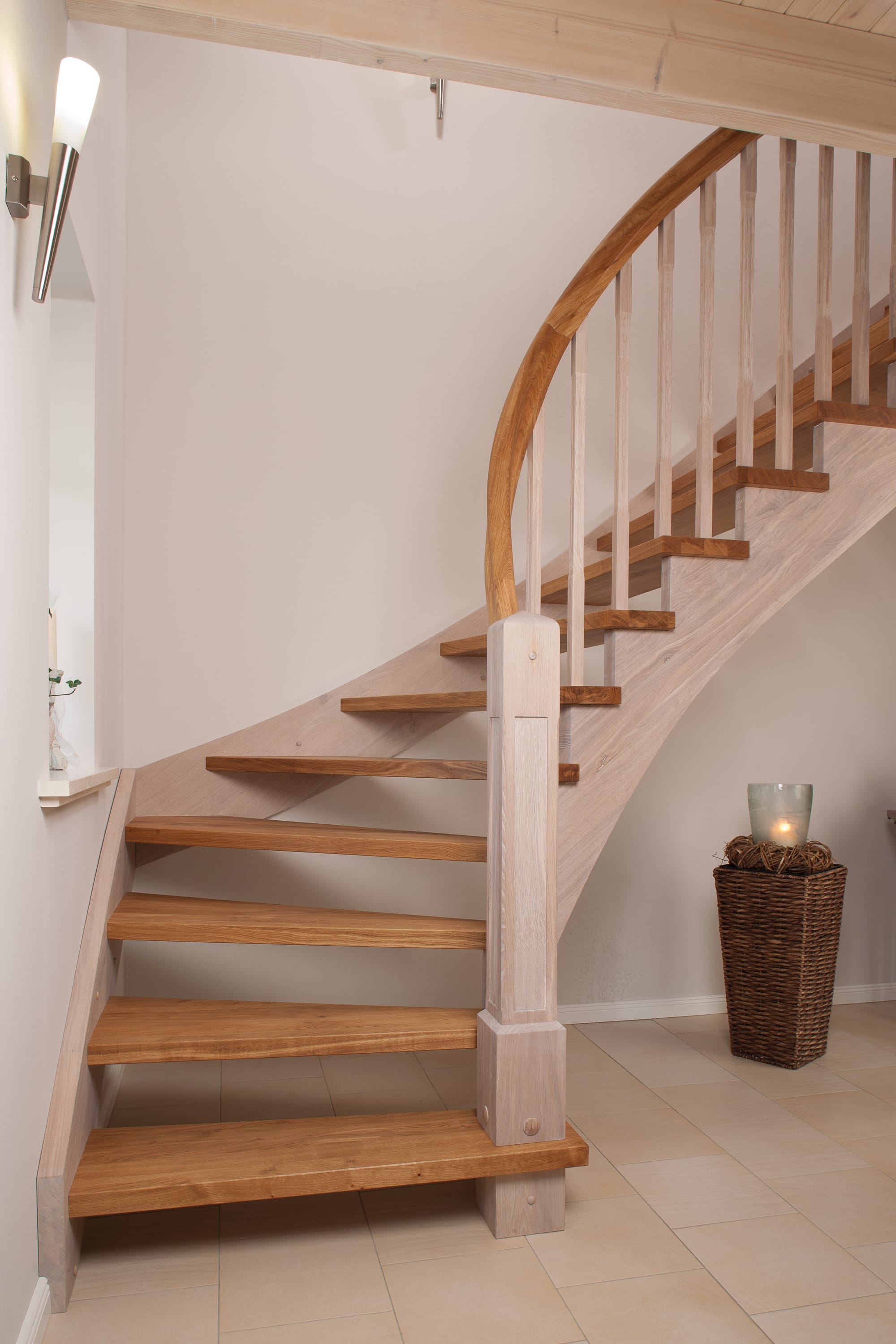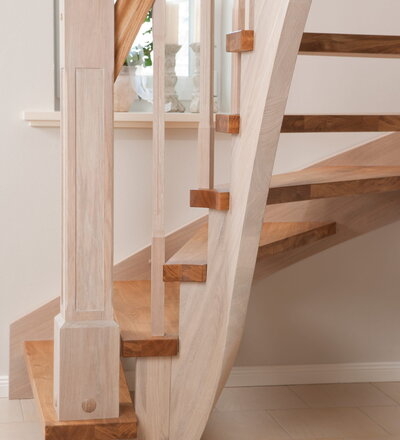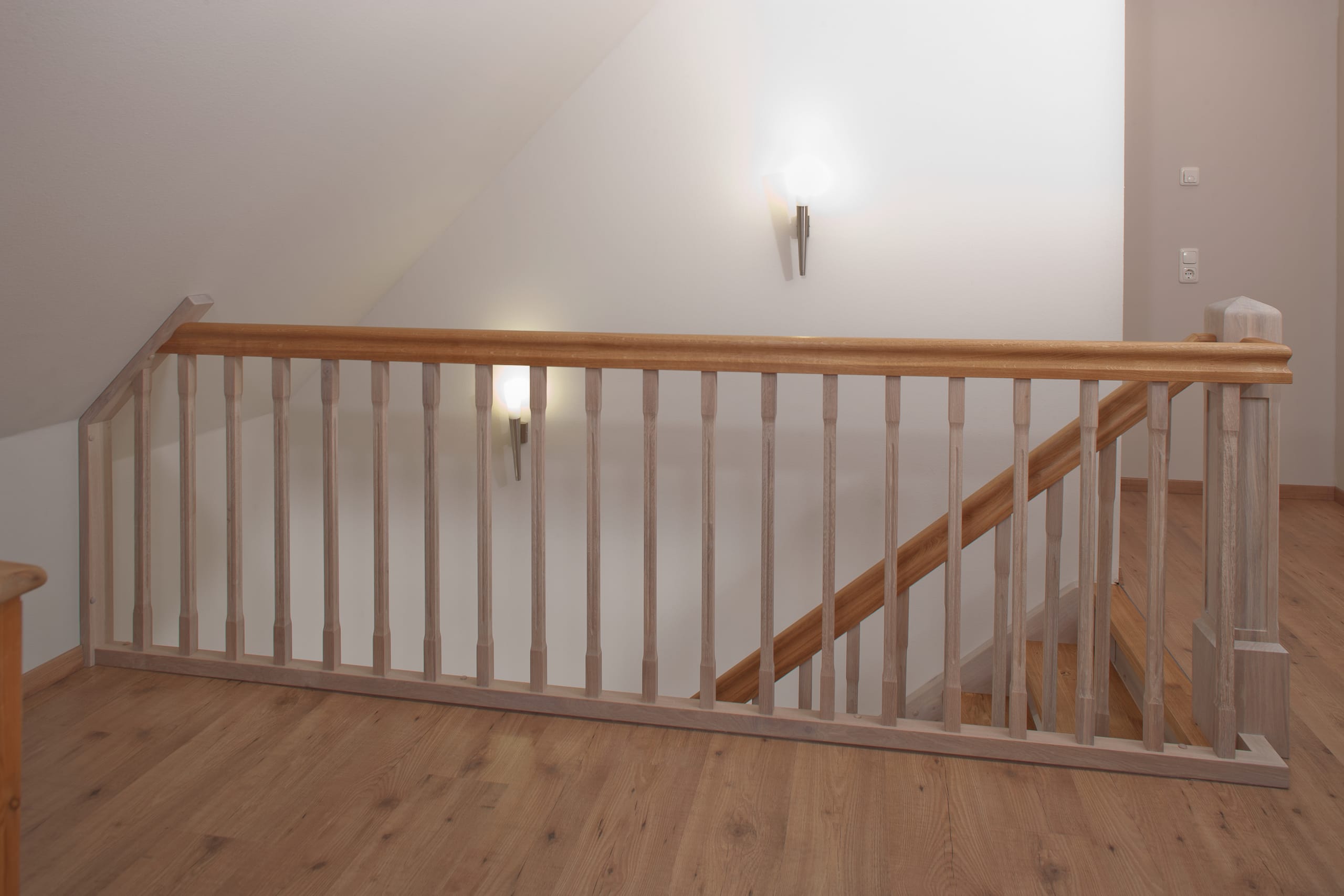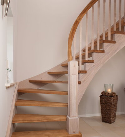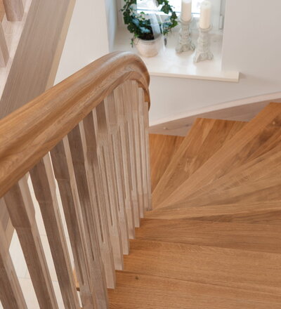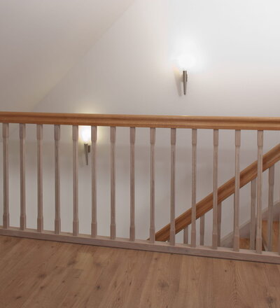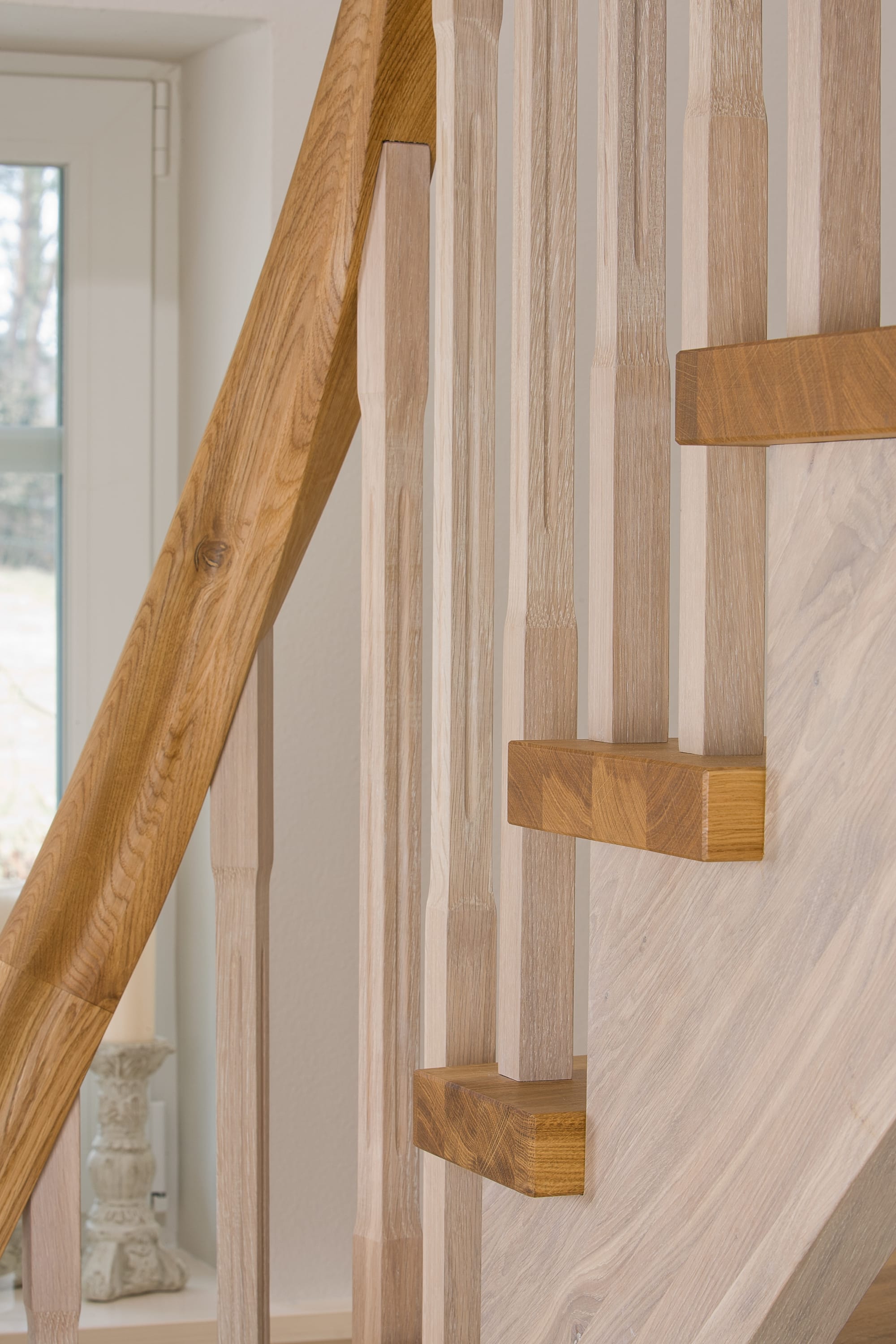Wangentreppe einseitig aufgesattelt; Holzart Eiche astig; Stufen und Handlauf geölt; Wangen, Stäbe und Pfosten weiß transparent gewachst.