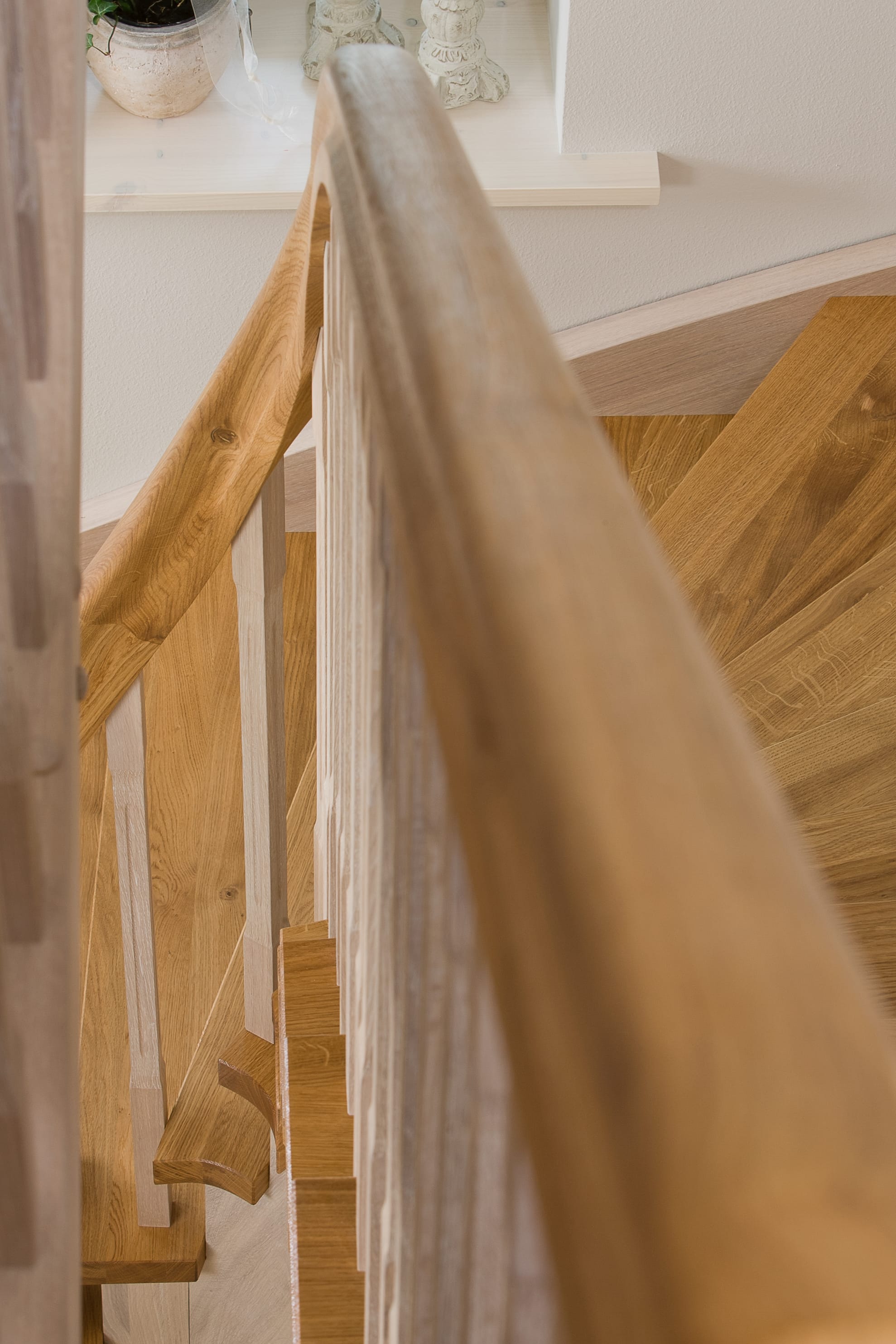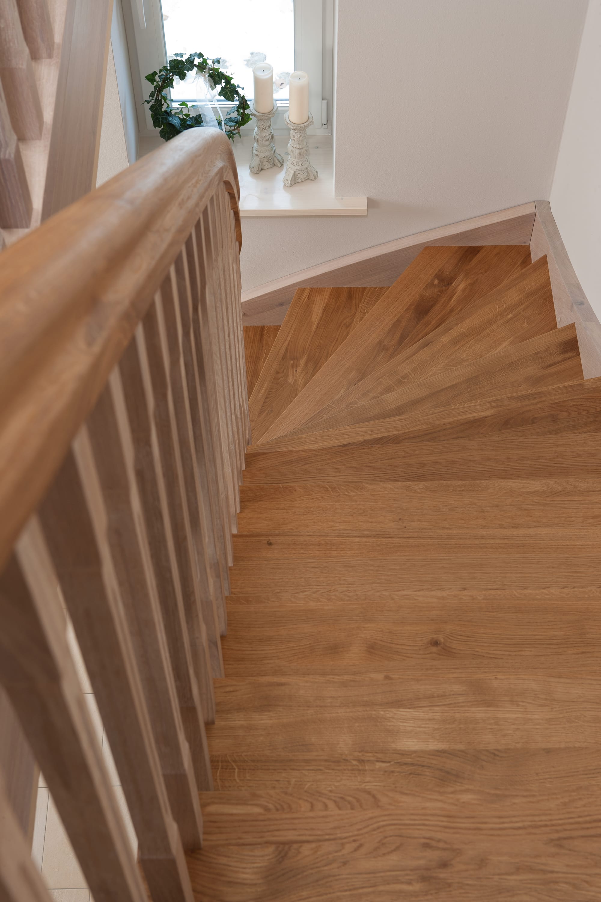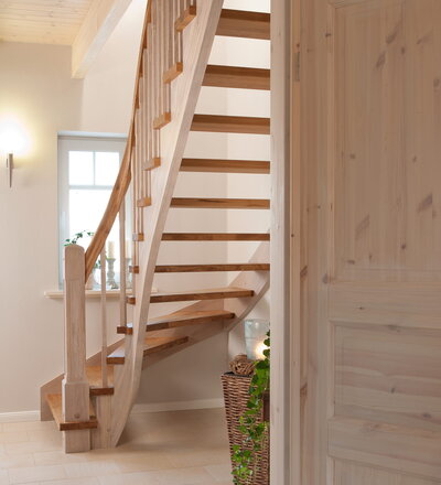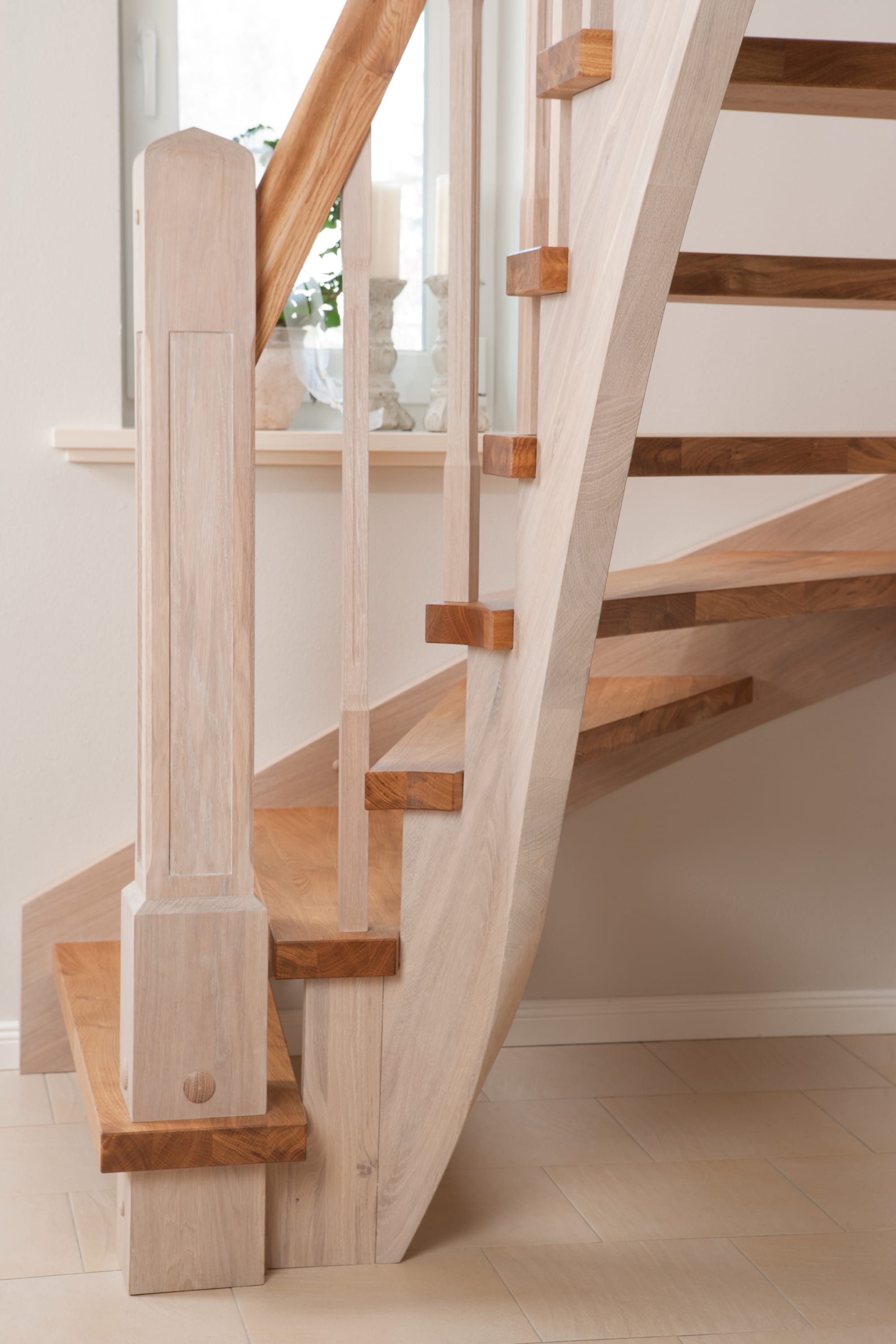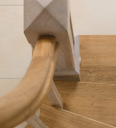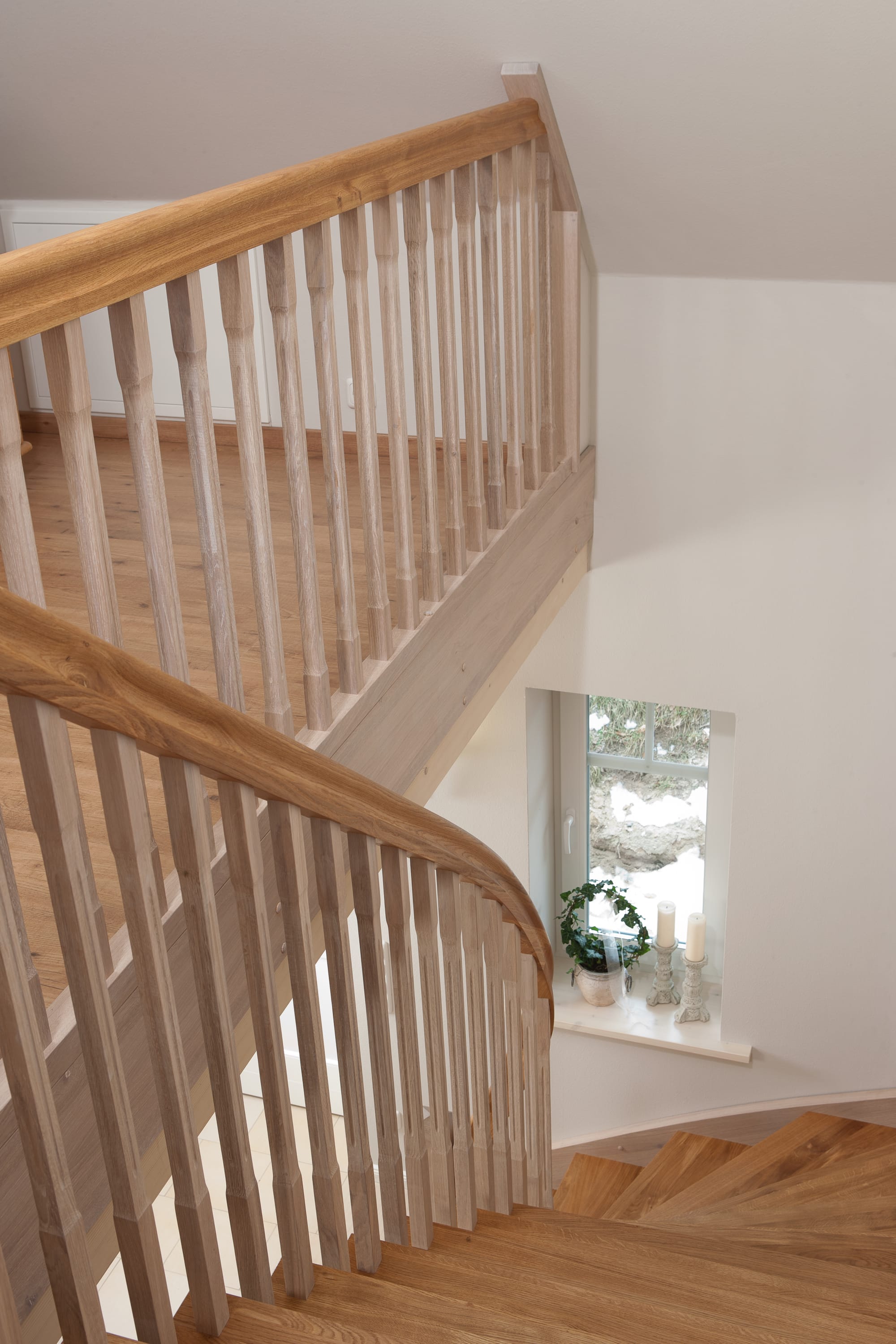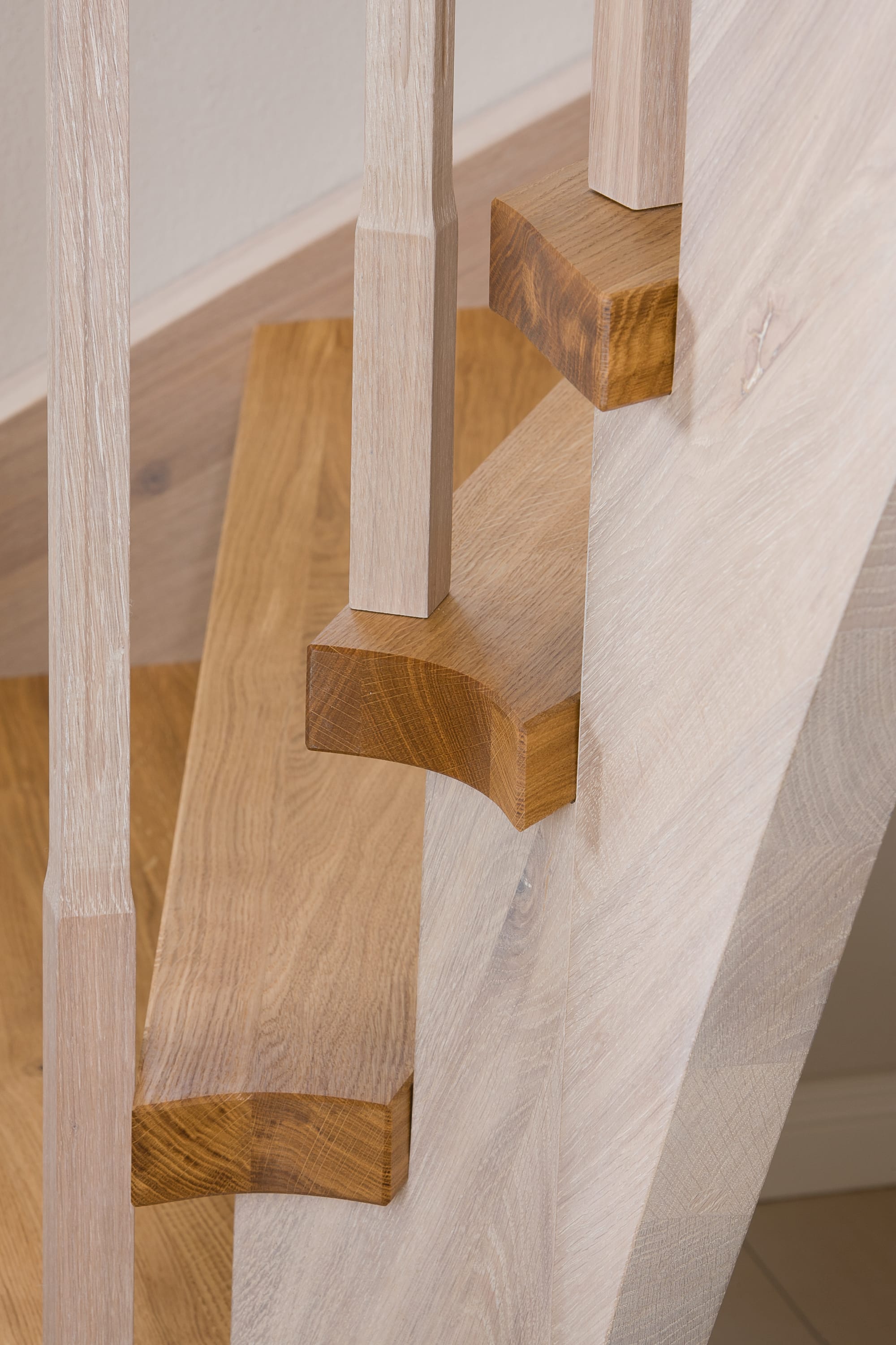 Wangentreppe einseitig aufgesattelt; Holzart Eiche astig; Stufen und Handlauf geölt; Wangen, Stäbe und Pfosten weiß transparent gewachst.