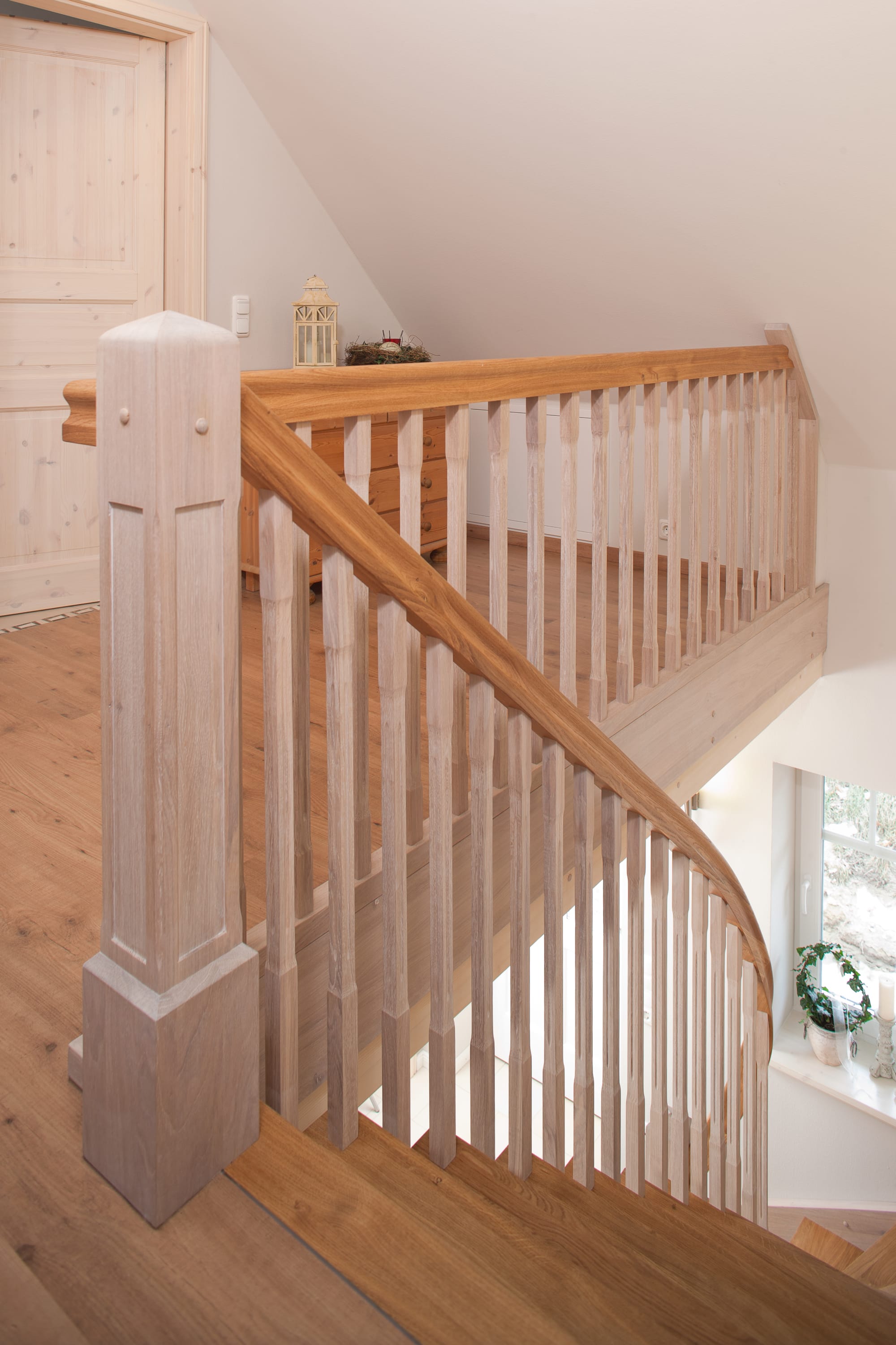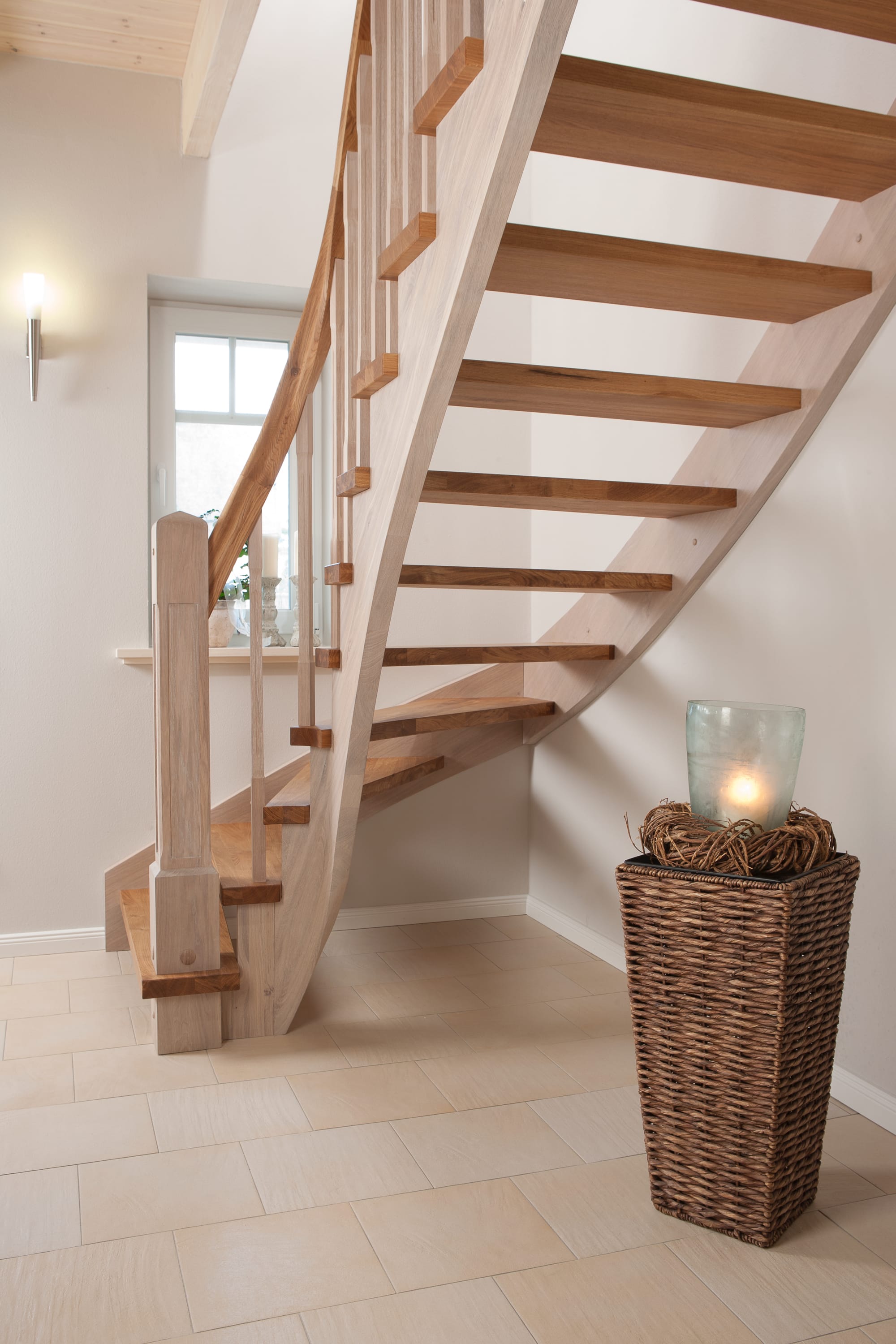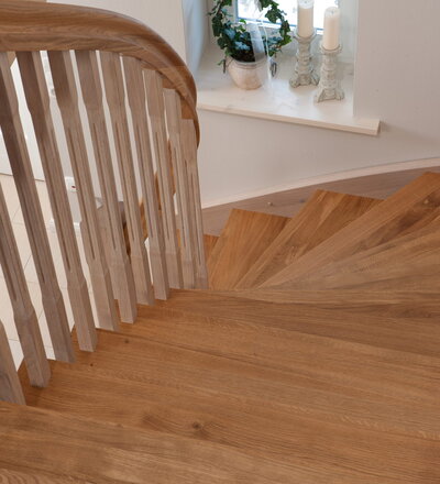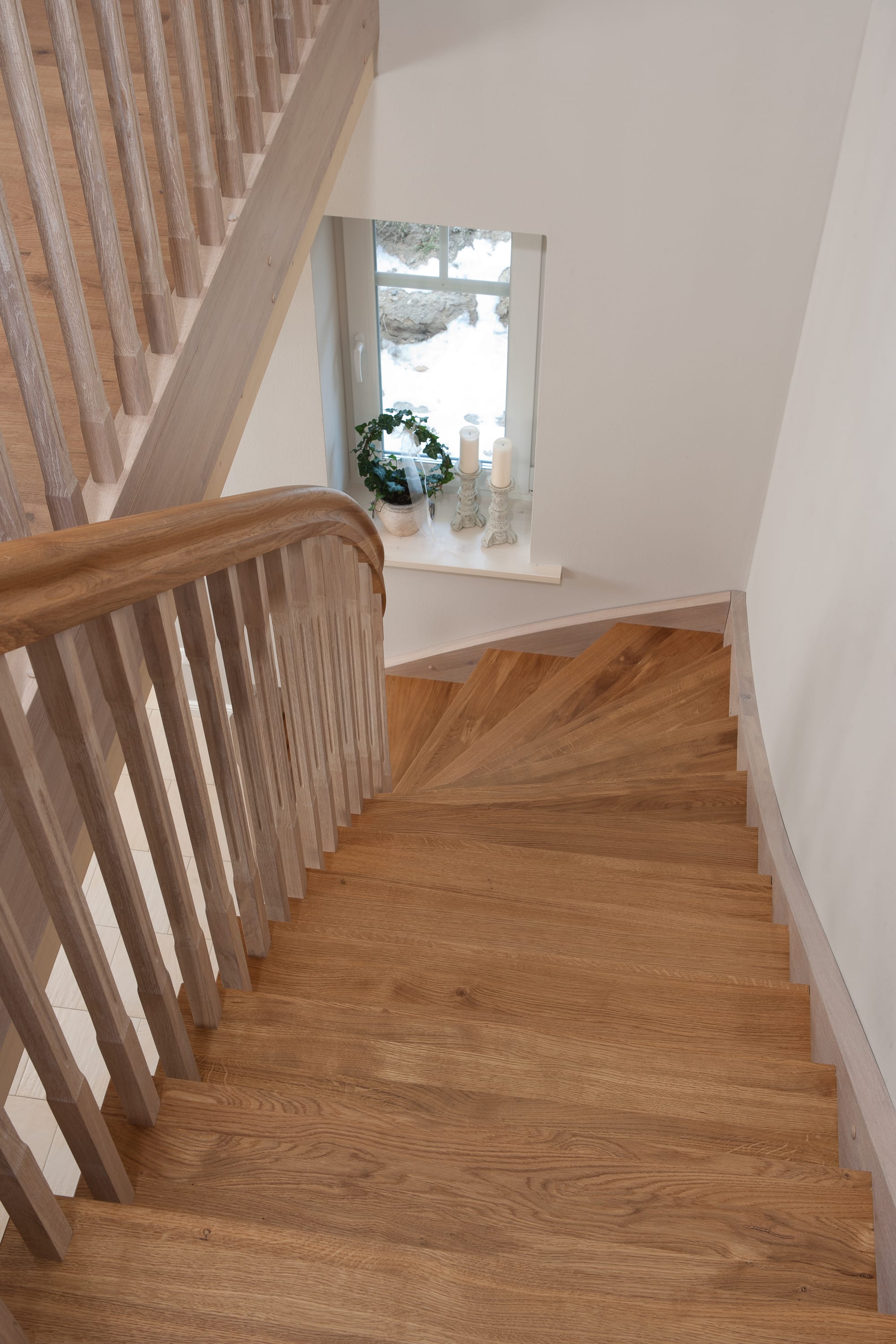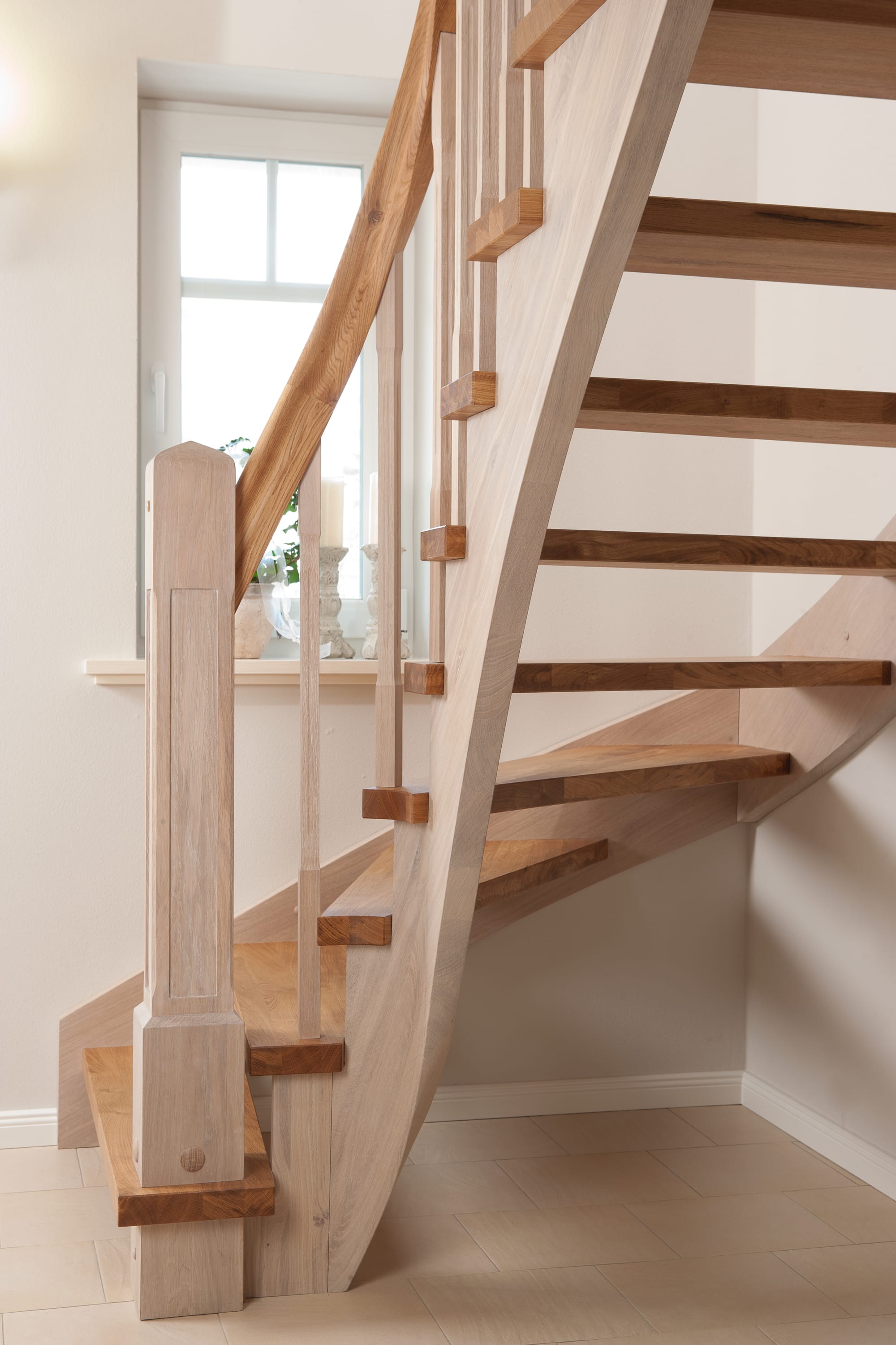 Wangentreppe einseitig aufgesattelt; Holzart Eiche astig; Stufen und Handlauf geölt; Wangen, Stäbe und Pfosten weiß transparent gewachst.