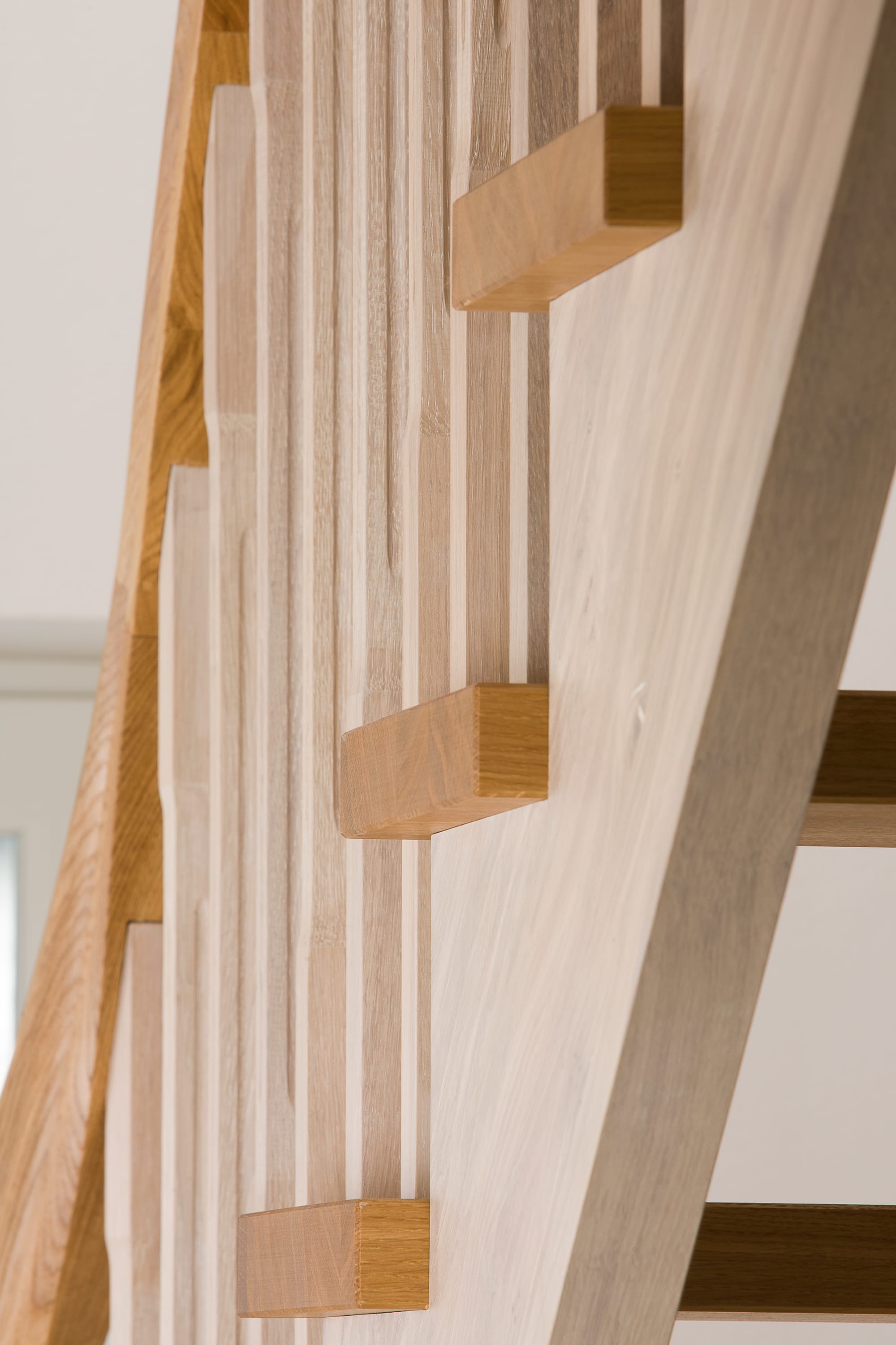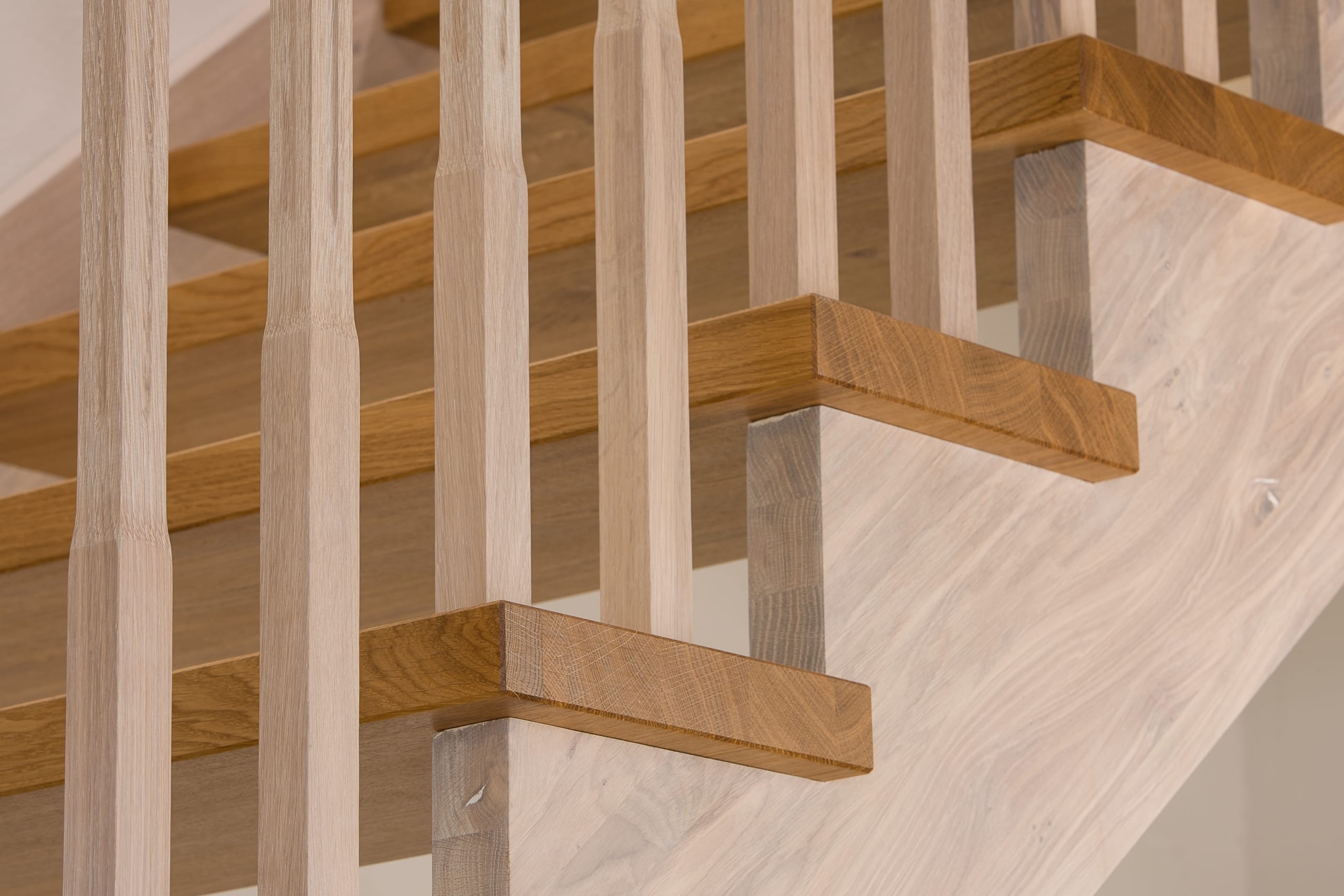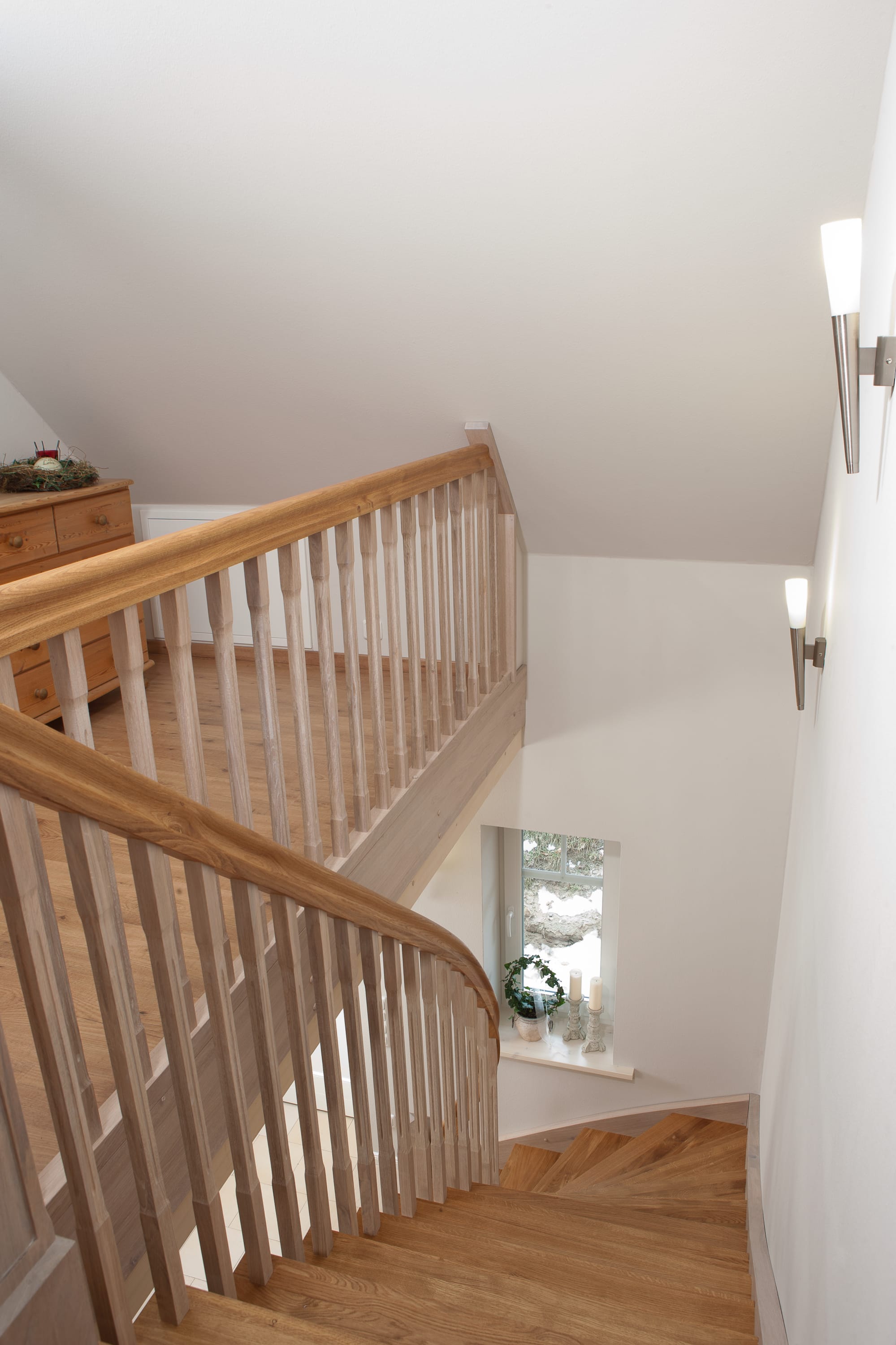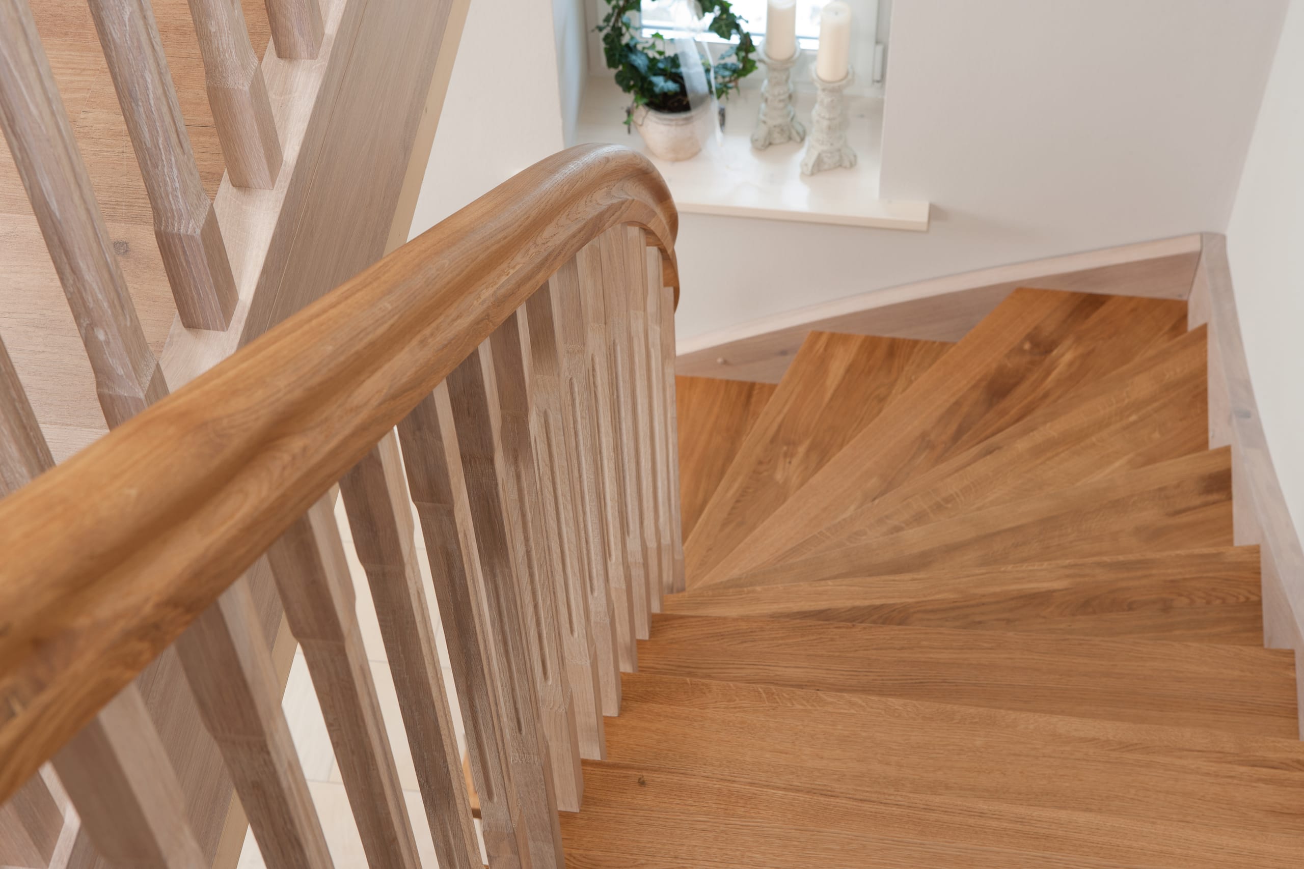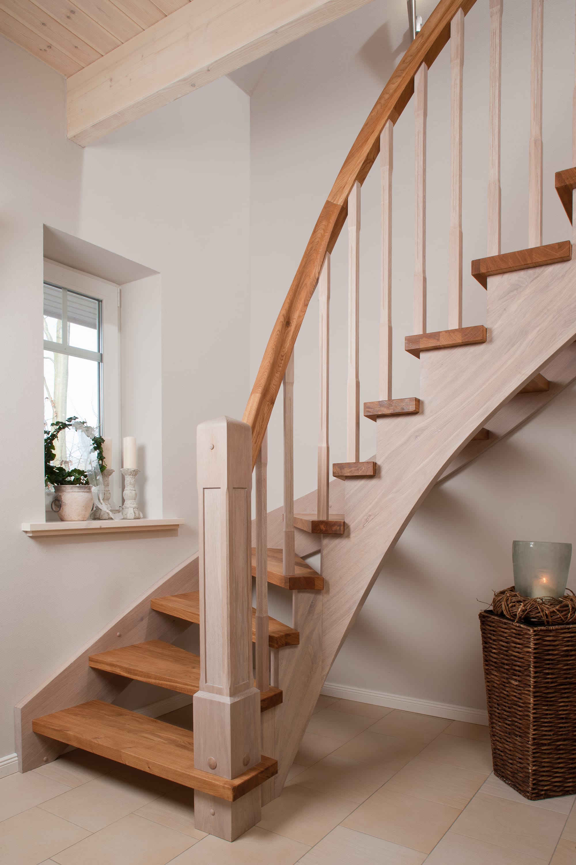 Wangentreppe einseitig aufgesattelt; Holzart Eiche astig; Stufen und Handlauf geölt; Wangen, Stäbe und Pfosten weiß transparent gewachst.