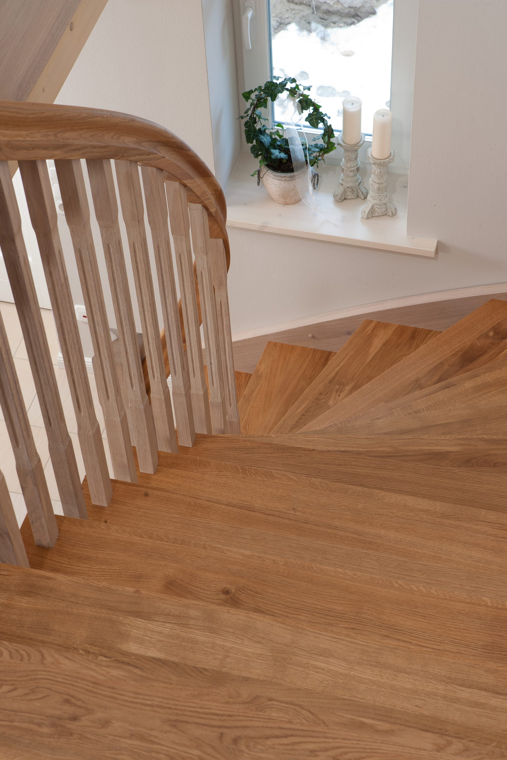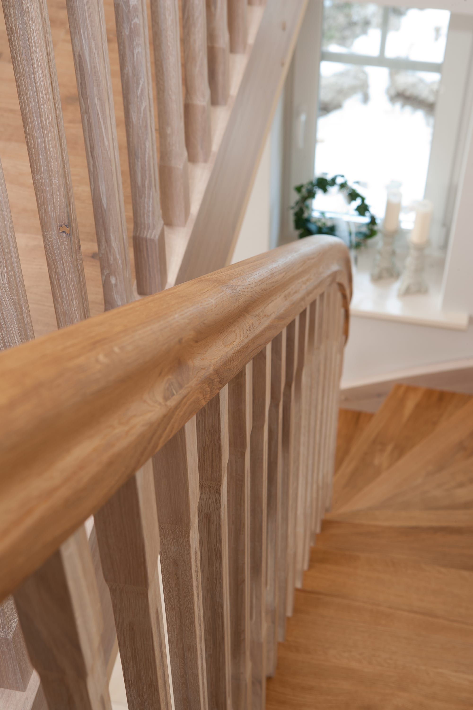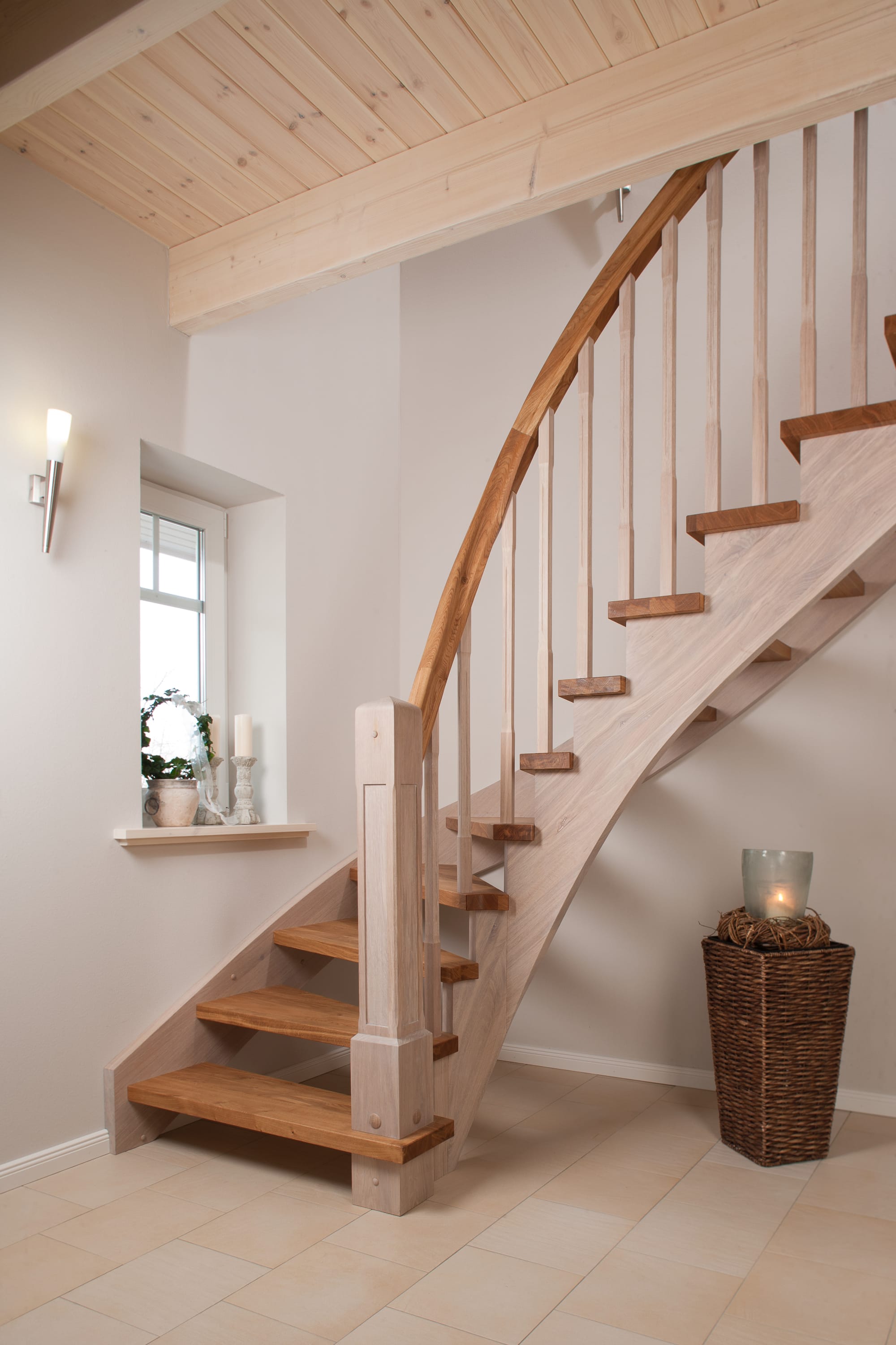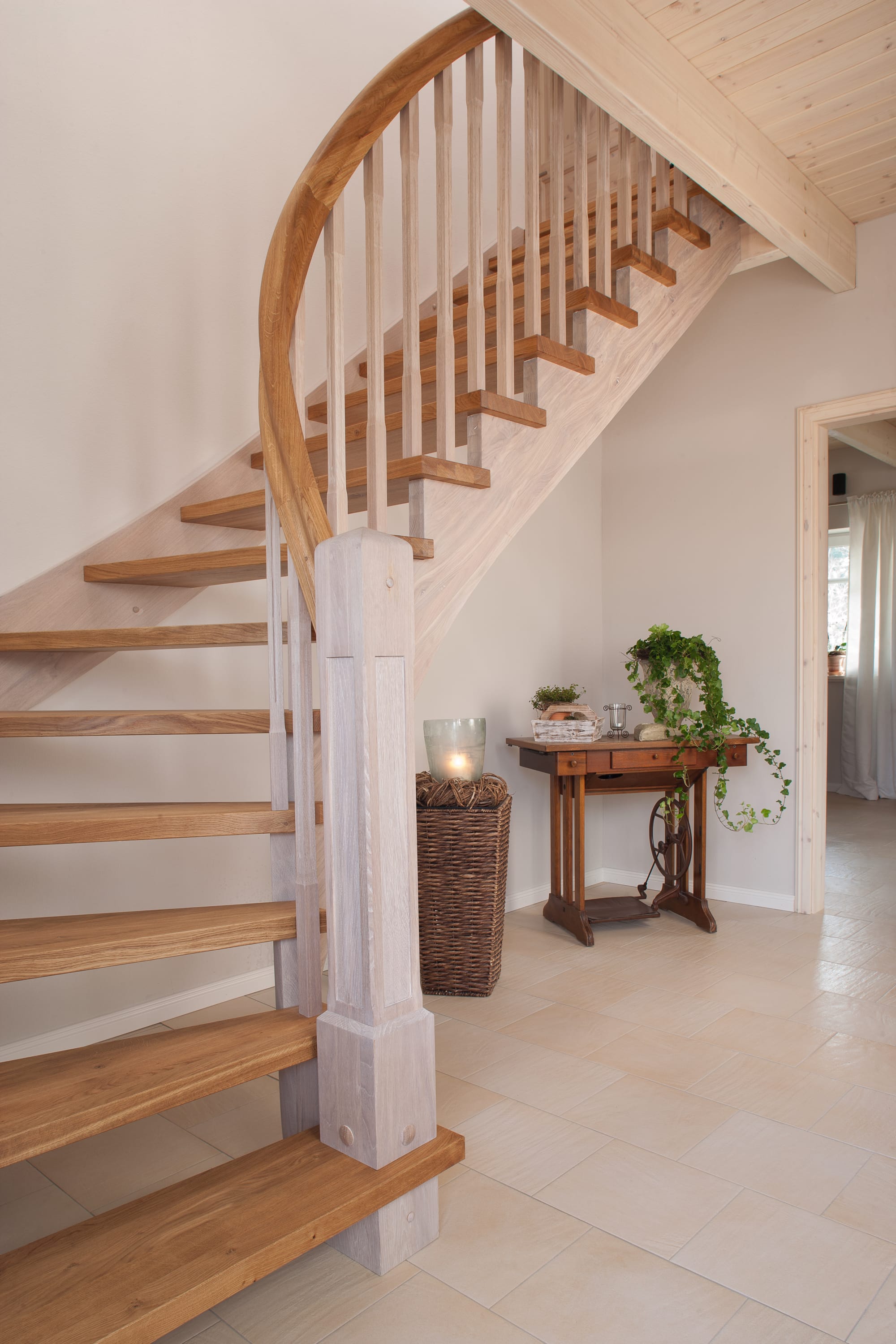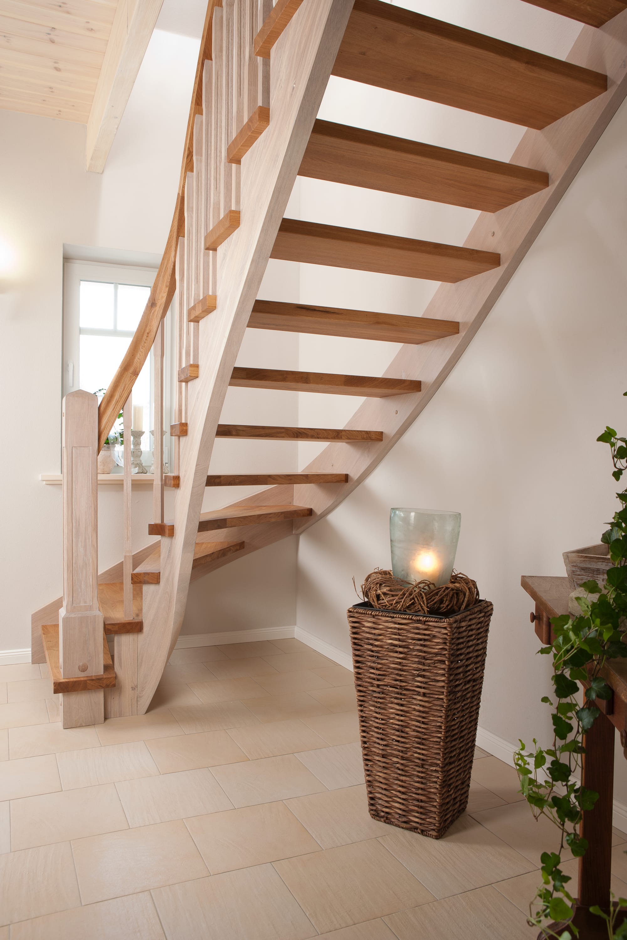 Wangentreppe einseitig aufgesattelt; Holzart Eiche astig; Stufen und Handlauf geölt; Wangen, Stäbe und Pfosten weiß transparent gewachst.