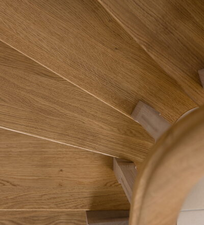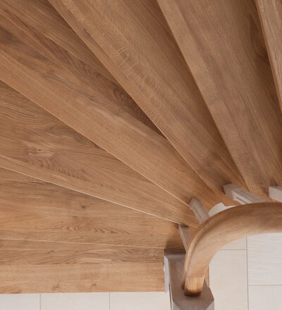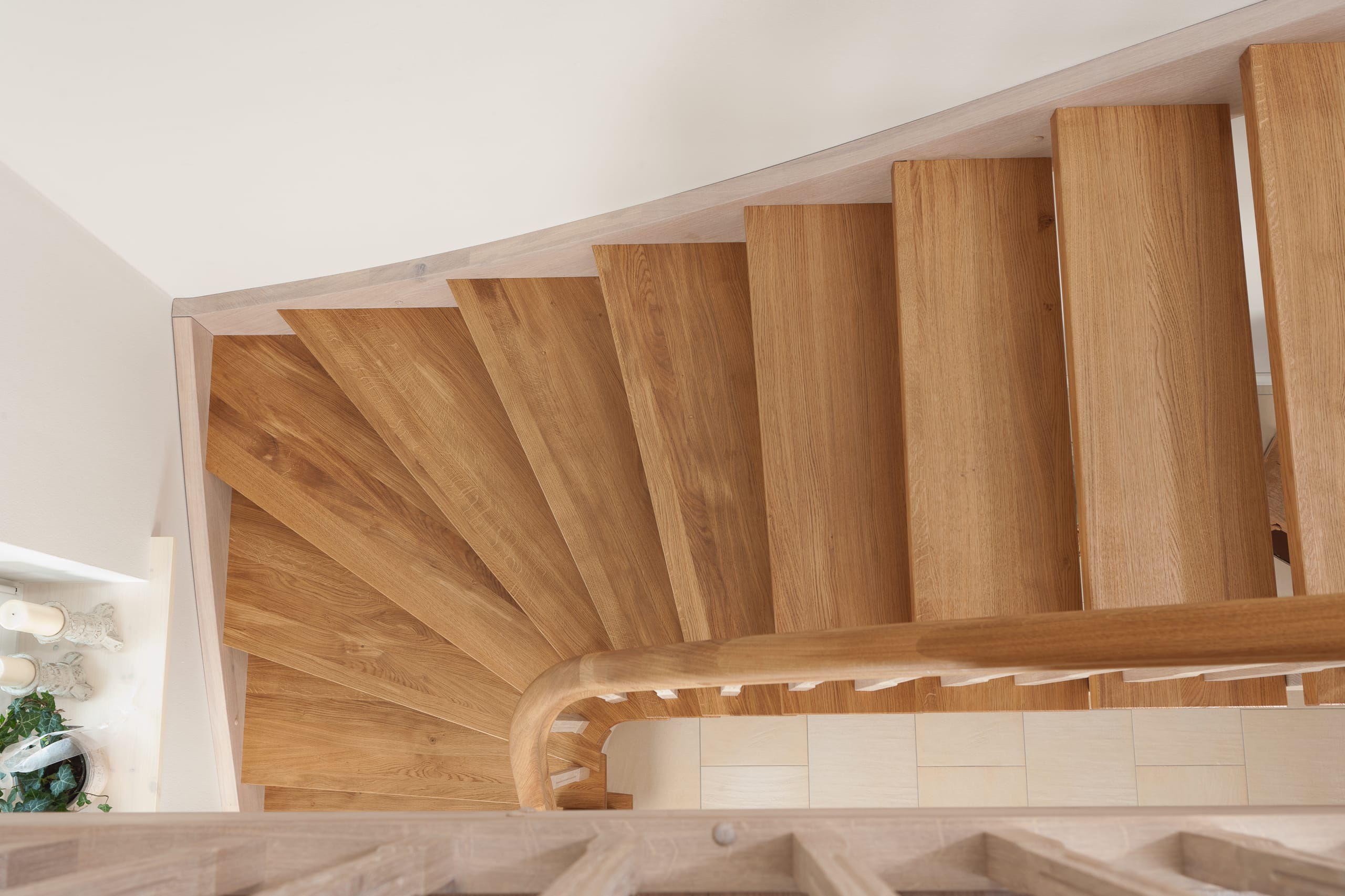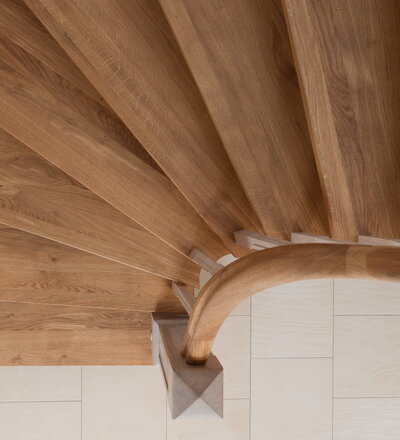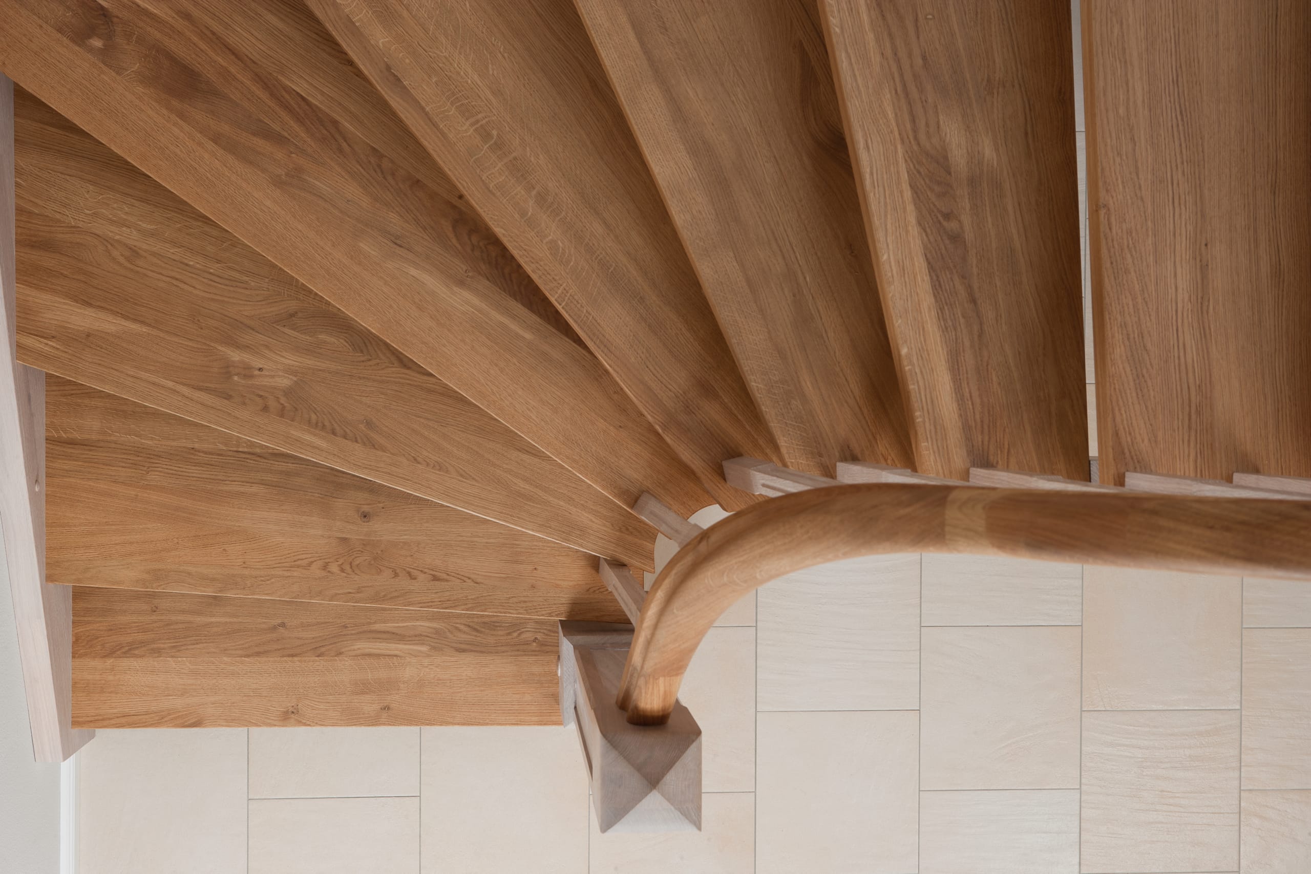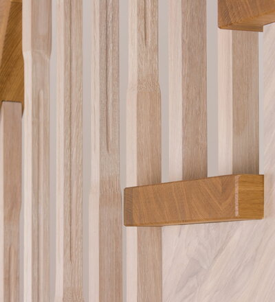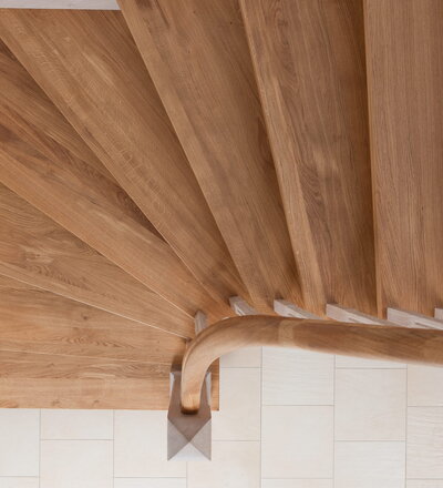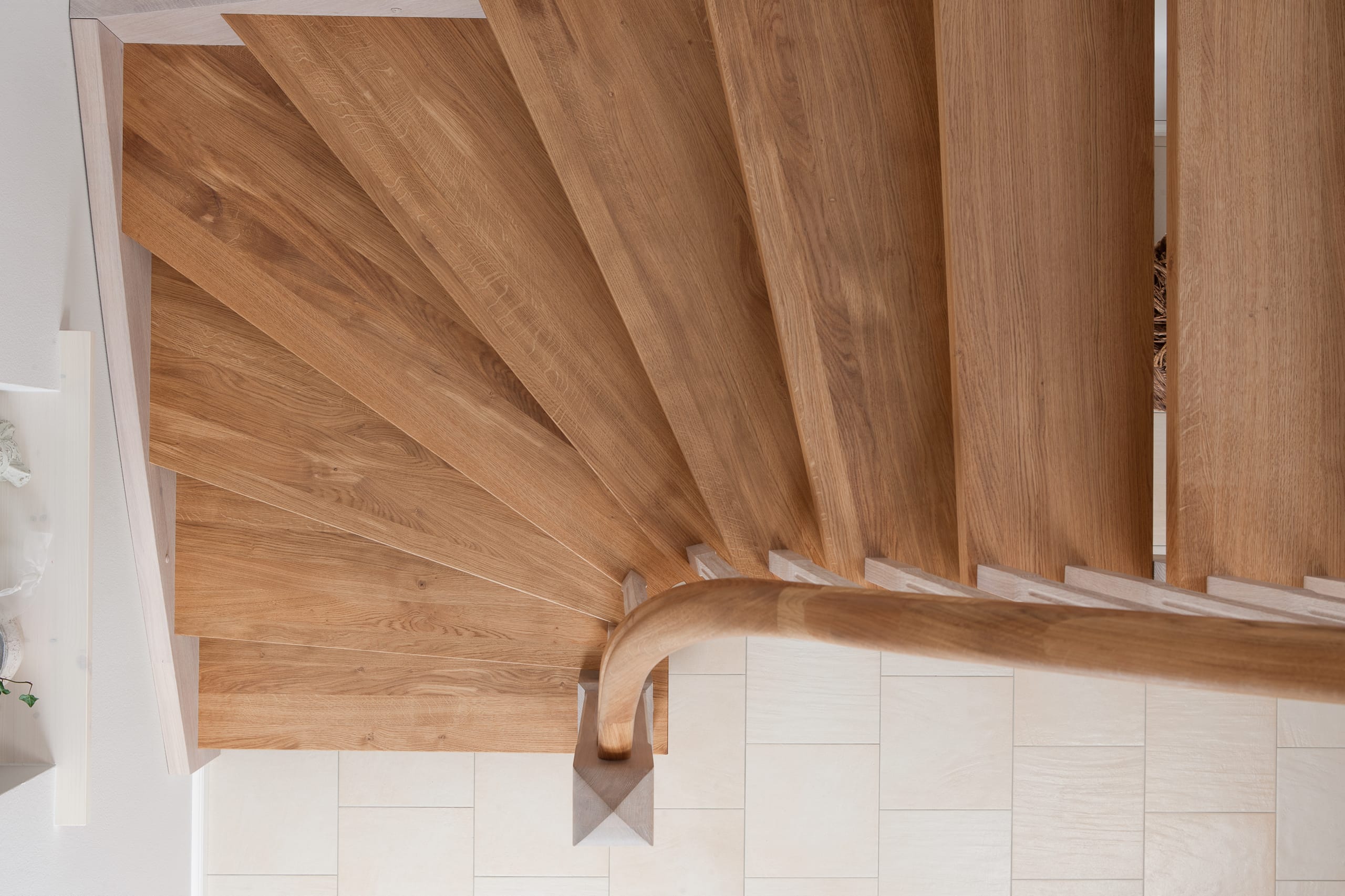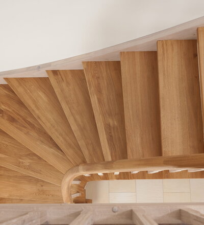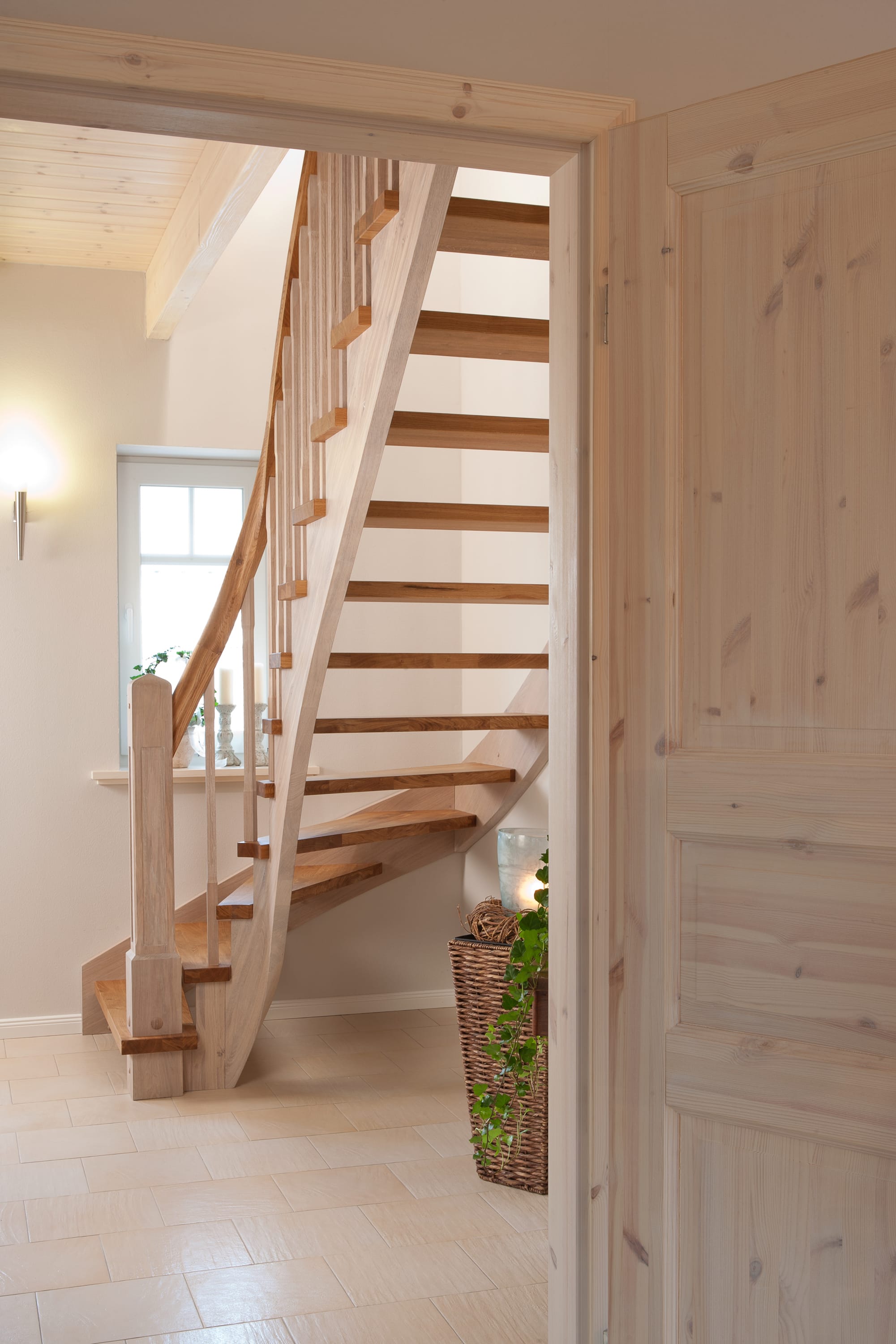 Wangentreppe einseitig aufgesattelt; Holzart Eiche astig; Stufen und Handlauf geölt; Wangen, Stäbe und Pfosten weiß transparent gewachst.