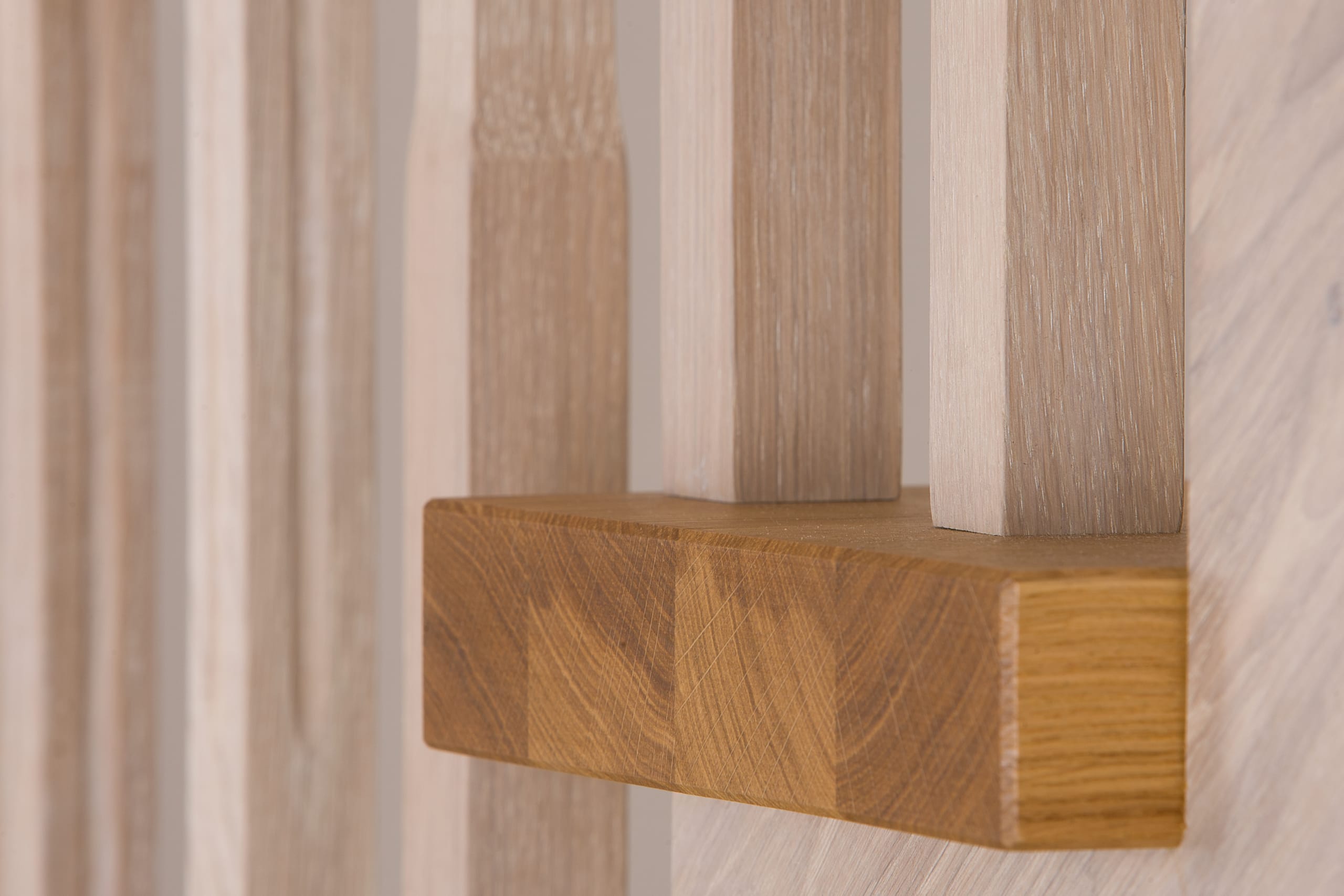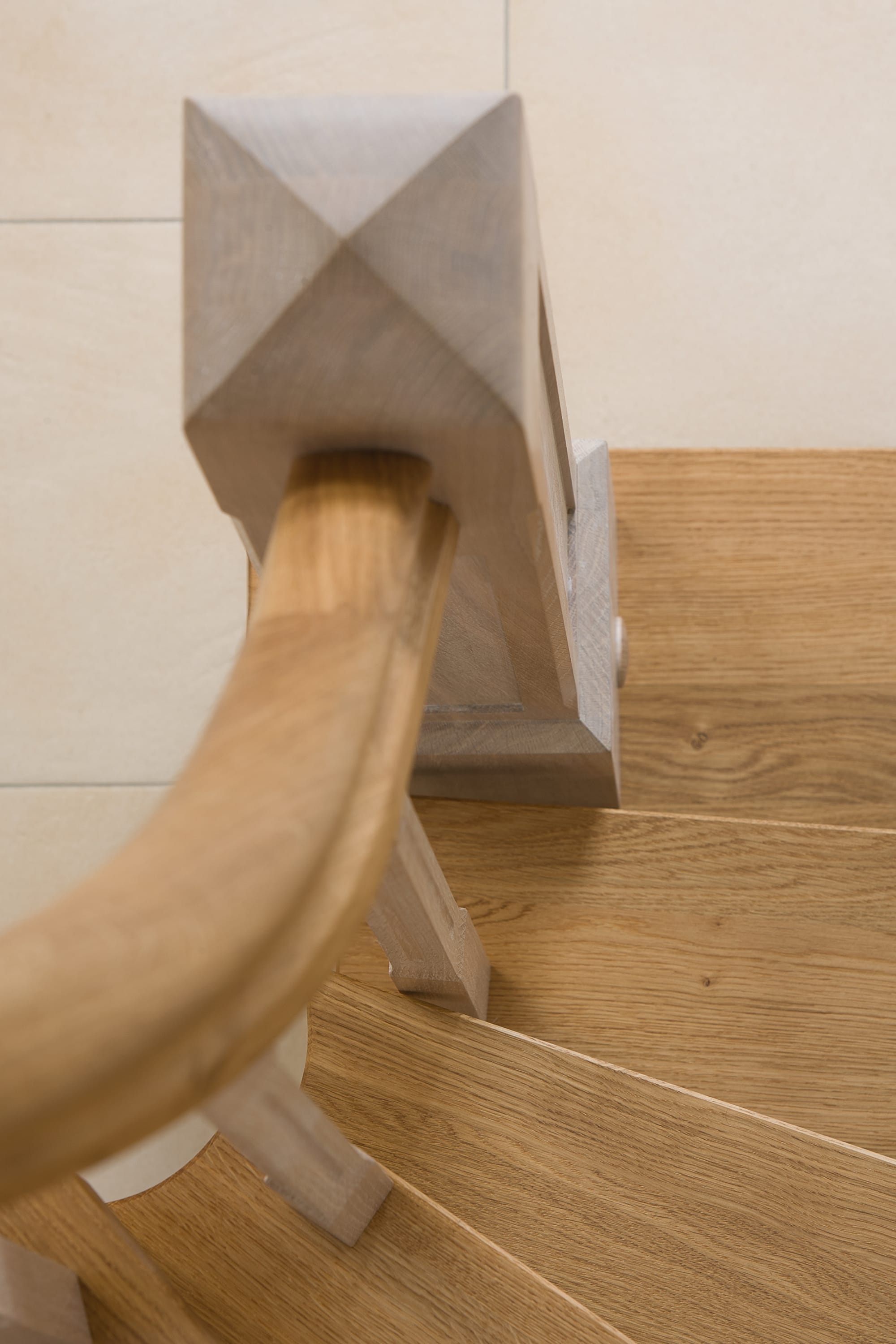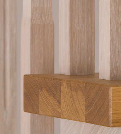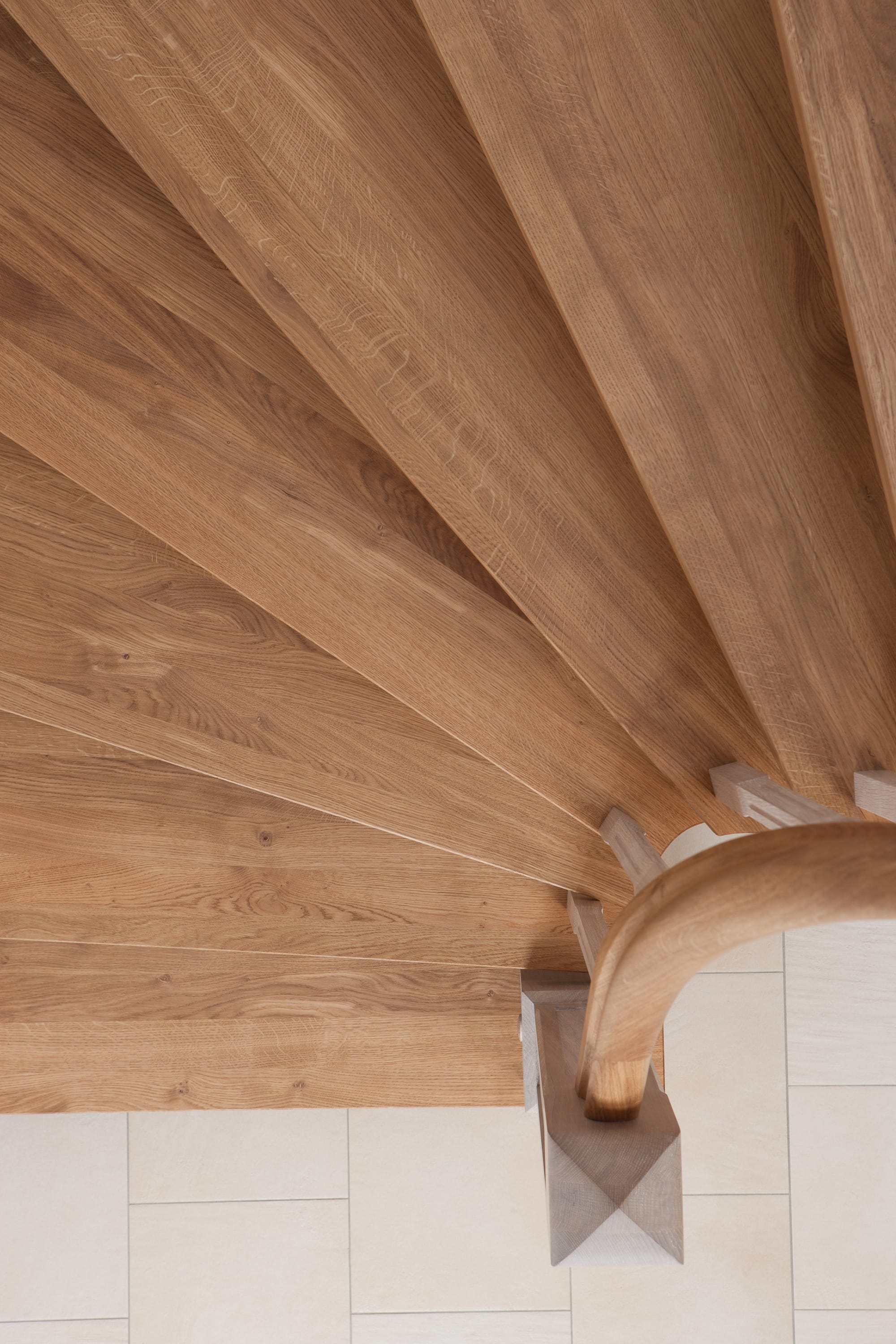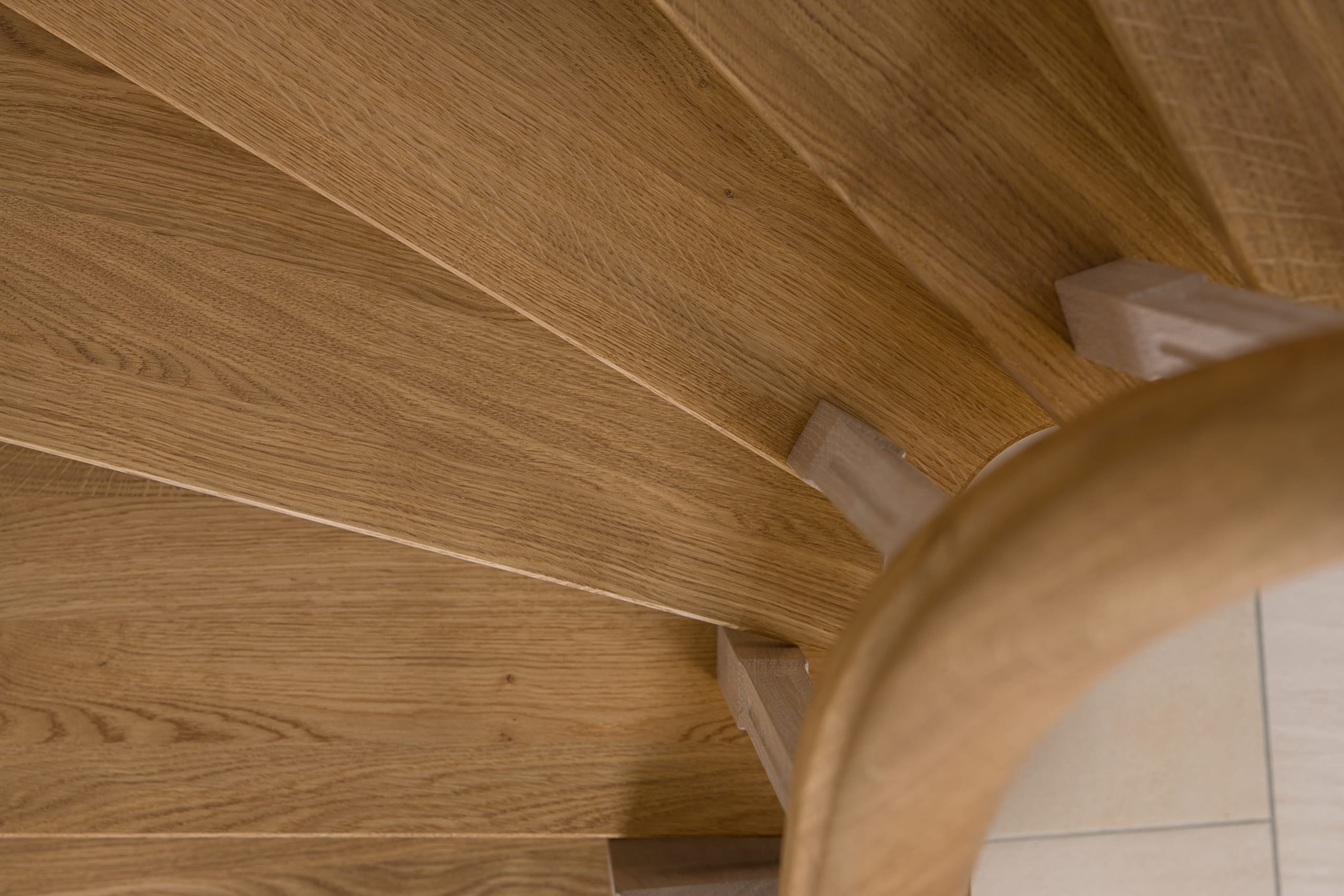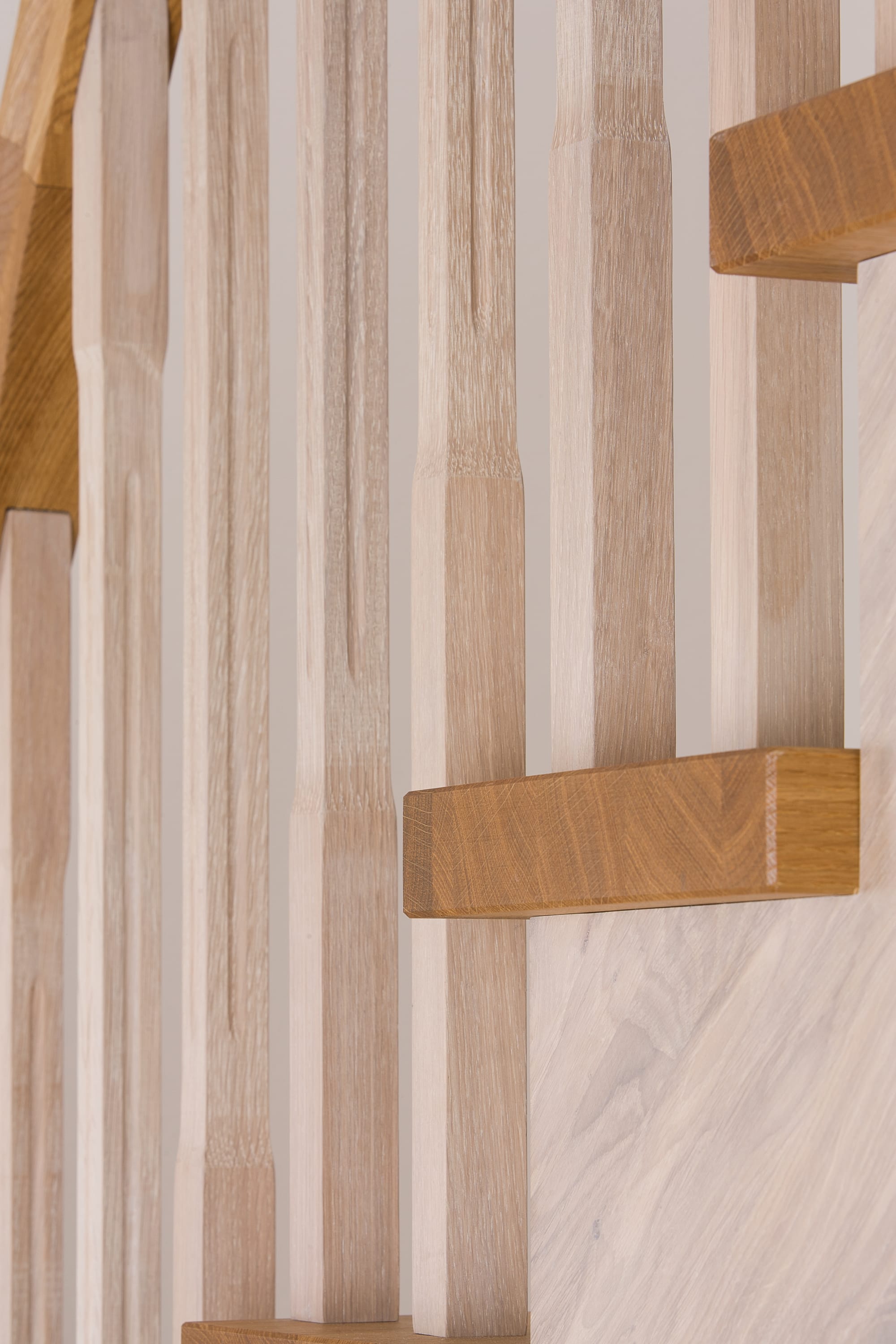 Wangentreppe einseitig aufgesattelt; Holzart Eiche astig; Stufen und Handlauf geölt; Wangen, Stäbe und Pfosten weiß transparent gewachst.