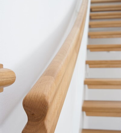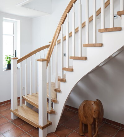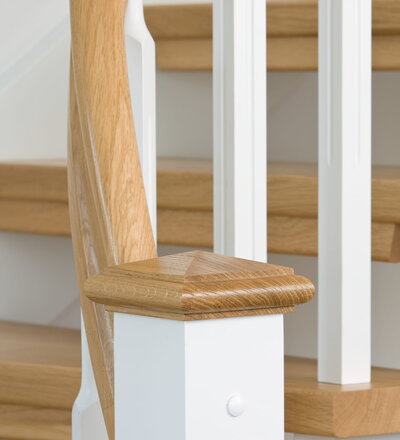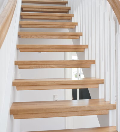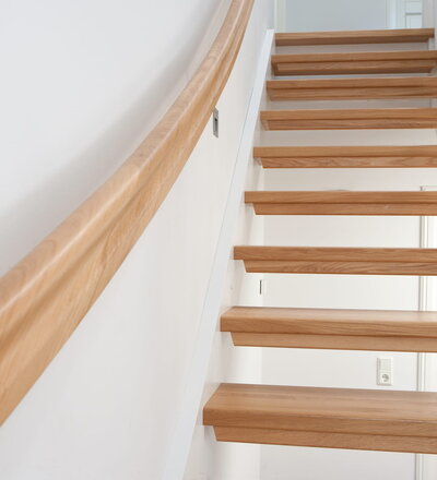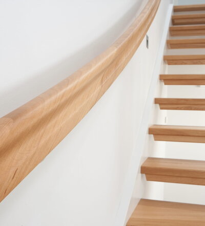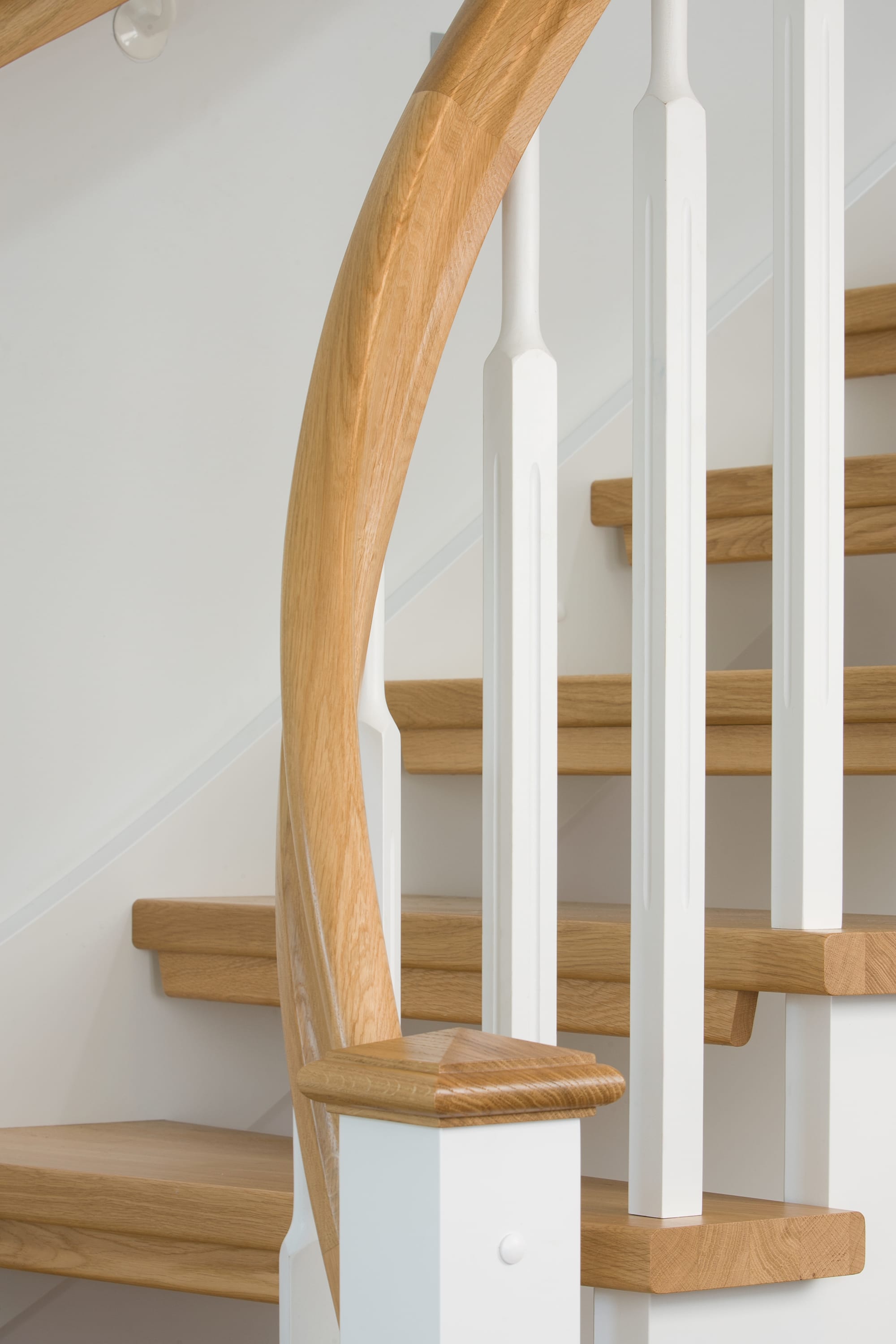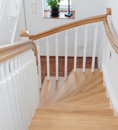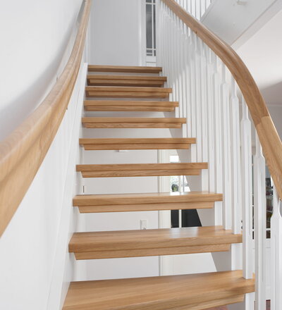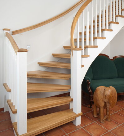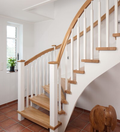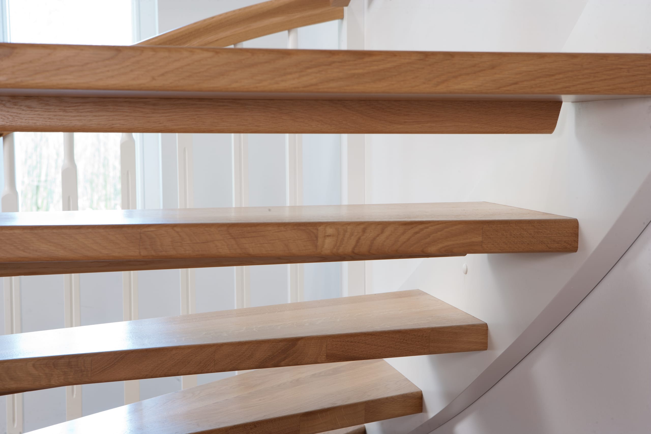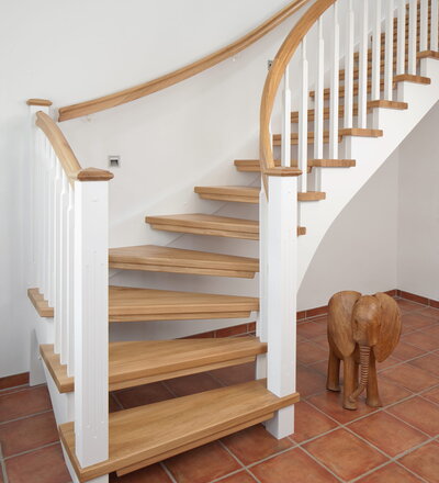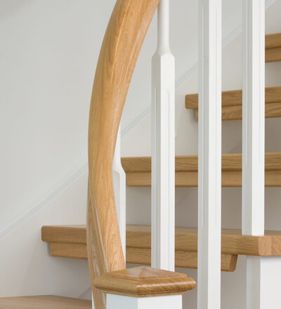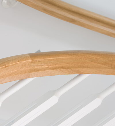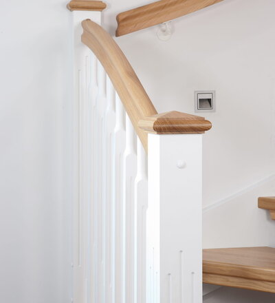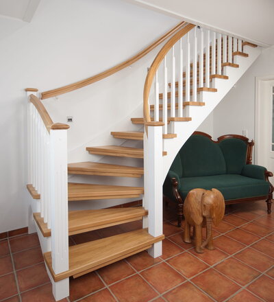 1/4 gewendelte, freiseitig aufgesattelt und wandseitig eingestemmte offene Wangentreppe, Stufen und Handlauf Holzart Eiche, Stäbe, Pfosten und Wange Whitewood weiß endlackiert.