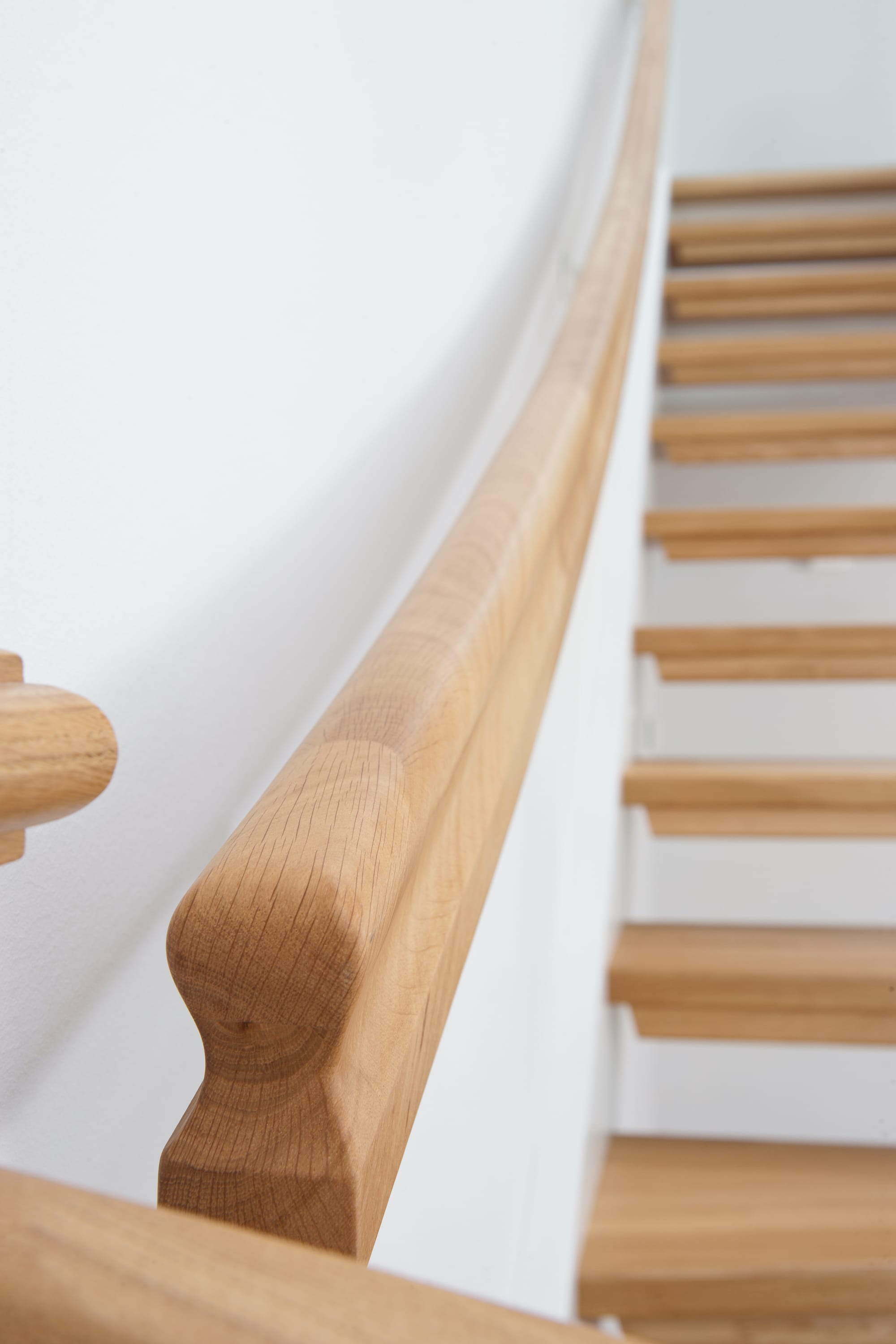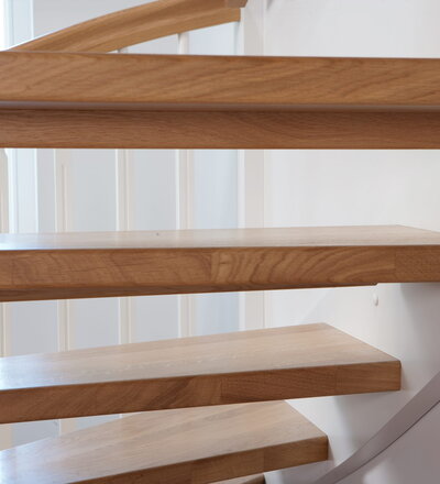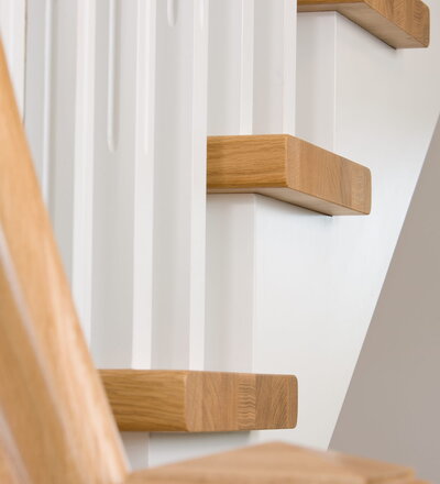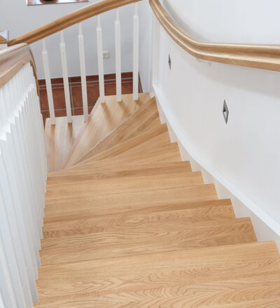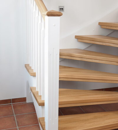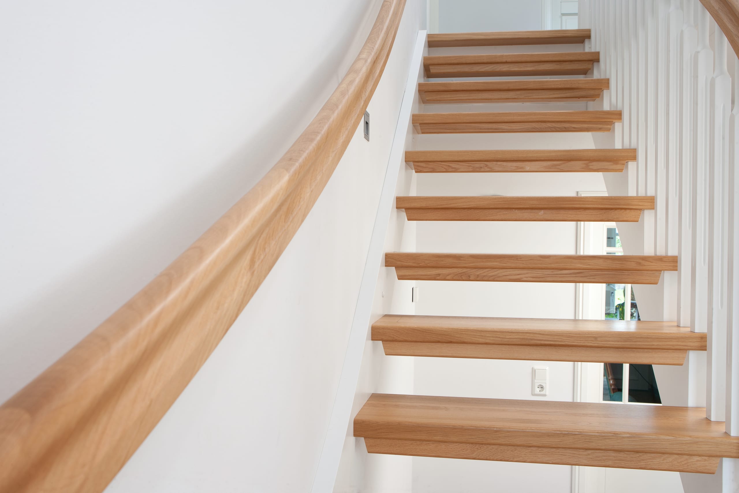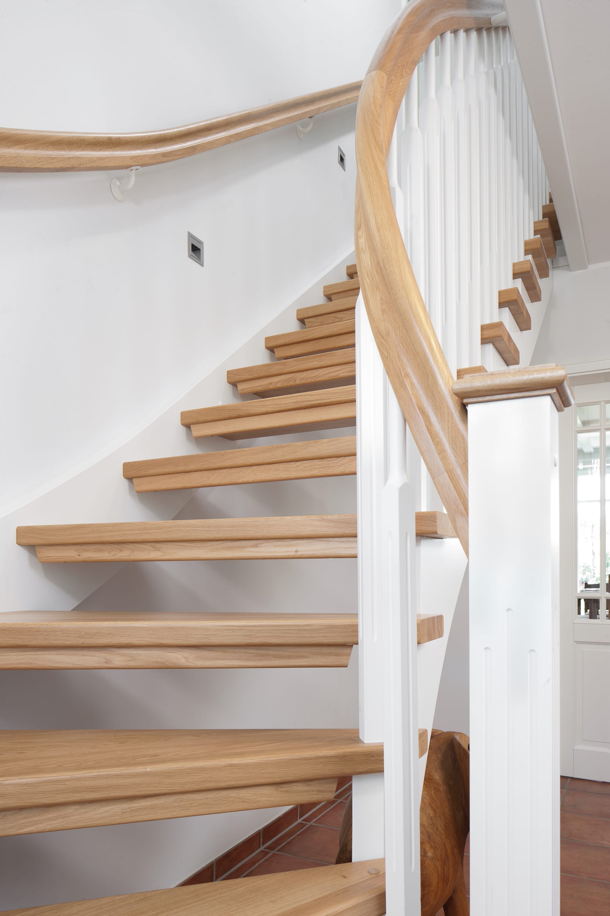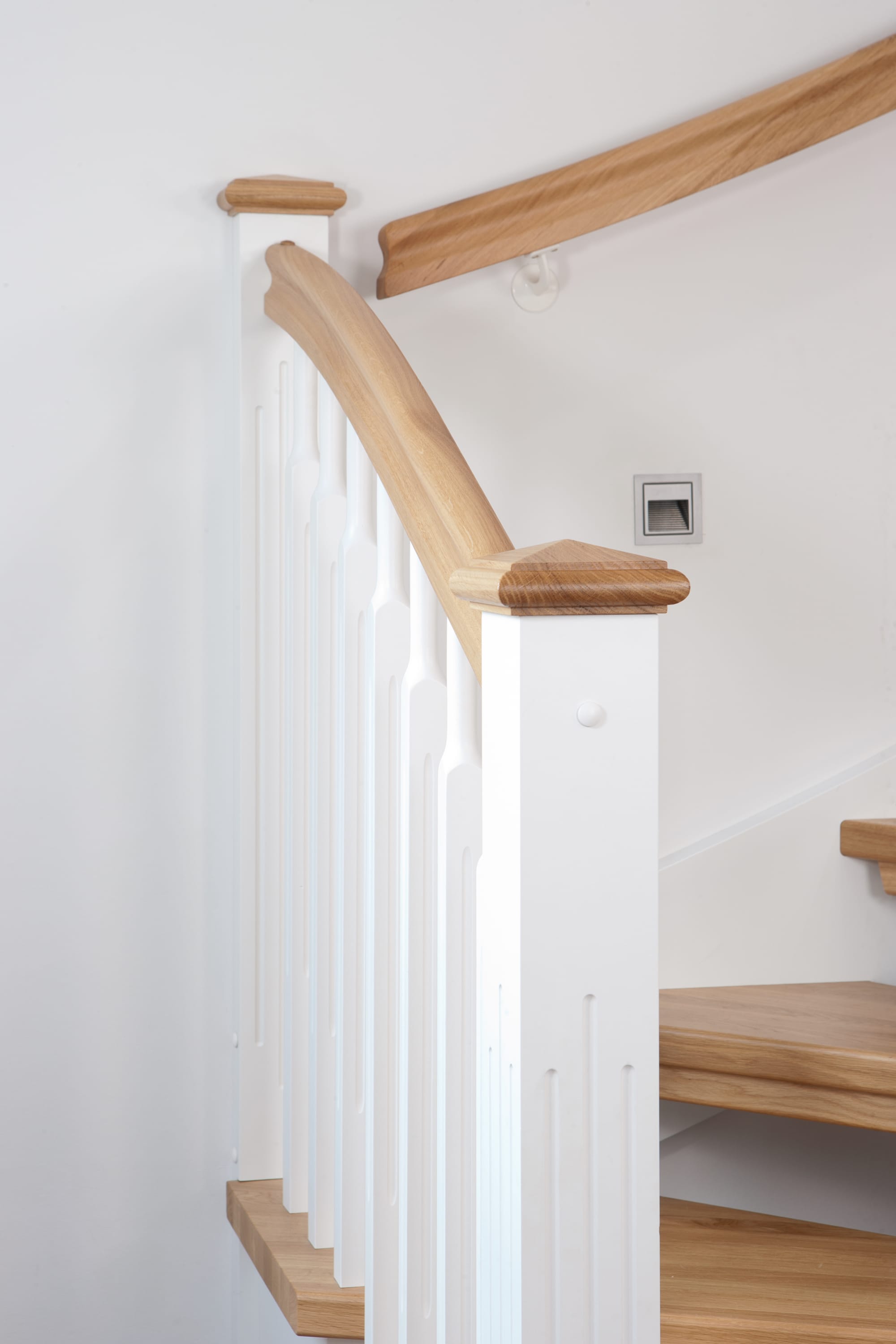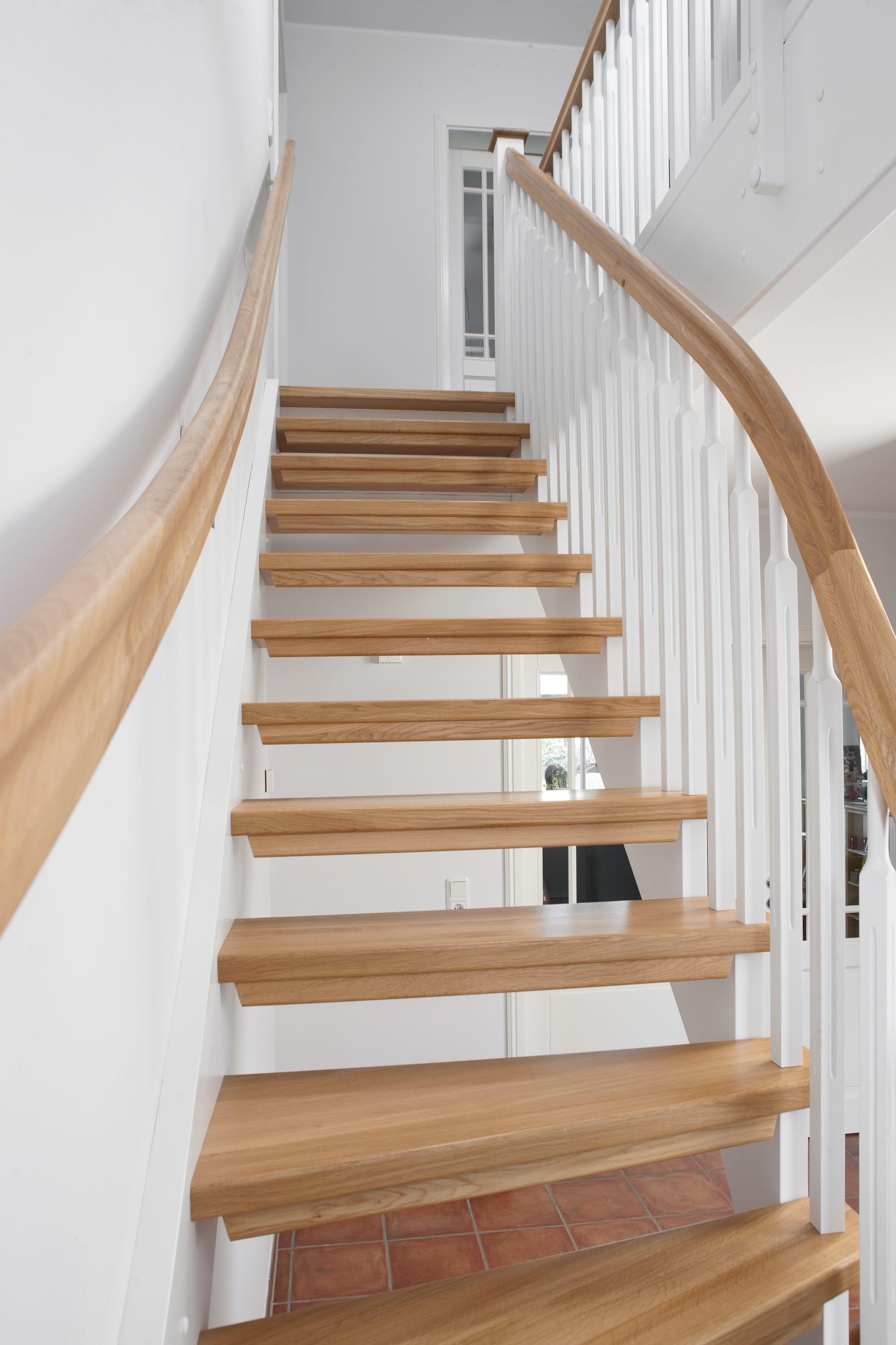 1/4 gewendelte, freiseitig aufgesattelt und wandseitig eingestemmte offene Wangentreppe, Stufen und Handlauf Holzart Eiche, Stäbe, Pfosten und Wange Whitewood weiß endlackiert.