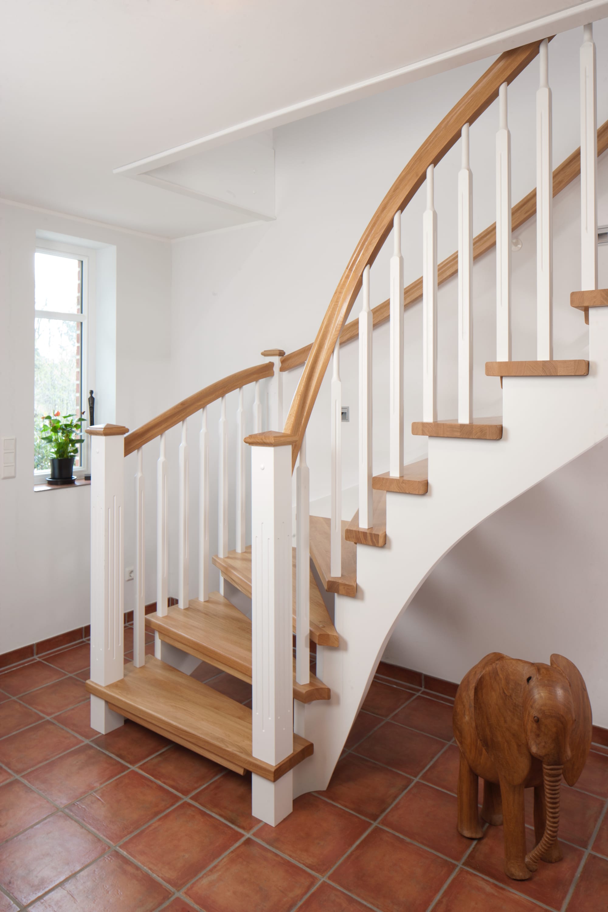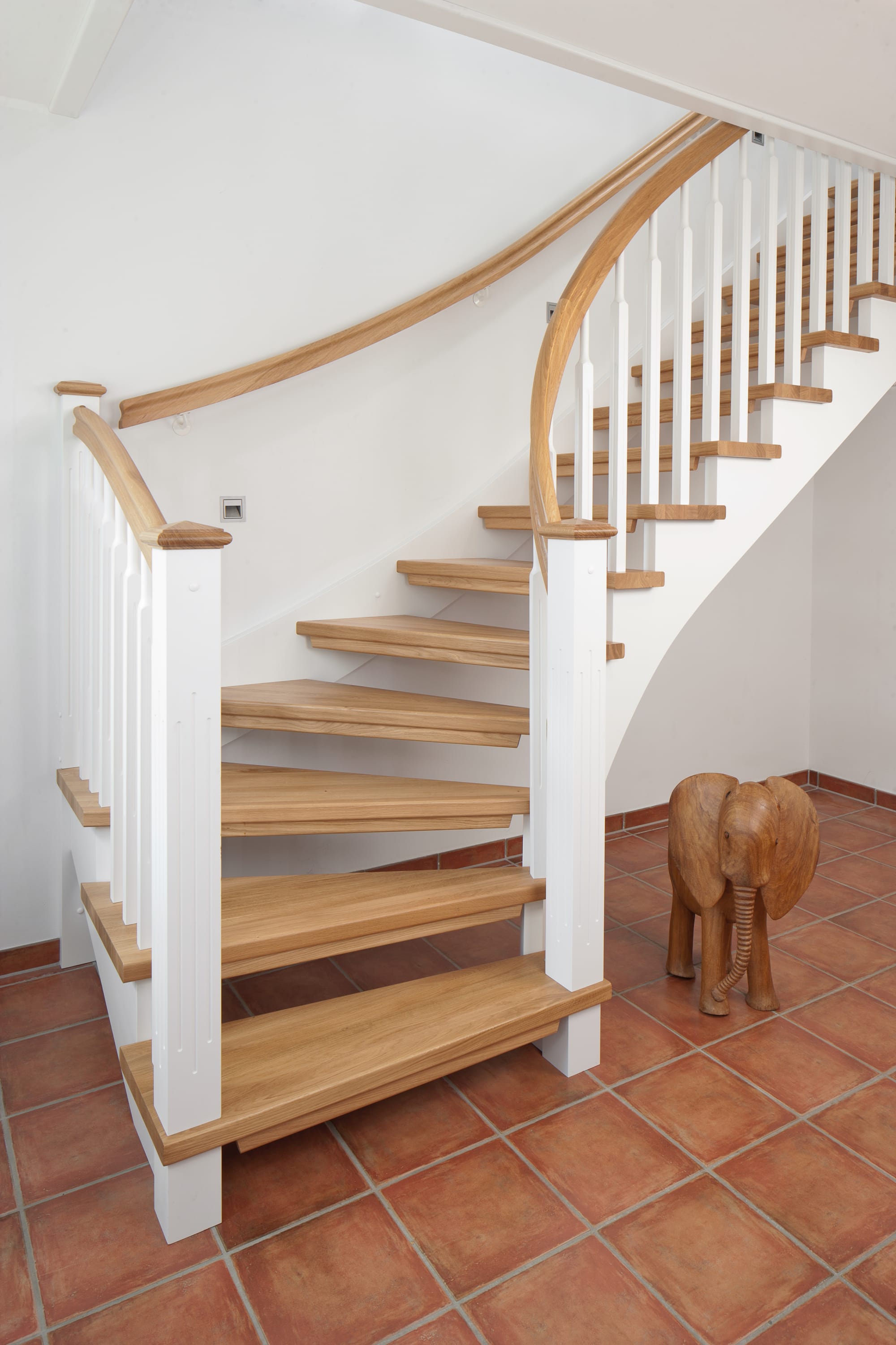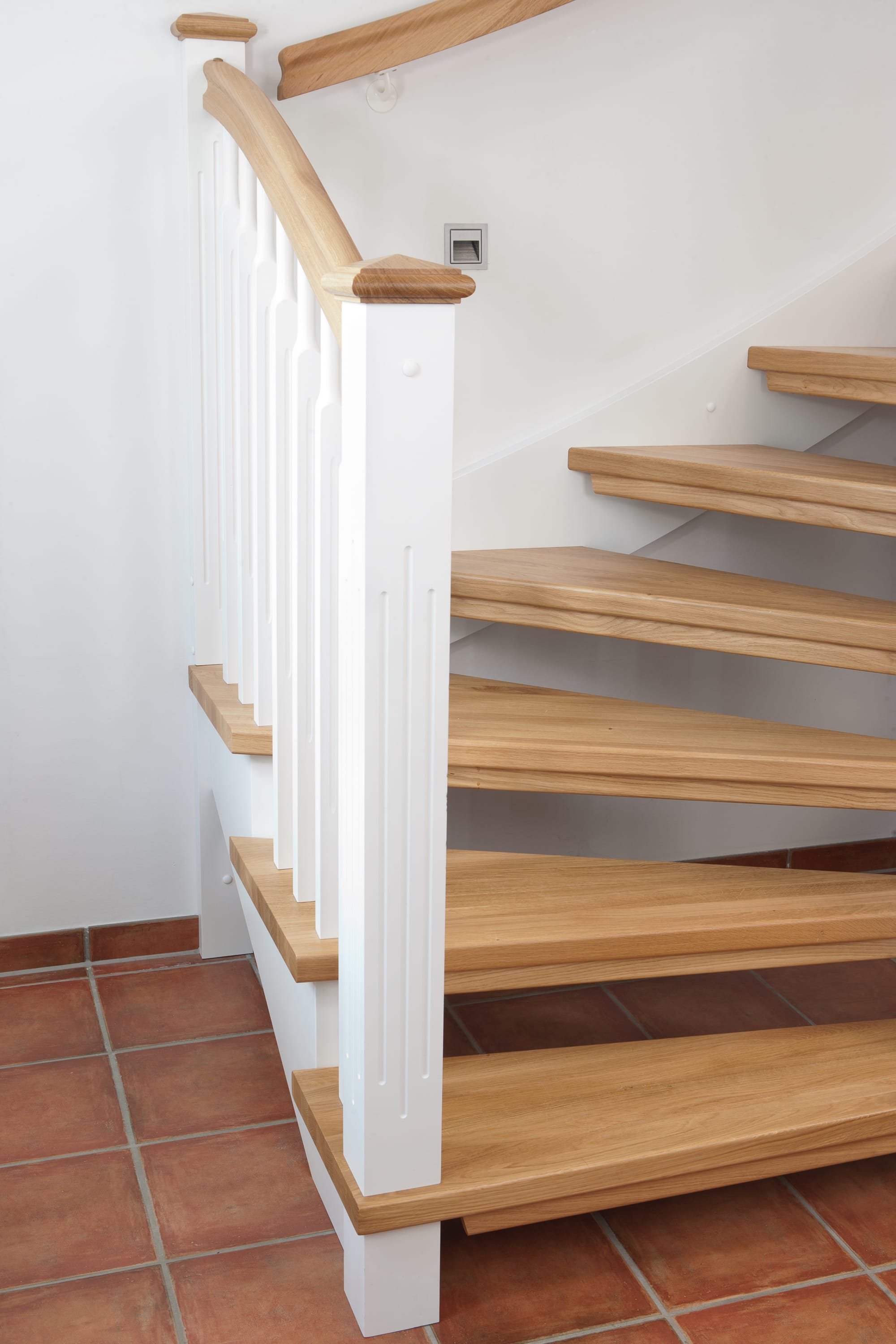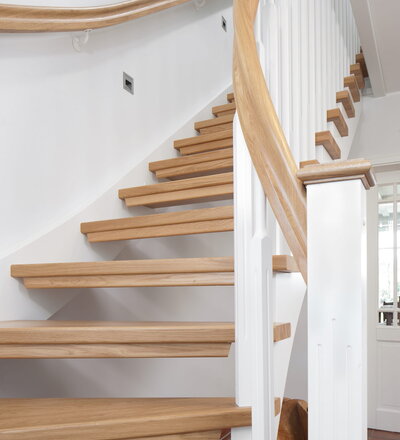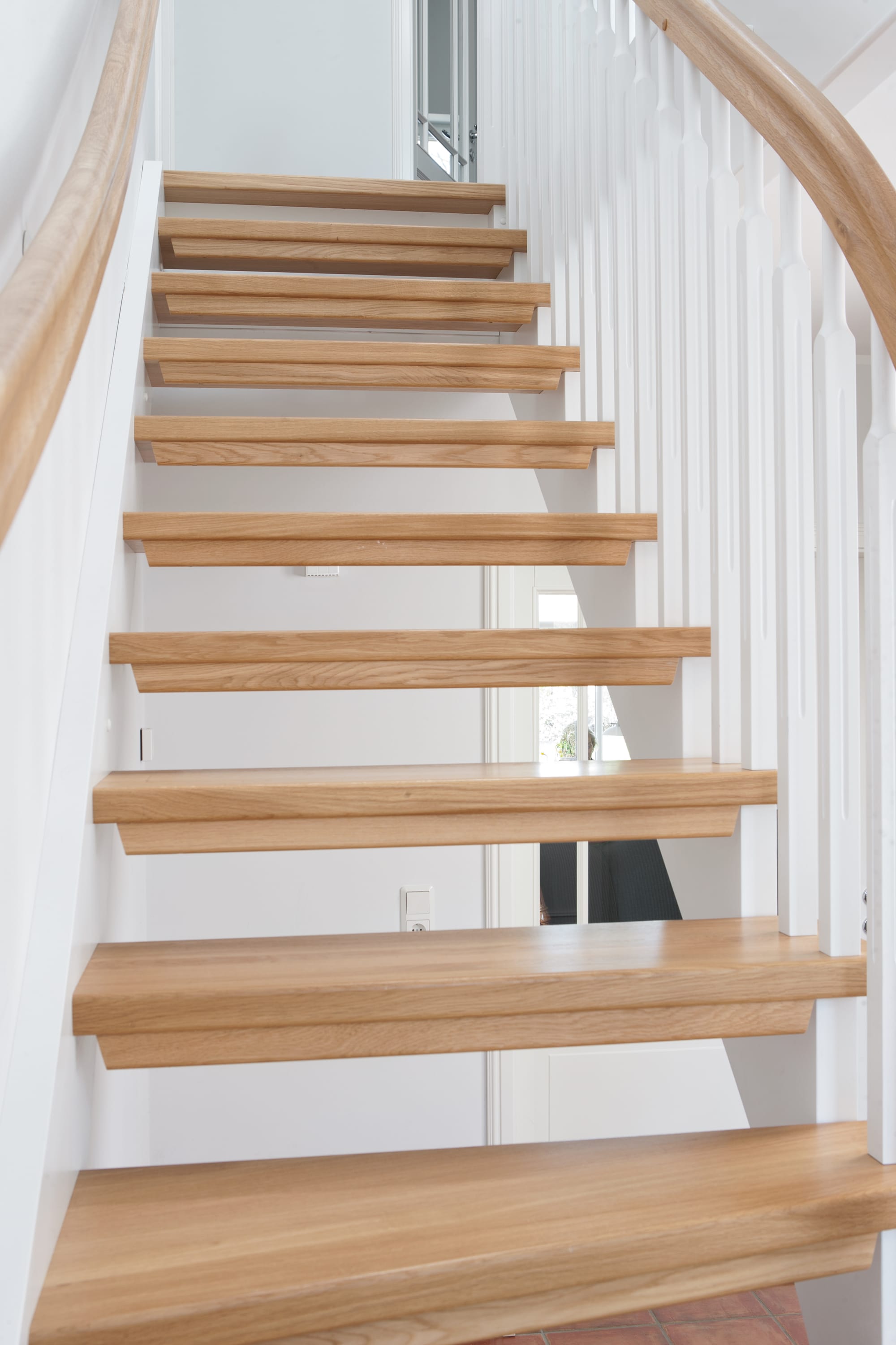 1/4 gewendelte, freiseitig aufgesattelt und wandseitig eingestemmte offene Wangentreppe, Stufen und Handlauf Holzart Eiche, Stäbe, Pfosten und Wange Whitewood weiß endlackiert.