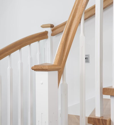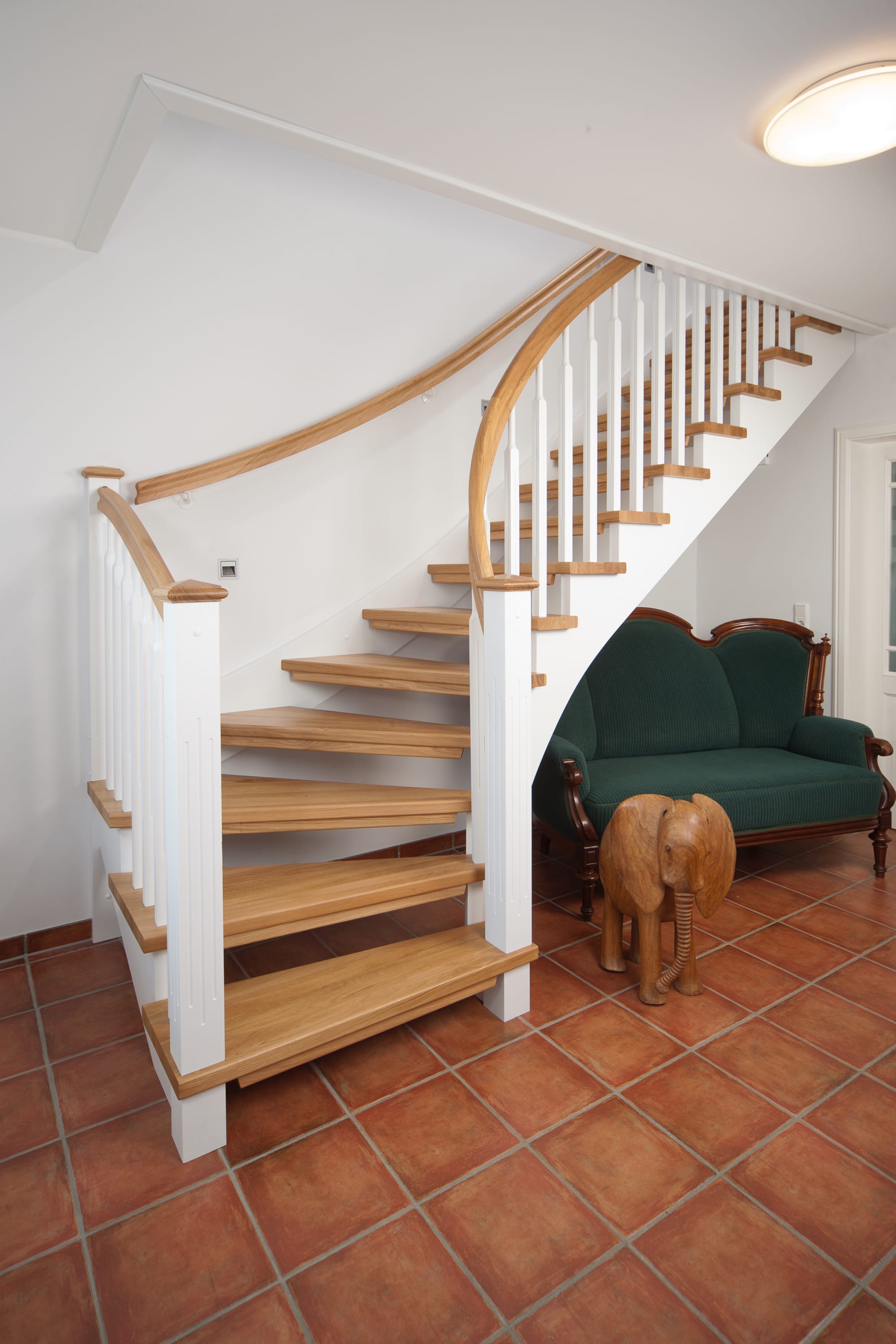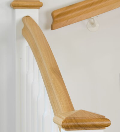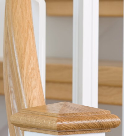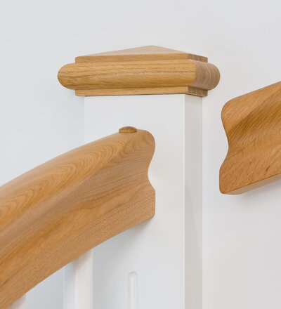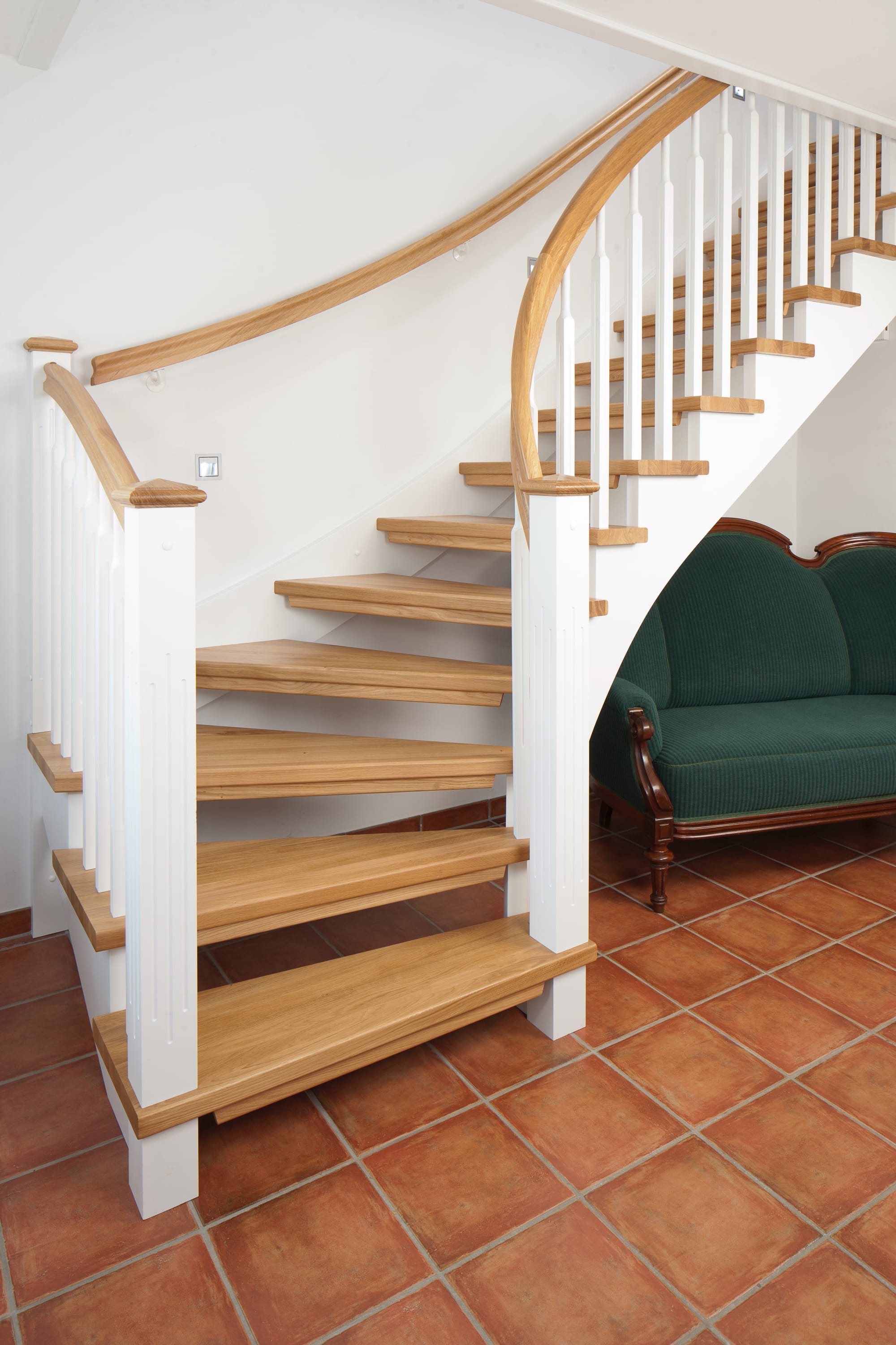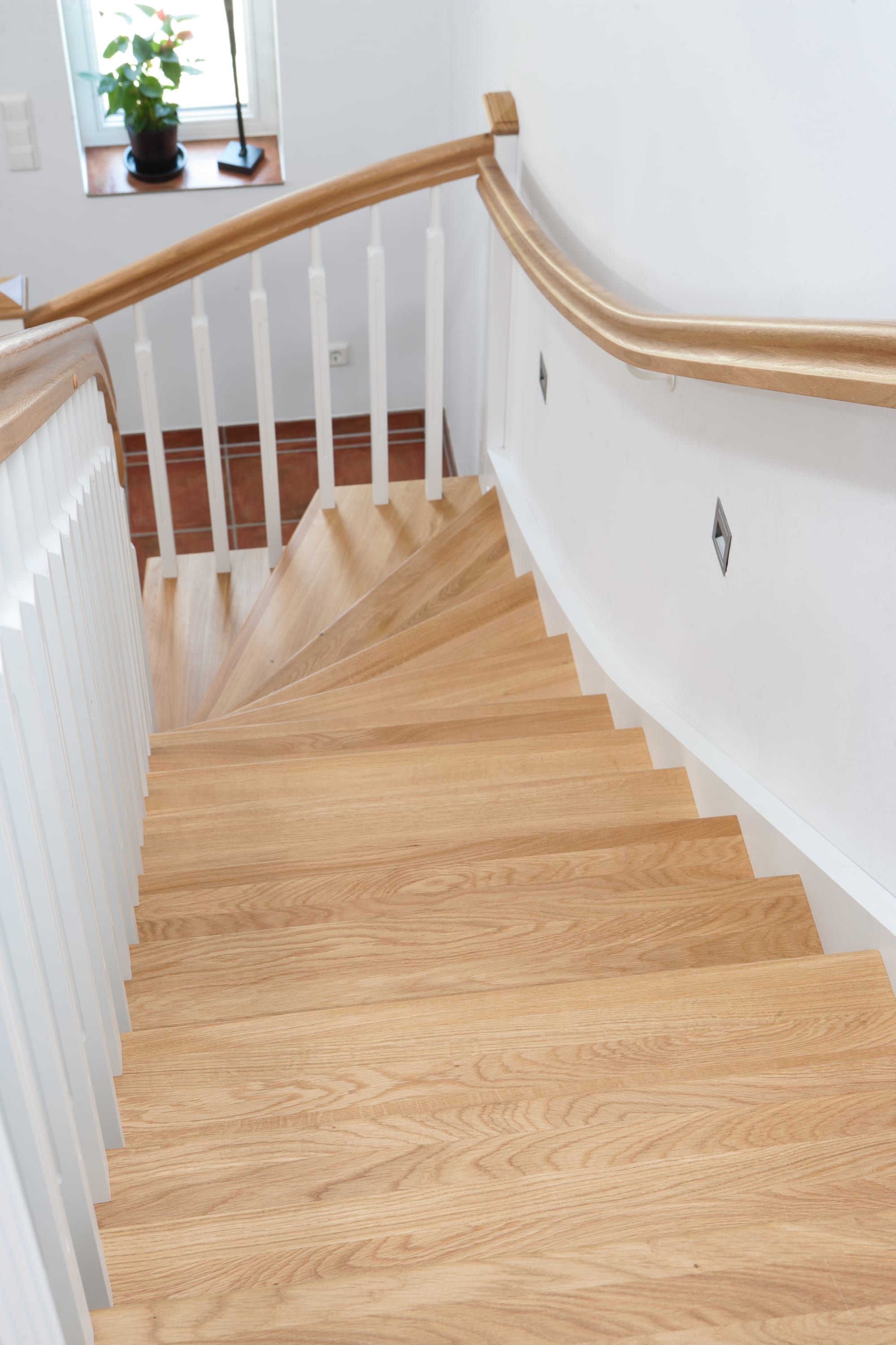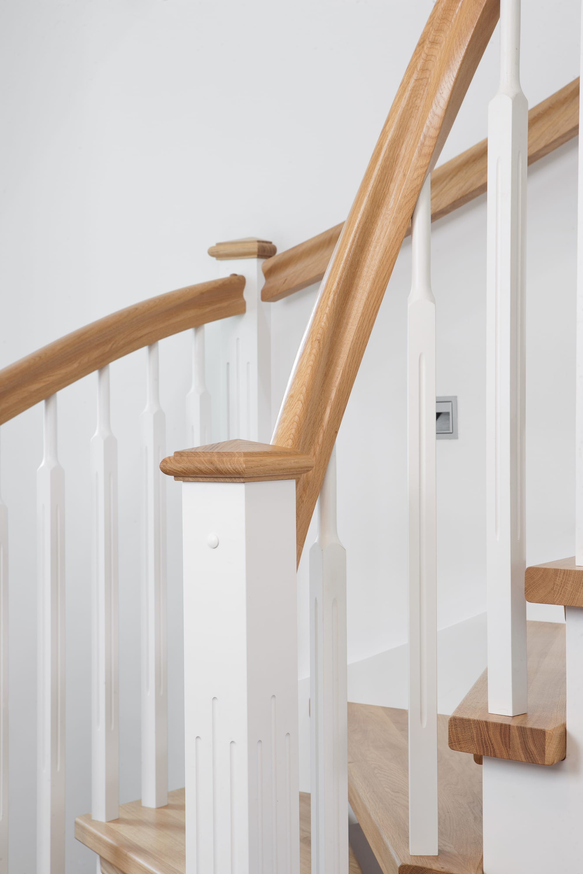 1/4 gewendelte, freiseitig aufgesattelt und wandseitig eingestemmte offene Wangentreppe, Stufen und Handlauf Holzart Eiche, Stäbe, Pfosten und Wange Whitewood weiß endlackiert.