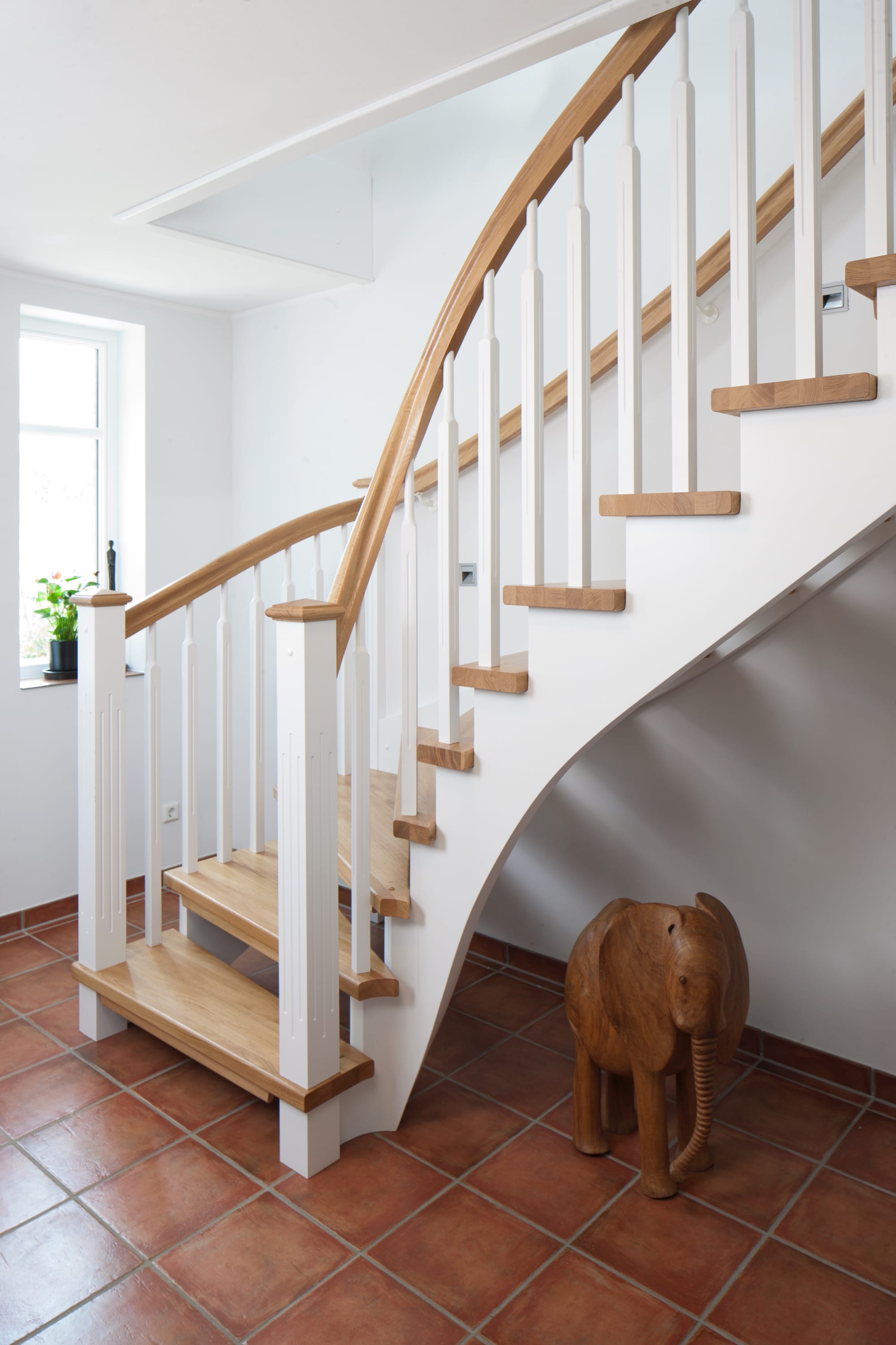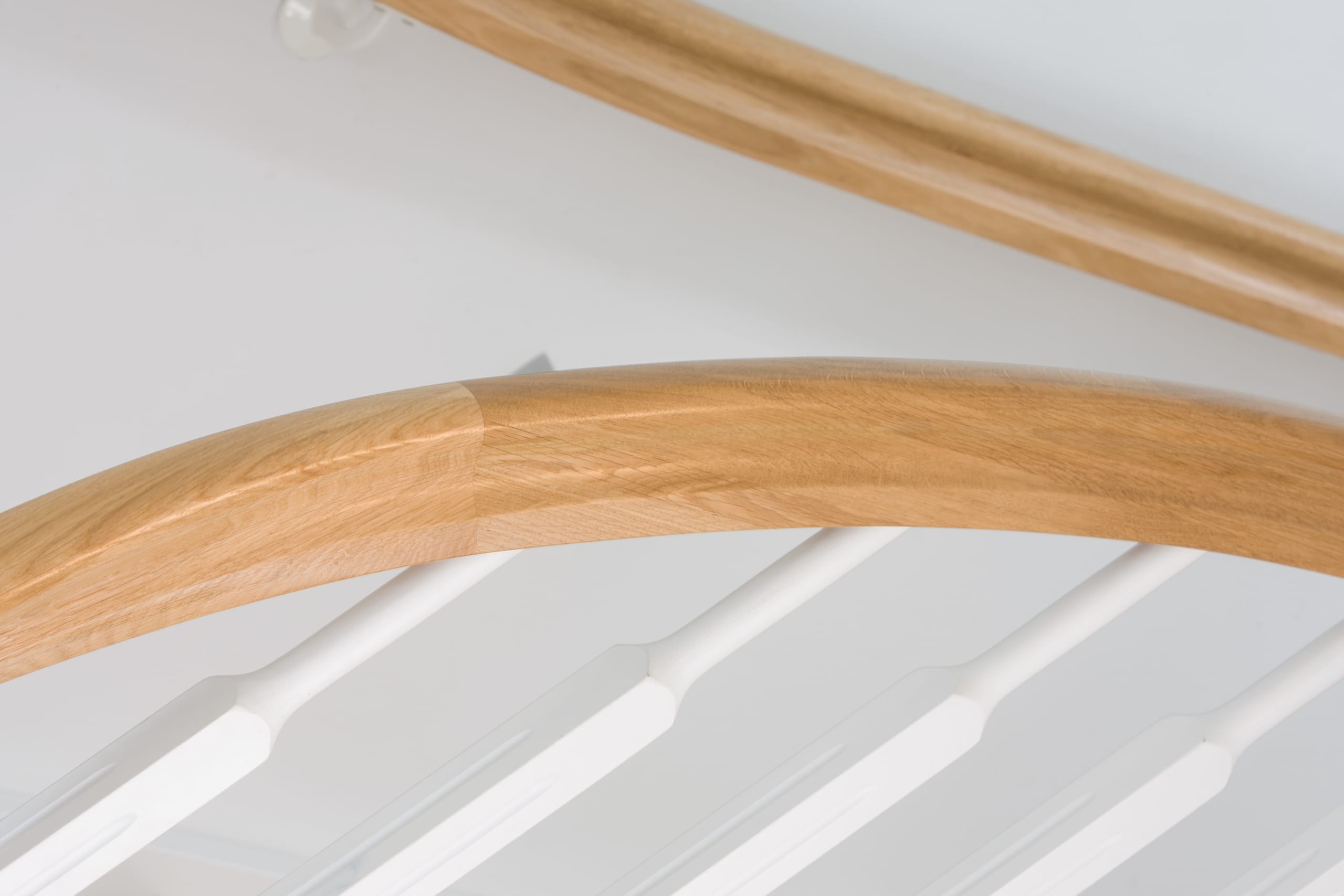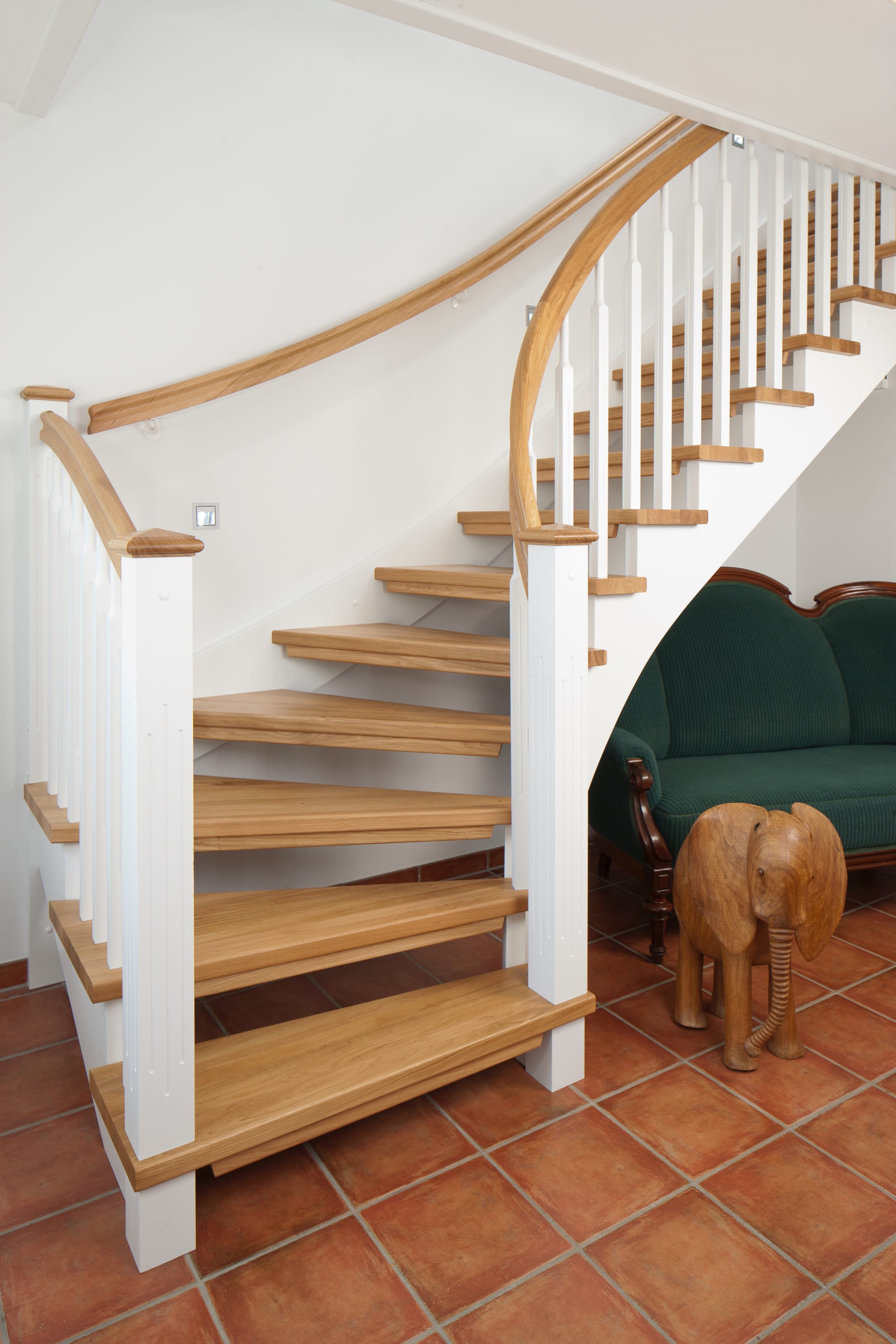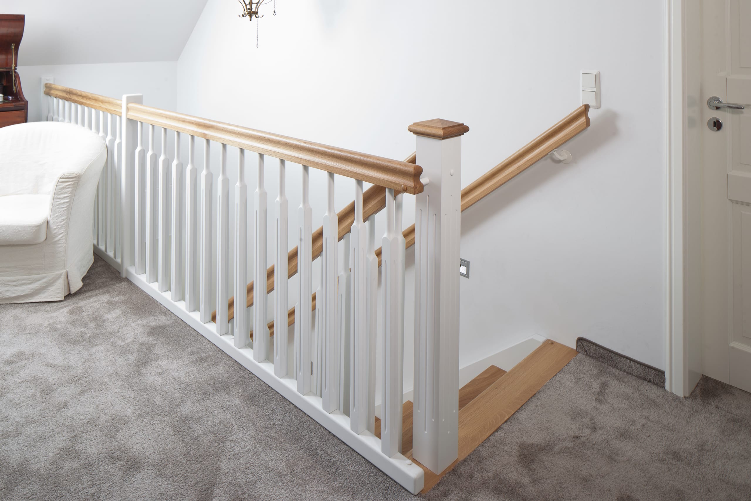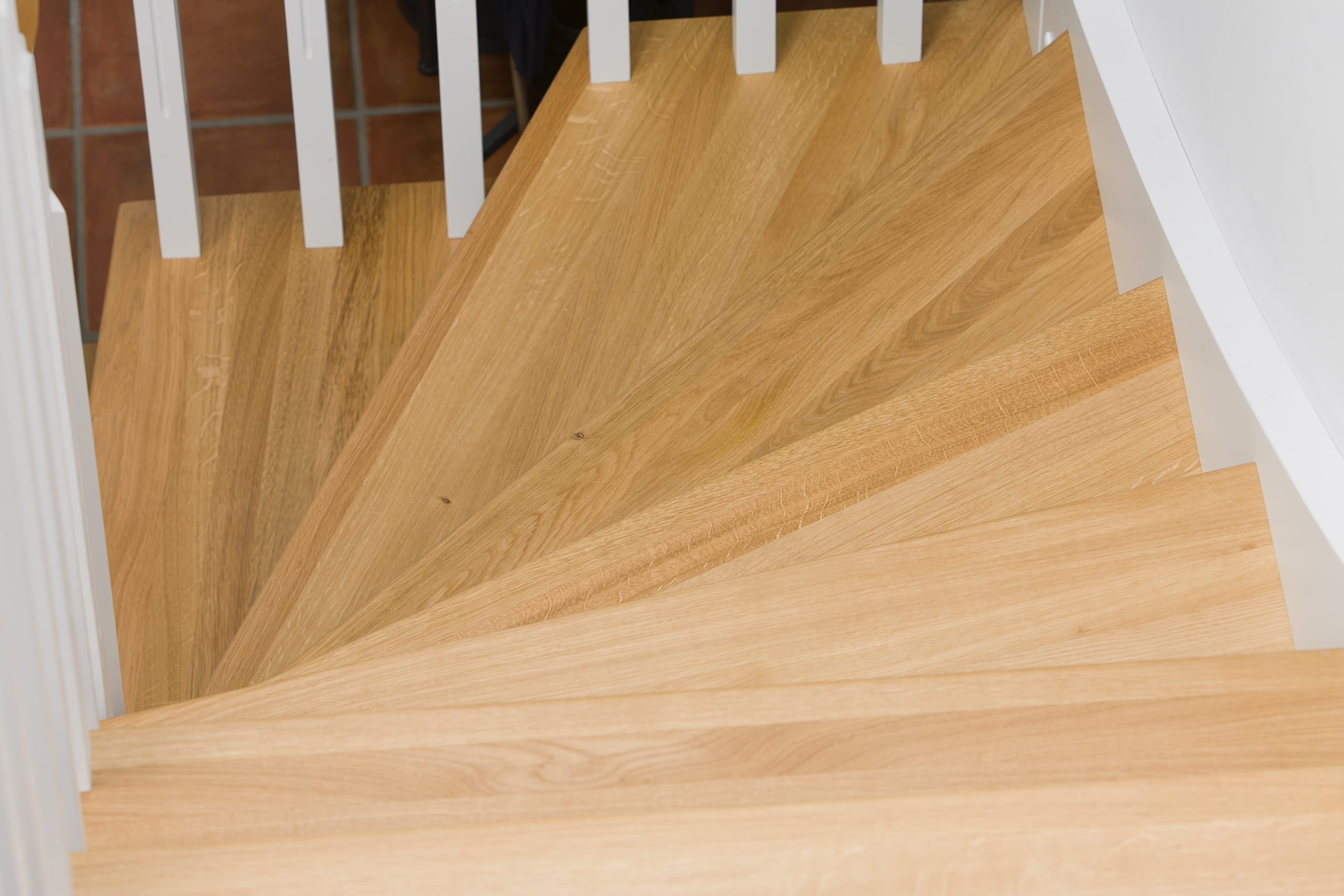 1/4 gewendelte, freiseitig aufgesattelt und wandseitig eingestemmte offene Wangentreppe, Stufen und Handlauf Holzart Eiche, Stäbe, Pfosten und Wange Whitewood weiß endlackiert.