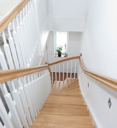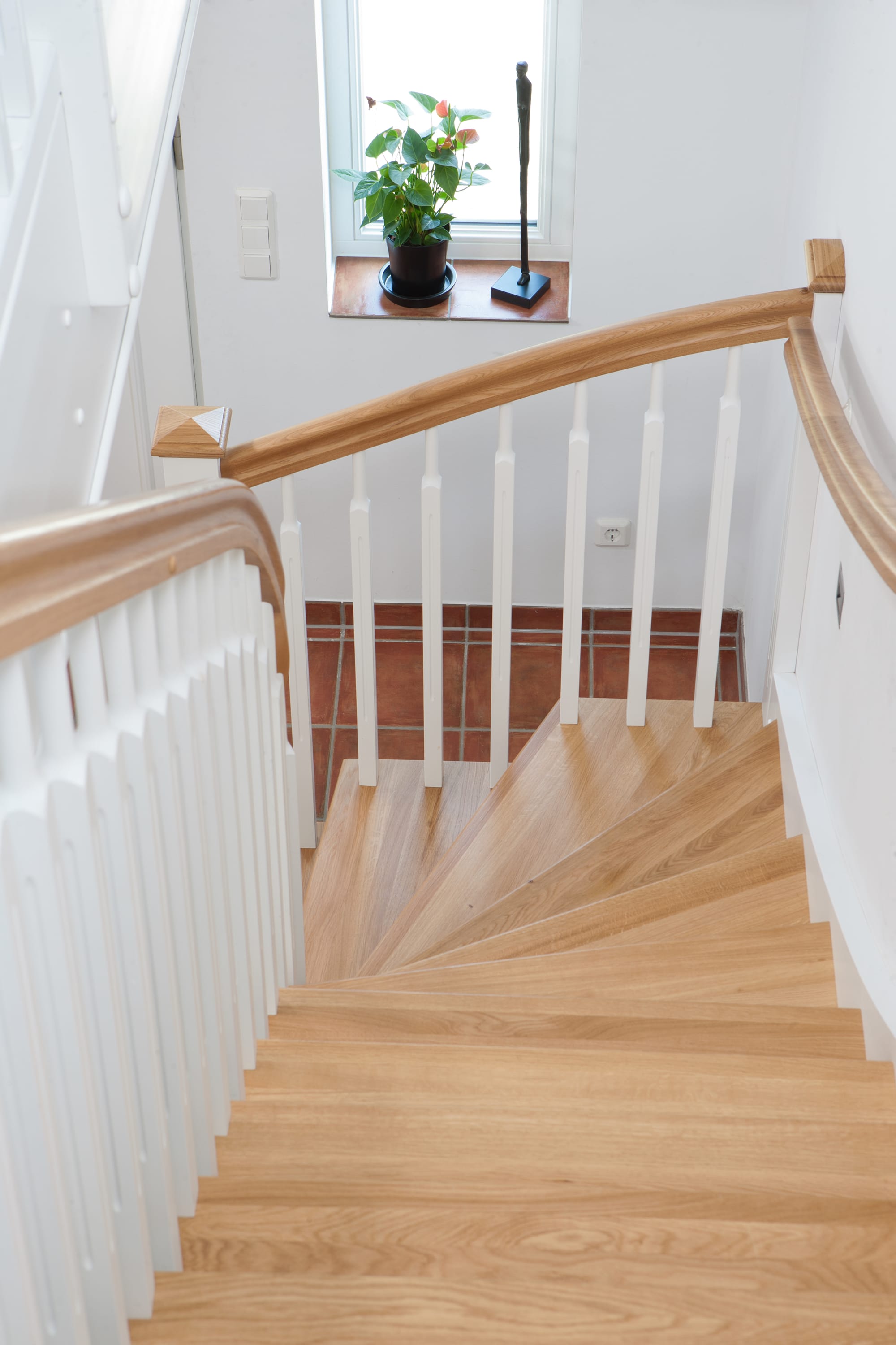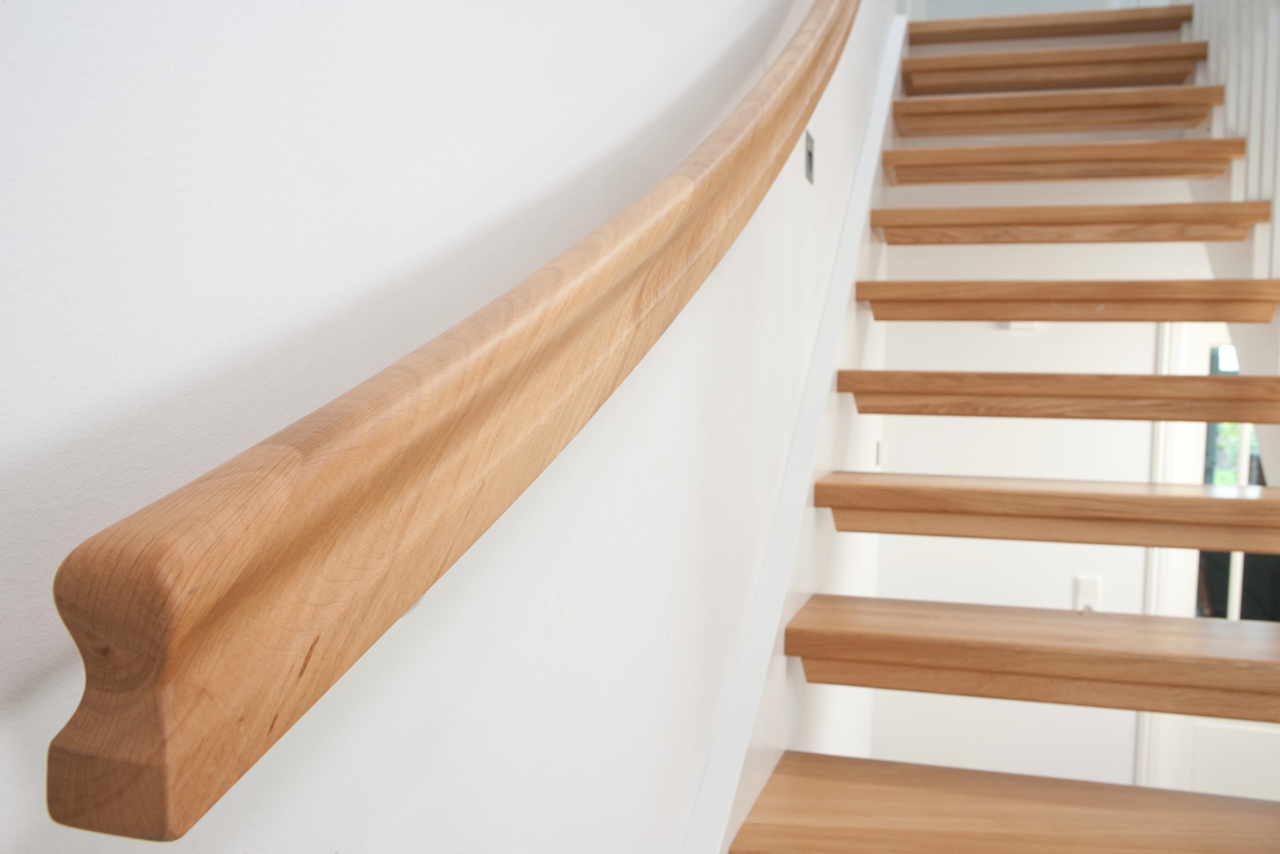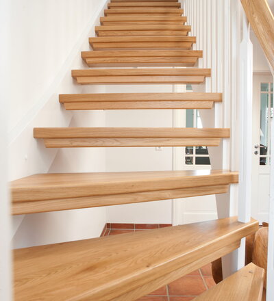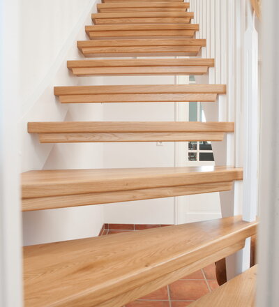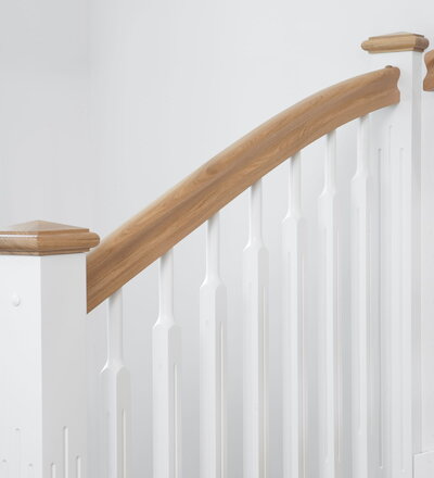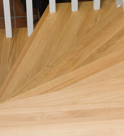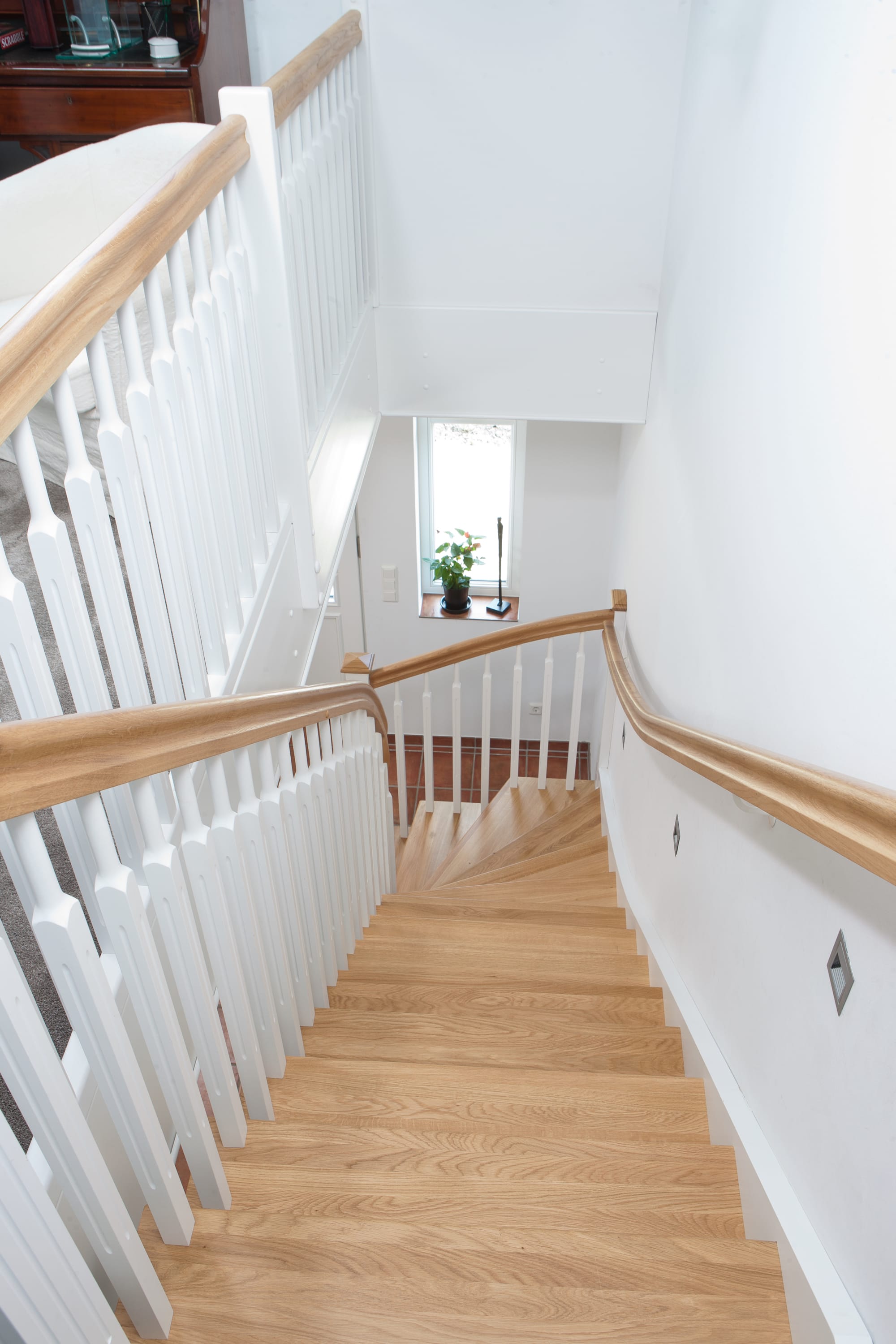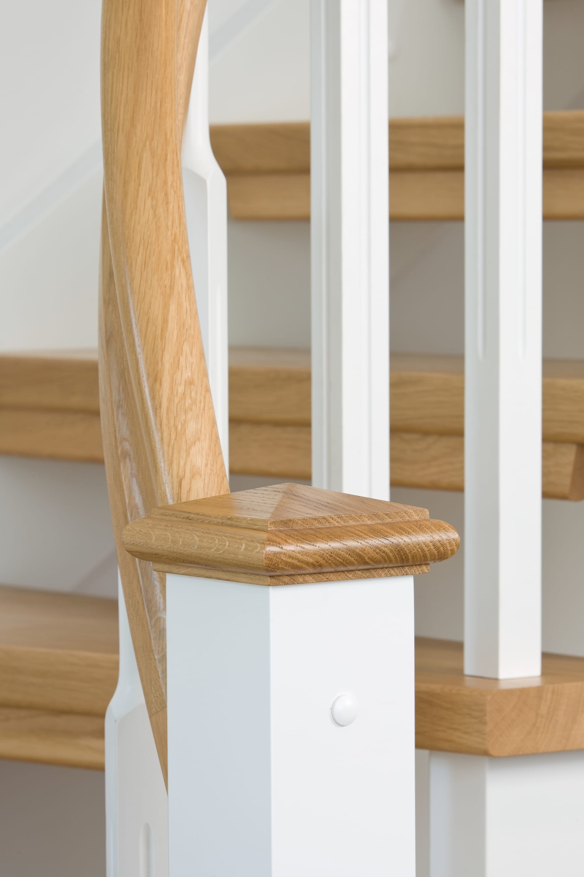 1/4 gewendelte, freiseitig aufgesattelt und wandseitig eingestemmte offene Wangentreppe, Stufen und Handlauf Holzart Eiche, Stäbe, Pfosten und Wange Whitewood weiß endlackiert.