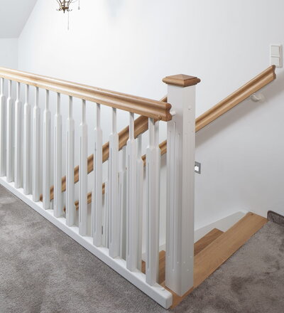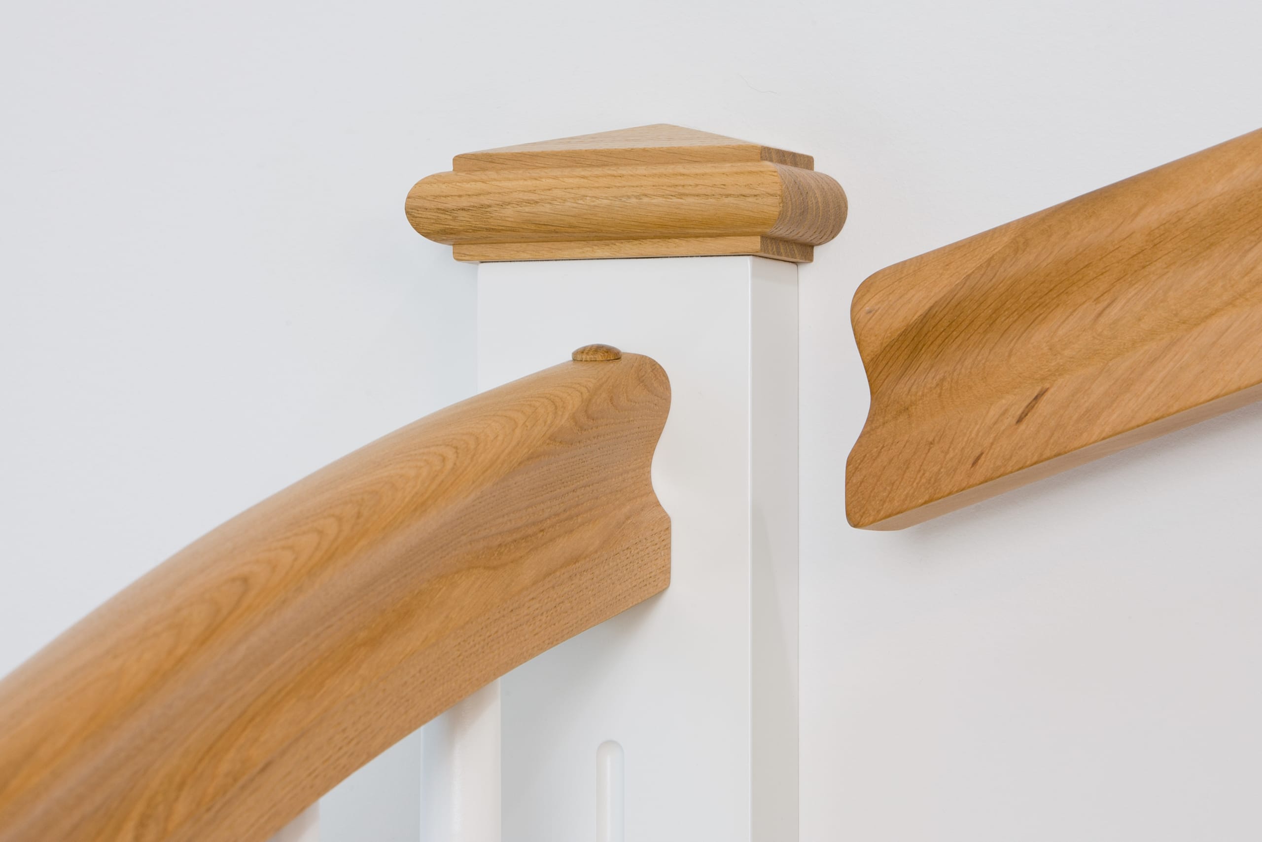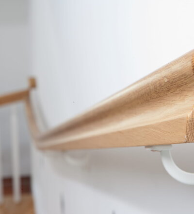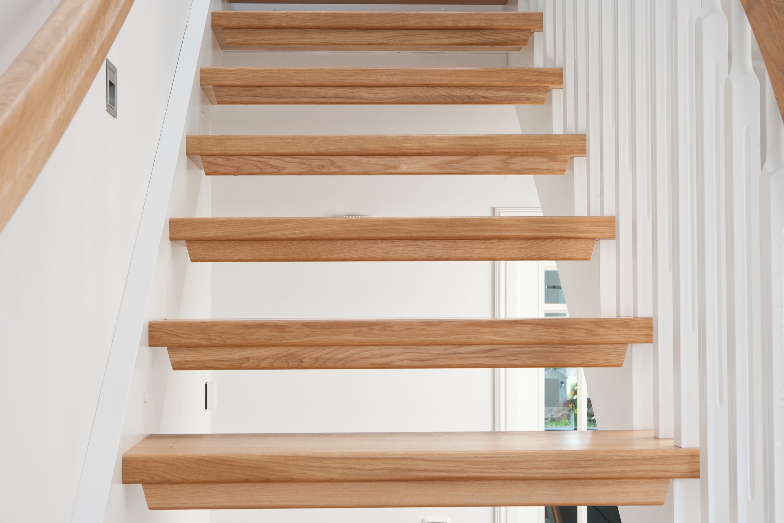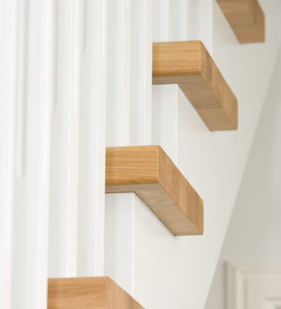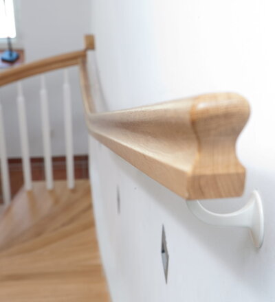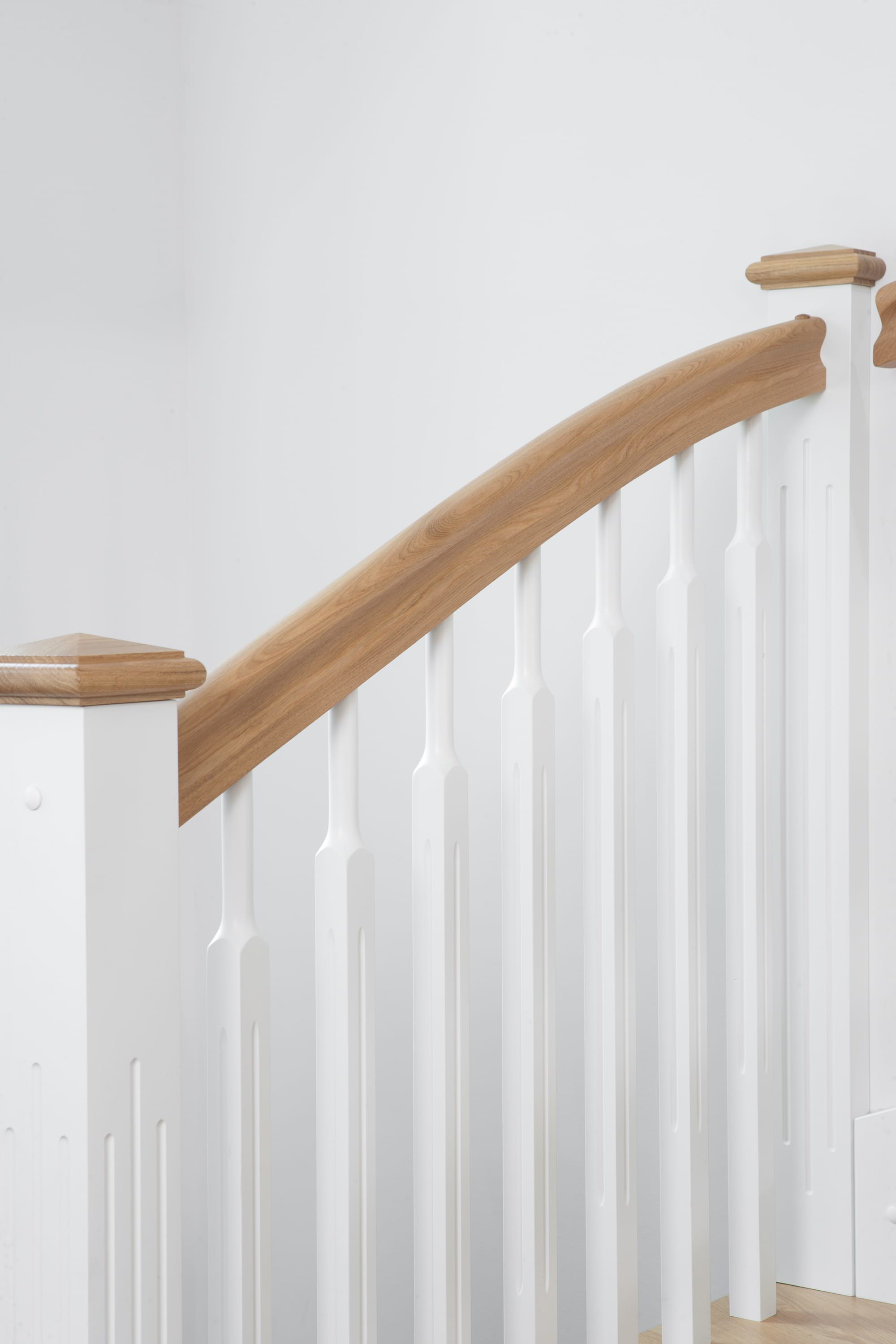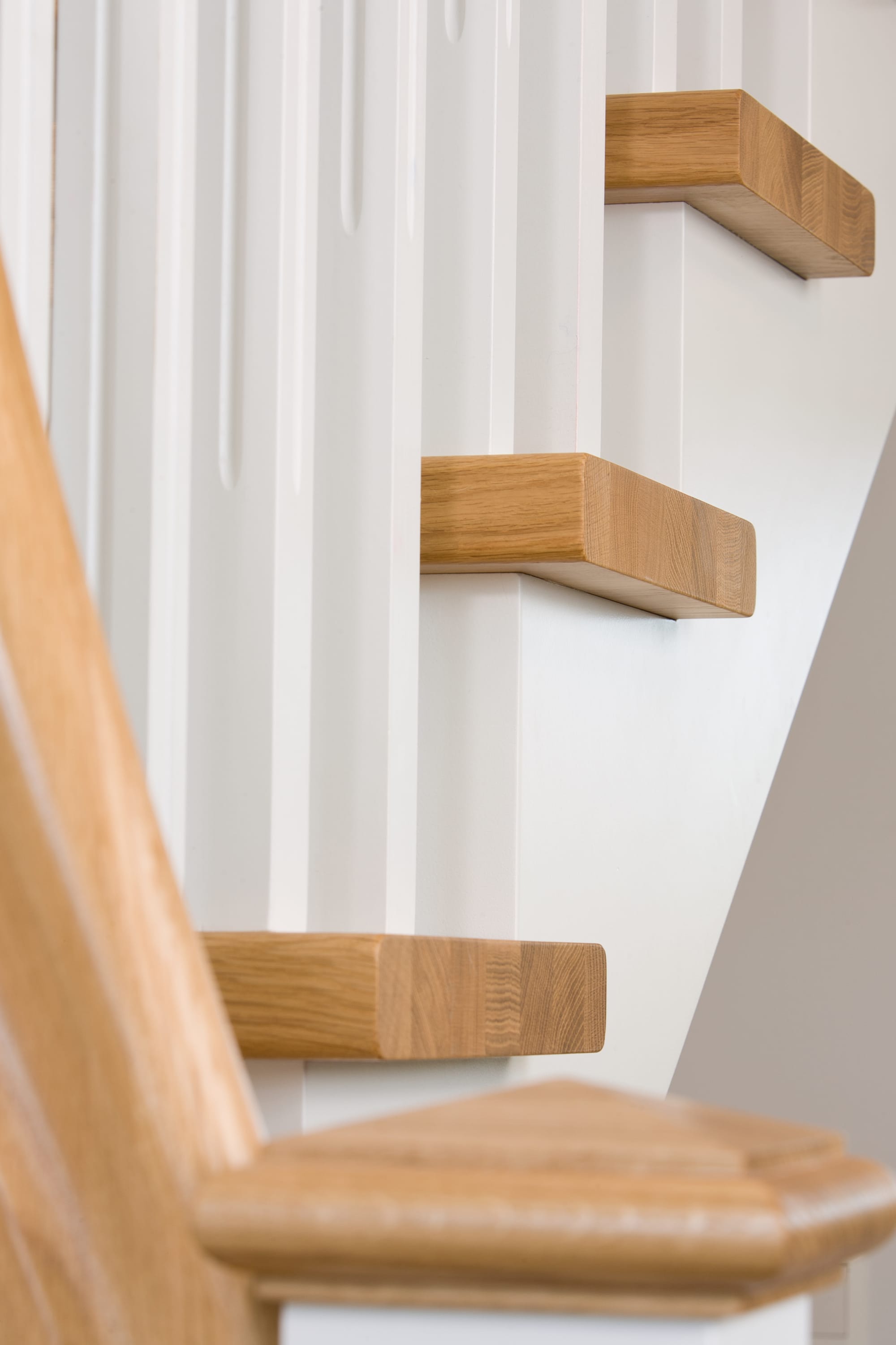 1/4 gewendelte, freiseitig aufgesattelt und wandseitig eingestemmte offene Wangentreppe, Stufen und Handlauf Holzart Eiche, Stäbe, Pfosten und Wange Whitewood weiß endlackiert.