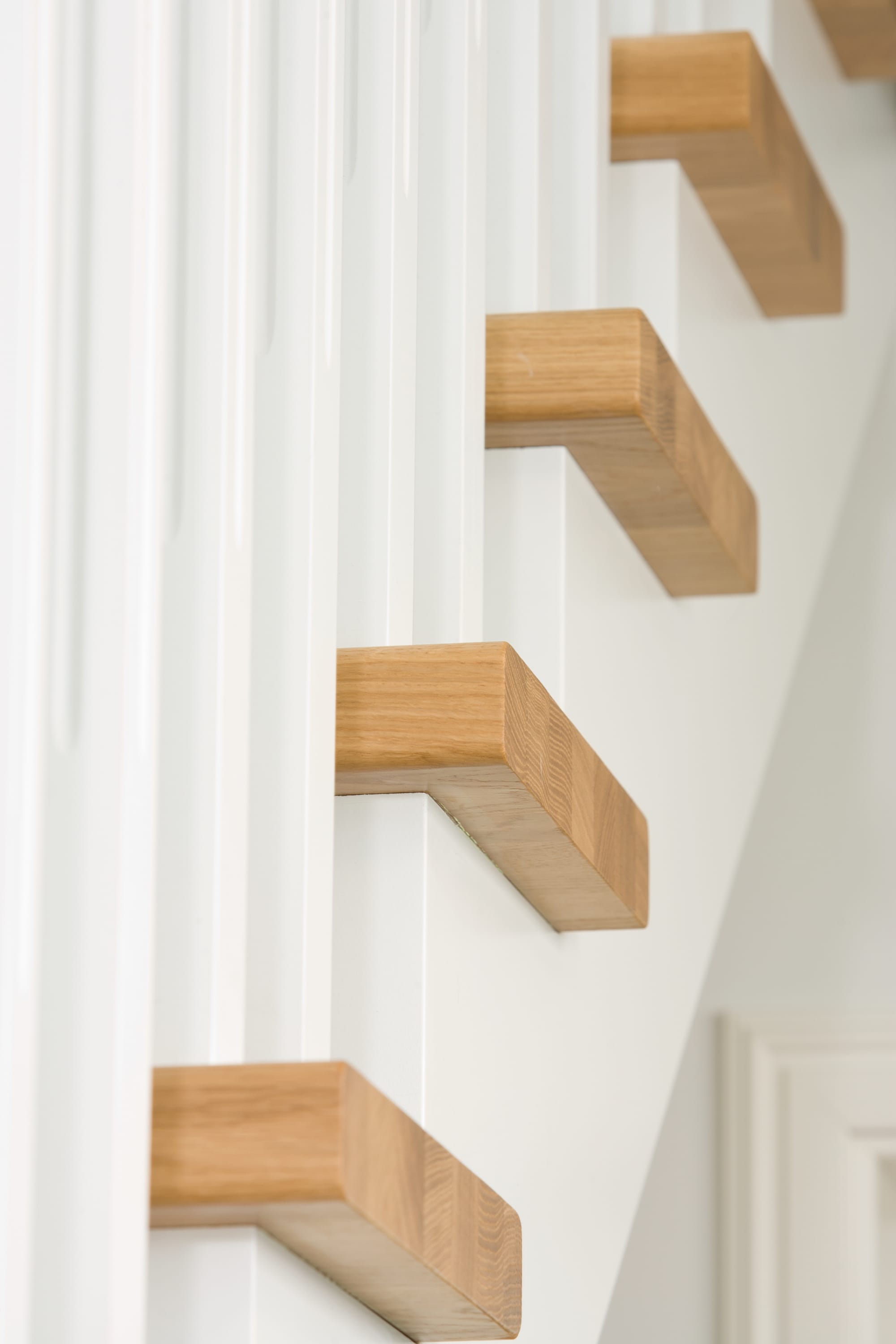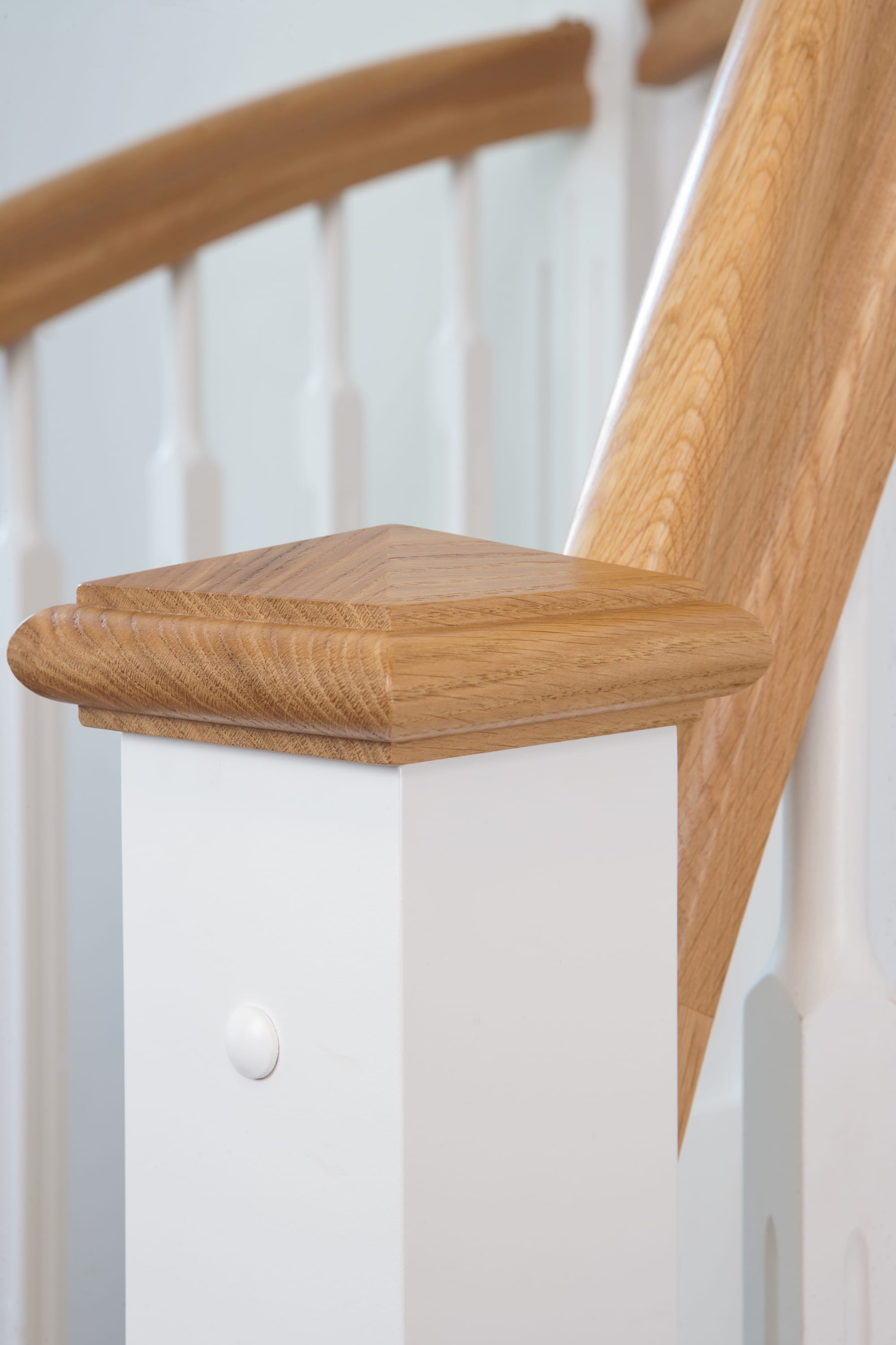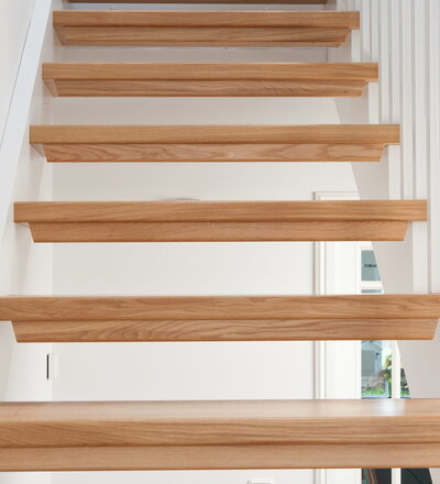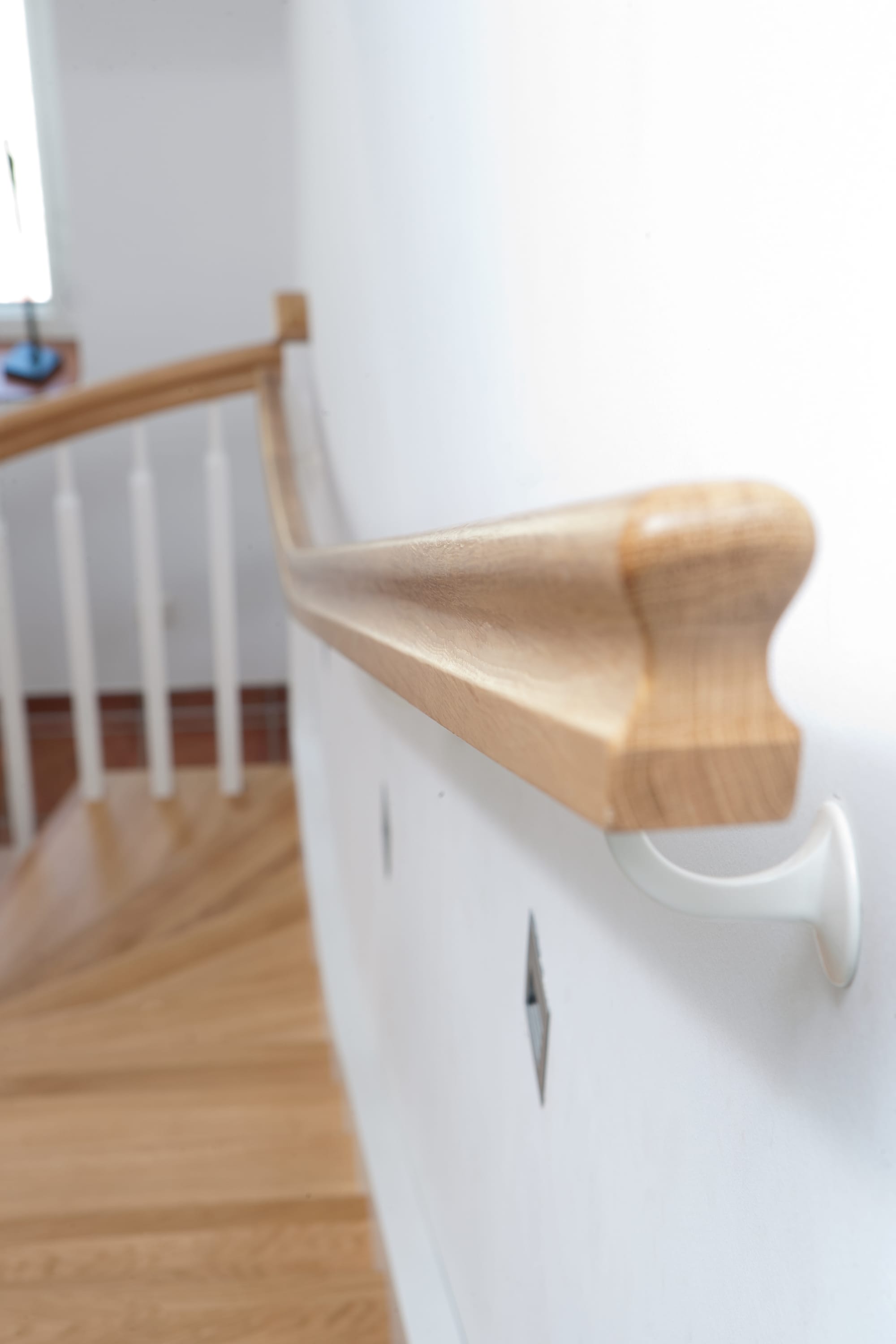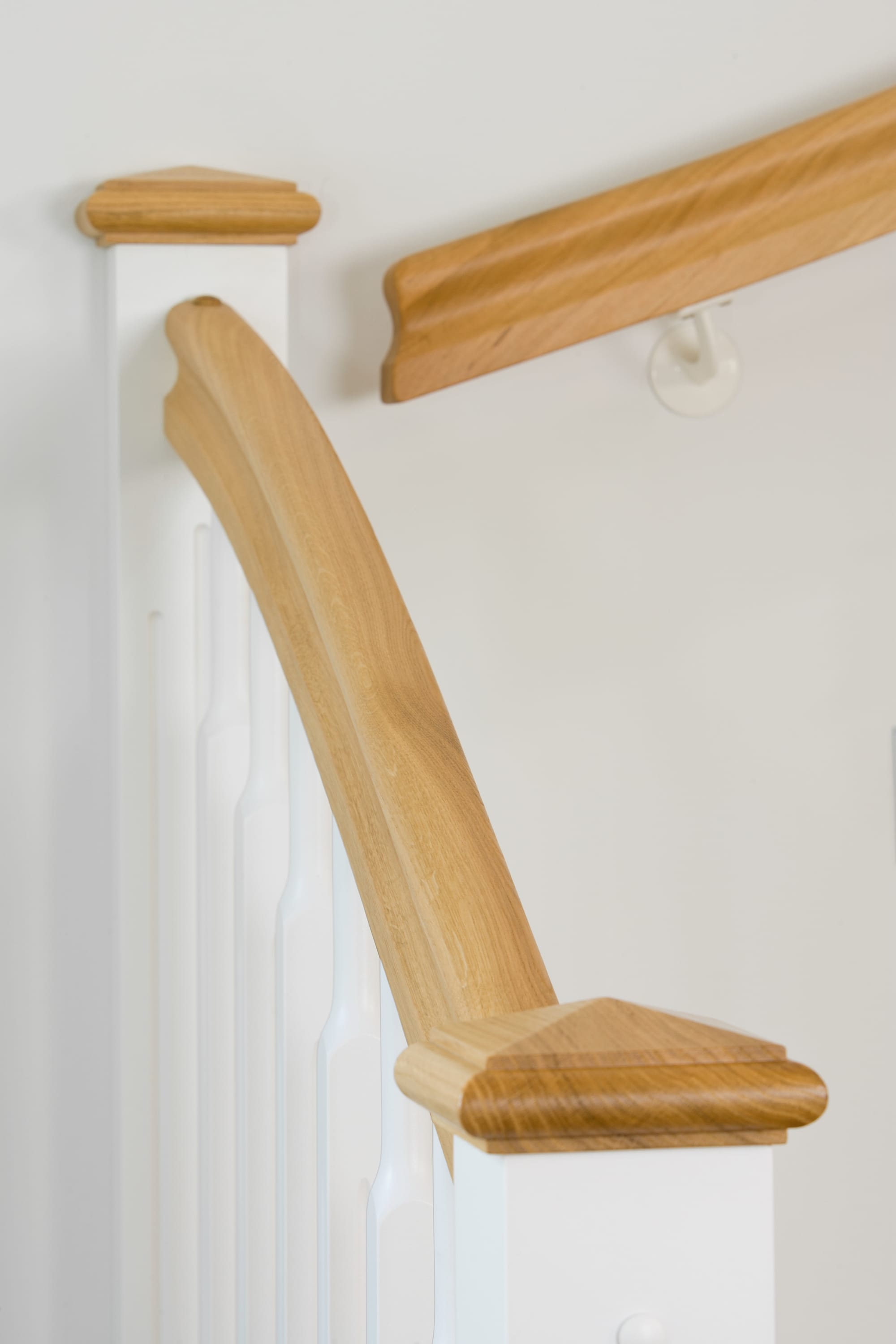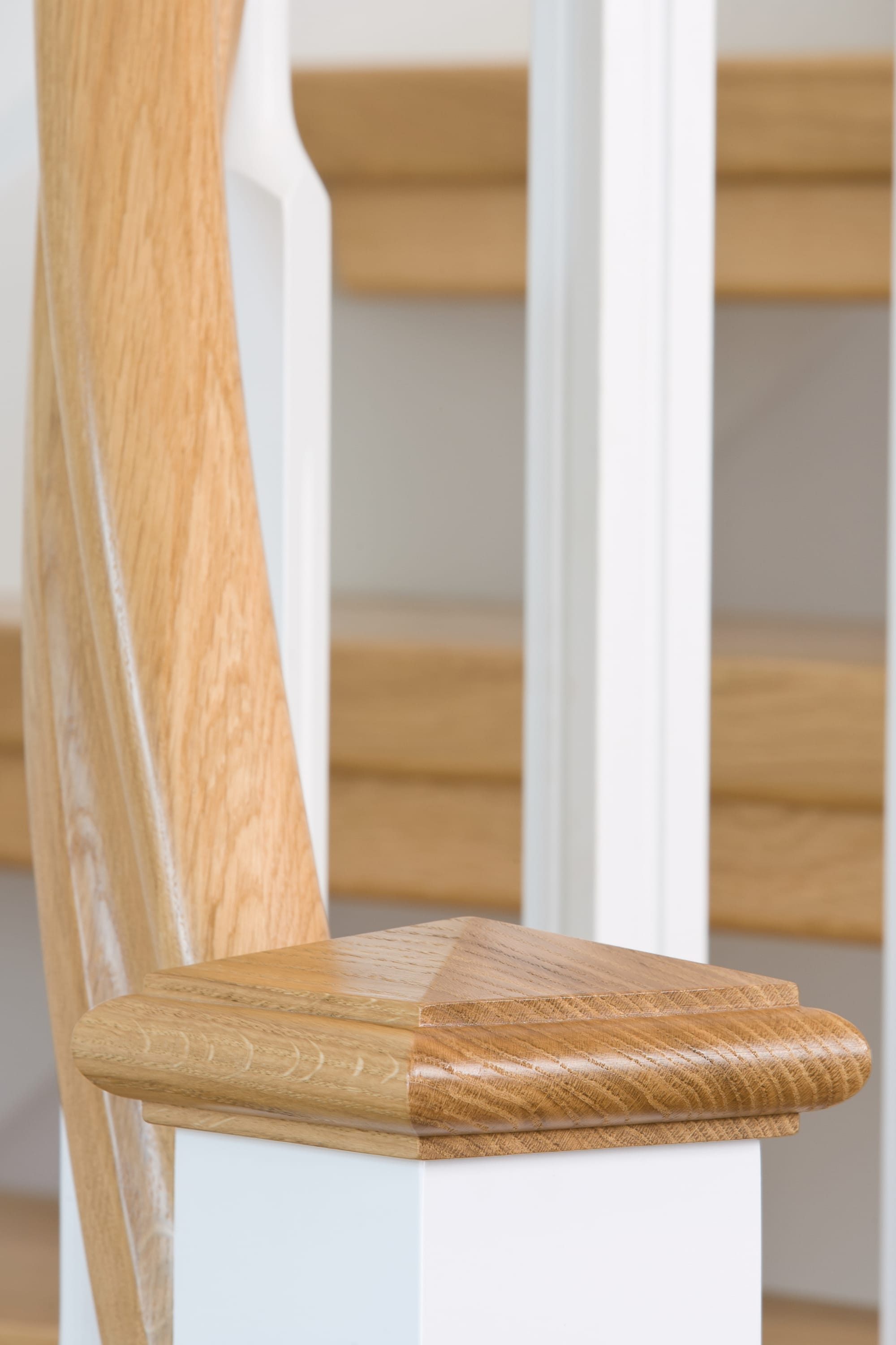 1/4 gewendelte, freiseitig aufgesattelt und wandseitig eingestemmte offene Wangentreppe, Stufen und Handlauf Holzart Eiche, Stäbe, Pfosten und Wange Whitewood weiß endlackiert.