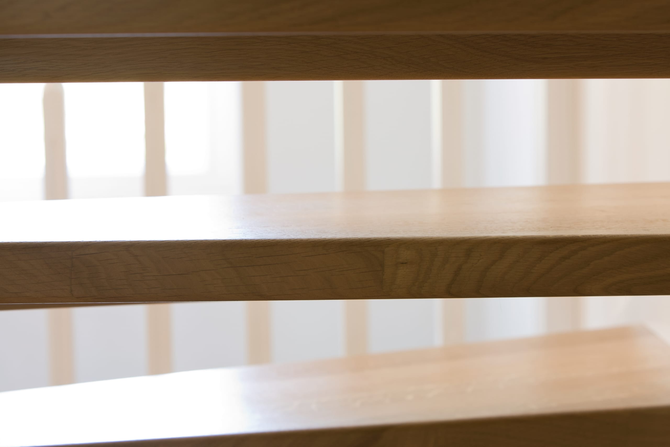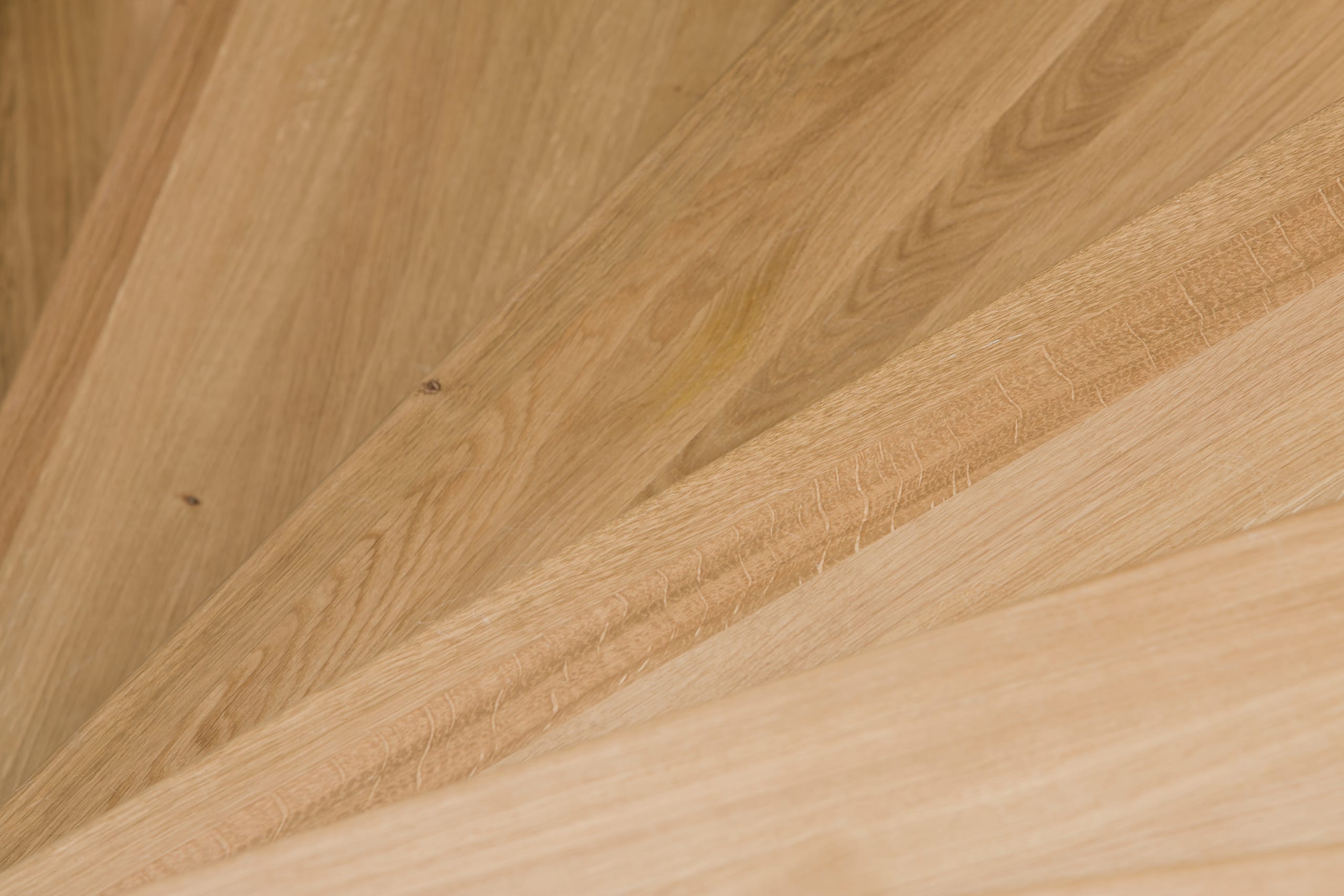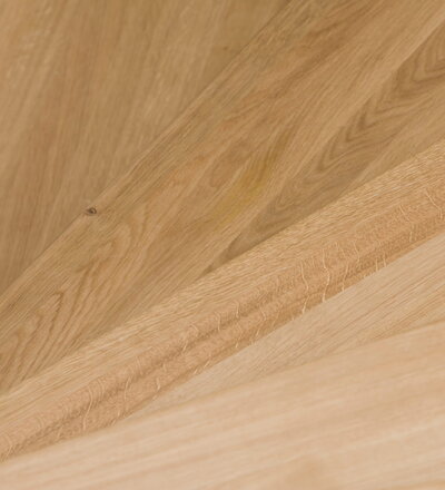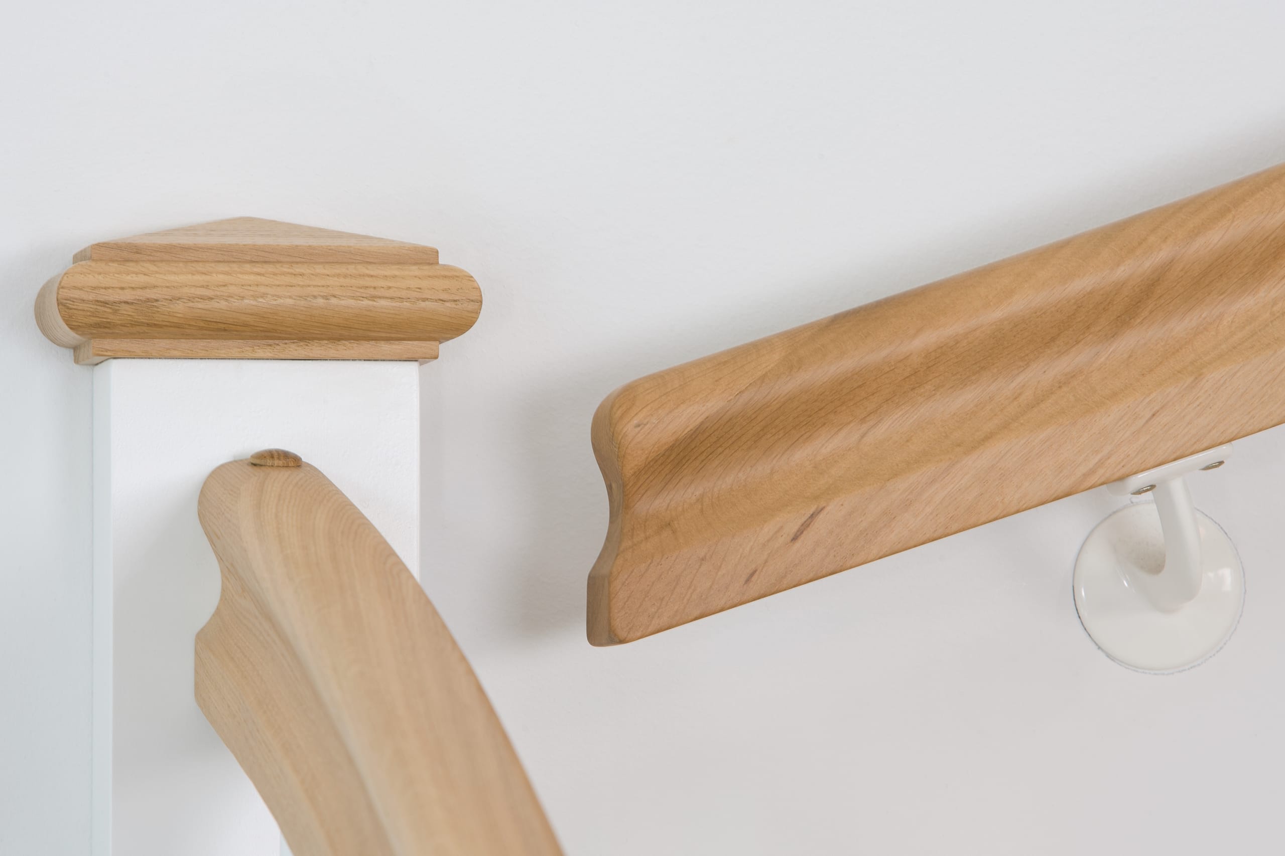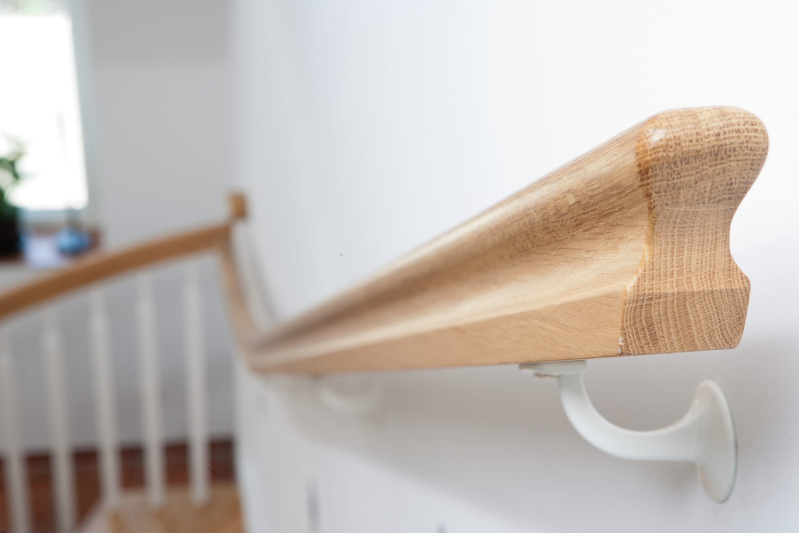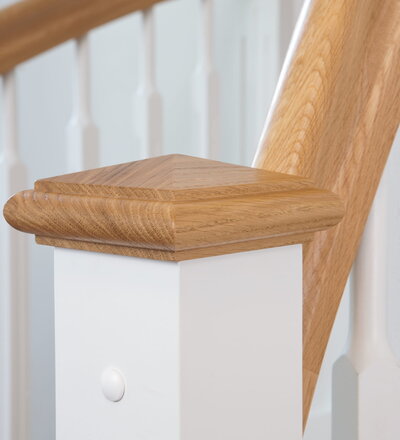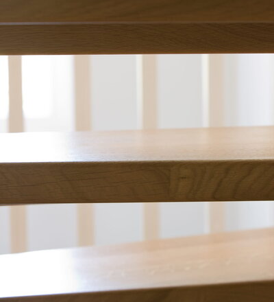 1/4 gewendelte, freiseitig aufgesattelt und wandseitig eingestemmte offene Wangentreppe, Stufen und Handlauf Holzart Eiche, Stäbe, Pfosten und Wange Whitewood weiß endlackiert.